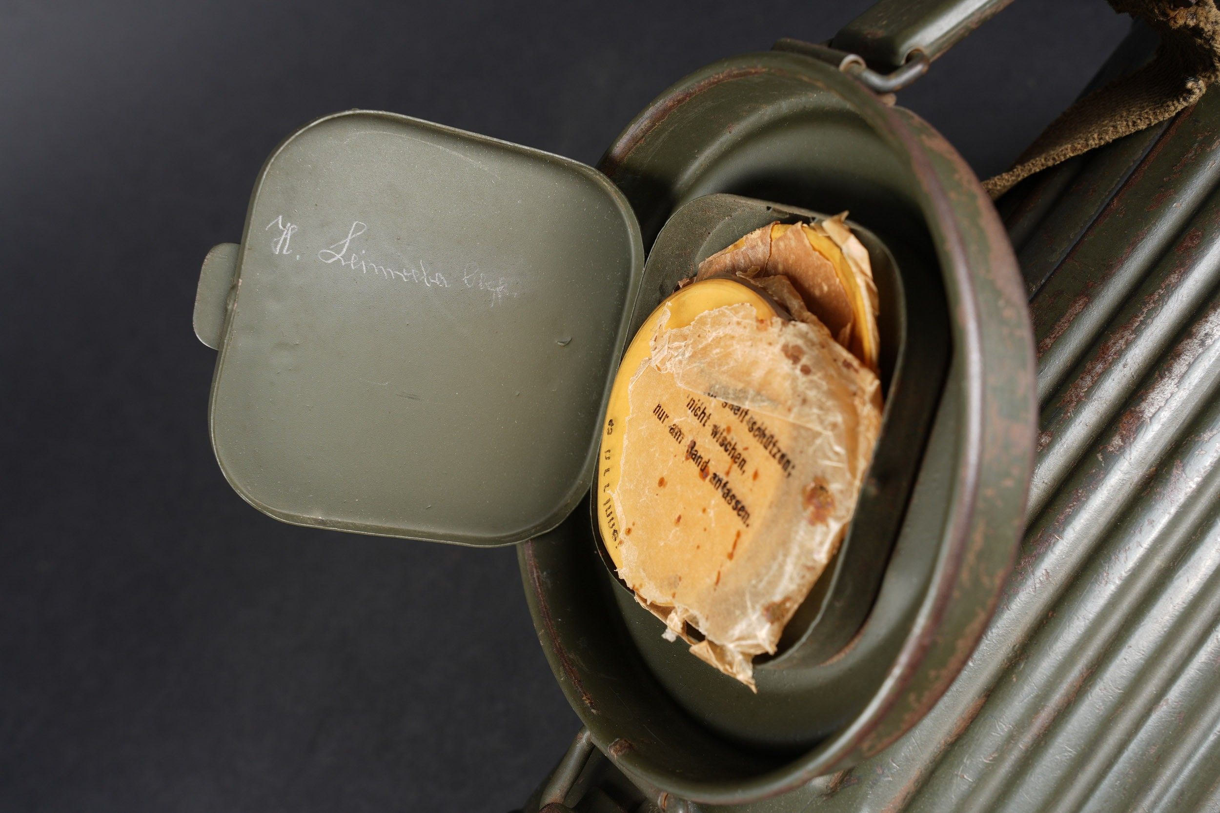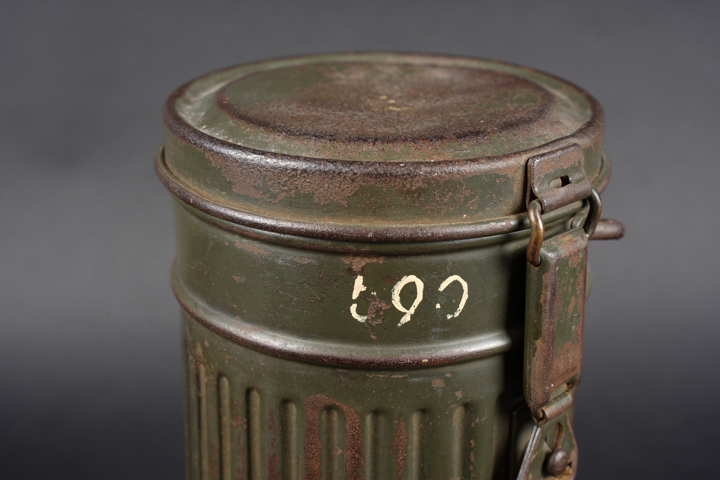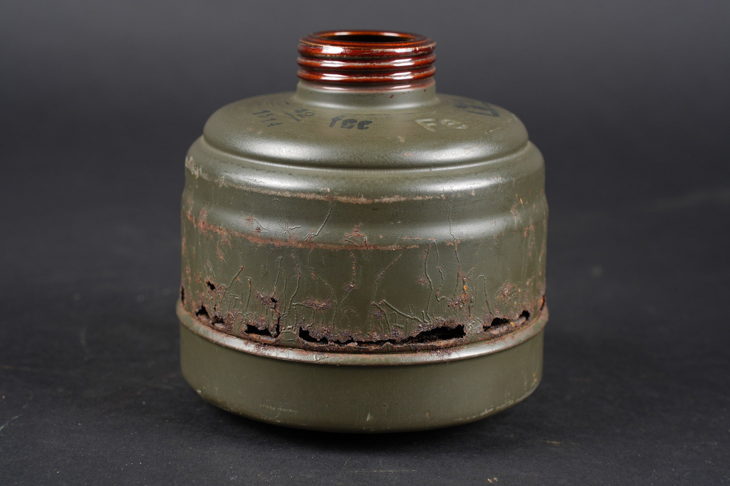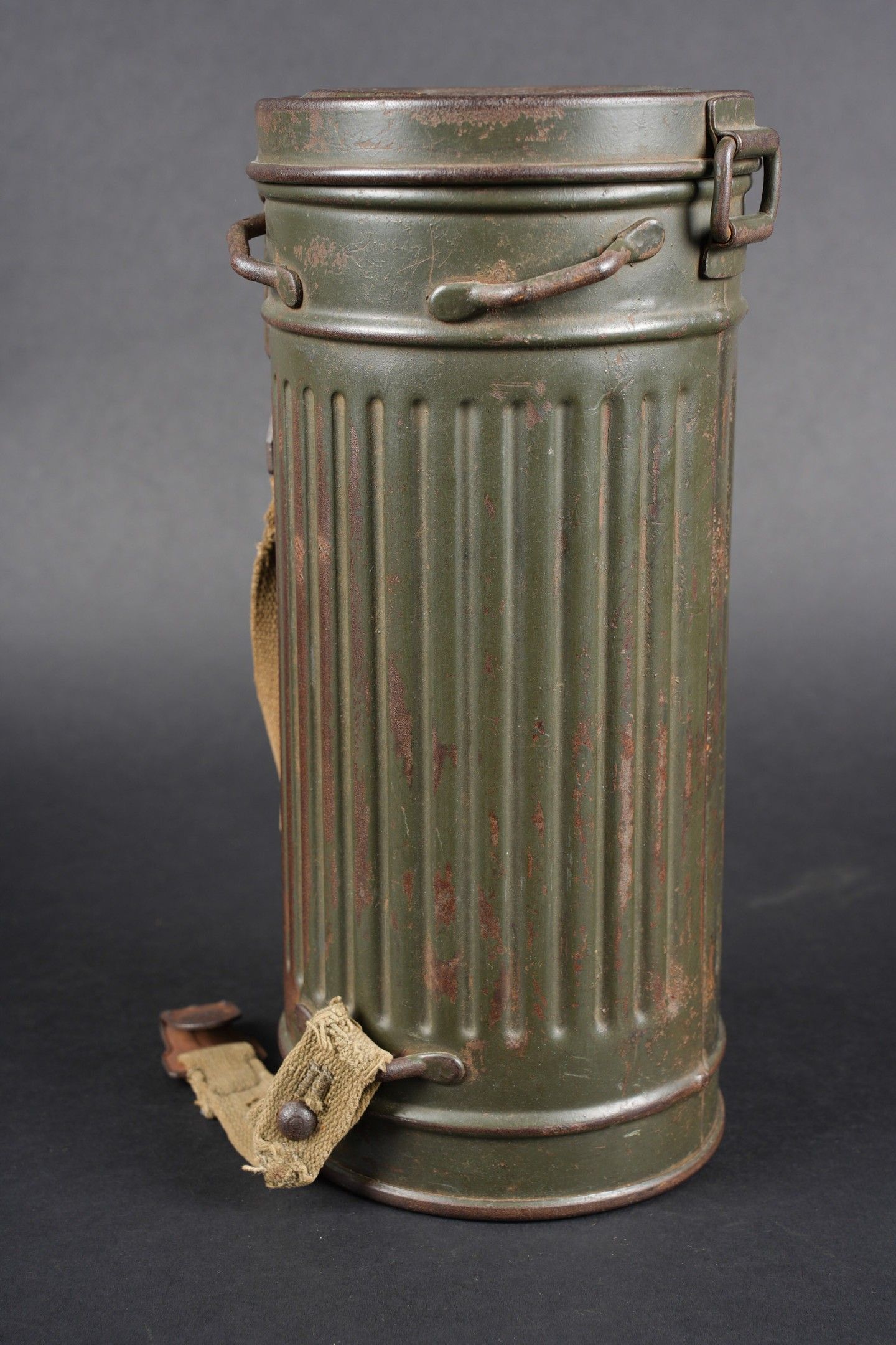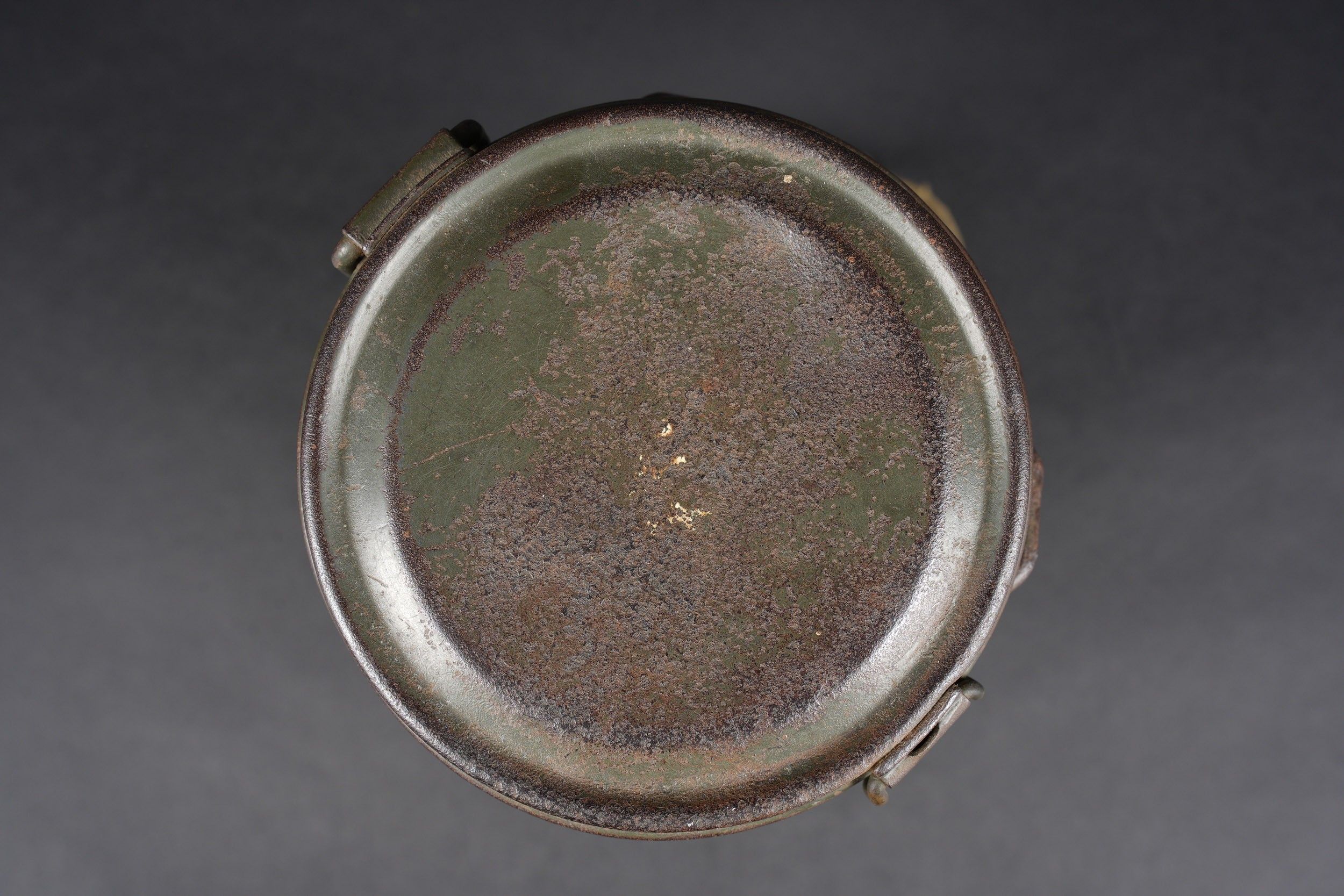German anti-gas mask. Long metal case. 80% Feldgrau paint. Only the lid is oxidised with a few dents. Pull tab complete. Small strap present. The large strap is missing. Number 690 painted on the side of the case. Unreadable name indication in pencil on the spare lenses case. Spare lenses are present. Very soft rubber mask, size 3. All straps are present. Filter with traces of oxidation and missing edges. Dated 1942. Some wear and patina. Condition II+. German gas mask with long metal canister retaining 80% of original Feldgrau paint. Lid slightly oxidized with a few teeth. Pull tab complete. Small strap present, large carrying strap missing. Number 690 painted on side of canister. Illegible pencil-written name on spare lens compartment. Spare lenses included. Rubber mask, very supple, size 3, with all straps present. Filter shows oxidation and edge loss. Dated 1942. Some wear and patina on the piece. Condition II+