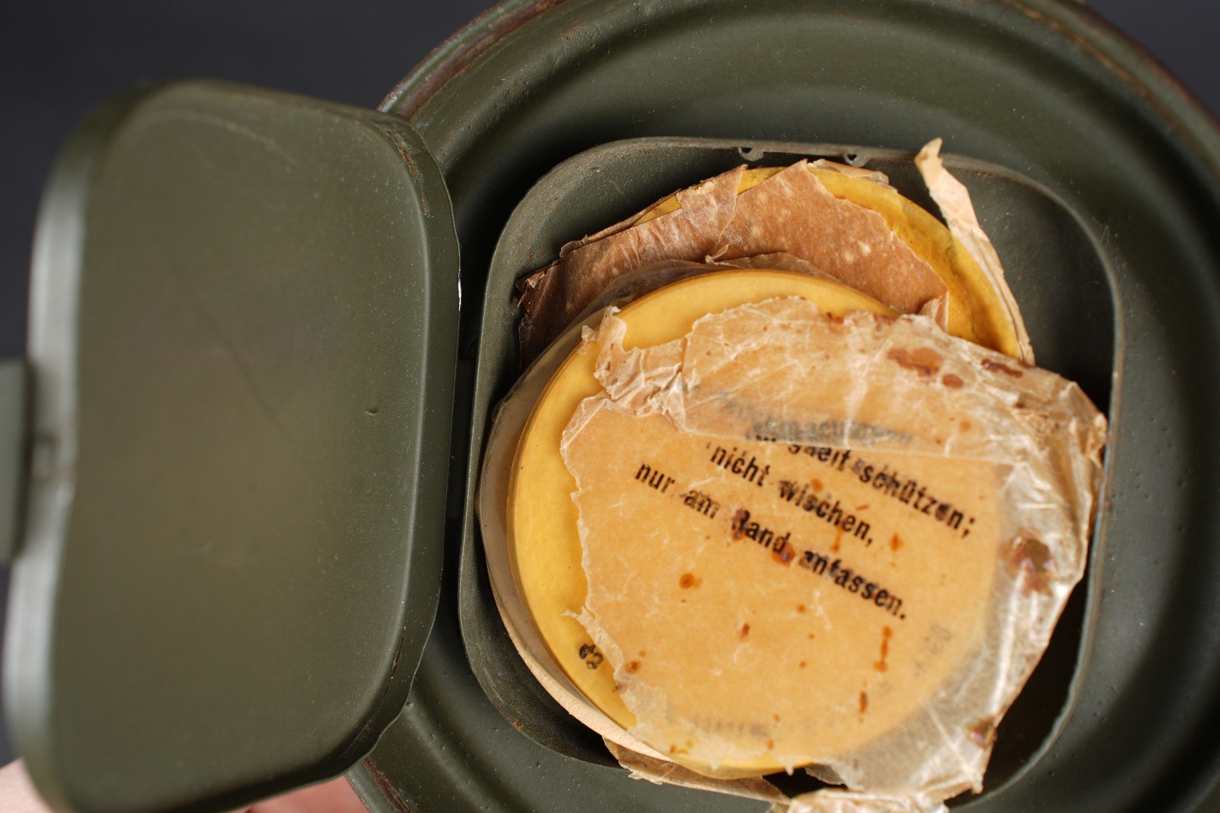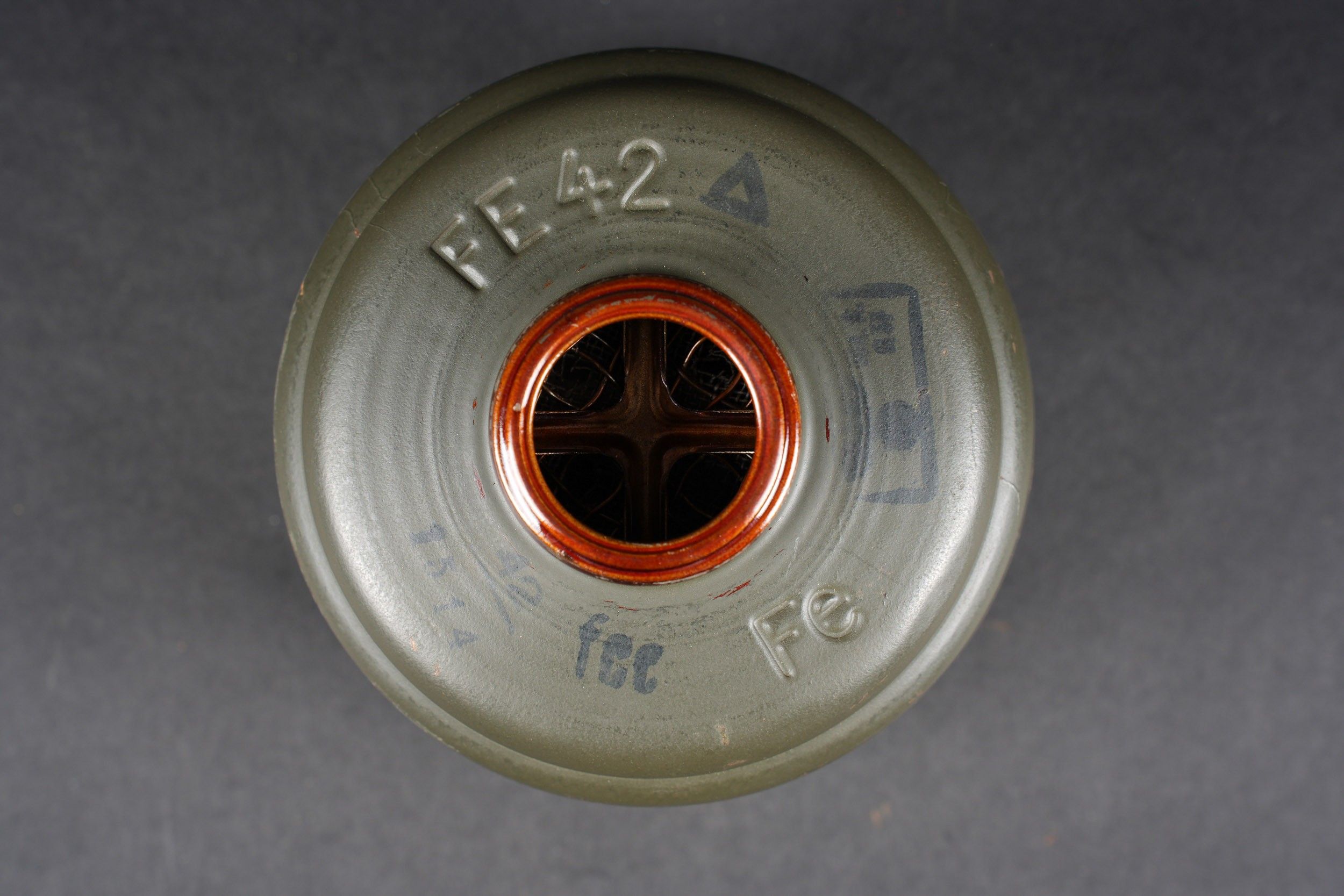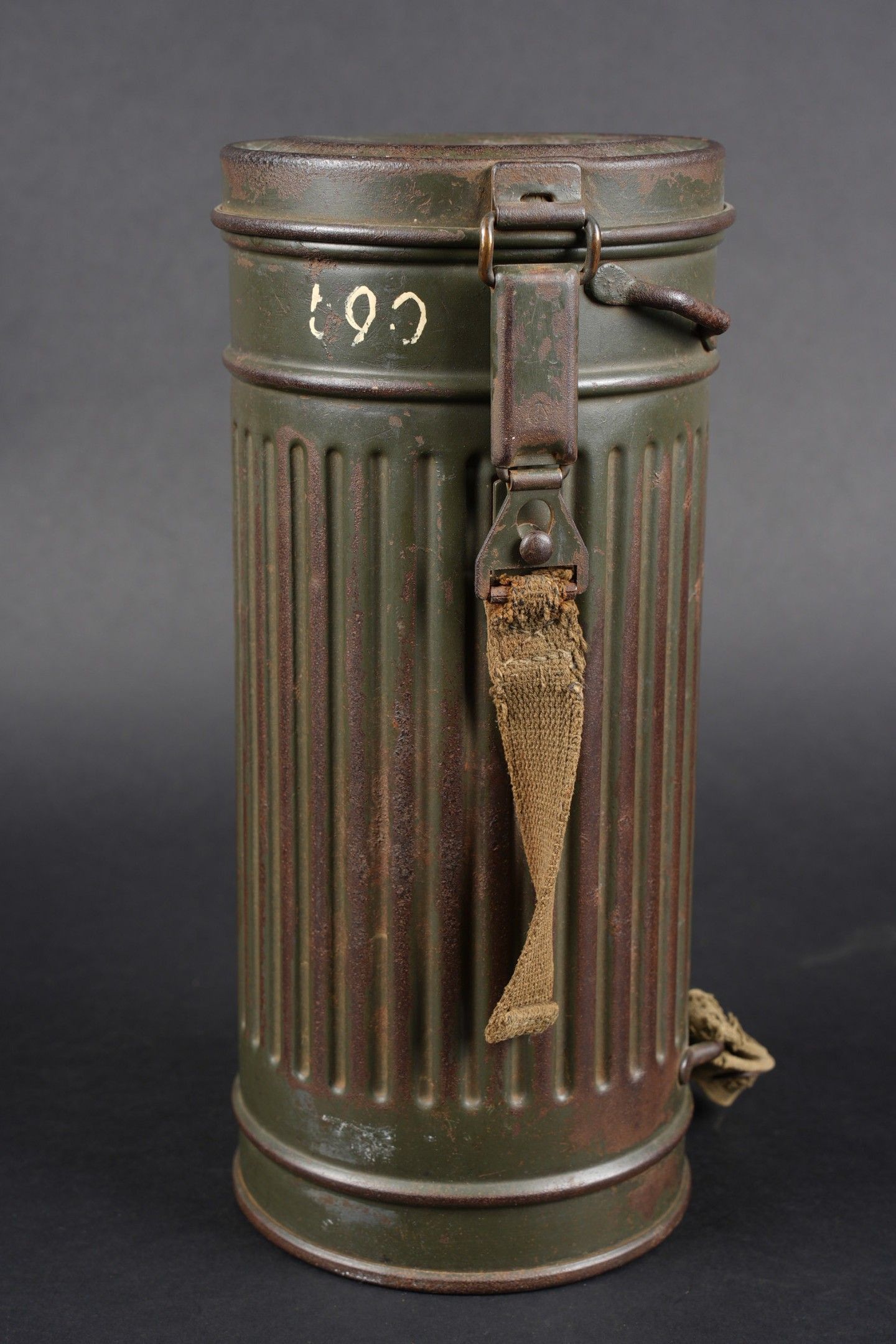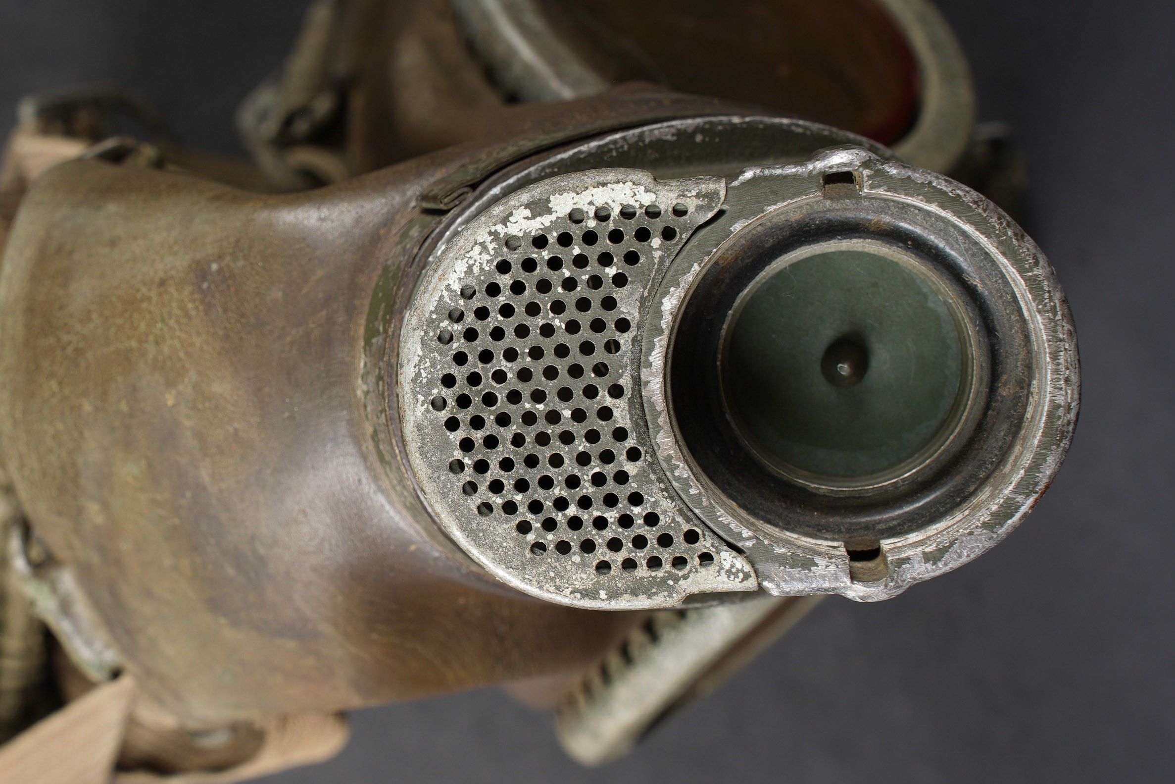 German anti-gas mask. Long metal case. 80% Feldgrau paint. Only the lid is oxidised with a few dents. Pull tab complete. Small strap present. The large strap is missing. Number 690 painted on the side of the case. Unreadable name indication in pencil on the spare lenses case. Spare lenses are present. Very soft rubber mask, size 3. All straps are present. Filter with traces of oxidation and missing edges. Dated 1942. Some wear and patina. Condition II+. German gas mask with long metal canister retaining 80% of original Feldgrau paint. Lid slightly oxidized with a few teeth. Pull tab complete. Small strap present, large carrying strap missing. Number 690 painted on side of canister. Illegible pencil-written name on spare lens compartment. Spare lenses included. Rubber mask, very supple, size 3, with all straps present. Filter shows oxidation and edge loss. Dated 1942. Some wear and patina on the piece. Condition II+