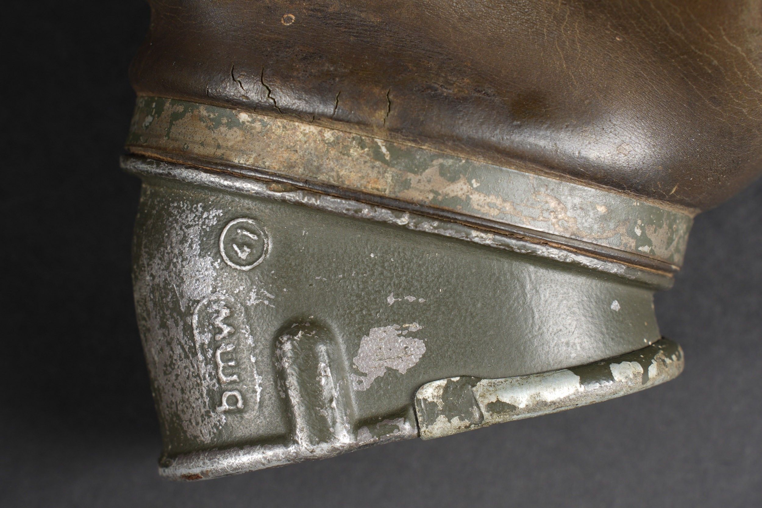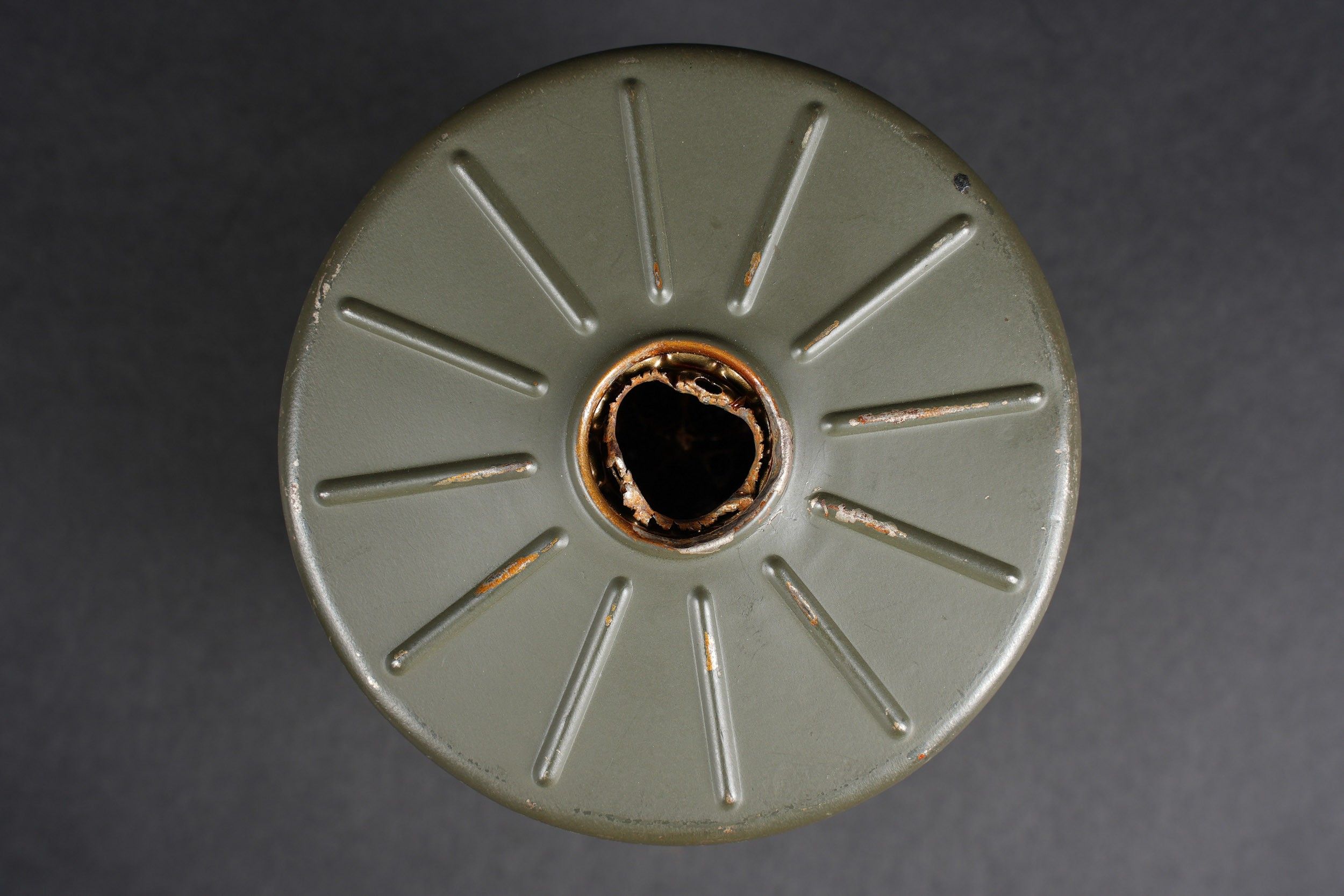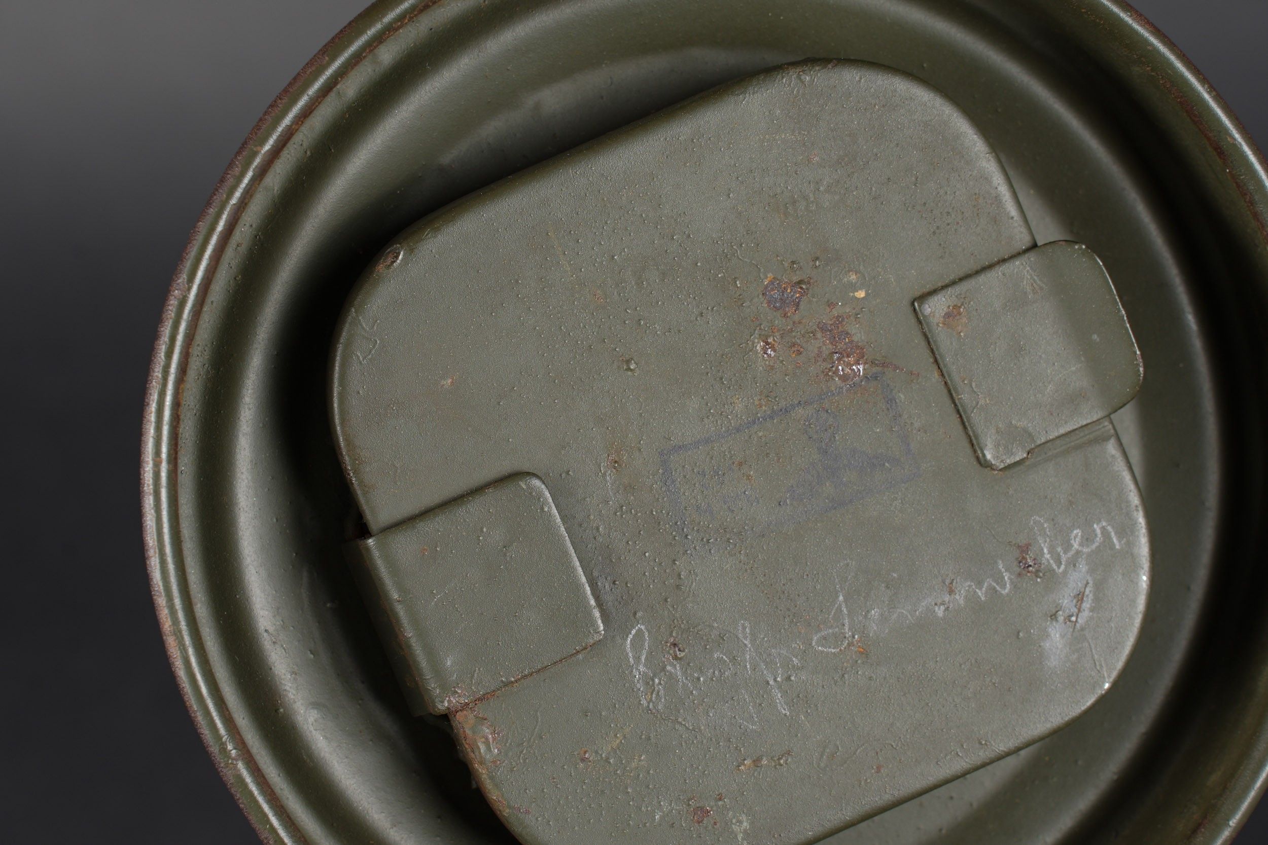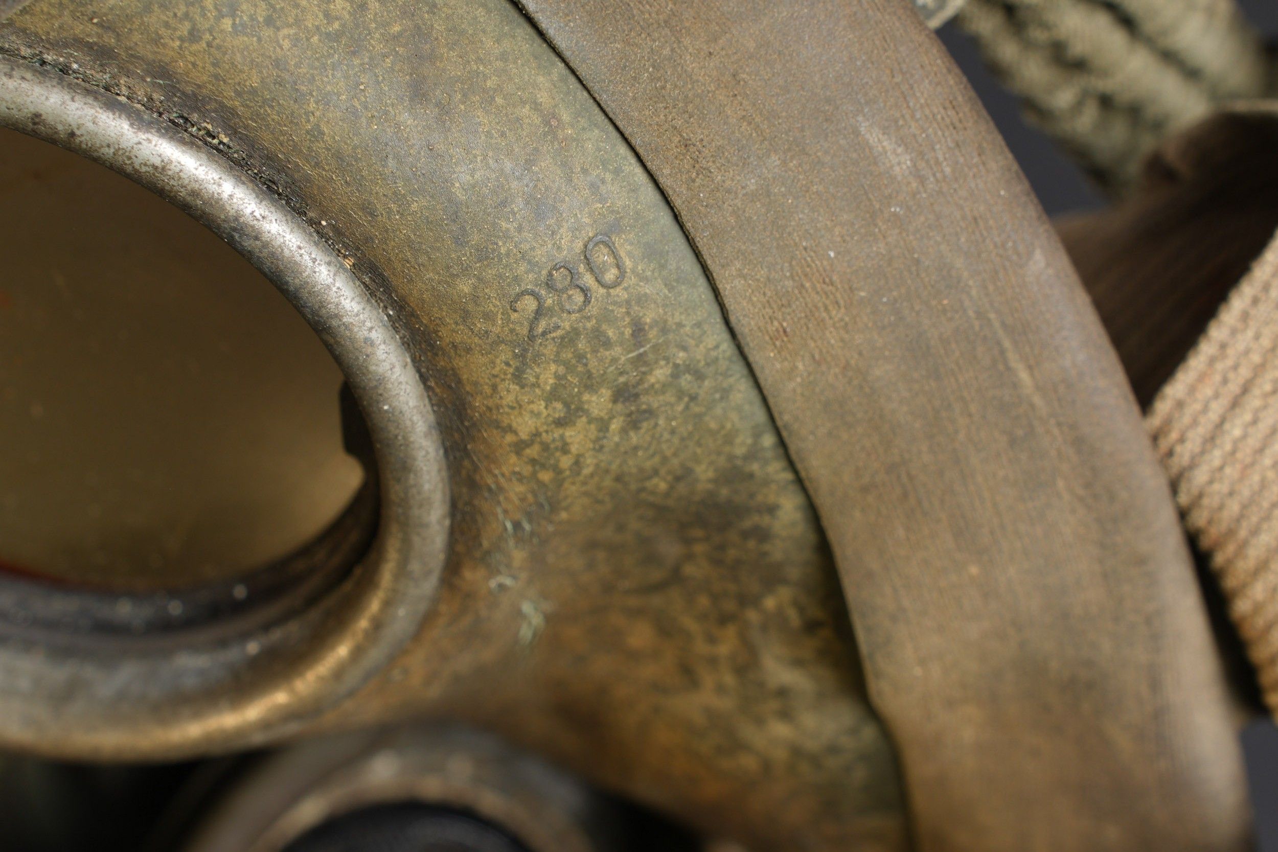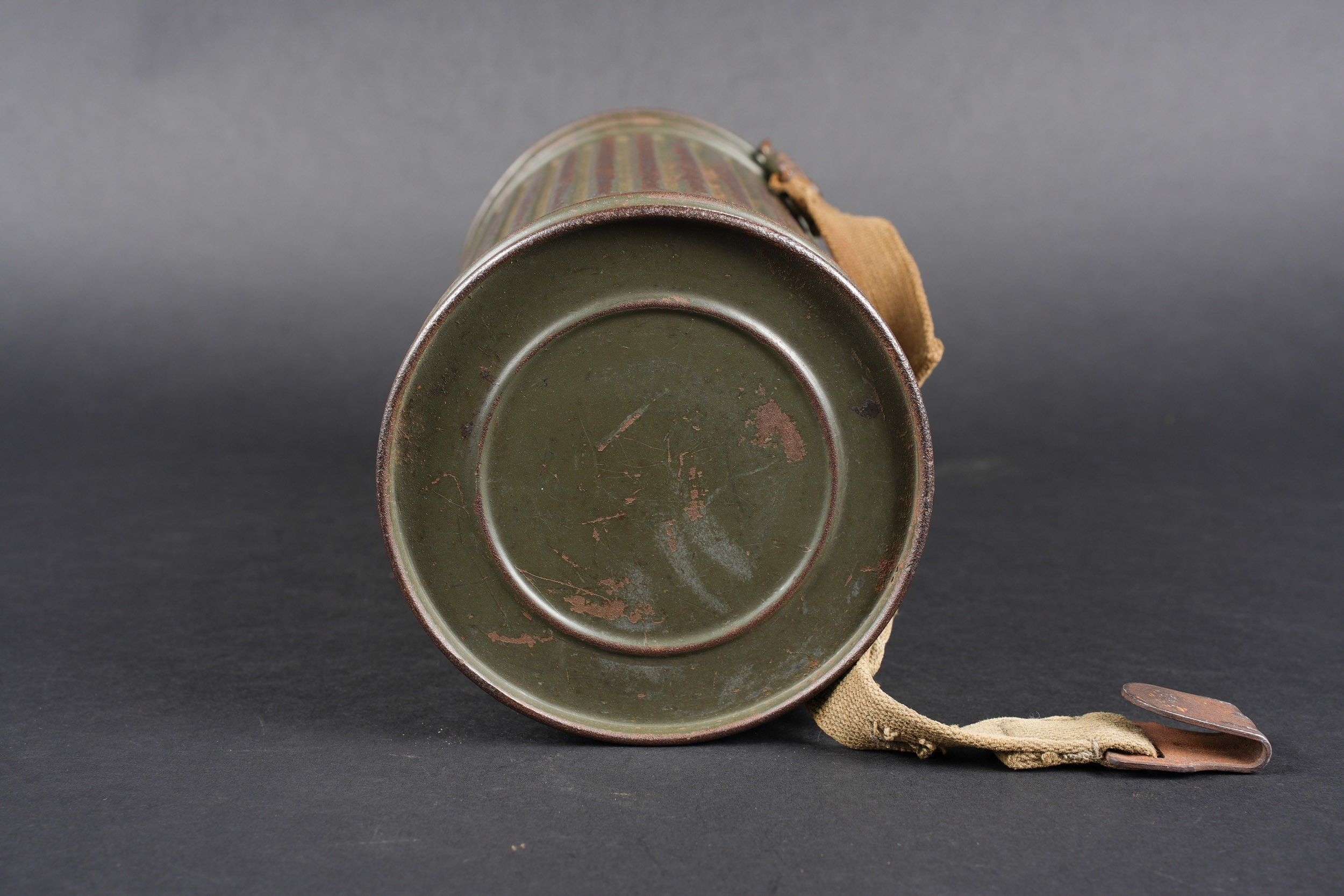 German anti-gas mask. Long metal case. 80% Feldgrau paint. Only the lid is oxidised with a few dents. Pull tab complete. Small strap present. The large strap is missing. Number 690 painted on the side of the case. Unreadable name indication in pencil on the spare lenses case. Spare lenses are present. Very soft rubber mask, size 3. All straps are present. Filter with traces of oxidation and missing edges. Dated 1942. Some wear and patina. Condition II+. German gas mask with long metal canister retaining 80% of original Feldgrau paint. Lid slightly oxidized with a few teeth. Pull tab complete. Small strap present, large carrying strap missing. Number 690 painted on side of canister. Illegible pencil-written name on spare lens compartment. Spare lenses included. Rubber mask, very supple, size 3, with all straps present. Filter shows oxidation and edge loss. Dated 1942. Some wear and patina on the piece. Condition II+