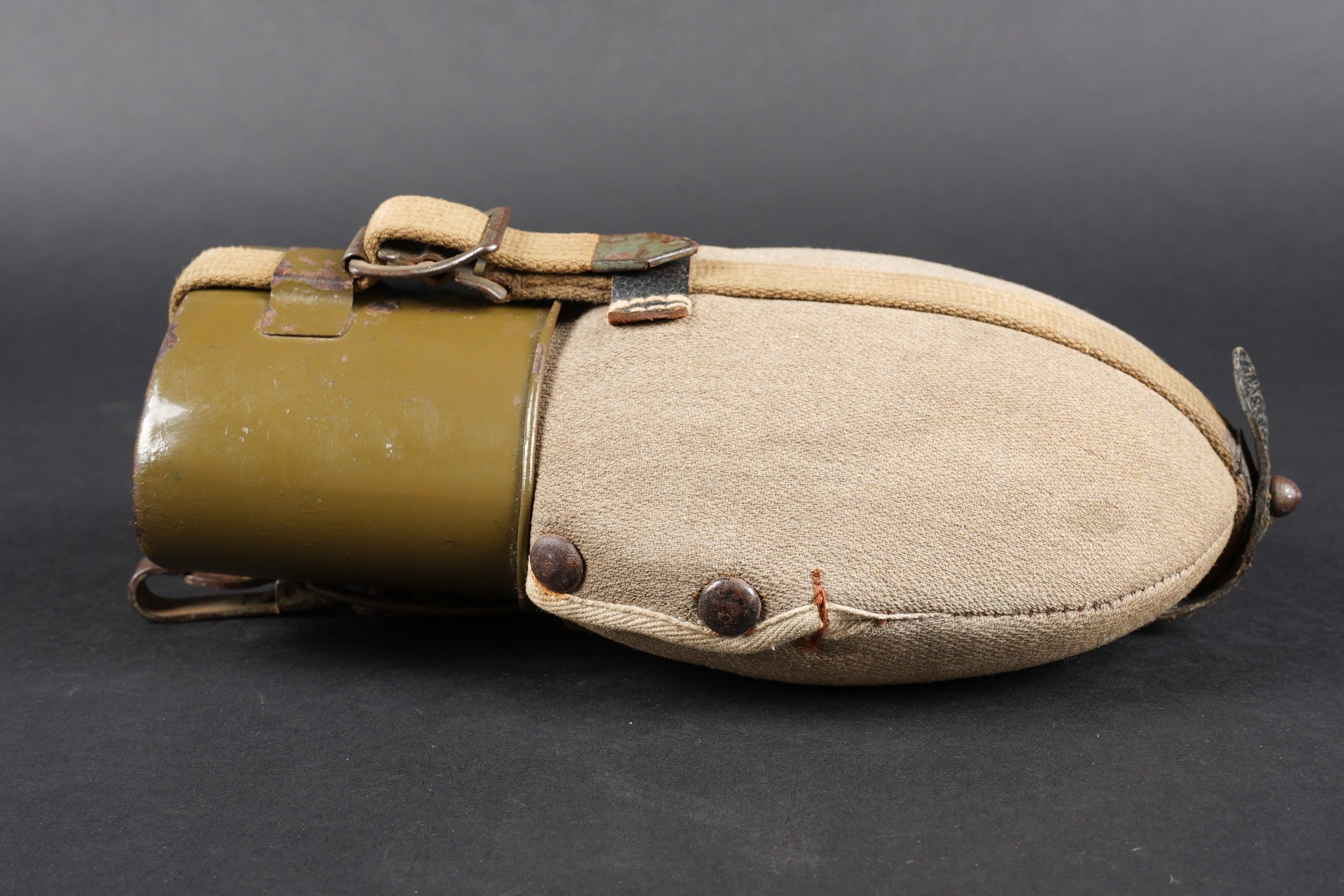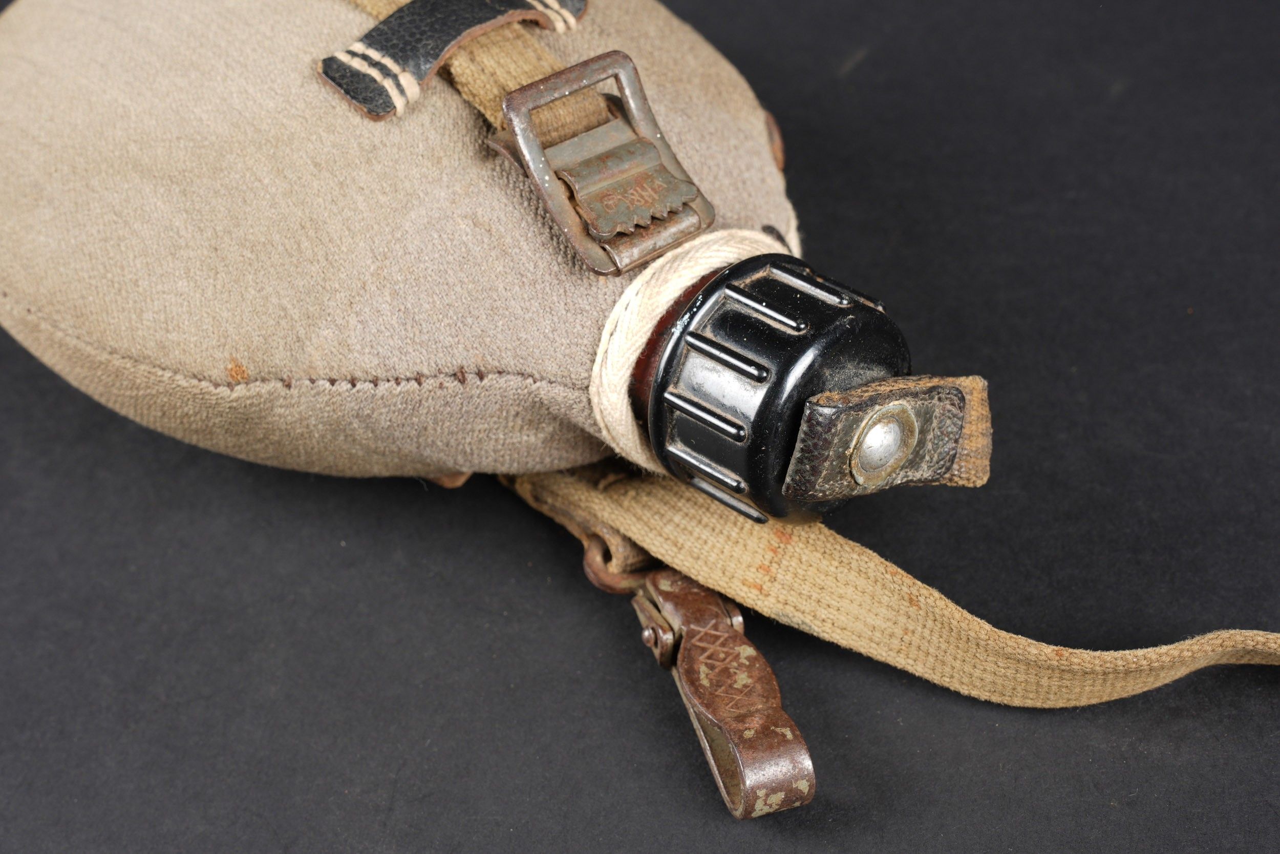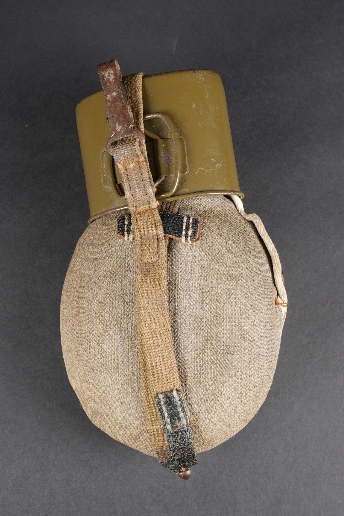 German bottle. Bottle in red enamelled metal. Black bakelite stopper. Grey ersatz canvas cover. The press studs are functional. Some stains visible on the cover. Black leather and canvas harness. Functional snap hook. Metal quarter, 80% gloss Feldgrau paint. Markings are illegible. Some wear and patina. Condition II+. German canteen in red enameled metal with black bakelite cap. Ersatz grey fabric cover with functional snap buttons. Some stains on cover. Web and black leather harness complete with working hook. Metal cup with 80% glossy Feldgrau paint. Markings illegible. Some wear and patina on the piece. Condition II+
