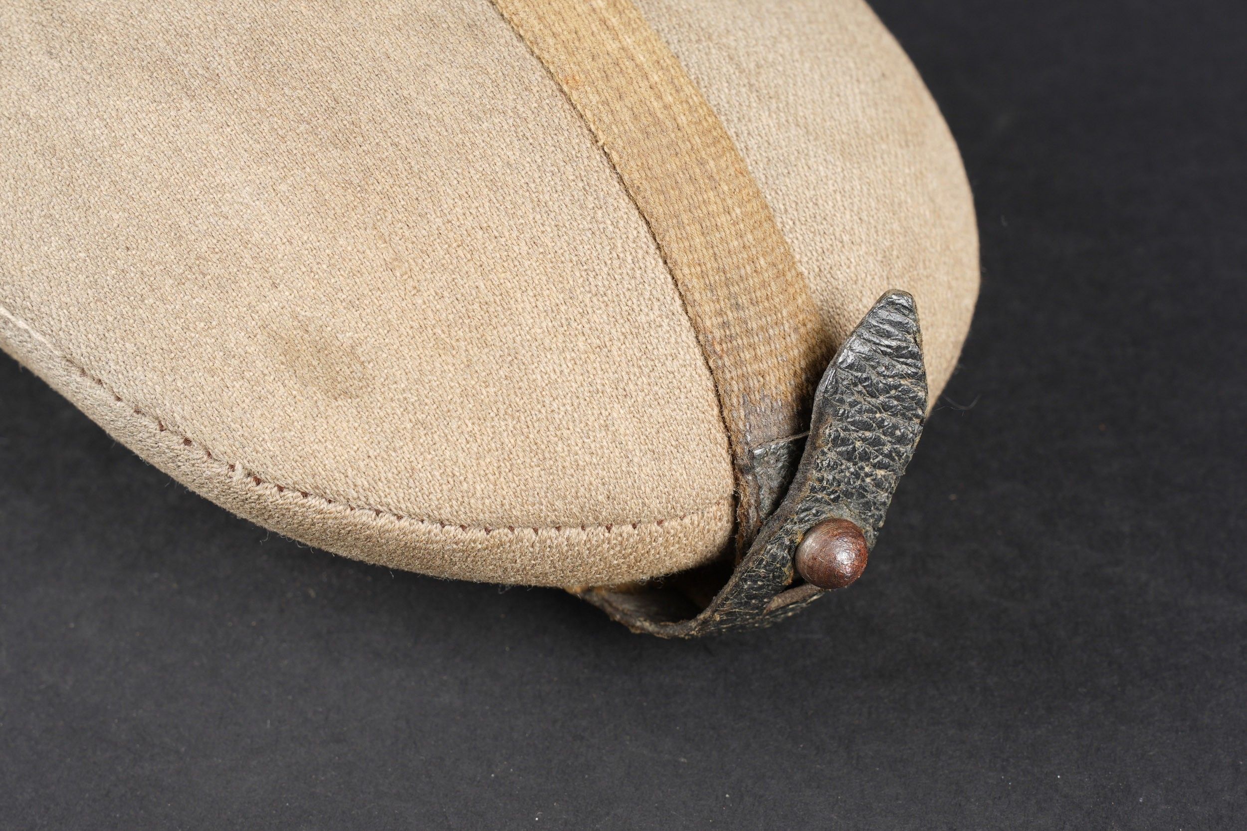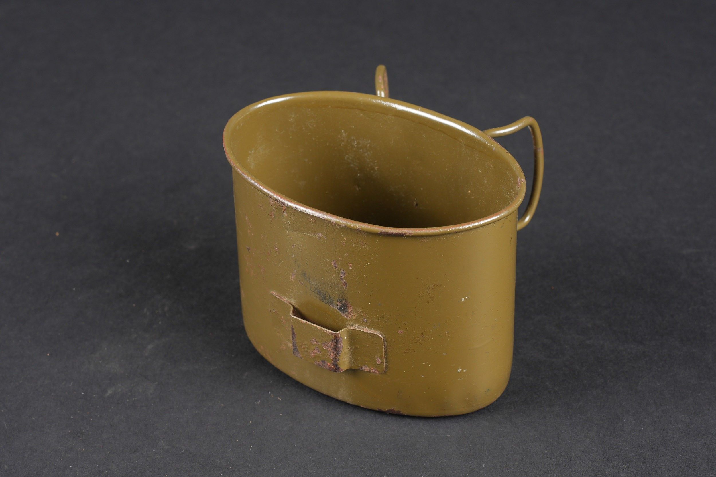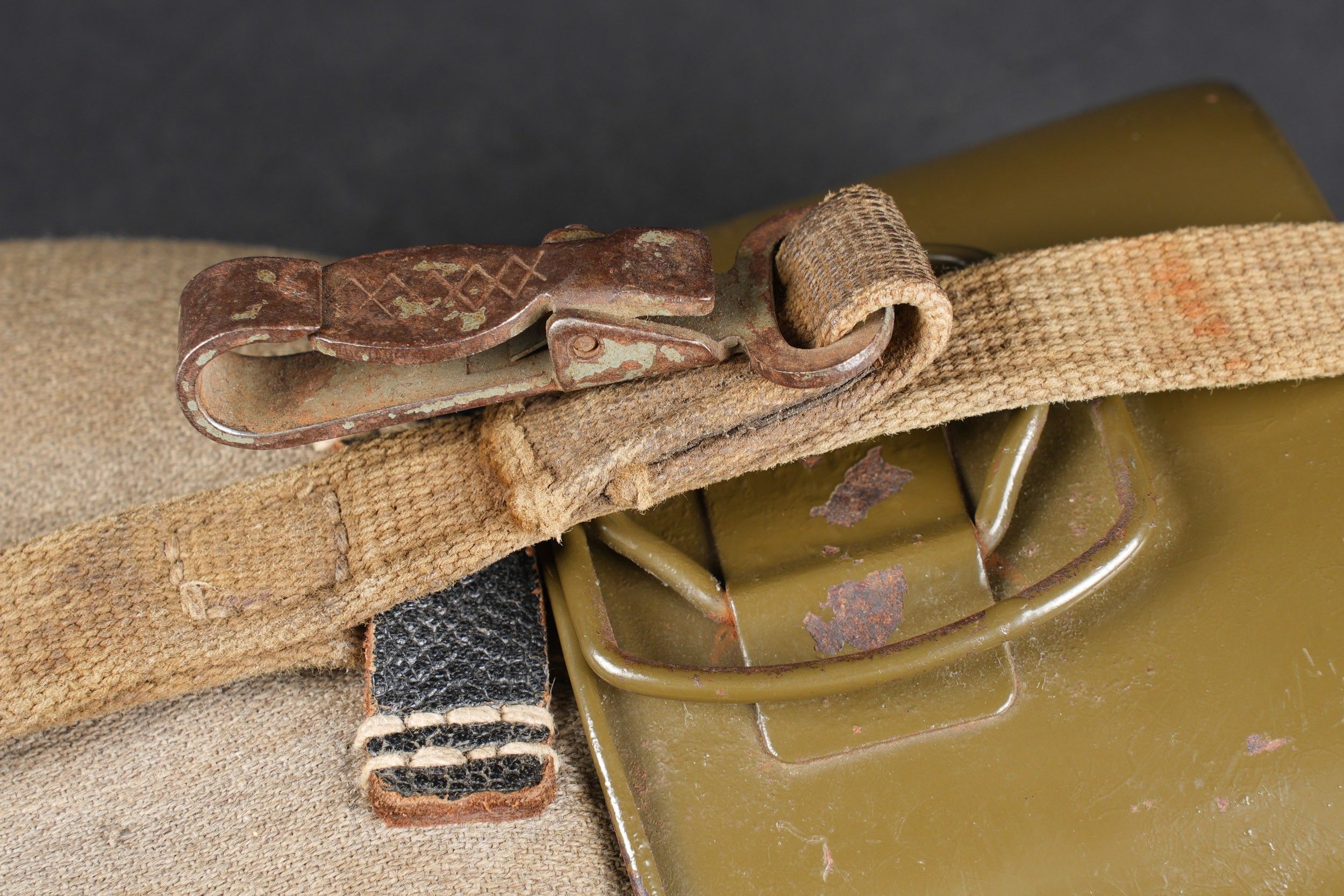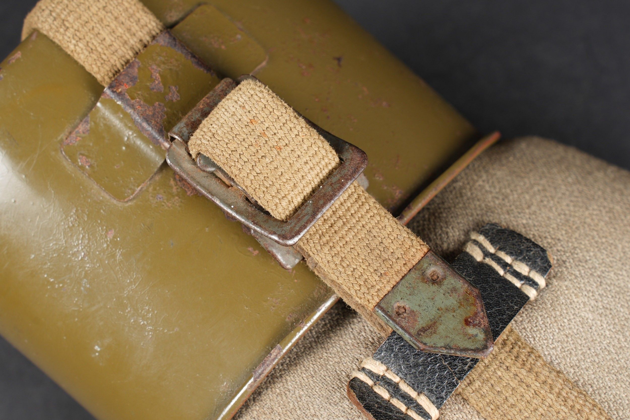 German bottle. Bottle in red enamelled metal. Black bakelite stopper. Grey ersatz canvas cover. The press studs are functional. Some stains visible on the cover. Black leather and canvas harness. Functional snap hook. Metal quarter, 80% gloss Feldgrau paint. Markings are illegible. Some wear and patina. Condition II+. German canteen in red enameled metal with black bakelite cap. Ersatz grey fabric cover with functional snap buttons. Some stains on cover. Web and black leather harness complete with working hook. Metal cup with 80% glossy Feldgrau paint. Markings illegible. Some wear and patina on the piece. Condition II+