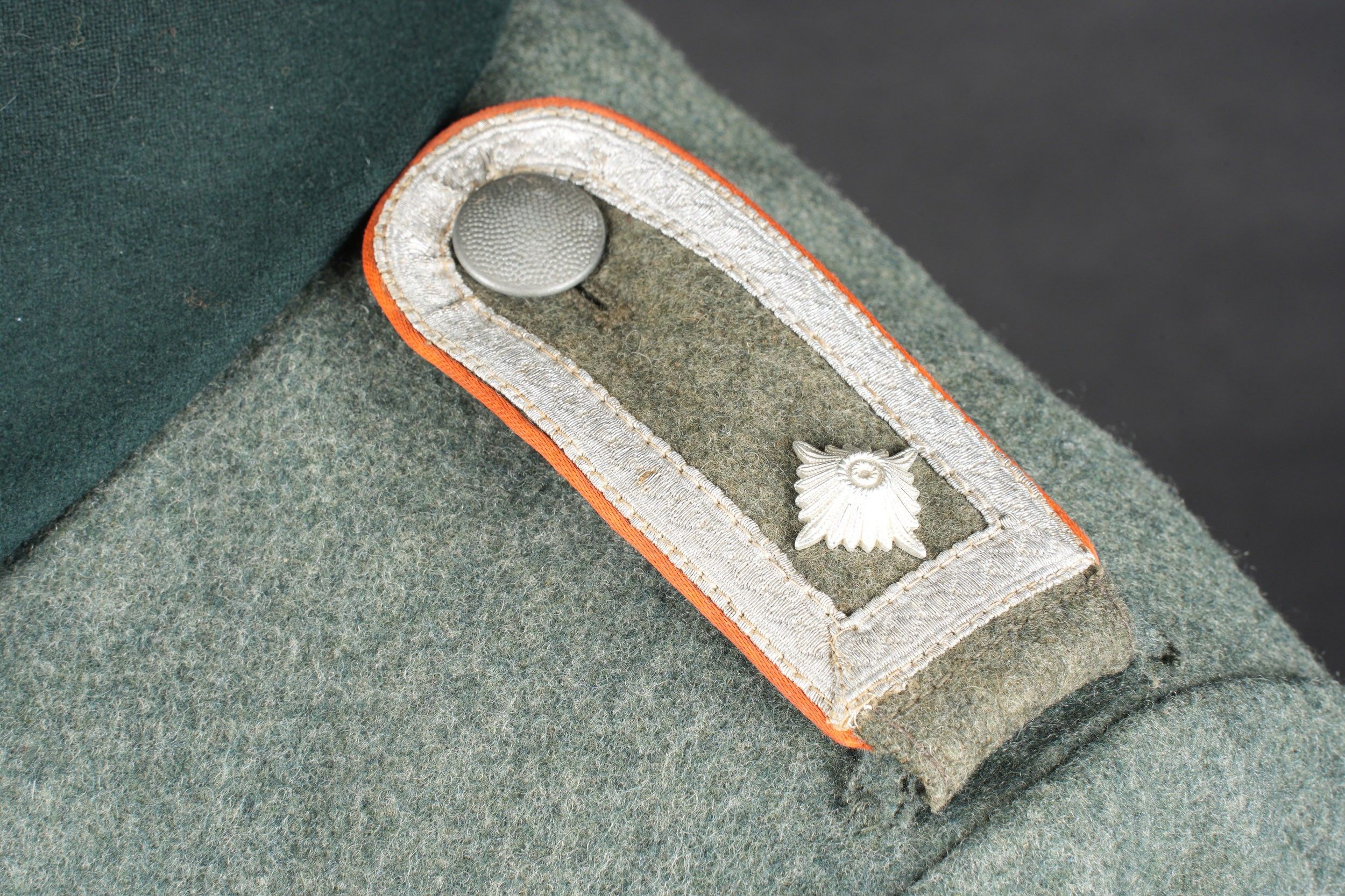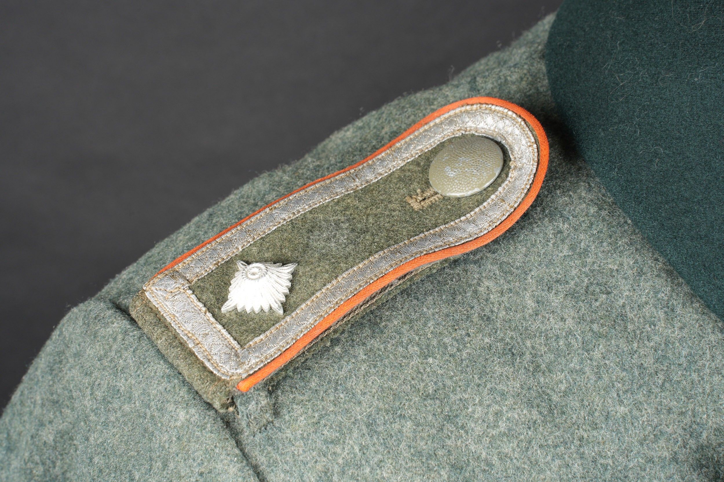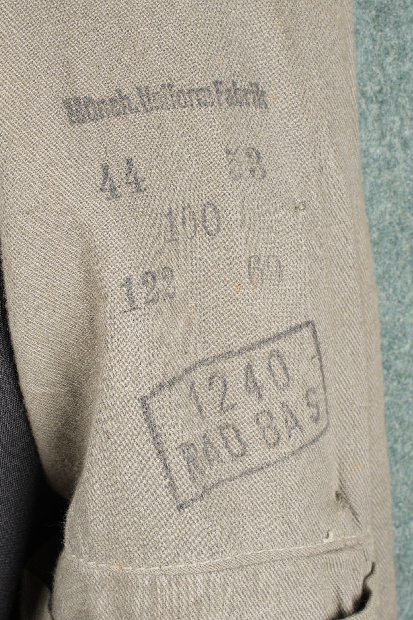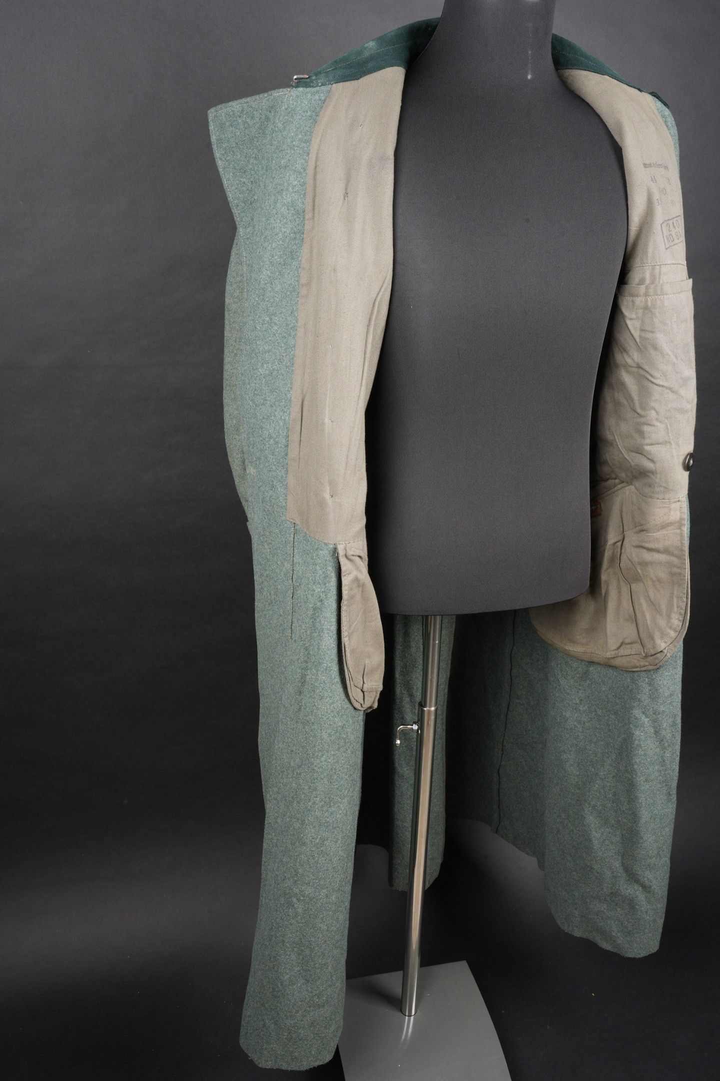 Feldgendarmerie coat. Thick Feldgrau cloth. Duck green collar. All buttons are present and mostly in original colour. Embroidered and hand-sewn Gendarmerie sleeve eagle. Feldwebel shoulder straps in Feldgrau cloth, orange Feldgendarmerie piping. Coat visibly shortened from the period, the hem is missing. Grey cotton lining. Made by Münch Uniform Fabrik. Size indication 44 53 100 122 69, stamp marked 1240 RAD BAS. Some wear and patina to be noted, as well as a few moth marks. Condition II+. Feldgendarmerie greatcoat in thick Feldgrau wool. Collar in duck-green cloth. All buttons present and mostly in original colour. Gendarmerie sleeve eagle hand-embroidered and sewn. Shoulder boards of a Feldwebel in Feldgrau wool with orange piping for Feldgendarmerie. Coat appears period-shortened, hem absent. Interior lined in gray cotton fabric. Maker marked Münch Uniform Fabrik. Size markings 44 53 100 122 69, stamp 1240 RAD BAS. Some wear and patina, with minor moth traces. Condition II+