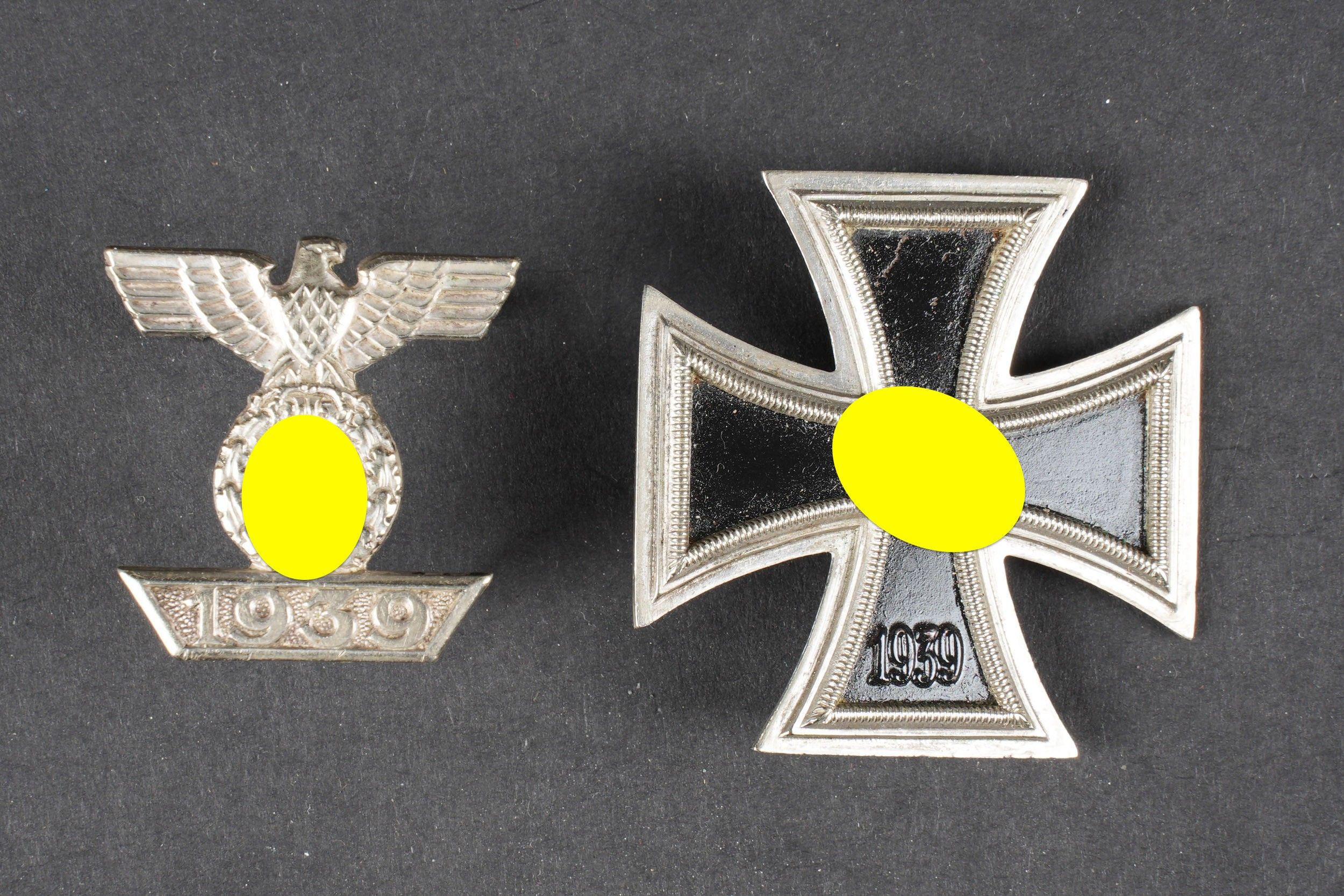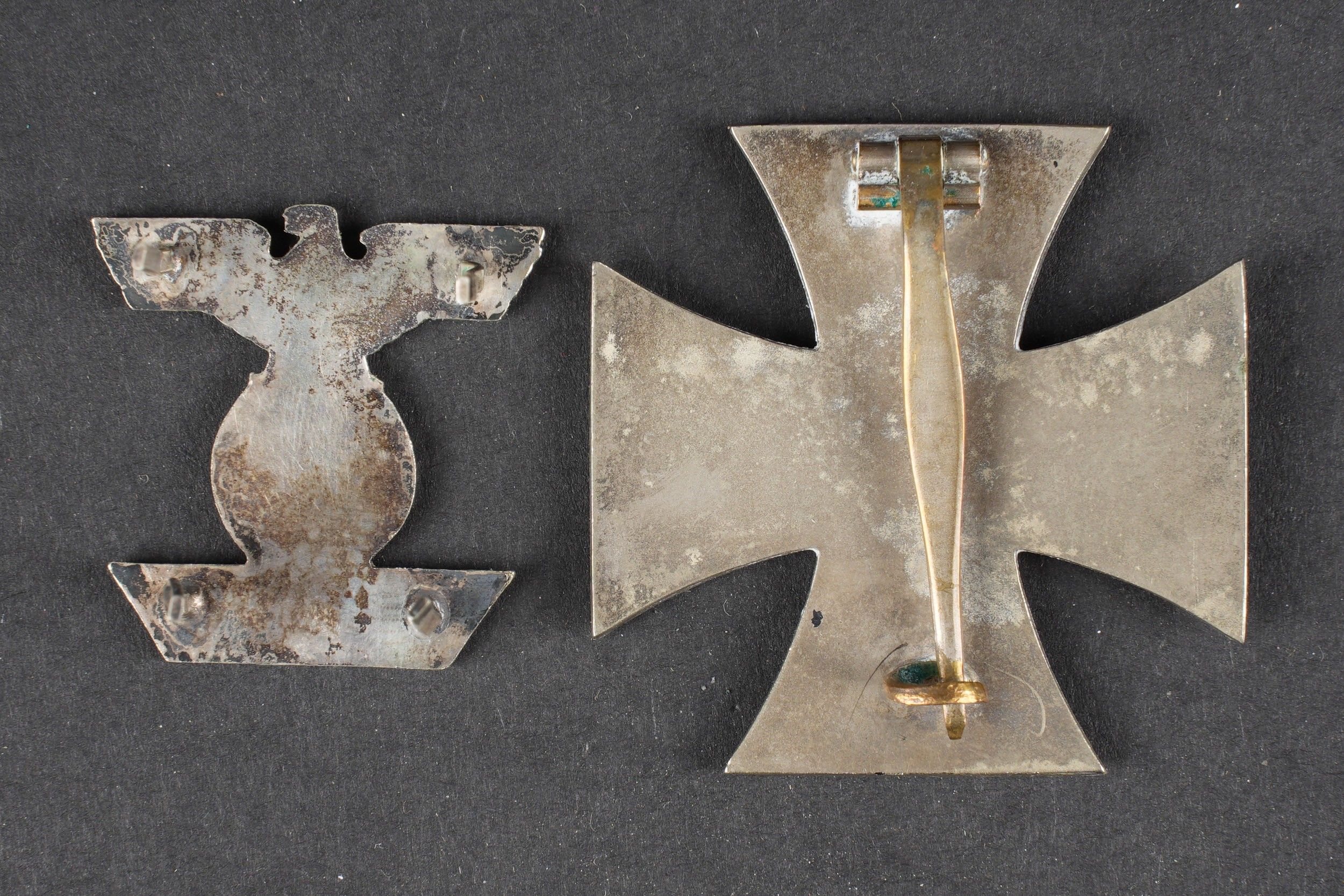 German insignia. Comprising an Iron Cross First Class, made in three parts. Complete fastening, no visible maker's markings. A reminder of the iron cross, metal, silver colour, all fastenings present, no visible markings. The authenticity of the pieces is not guaranteed. Some wear and patina. Condition II+. German insignia. Includes an Iron Cross First Class, three-piece construction, complete pinback, unmarked, and an Iron Cross ribbon bar in silvered metal, all attachments intact, unmarked. Authenticity not guaranteed. Some wear and patina. Condition II+
