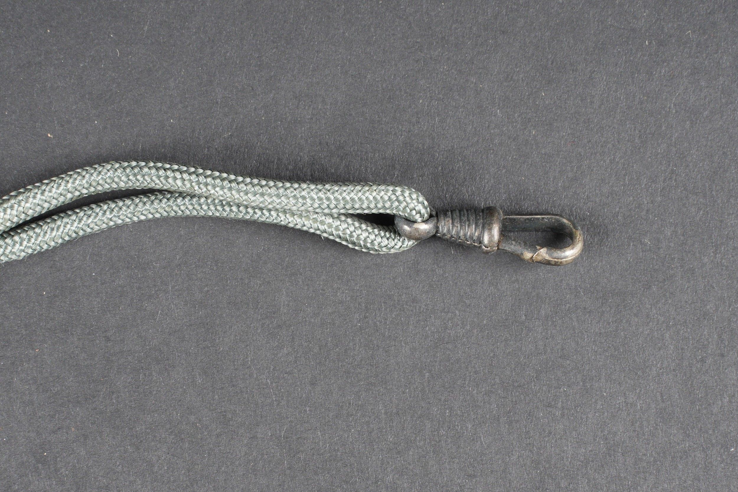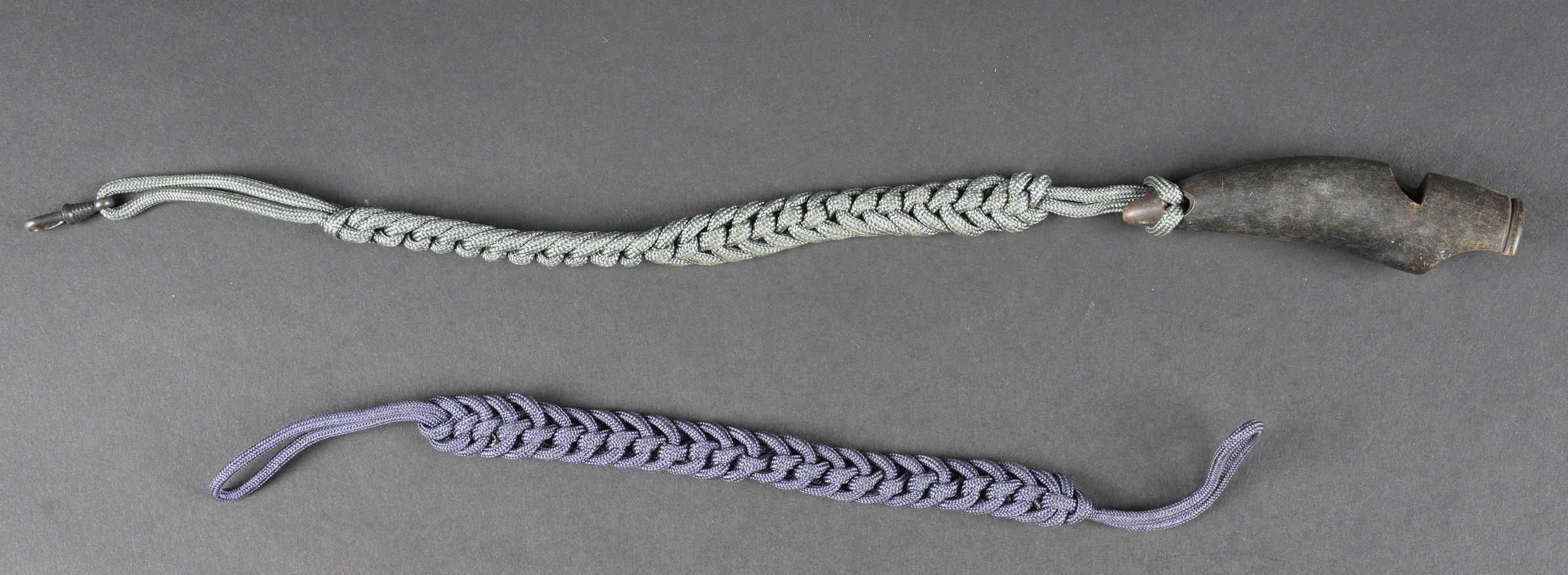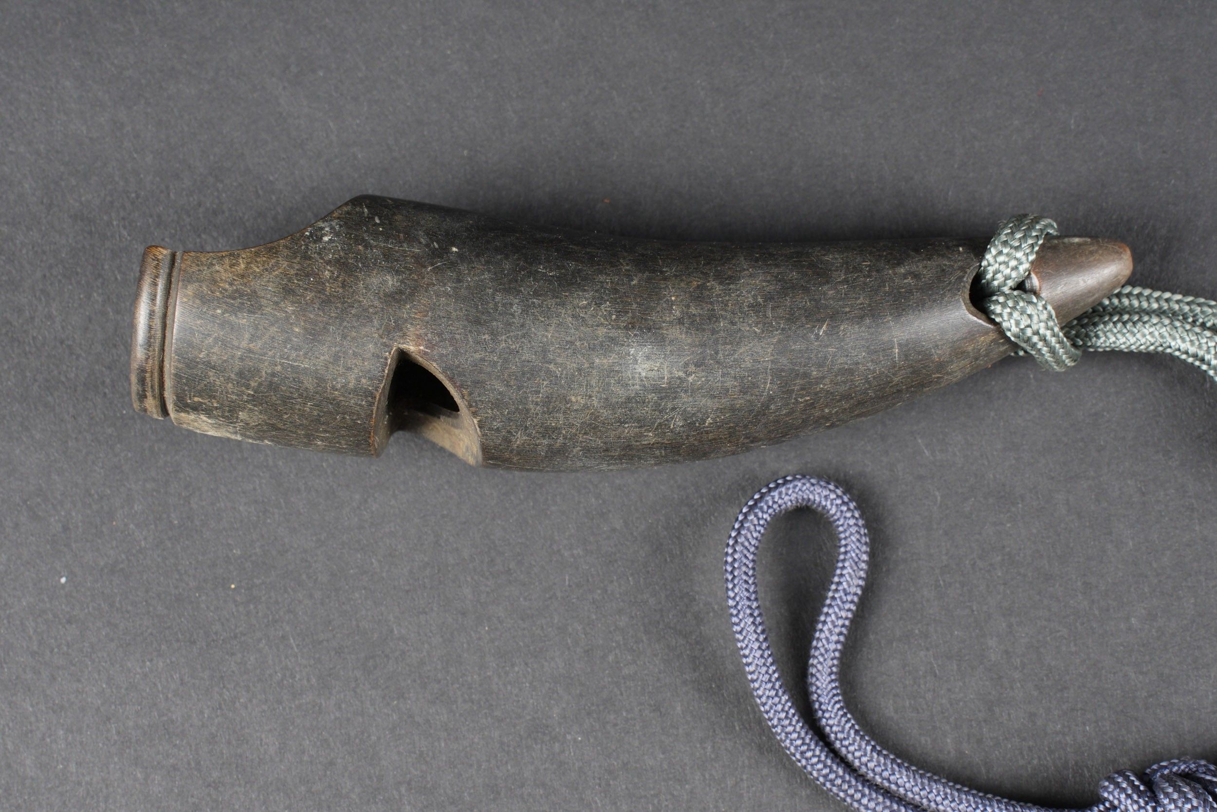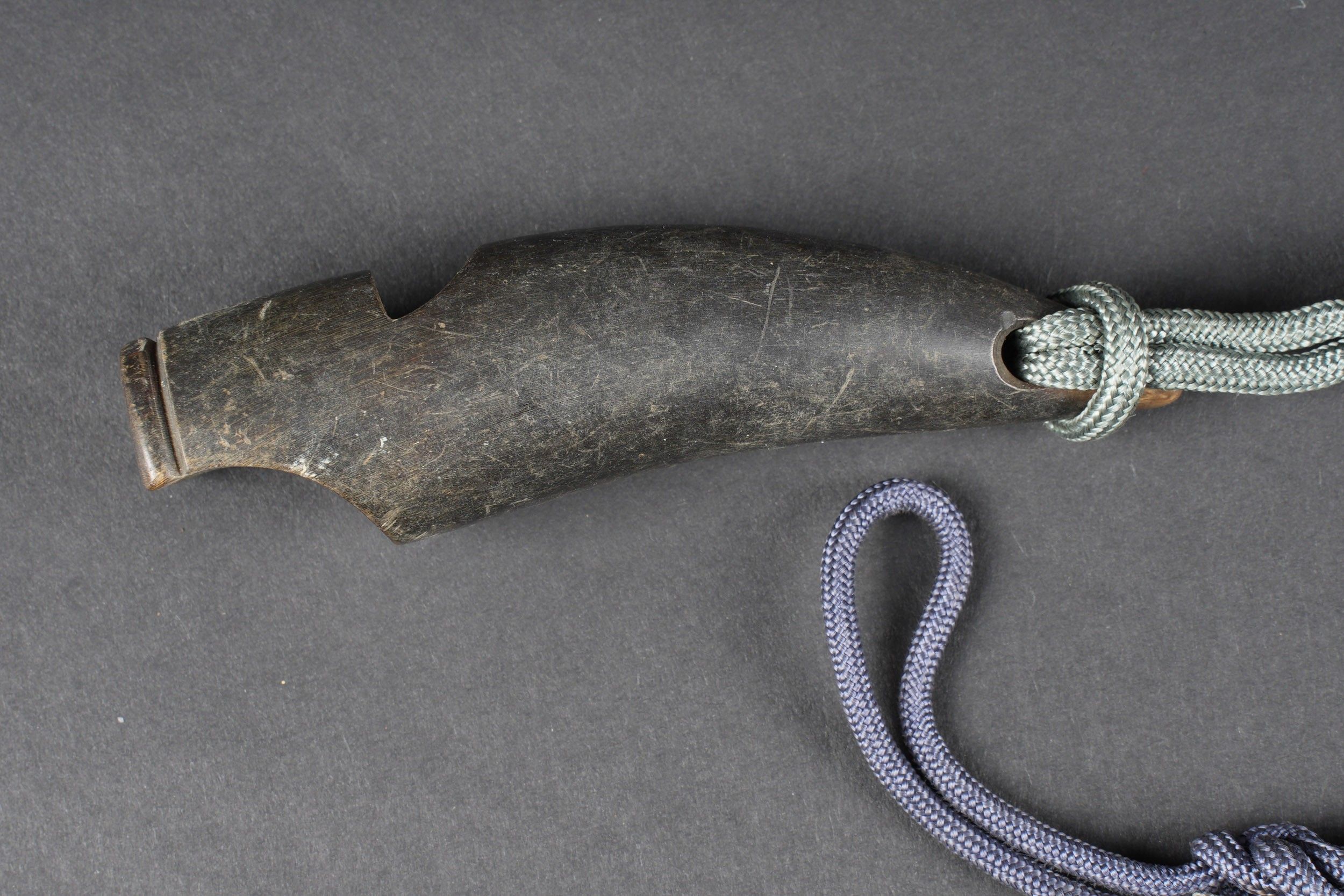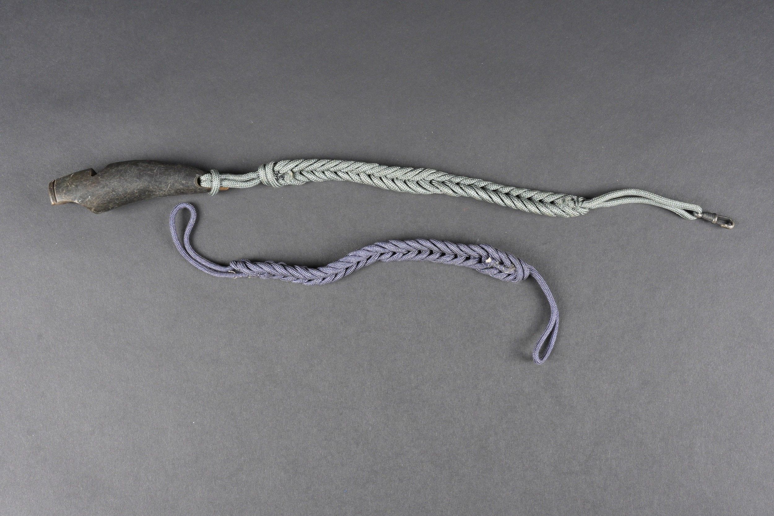 German whistle. Large wooden model, functional. No visible markings. Feldgrau braided lanyard, functional snap hook. A second purple braided cord is attached, without snap hook. Some wear and patina. Condition II+. German whistle, large wooden model, functional. No visible markings. Comes with a Feldgrau braided cord and functional snap hook, plus an additional violet braided cord without hook. Some wear and patina. Condition II+