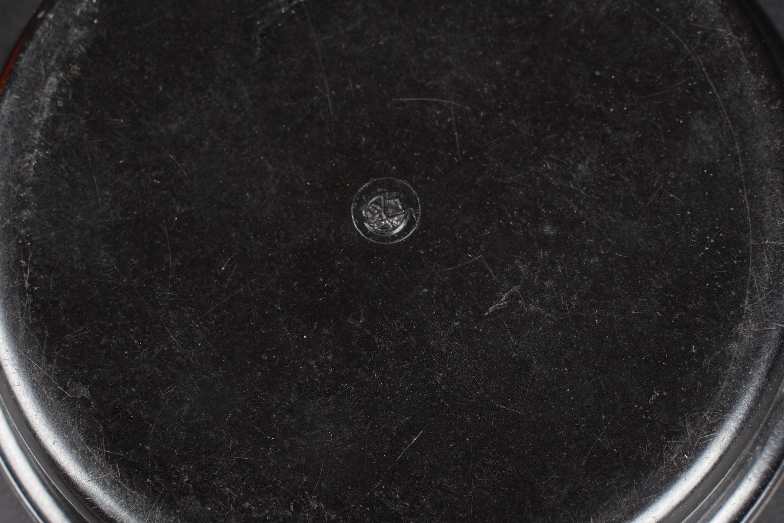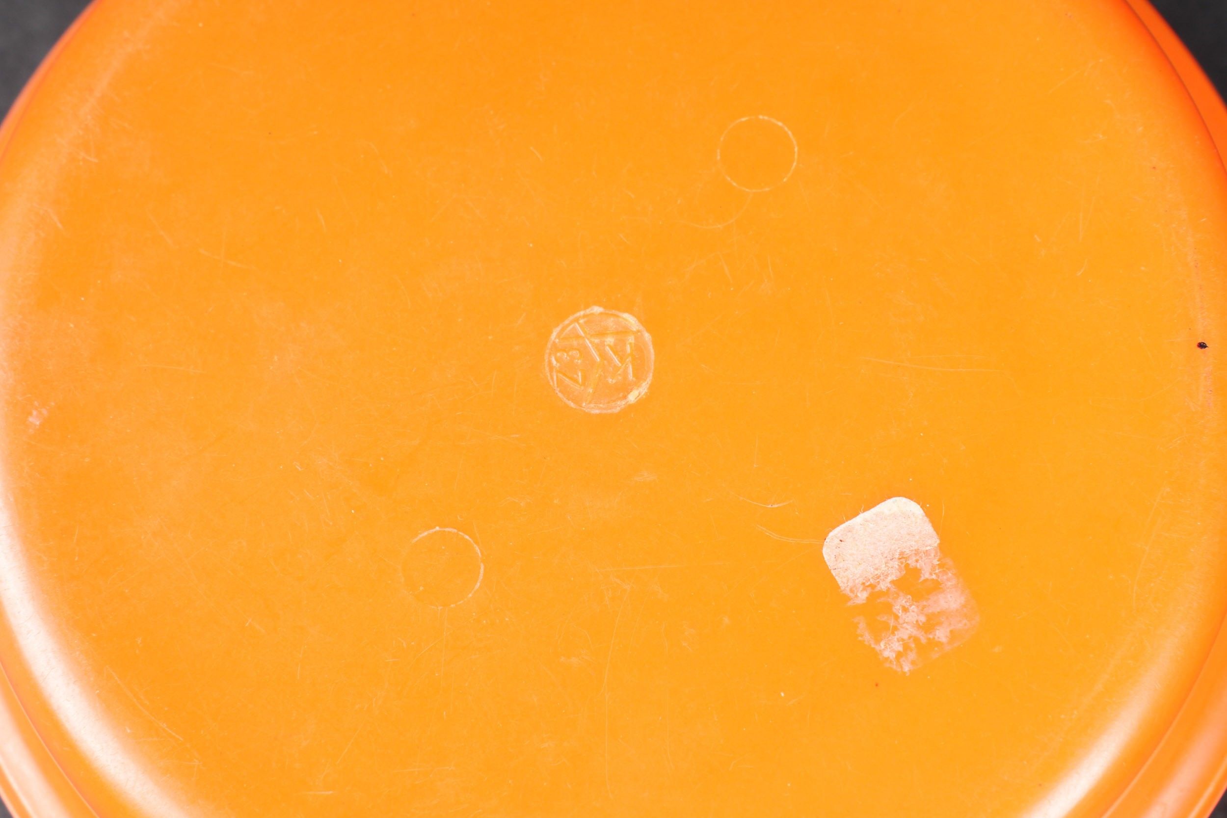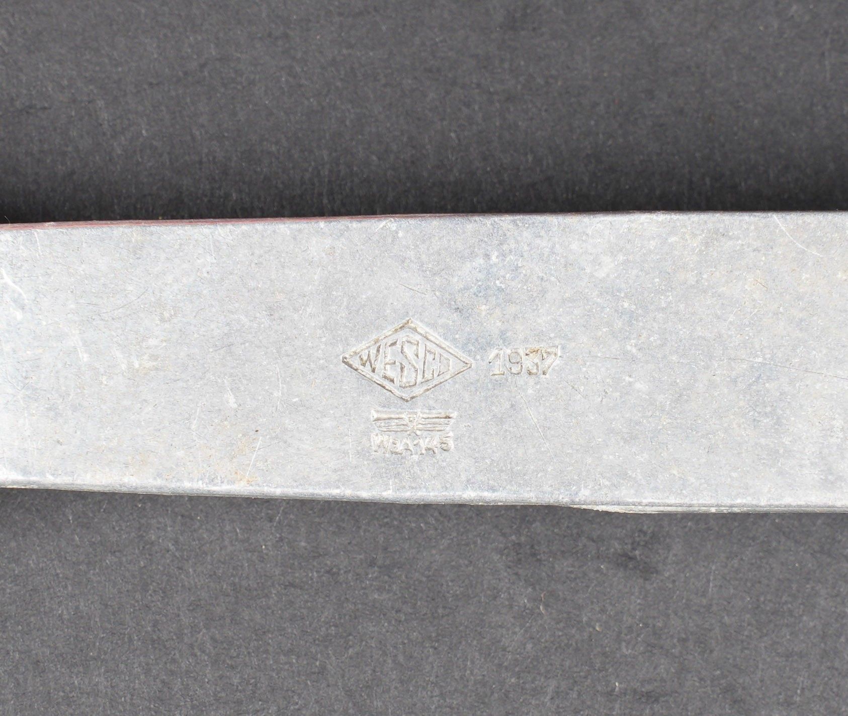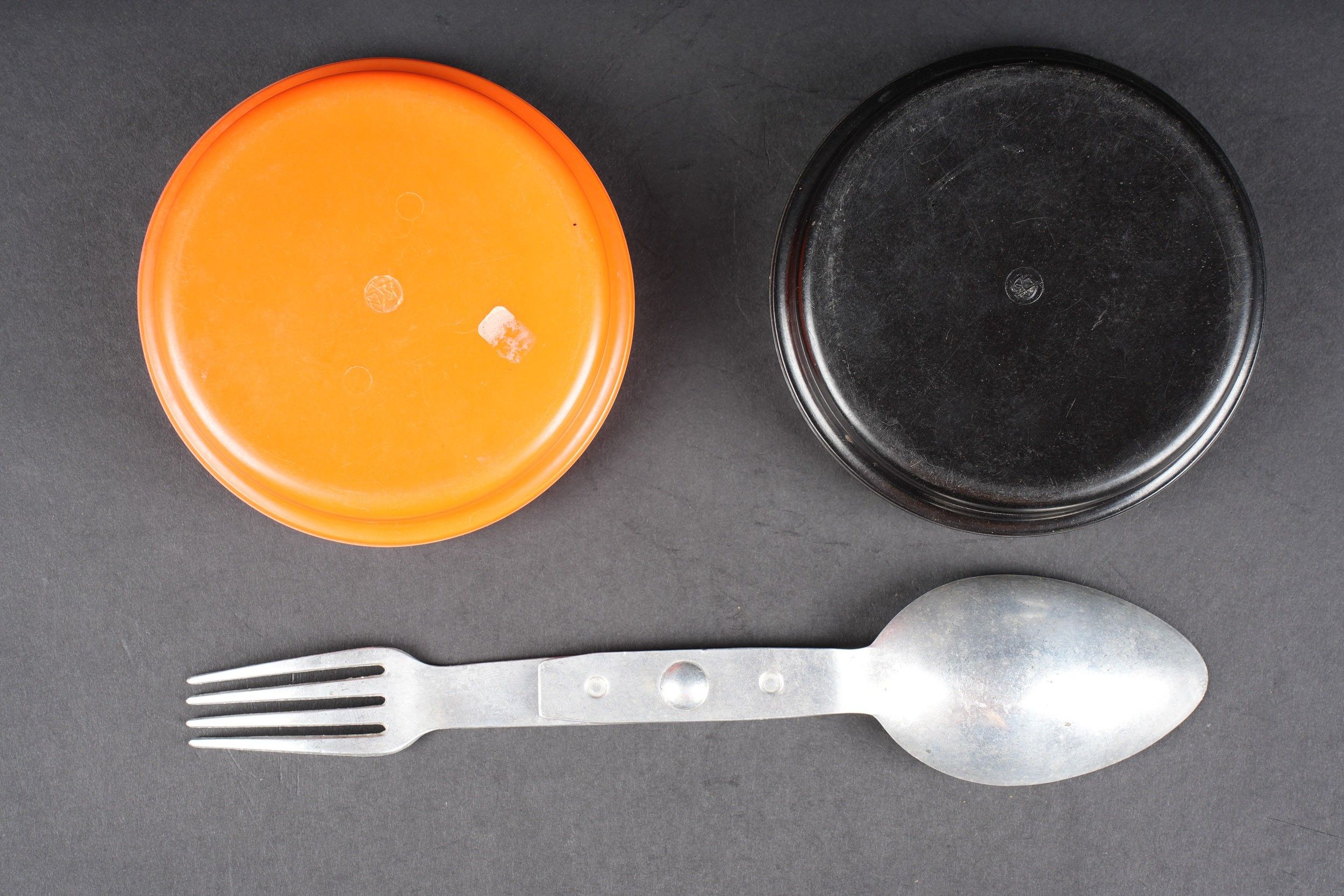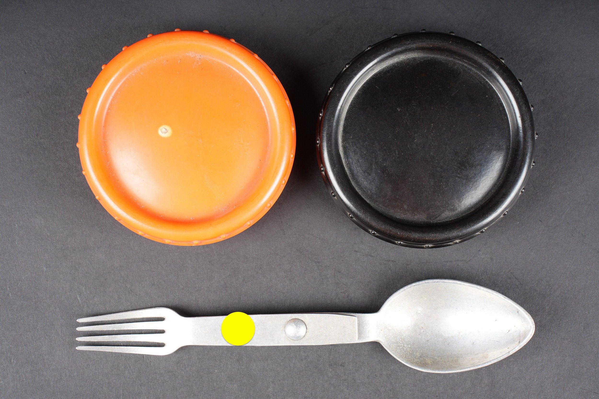 German butter dish. Comprising one black bakelite butter dish, complete, no cracks. One orange bakelite butter dish, complete, no cracks. Also included is an individual aluminium cutlery set, made by Wesco 1937, with Waa eagle. Some wear and patina to be noted. Condition II+. German butter dishes. Includes a complete black bakelite butter dish without cracks, an orange bakelite butter dish without cracks, and an individual aluminium mess utensil set marked Wesco 1937 with eagle Waa. Some wear and patina on the pieces. Condition II+