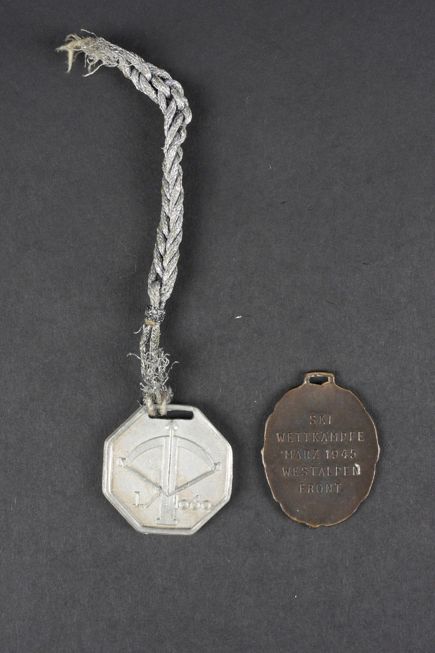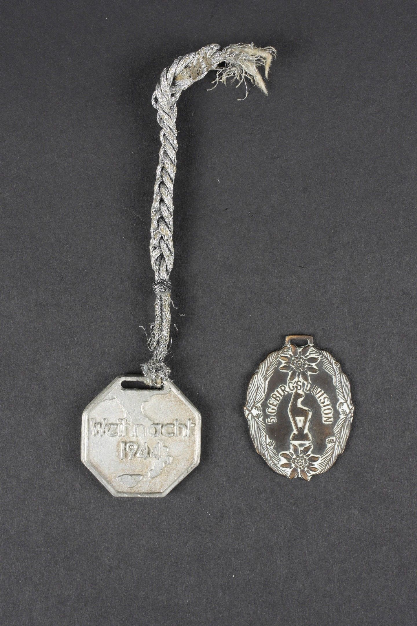 Insignia for mountain troops. Comprising metal badge marked I1060 Weihnacht 1944. Silver braided cord heavily worn. A metal badge marked 5 Gebirgsdivision, Ski Wettkämpfe März 1945 Westalpen Front. Some wear and patina to be noted. Condition II+. Mountain troop insignia. Includes a metal badge marked I1060 Weihnacht 1944 with worn silver braid cord, and a metal badge marked 5. Gebirgsdivision, Ski Wettkämpfe März 1945 Westalpen Front. Some wear and patina. Condition II+