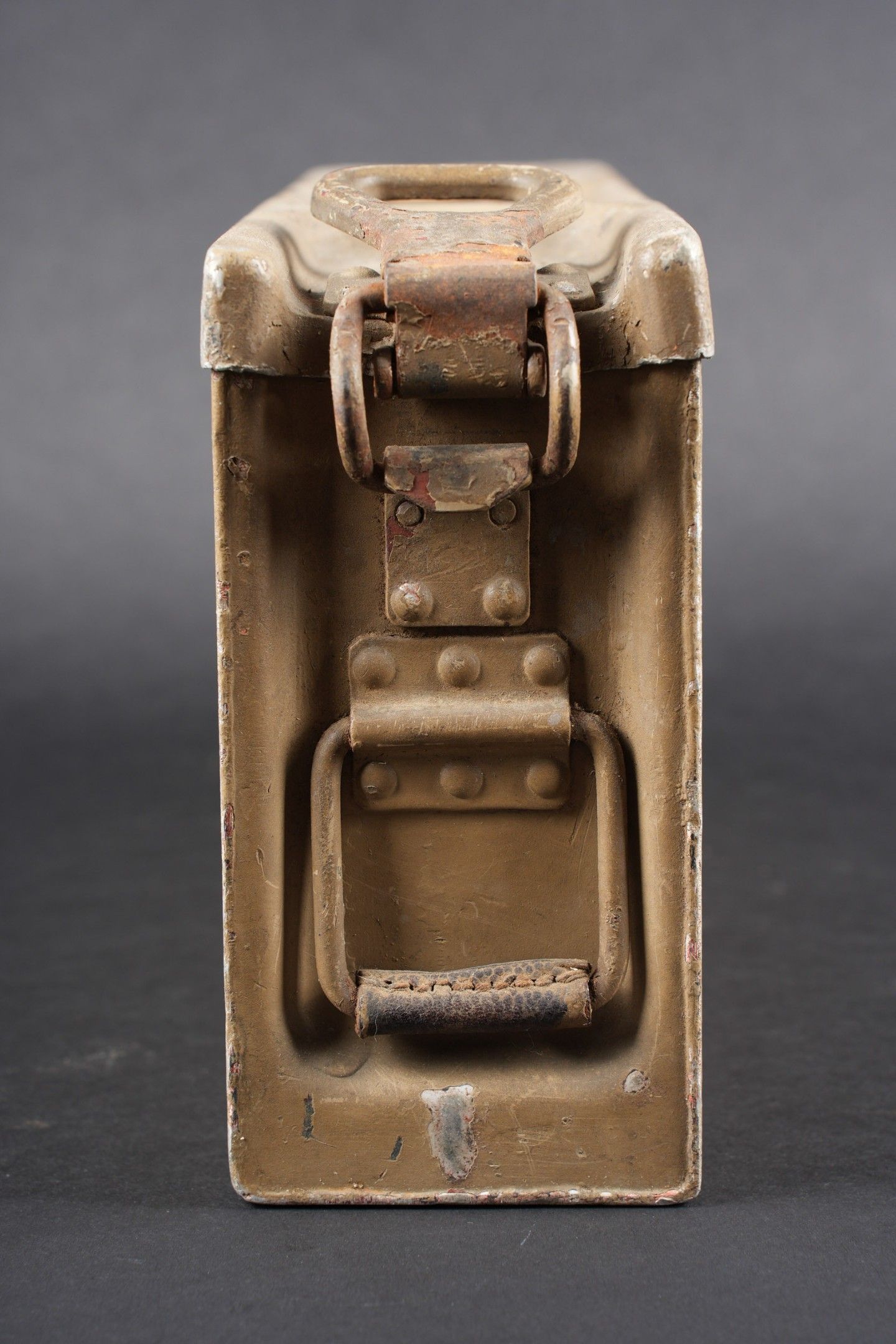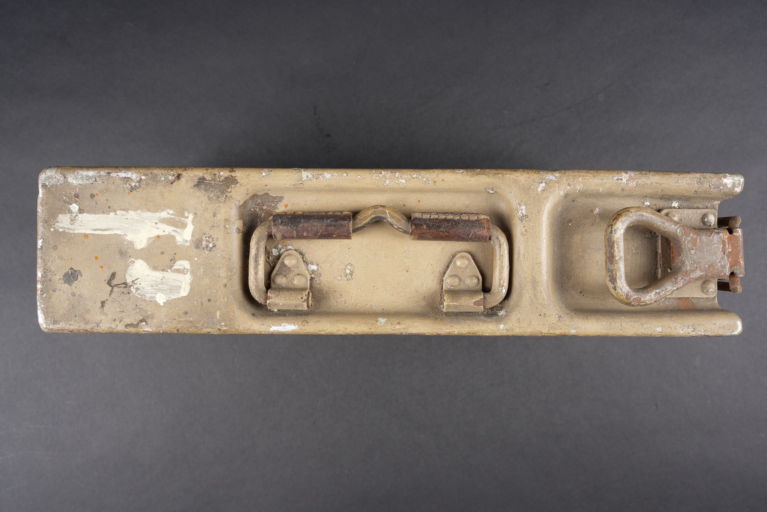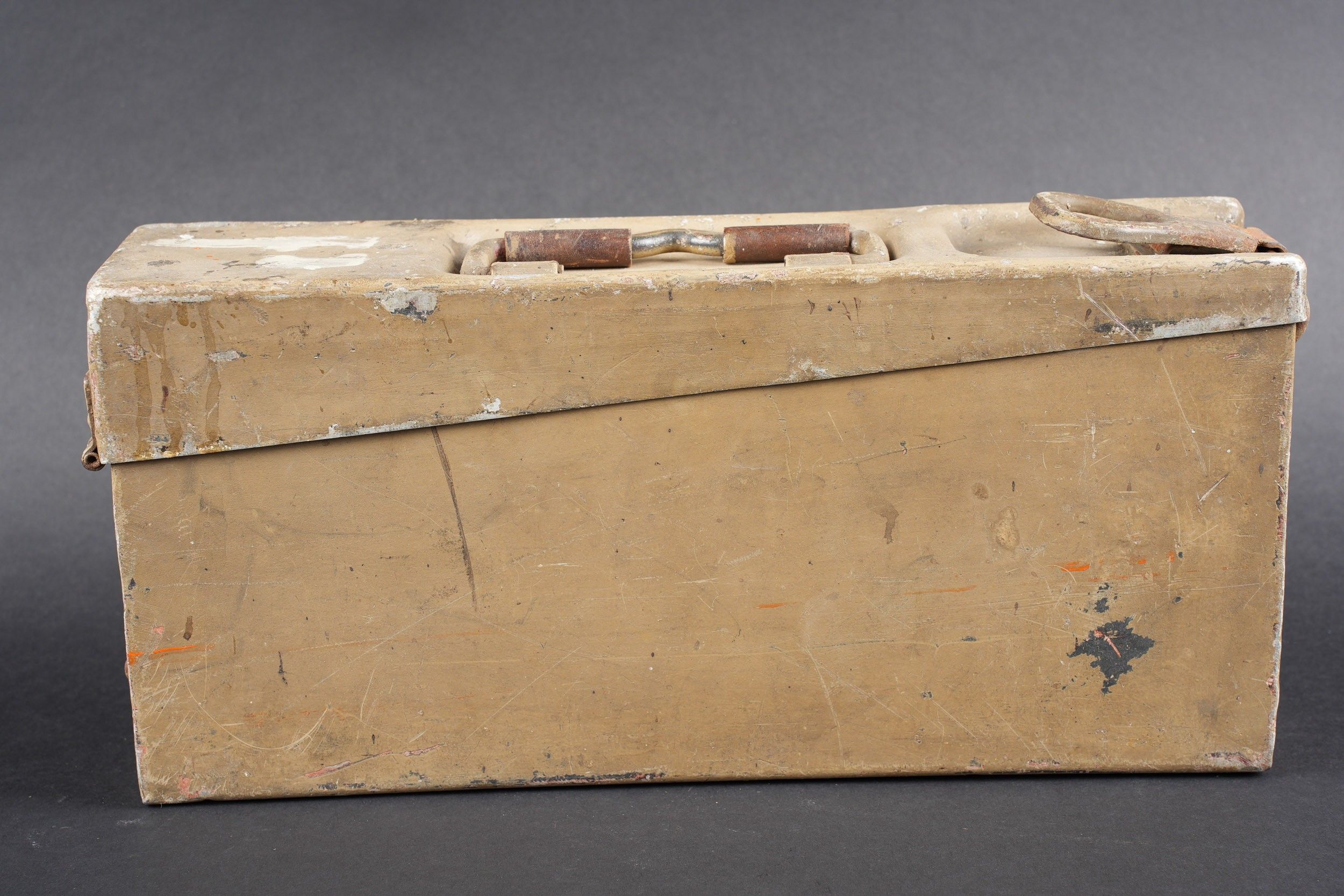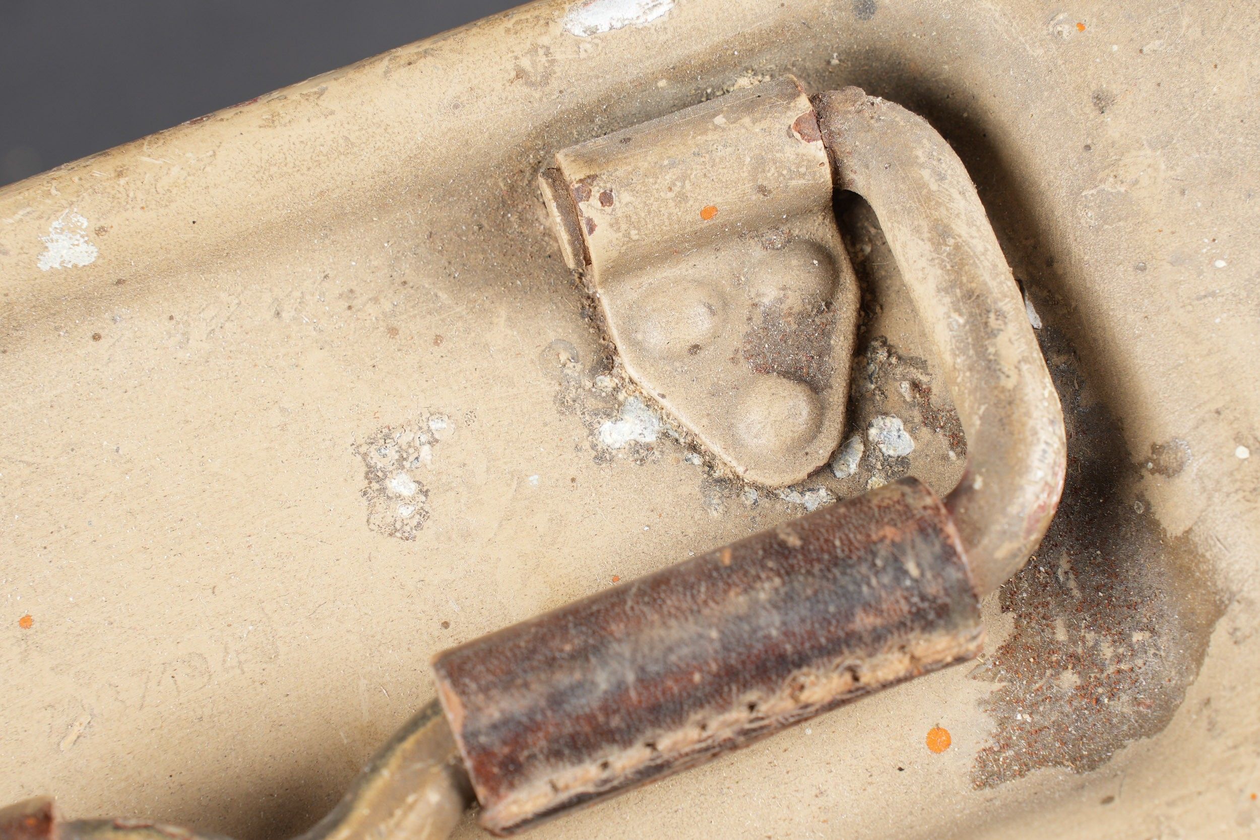 MG 3442 Petroleum case. Made of aluminium. 90% sand yellow paintwork. The locking hook is complete. The leather reinforcements on the handles are present. Letter P painted in white paint on the lid. Dated 1940. Some wear and patina. Condition II+. MG 3442 petroleum canister. Aluminum with 90% tan-yellow paint. Complete latch and leather handle reinforcements. White-painted letter P on the lid. Dated 1940. Some wear and patina. Condition II+