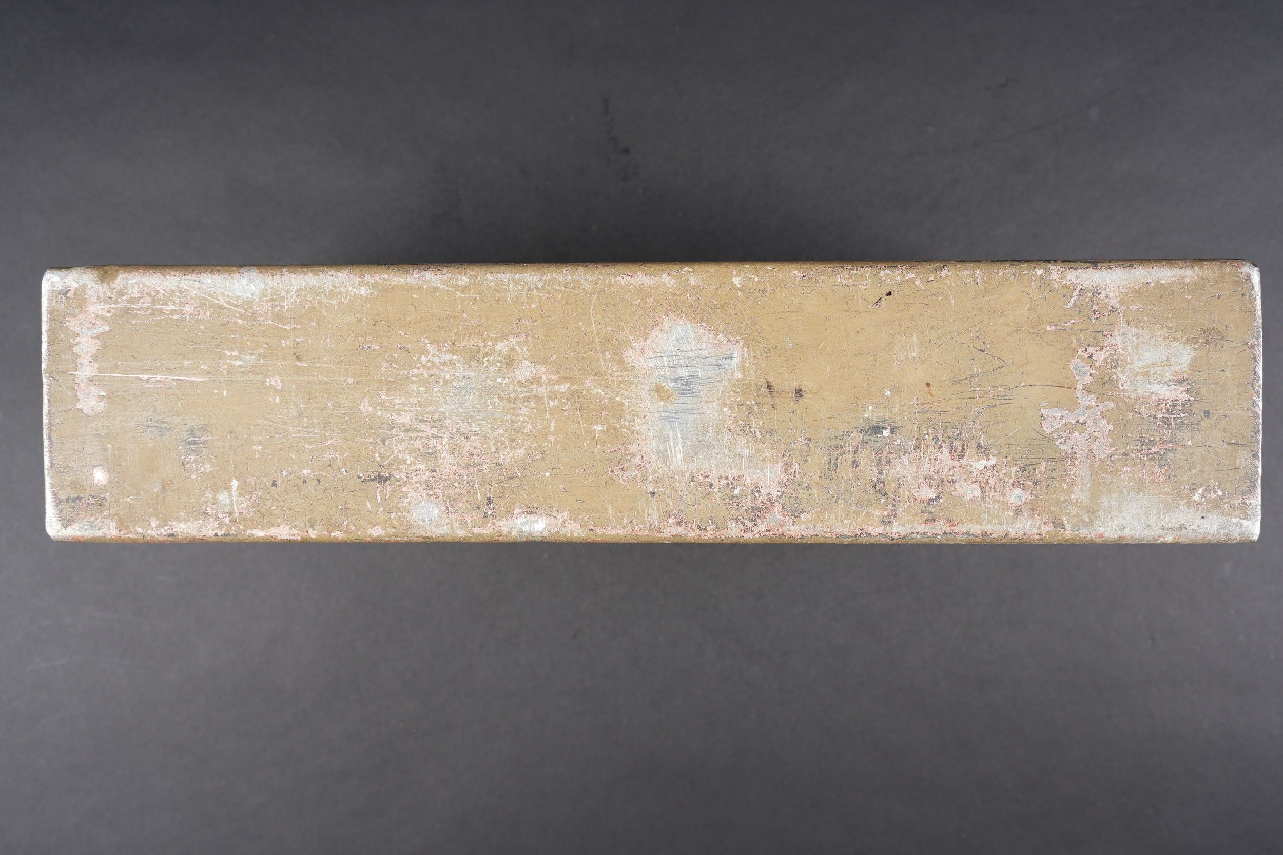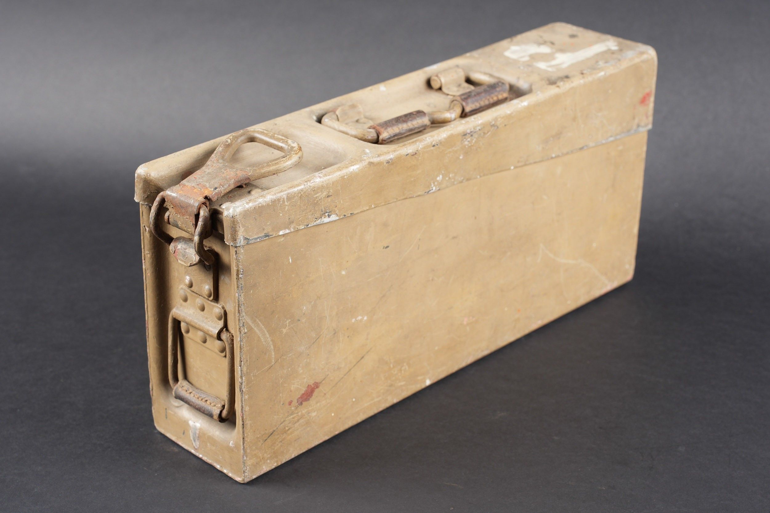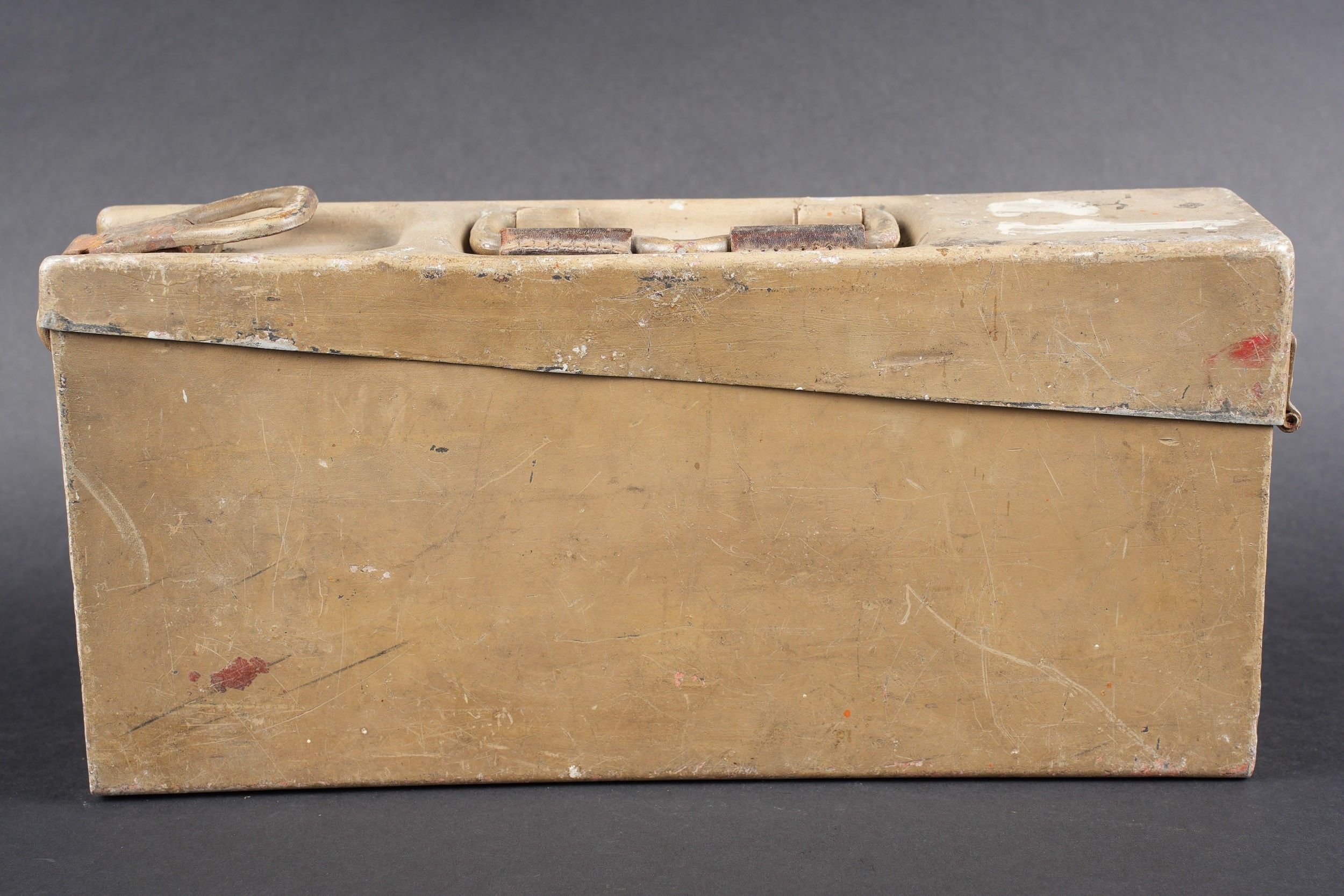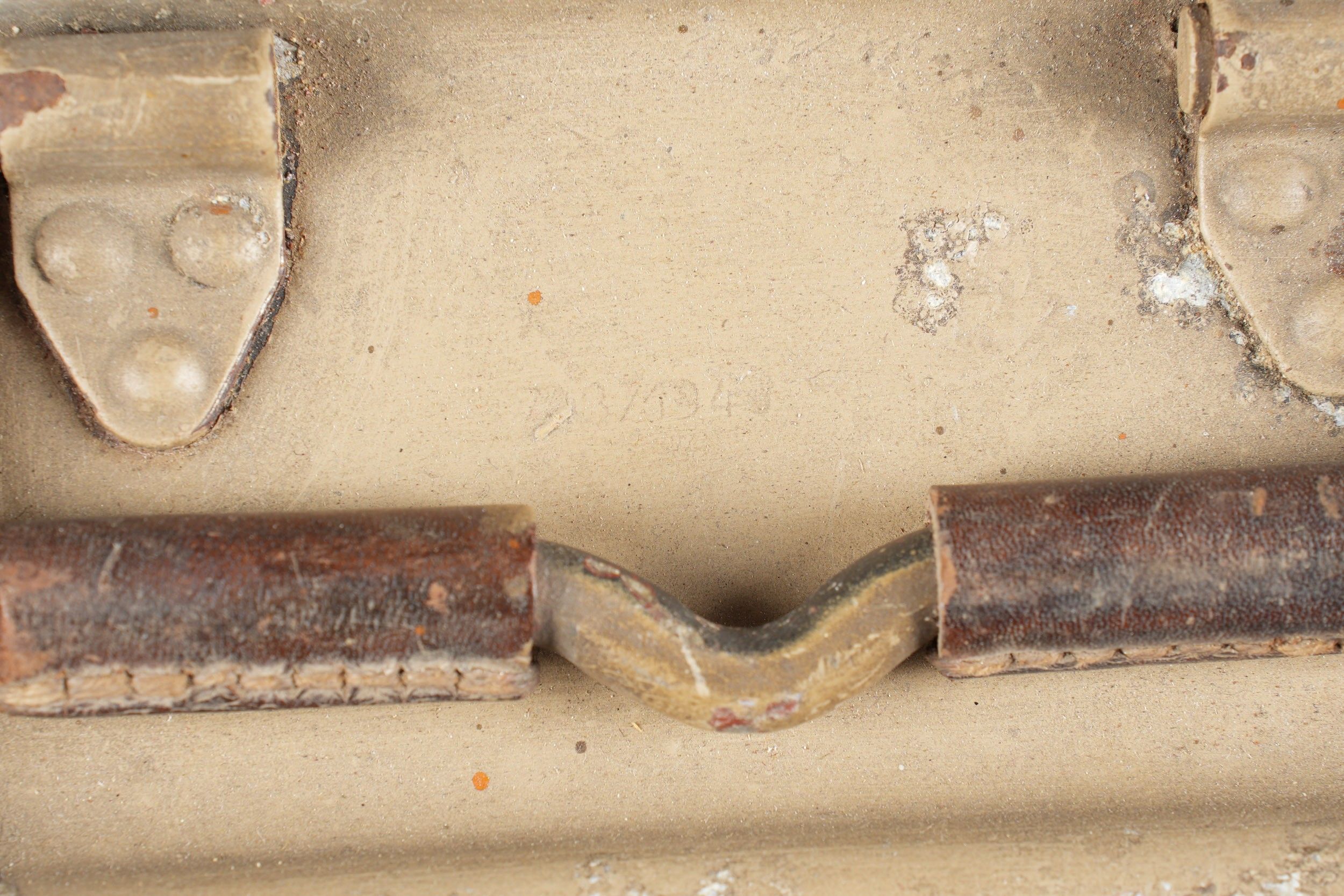MG 3442 Petroleum case. Made of aluminium. 90% sand yellow paintwork. The locking hook is complete. The leather reinforcements on the handles are present. Letter P painted in white paint on the lid. Dated 1940. Some wear and patina. Condition II+. MG 3442 petroleum canister. Aluminum with 90% tan-yellow paint. Complete latch and leather handle reinforcements. White-painted letter P on the lid. Dated 1940. Some wear and patina. Condition II+