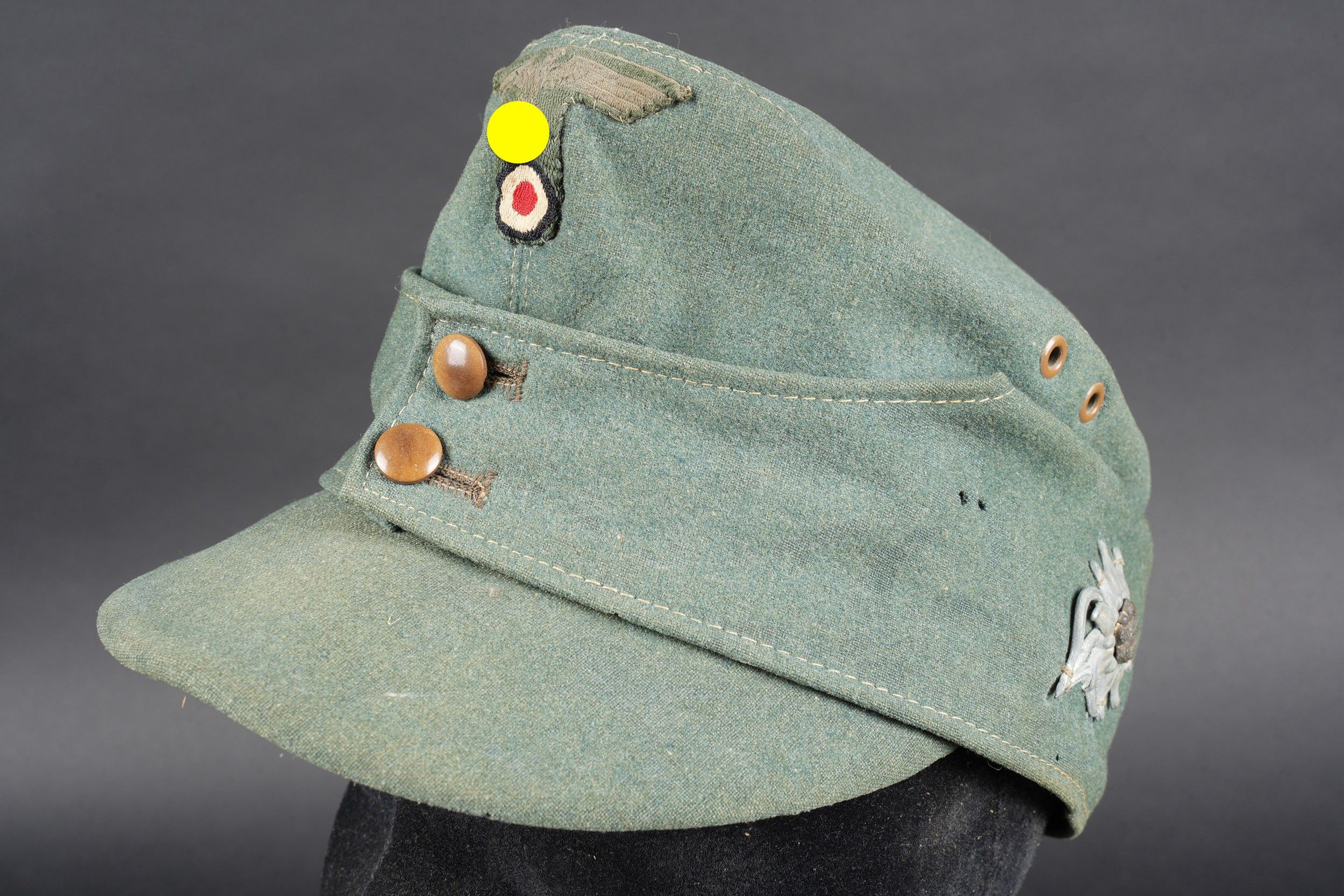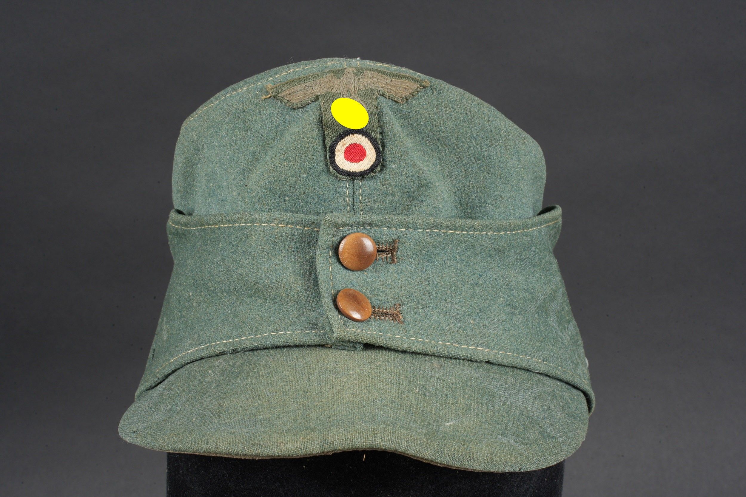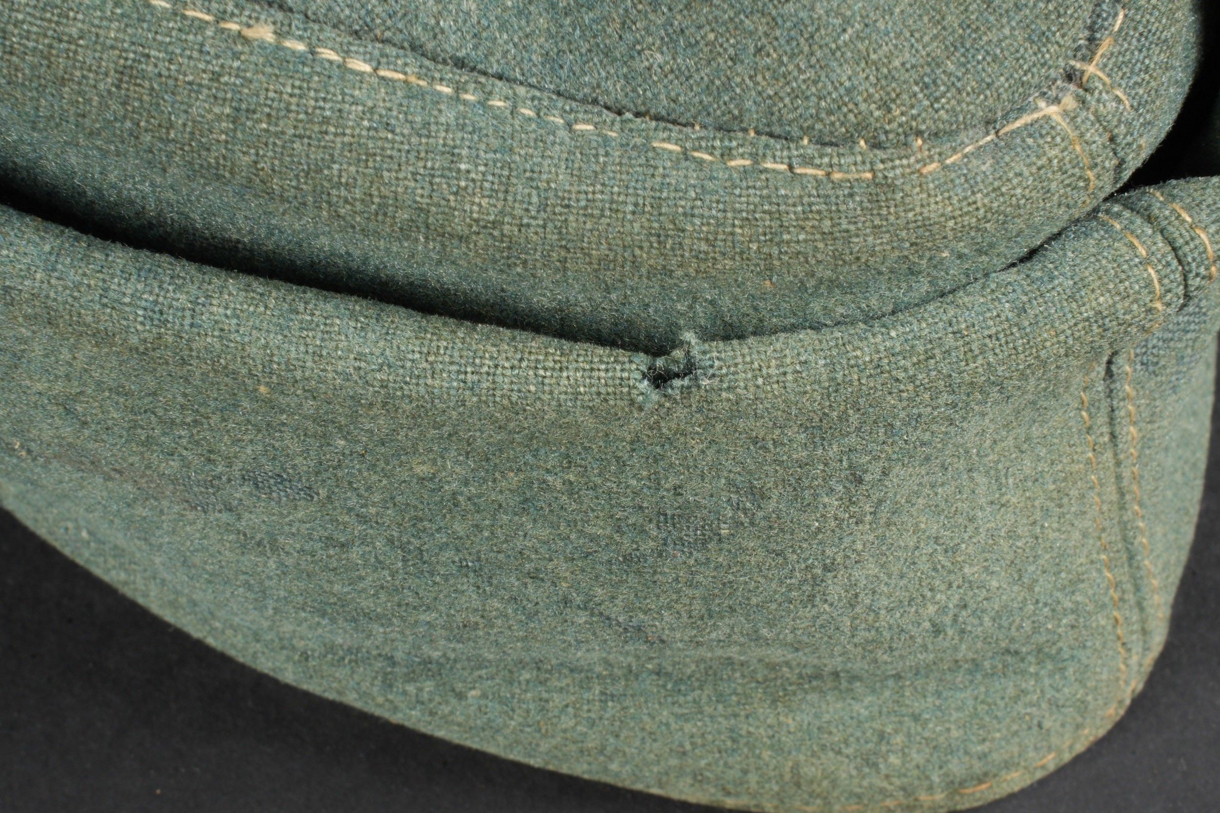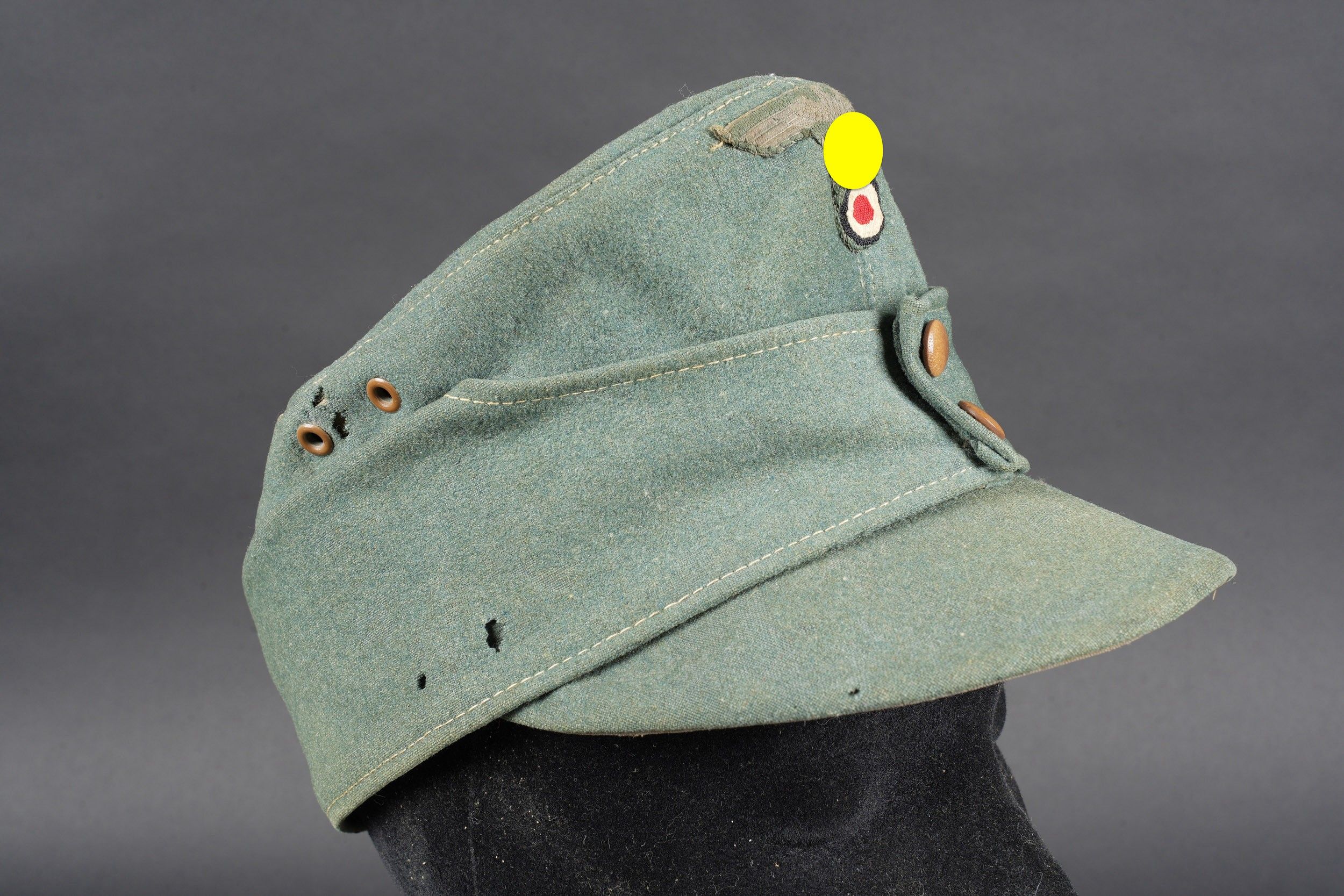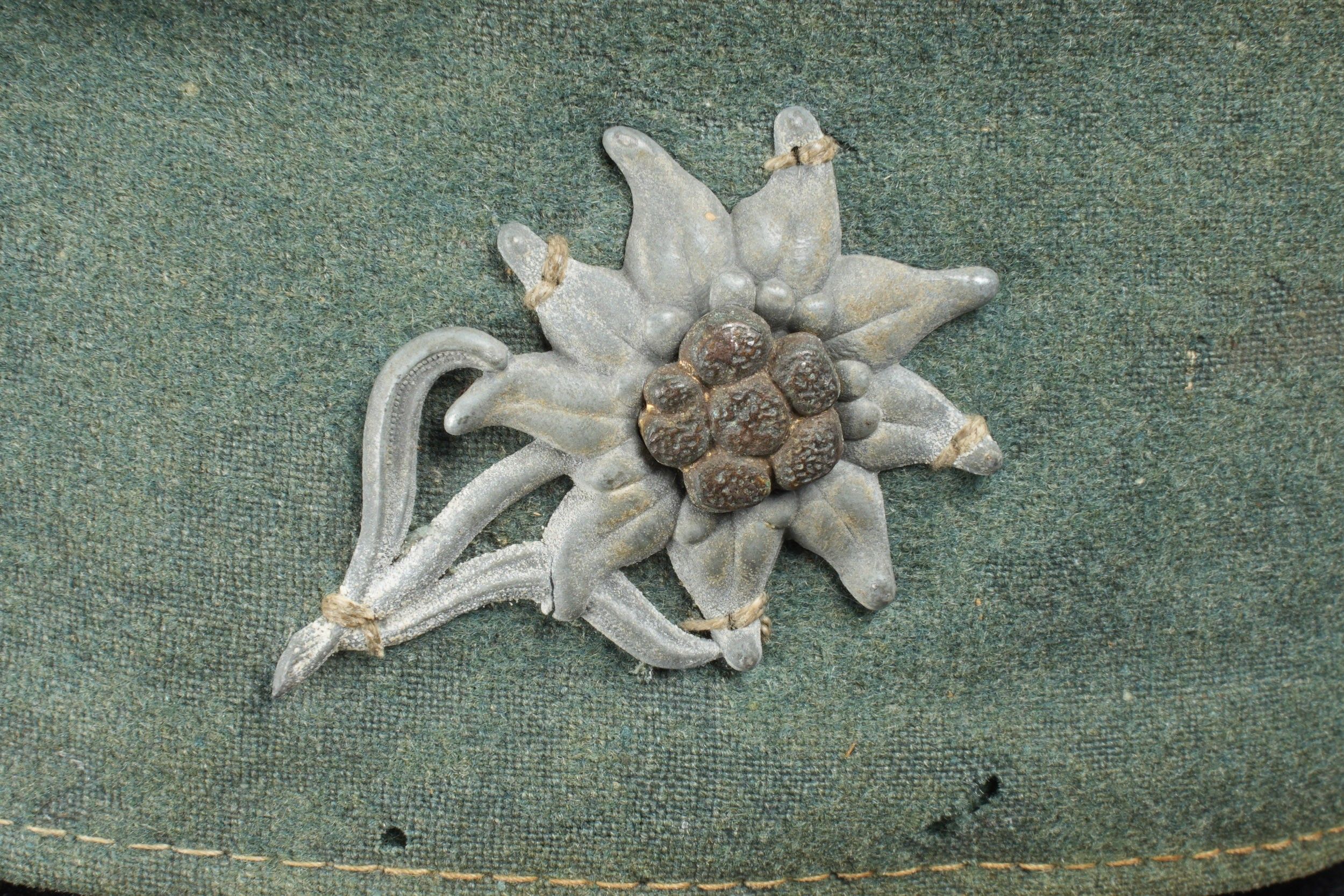 Bergmütze Gebirgsjäger. In thick Feldgrau cloth, heavily worn. Short visor in very good condition. Two smooth brown buttons closing the flap. Hand-sewn Bevo T-shaped eagle and roundel. Hand-stitched metallic Edelweiss on side of headgear. Grey cotton lining. Markings illegible. Brown leather sweatband. Two ventilation eyelets on each side of the headgear. Some wear and patina, as well as numerous moth holes. Condition II+. Gebirgsjäger mountain cap. Made of thick Feldgrau wool, heavily worn. Short visor in very good condition. Two smooth brown buttons closing the flap. Hand-sewn Bevo eagle and cockade in T configuration. Hand-sewn metal Edelweiss on the side. Interior lined in gray cotton. Markings illegible. Brown leather sweatband. Two ventilation eyelets on each side. Some wear and patina with many moth holes. Condition II+