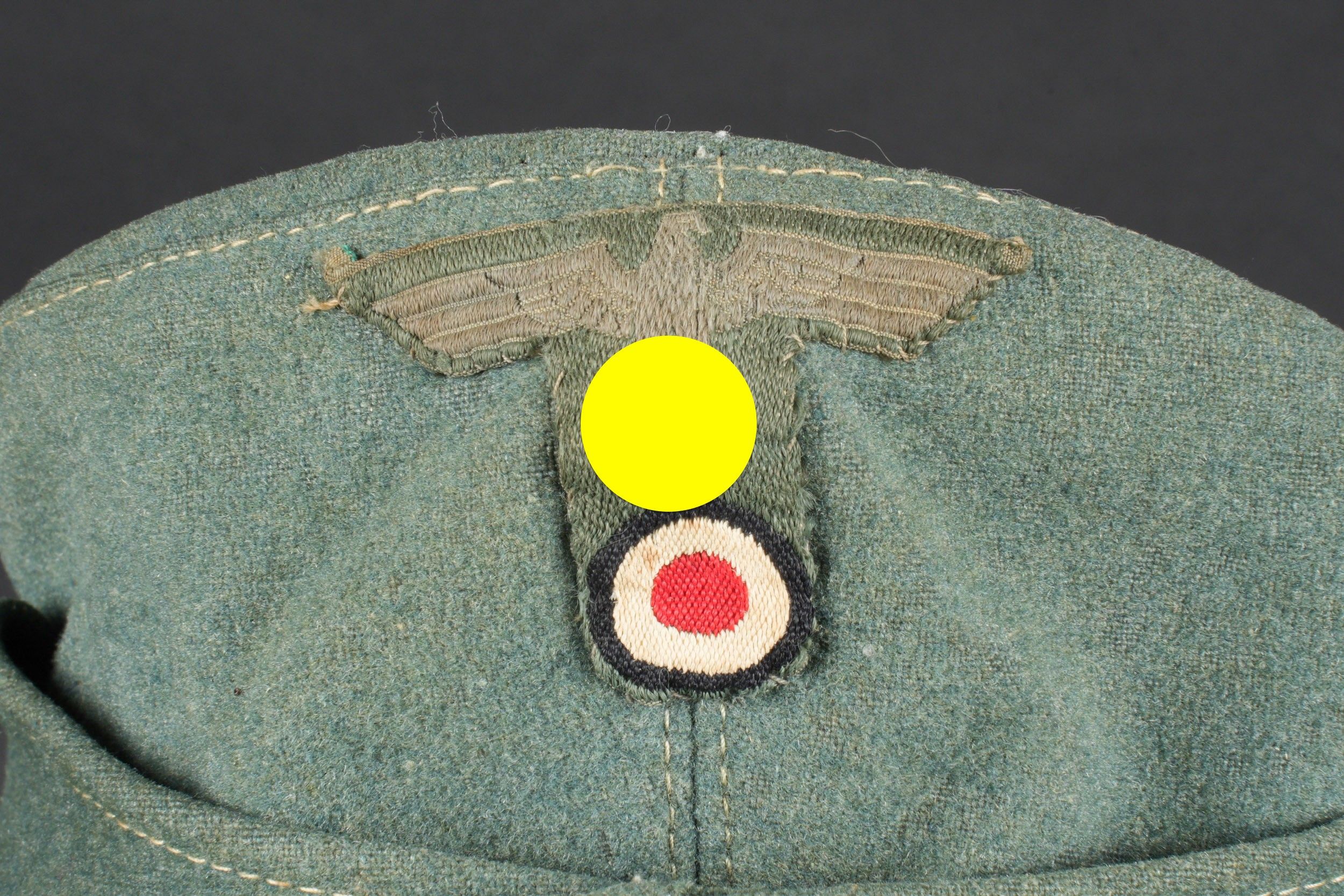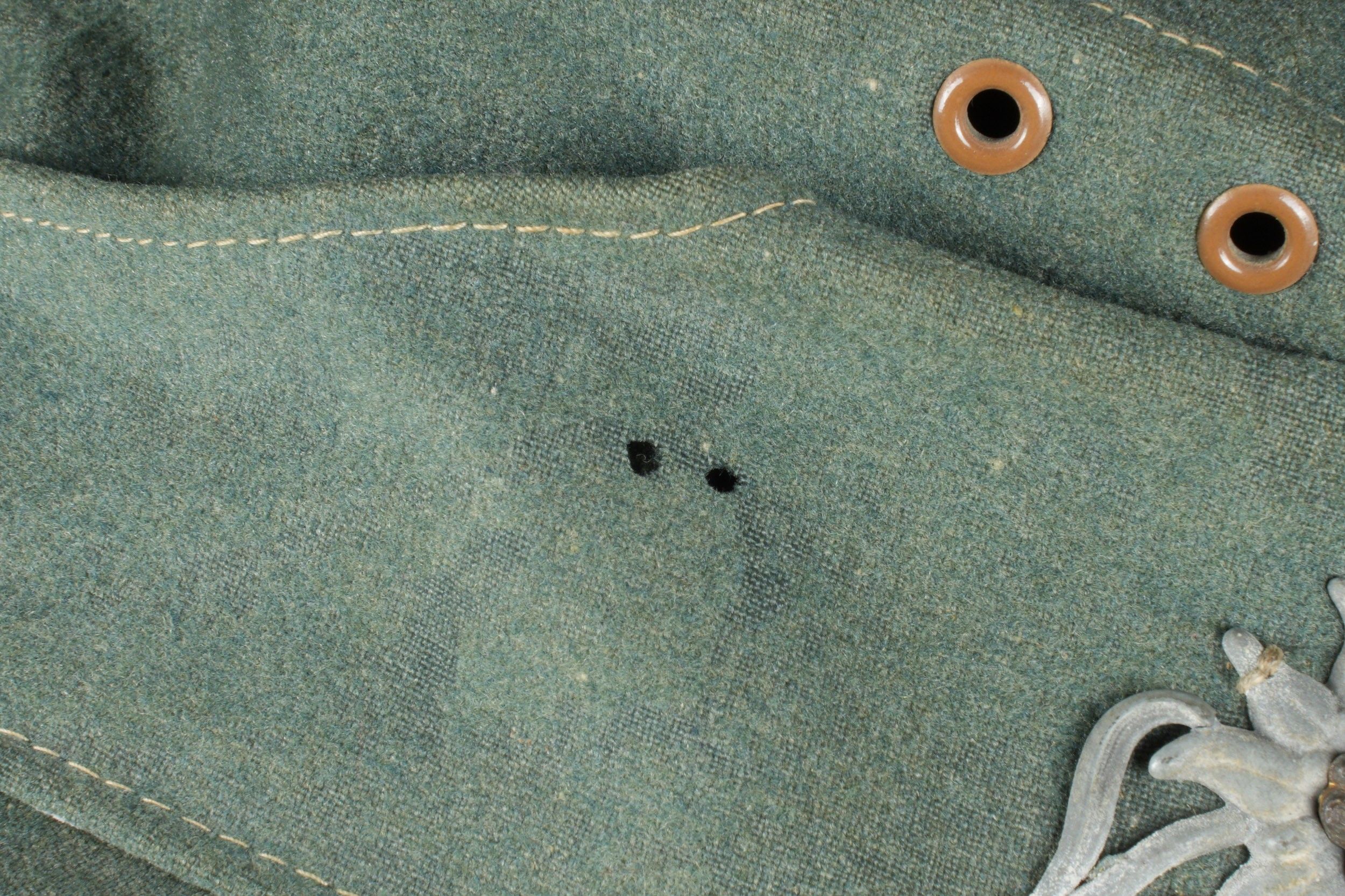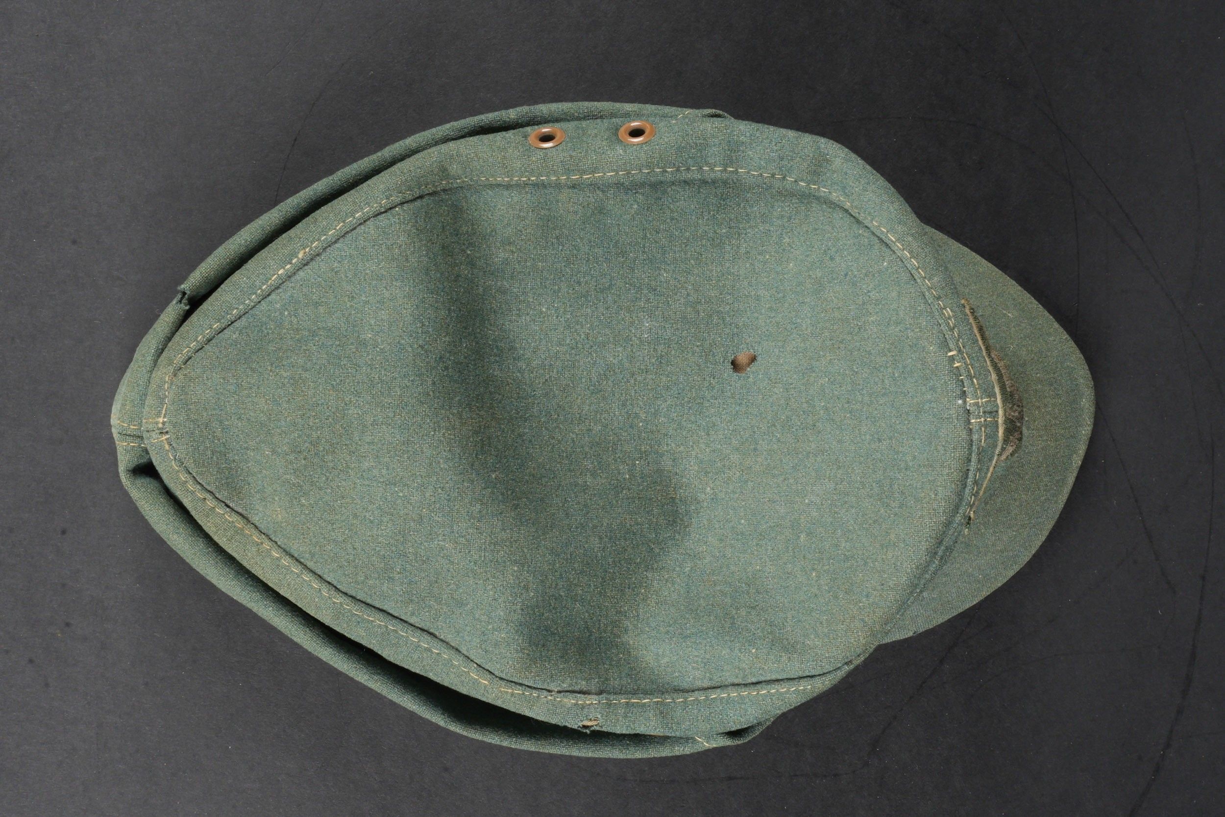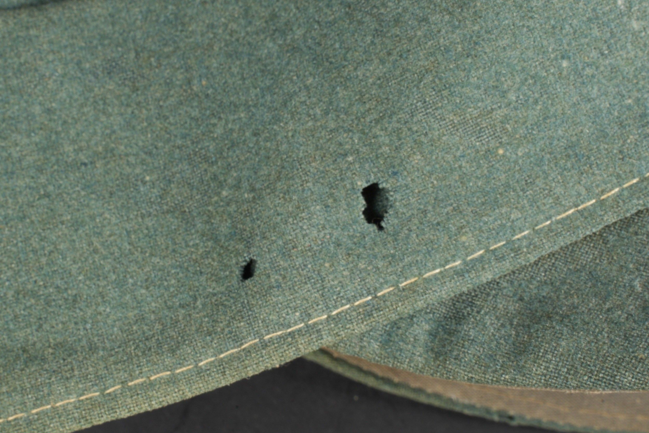 Bergmütze Gebirgsjäger. In thick Feldgrau cloth, heavily worn. Short visor in very good condition. Two smooth brown buttons closing the flap. Hand-sewn Bevo T-shaped eagle and roundel. Hand-stitched metallic Edelweiss on side of headgear. Grey cotton lining. Markings illegible. Brown leather sweatband. Two ventilation eyelets on each side of the headgear. Some wear and patina, as well as numerous moth holes. Condition II+. Gebirgsjäger mountain cap. Made of thick Feldgrau wool, heavily worn. Short visor in very good condition. Two smooth brown buttons closing the flap. Hand-sewn Bevo eagle and cockade in T configuration. Hand-sewn metal Edelweiss on the side. Interior lined in gray cotton. Markings illegible. Brown leather sweatband. Two ventilation eyelets on each side. Some wear and patina with many moth holes. Condition II+
