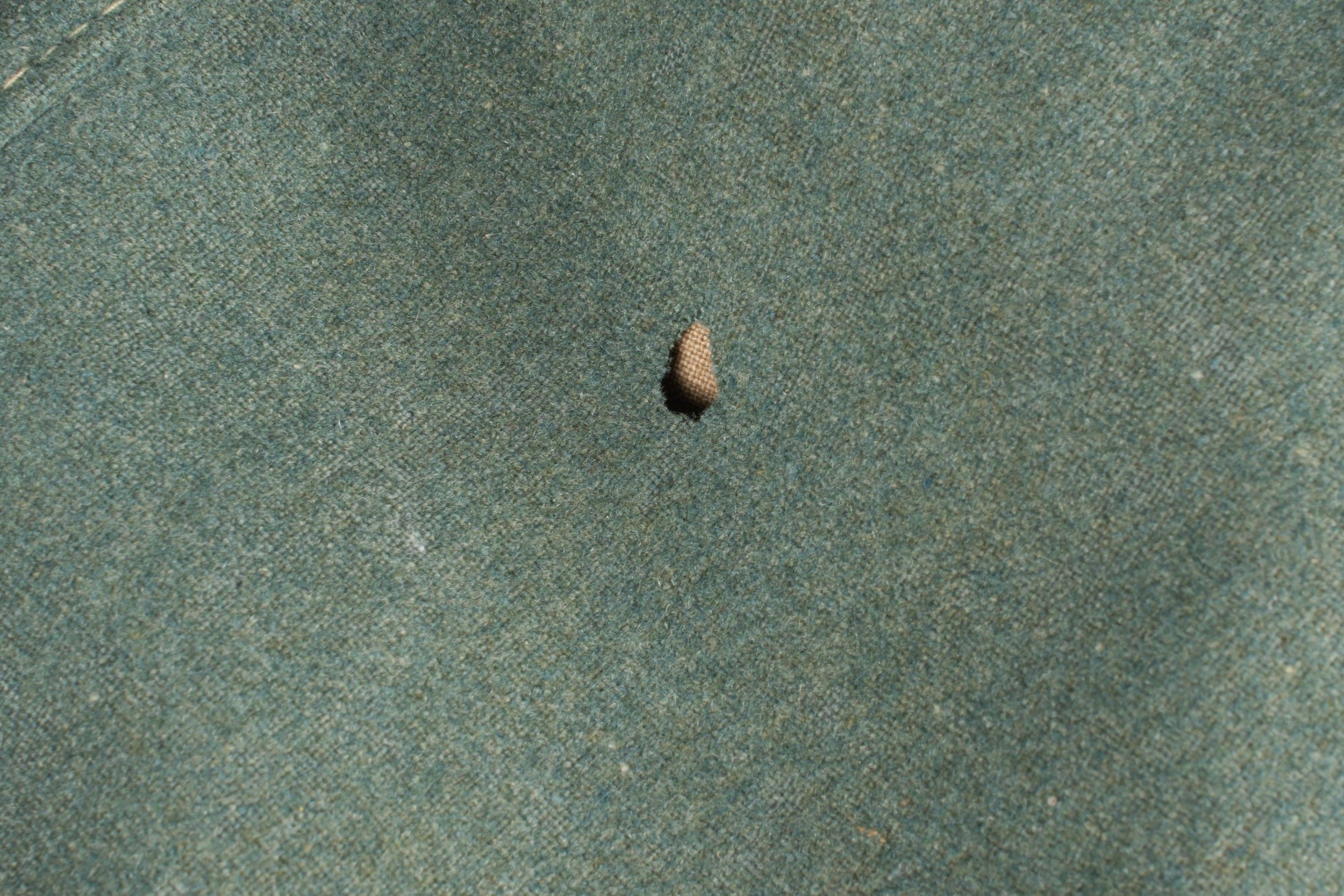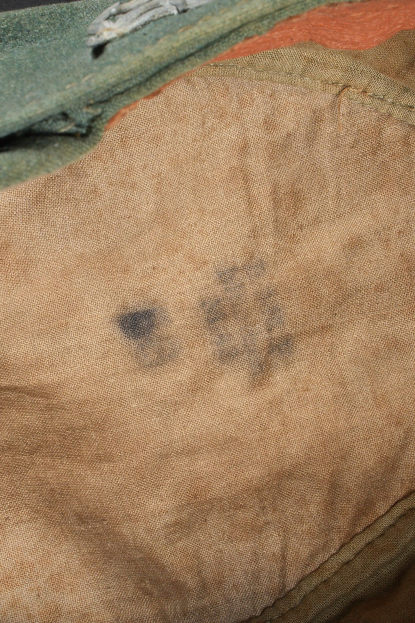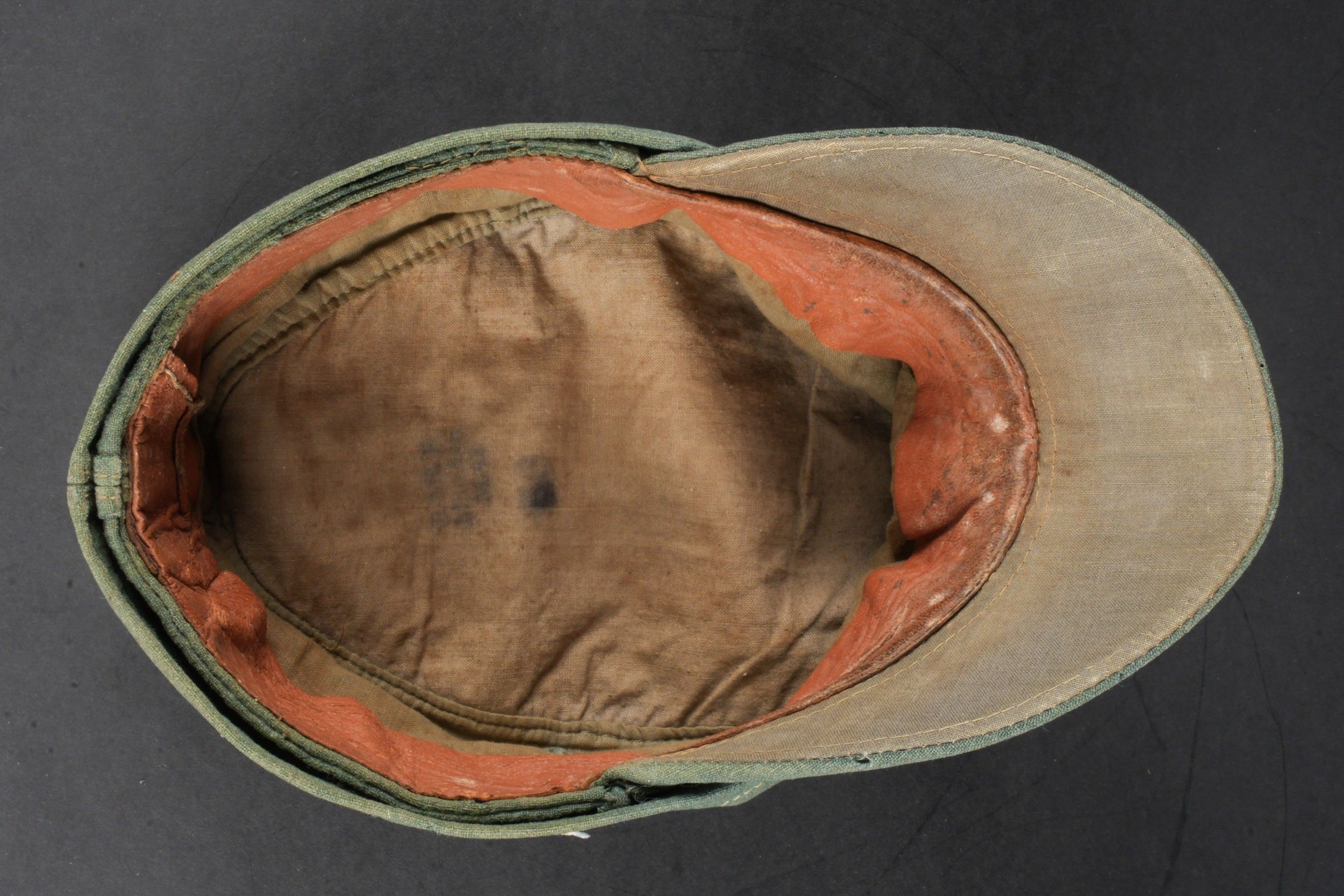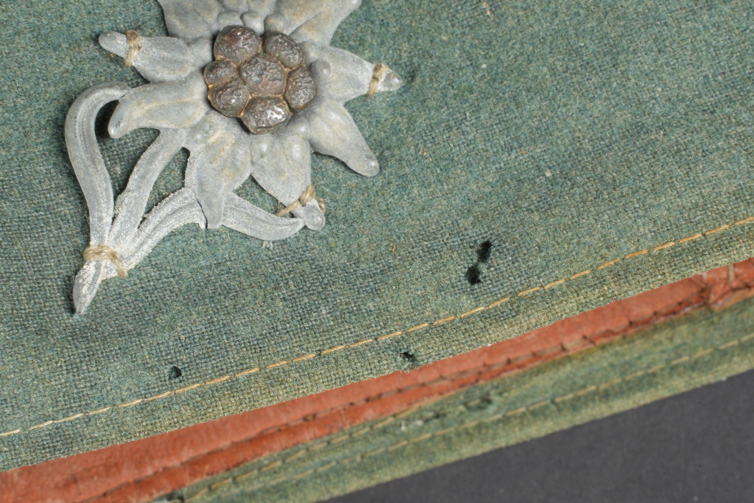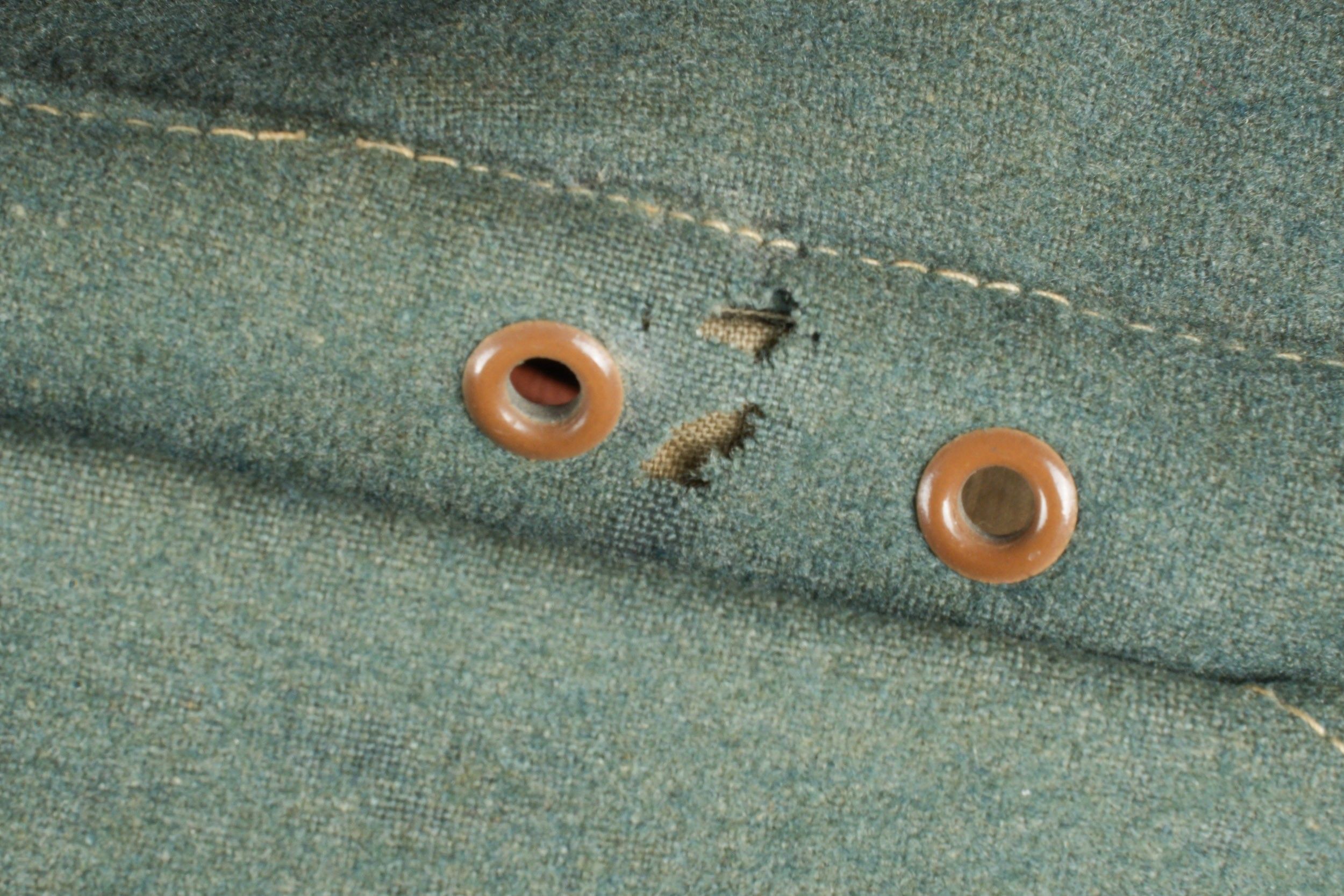 Bergmütze Gebirgsjäger. In thick Feldgrau cloth, heavily worn. Short visor in very good condition. Two smooth brown buttons closing the flap. Hand-sewn Bevo T-shaped eagle and roundel. Hand-stitched metallic Edelweiss on side of headgear. Grey cotton lining. Markings illegible. Brown leather sweatband. Two ventilation eyelets on each side of the headgear. Some wear and patina, as well as numerous moth holes. Condition II+. Gebirgsjäger mountain cap. Made of thick Feldgrau wool, heavily worn. Short visor in very good condition. Two smooth brown buttons closing the flap. Hand-sewn Bevo eagle and cockade in T configuration. Hand-sewn metal Edelweiss on the side. Interior lined in gray cotton. Markings illegible. Brown leather sweatband. Two ventilation eyelets on each side. Some wear and patina with many moth holes. Condition II+