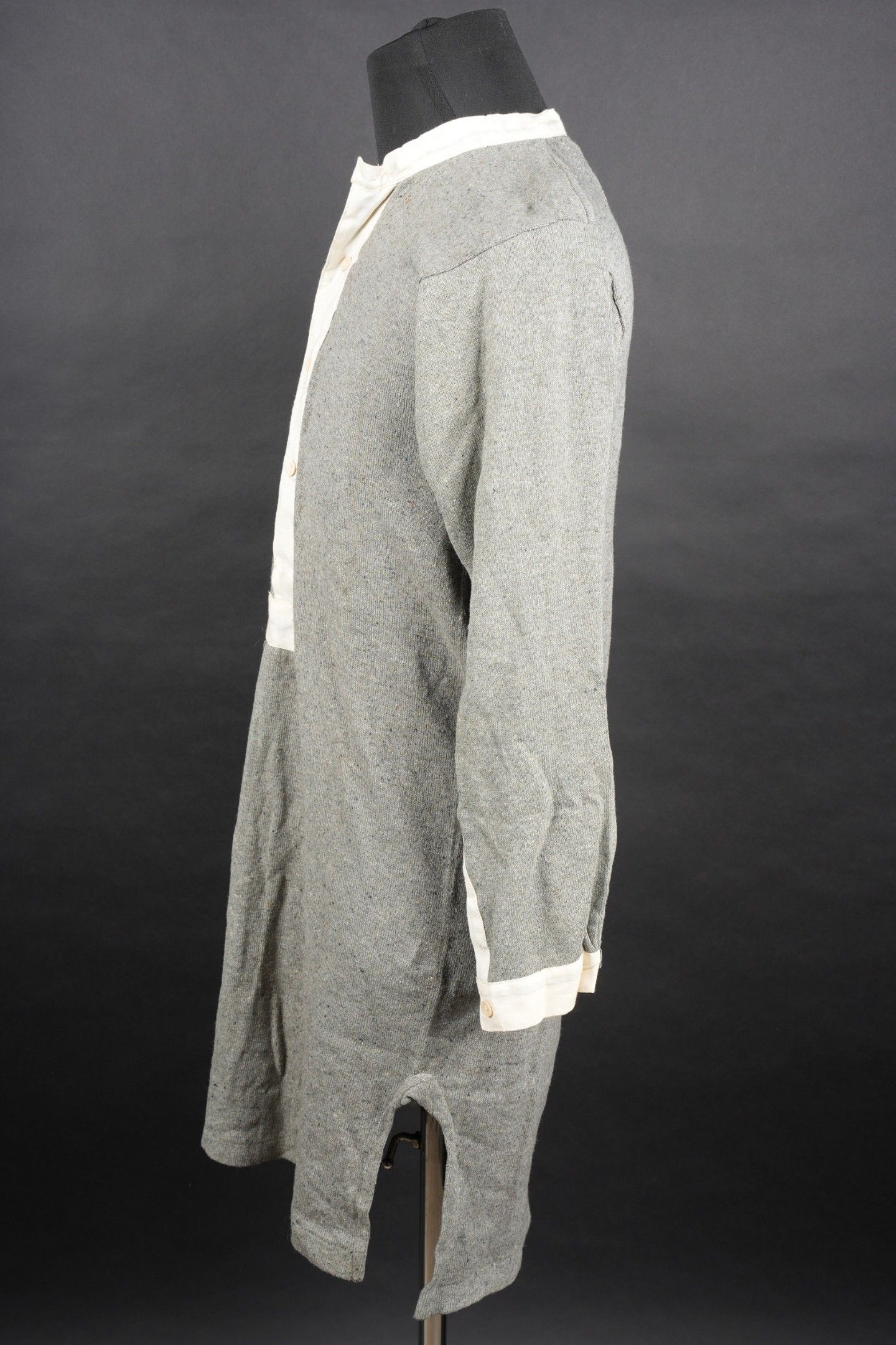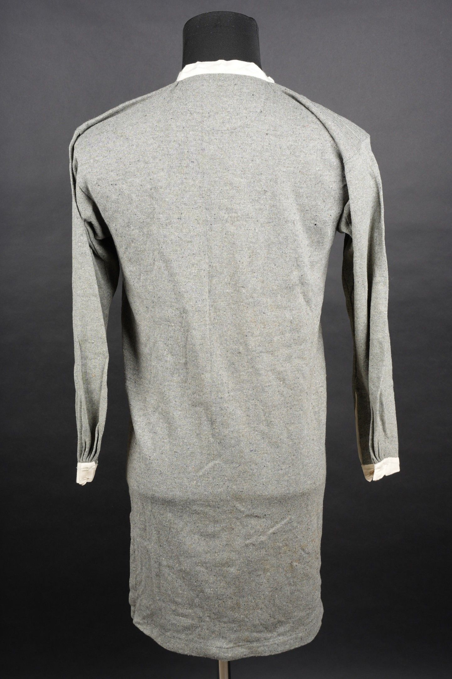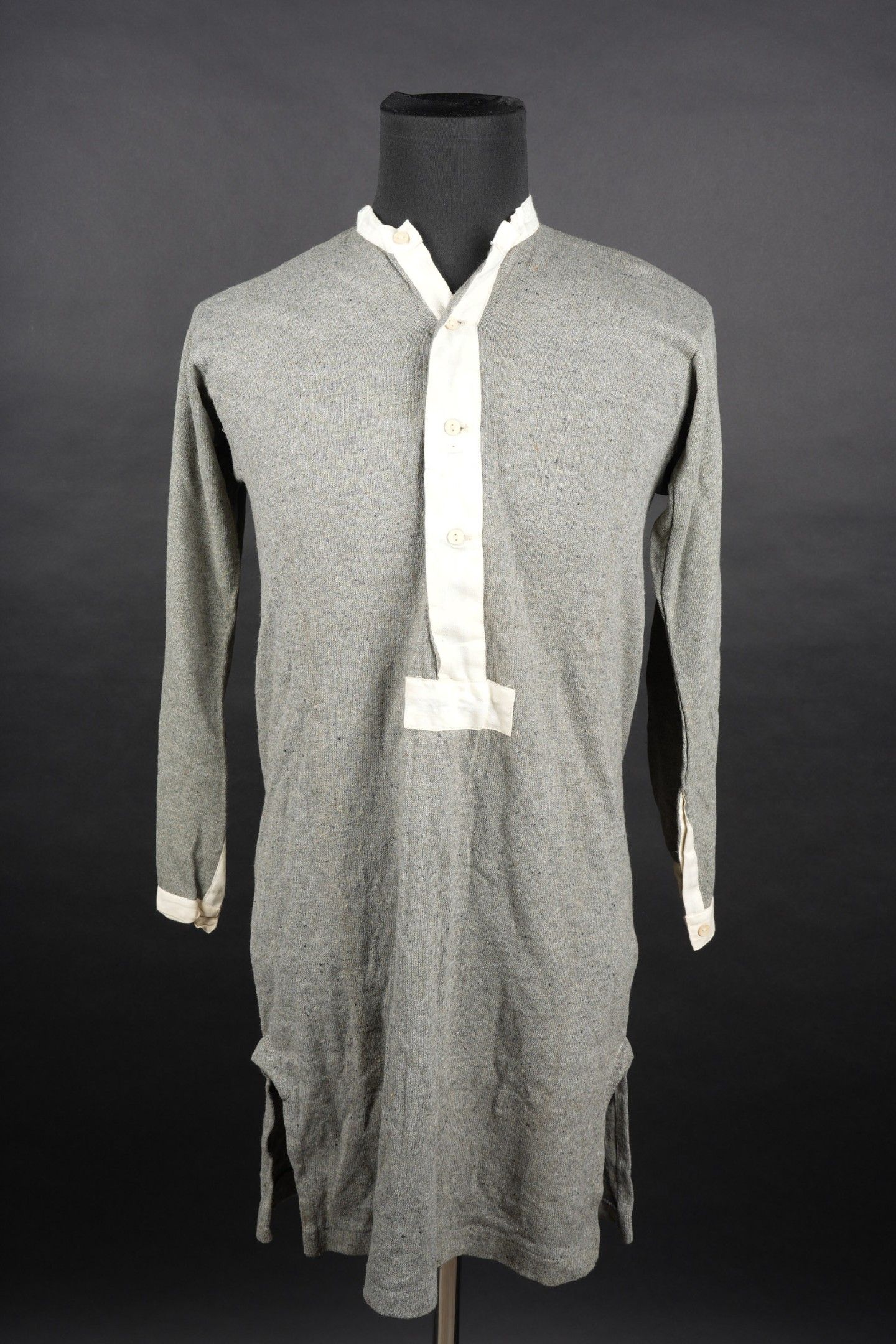 German shirt. Grey and white fabric. All buttons are present. Markings in the collar II 40, the RBNr code is partially illegible. Some wear and patina, as well as moth marks and stains. Condition II+. German shirt. Gray and white fabric. All buttons present. Markings inside the collar II 40, partially illegible RBNr code. Some wear and patina with stains and moth traces. Condition II+