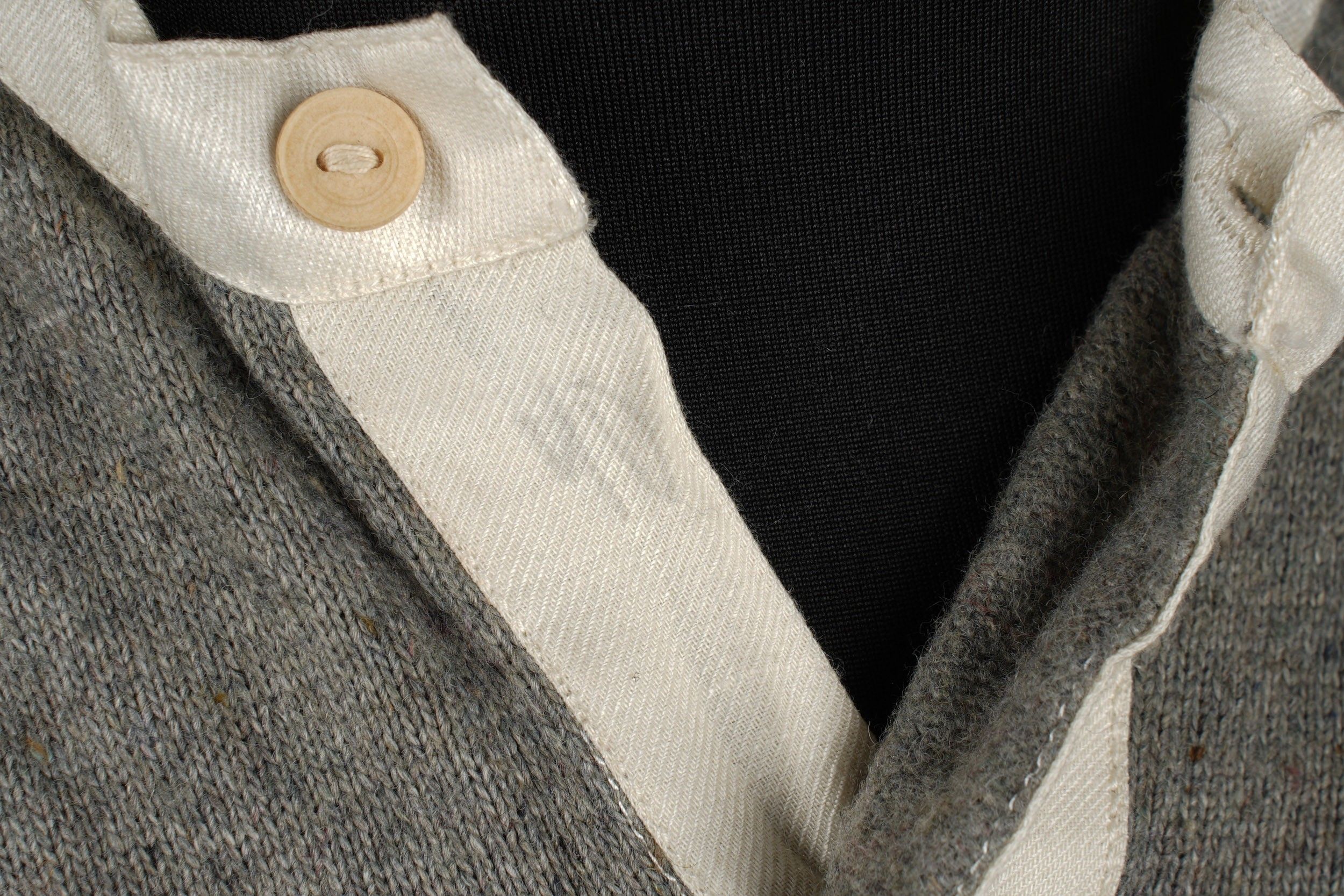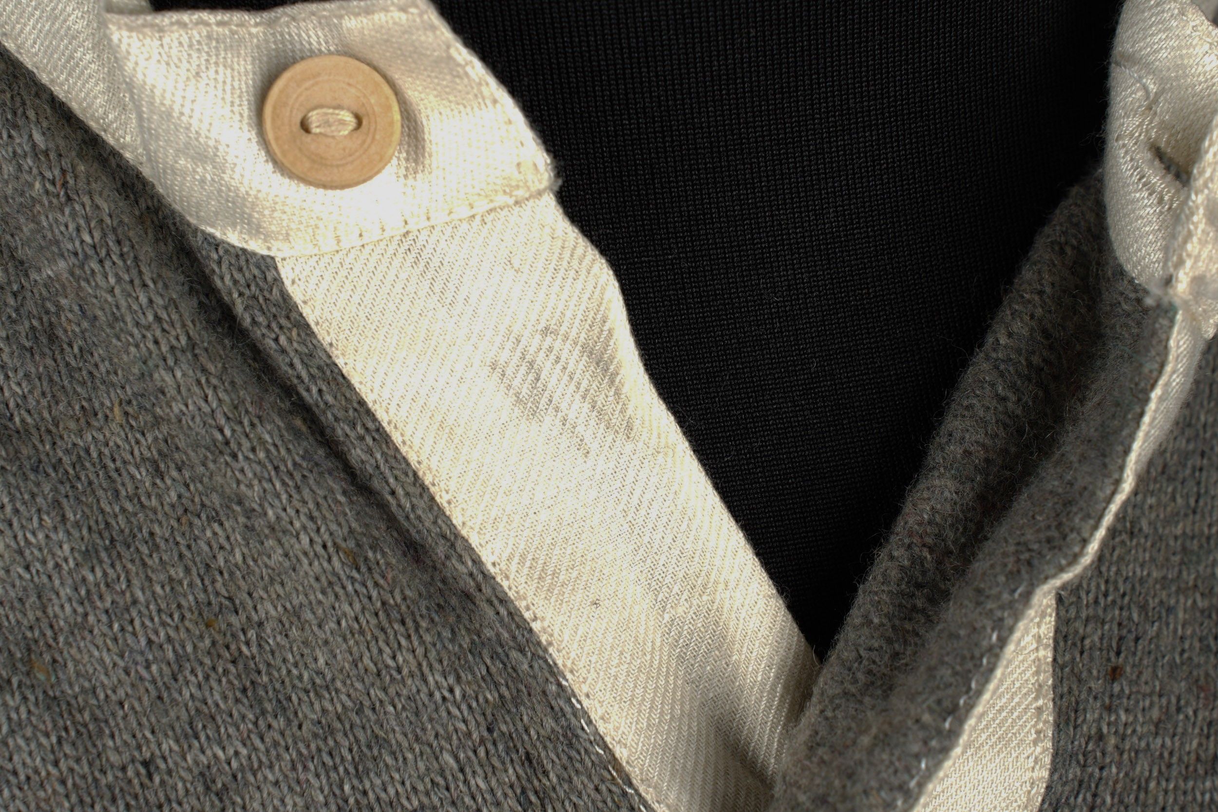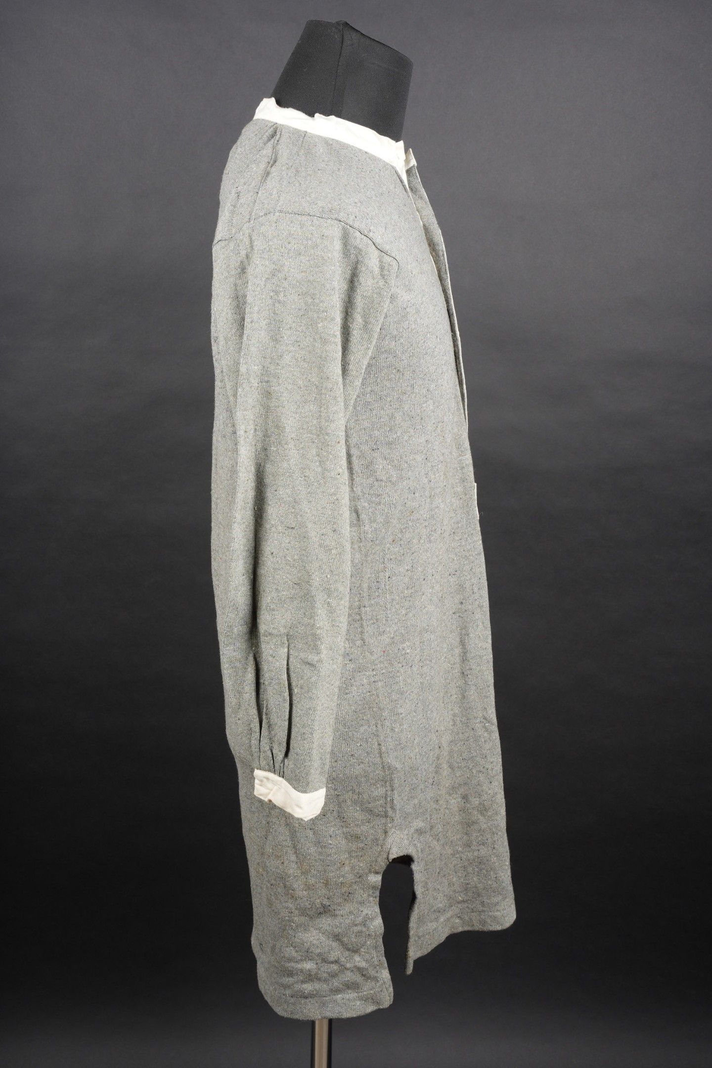 German shirt. Grey and white fabric. All buttons are present. Markings in the collar II 40, the RBNr code is partially illegible. Some wear and patina, as well as moth marks and stains. Condition II+. German shirt. Gray and white fabric. All buttons present. Markings inside the collar II 40, partially illegible RBNr code. Some wear and patina with stains and moth traces. Condition II+