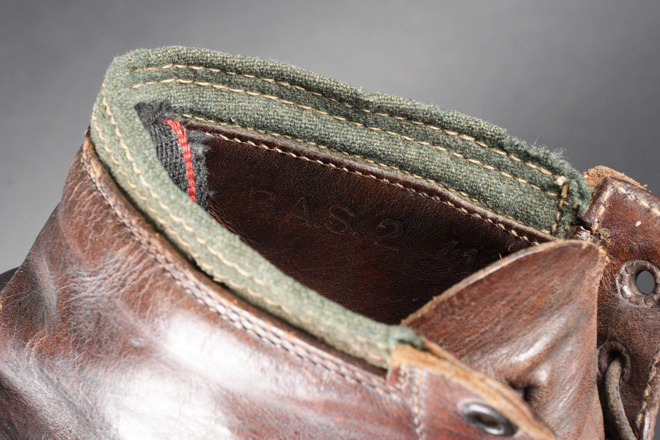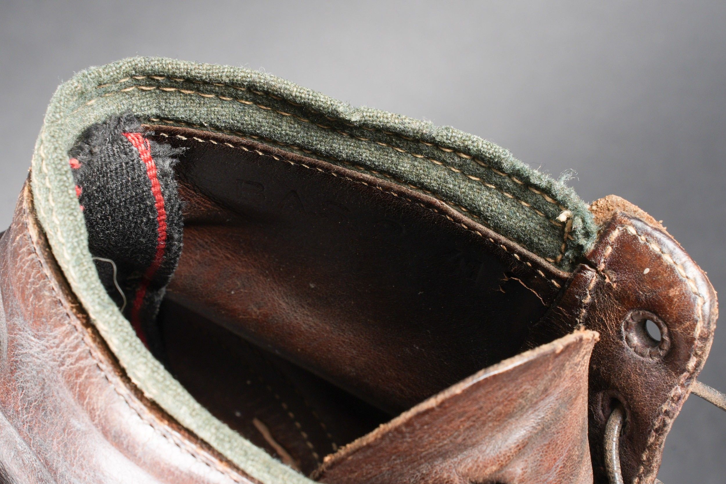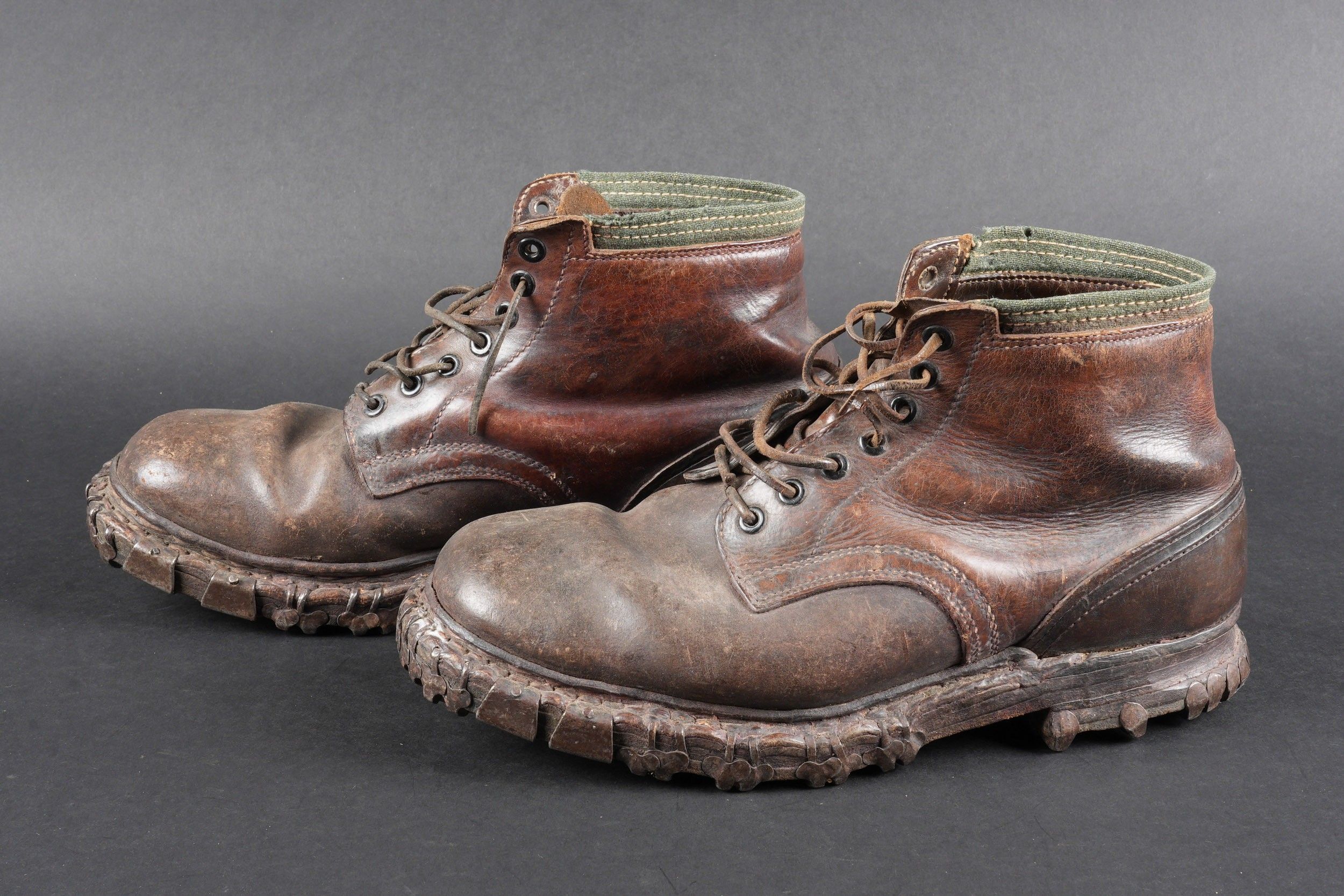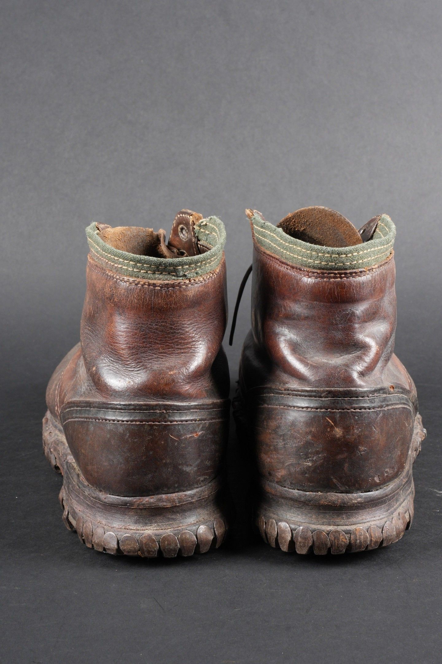 Gebirgsjäger brodequin. Homogeneous pair in leather. Upper border in Feldgrau canvas. Seven lacing eyelets. The leather cords are present. Internal markings BAS 2 41. Studded and shod soles. Some moth marks on the Feldgrau felt. Some wear and patina. Condition II+. Gebirgsjäger boots. Matching pair in leather with Feldgrau cloth top edge. Seven lace eyelets. Leather laces intact. Inside marked BAS 2 41. Hobnailed and heeled soles. Minor moth traces on the Feldgrau felt. Some wear and patina. Condition II+