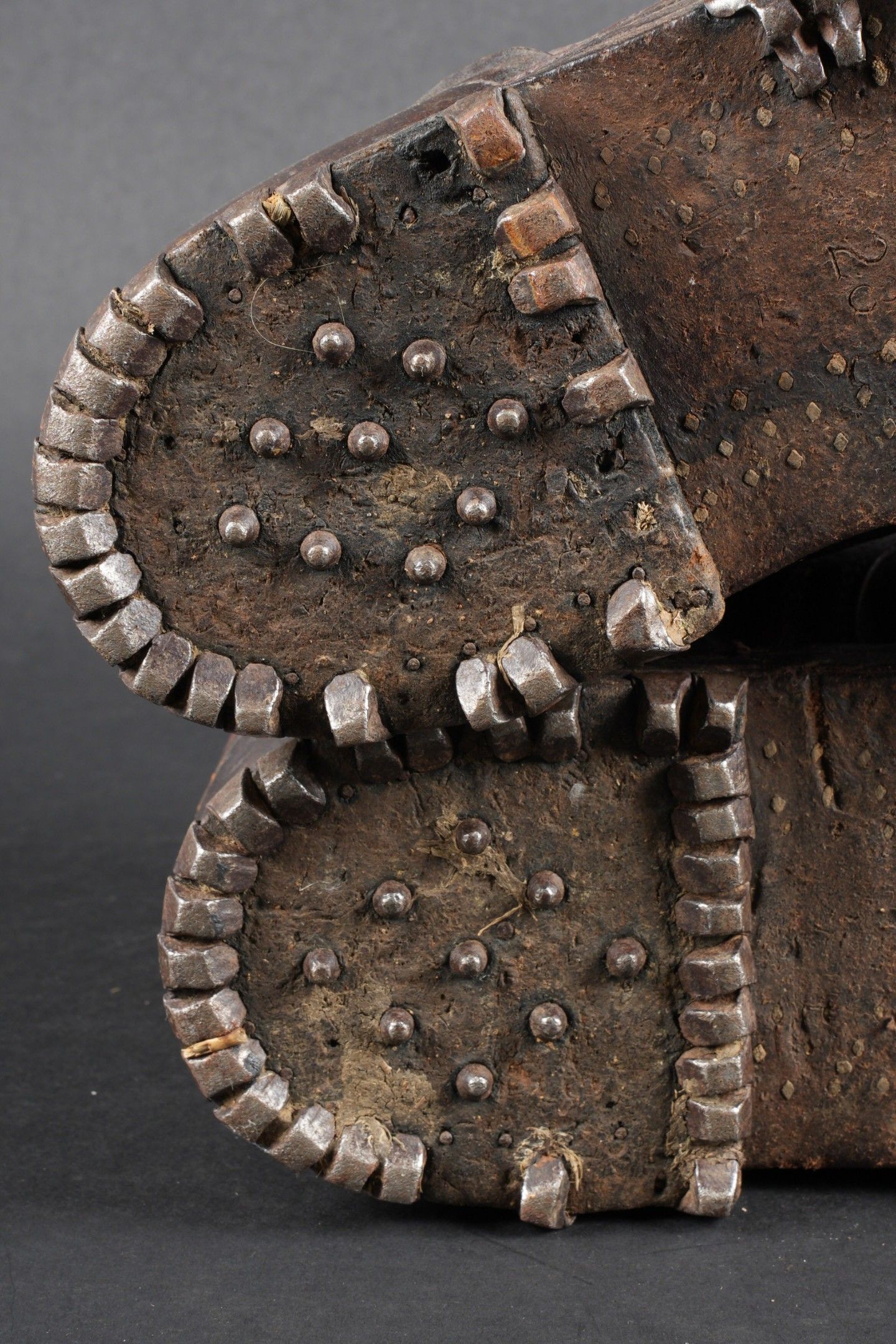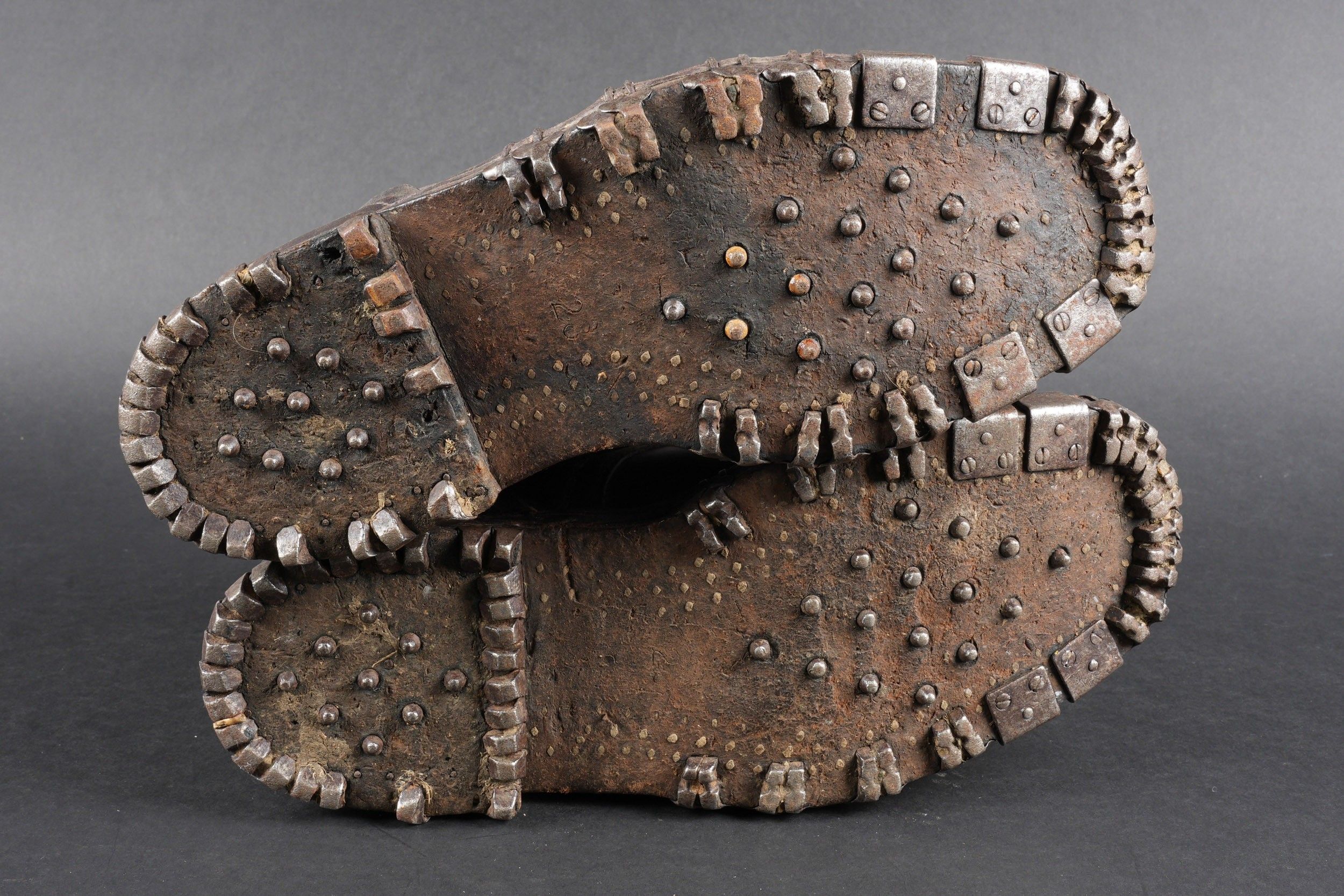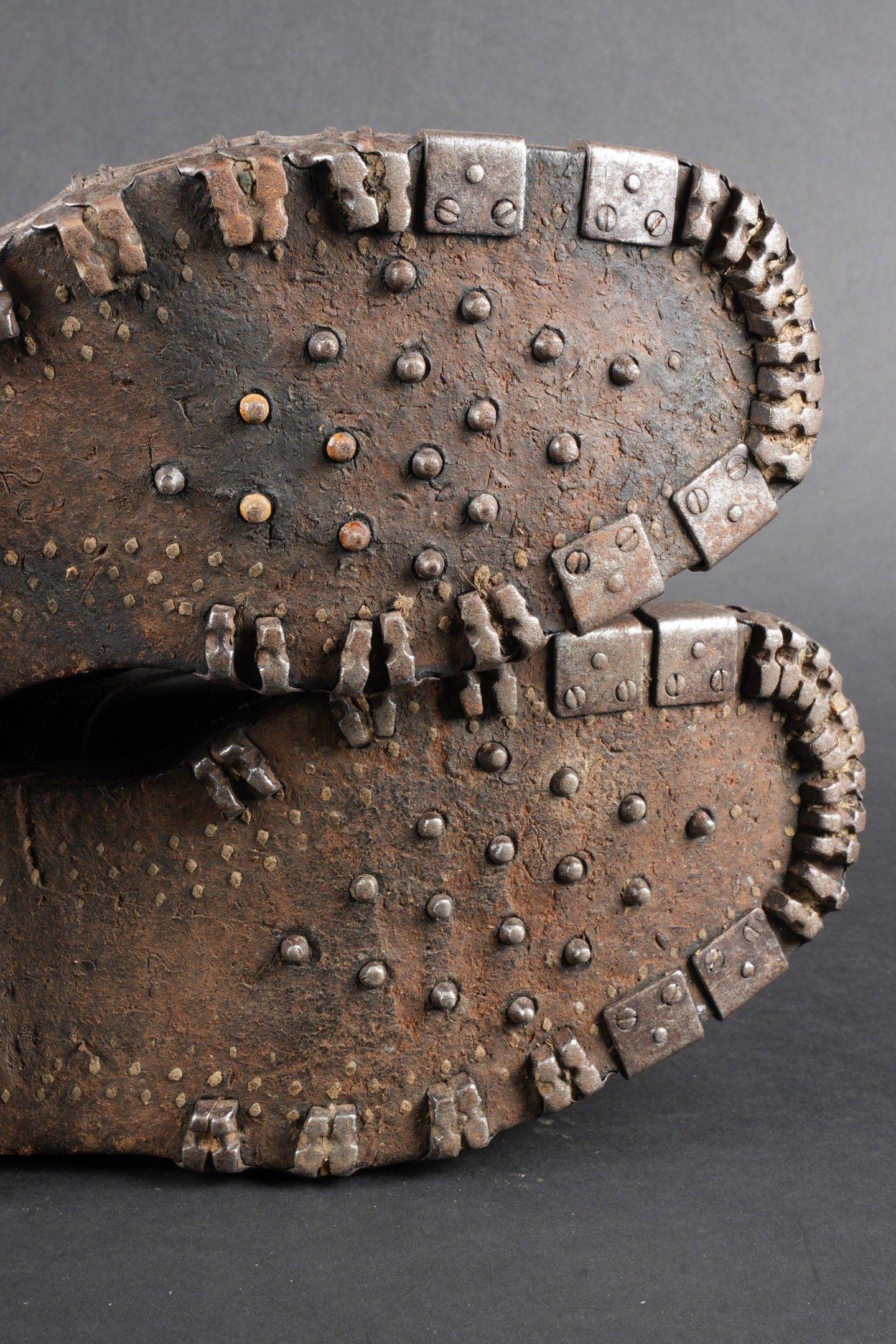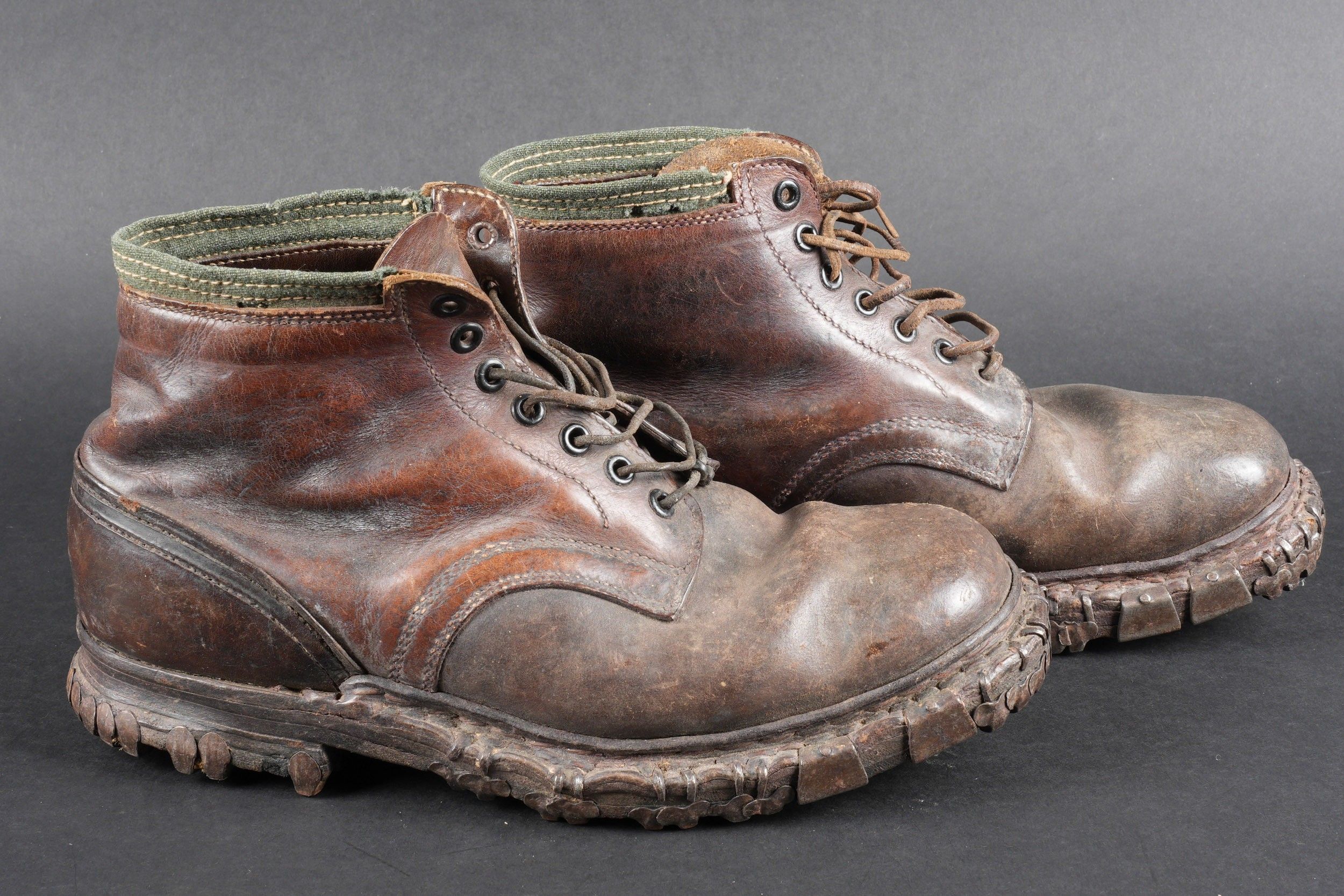 Gebirgsjäger brodequin. Homogeneous pair in leather. Upper border in Feldgrau canvas. Seven lacing eyelets. The leather cords are present. Internal markings BAS 2 41. Studded and shod soles. Some moth marks on the Feldgrau felt. Some wear and patina. Condition II+. Gebirgsjäger boots. Matching pair in leather with Feldgrau cloth top edge. Seven lace eyelets. Leather laces intact. Inside marked BAS 2 41. Hobnailed and heeled soles. Minor moth traces on the Feldgrau felt. Some wear and patina. Condition II+