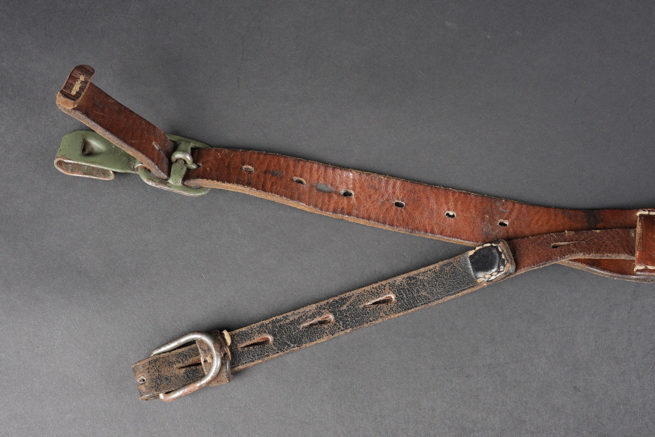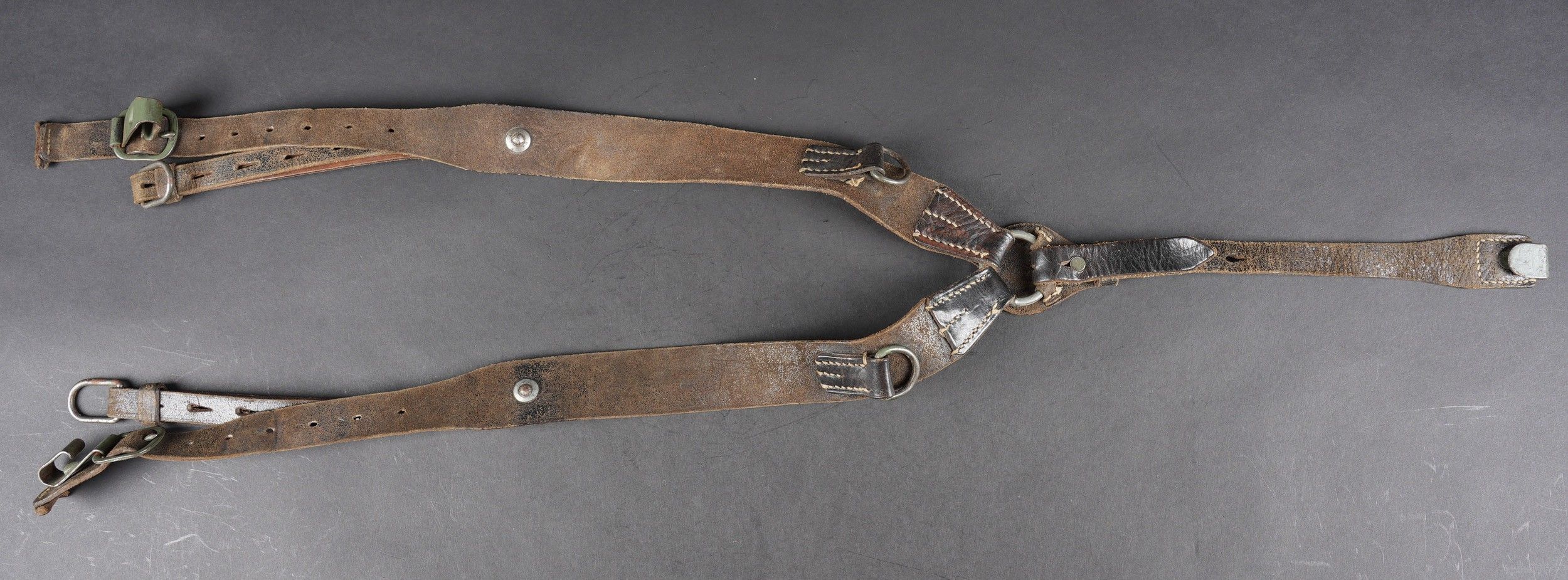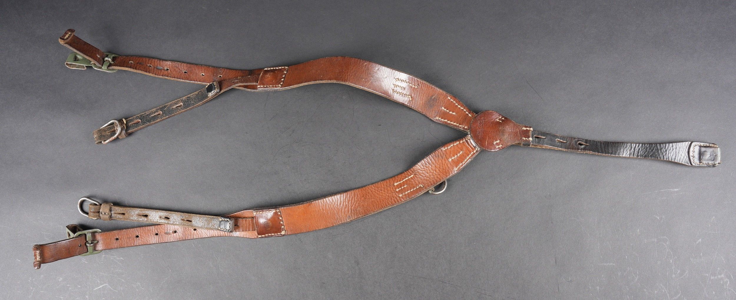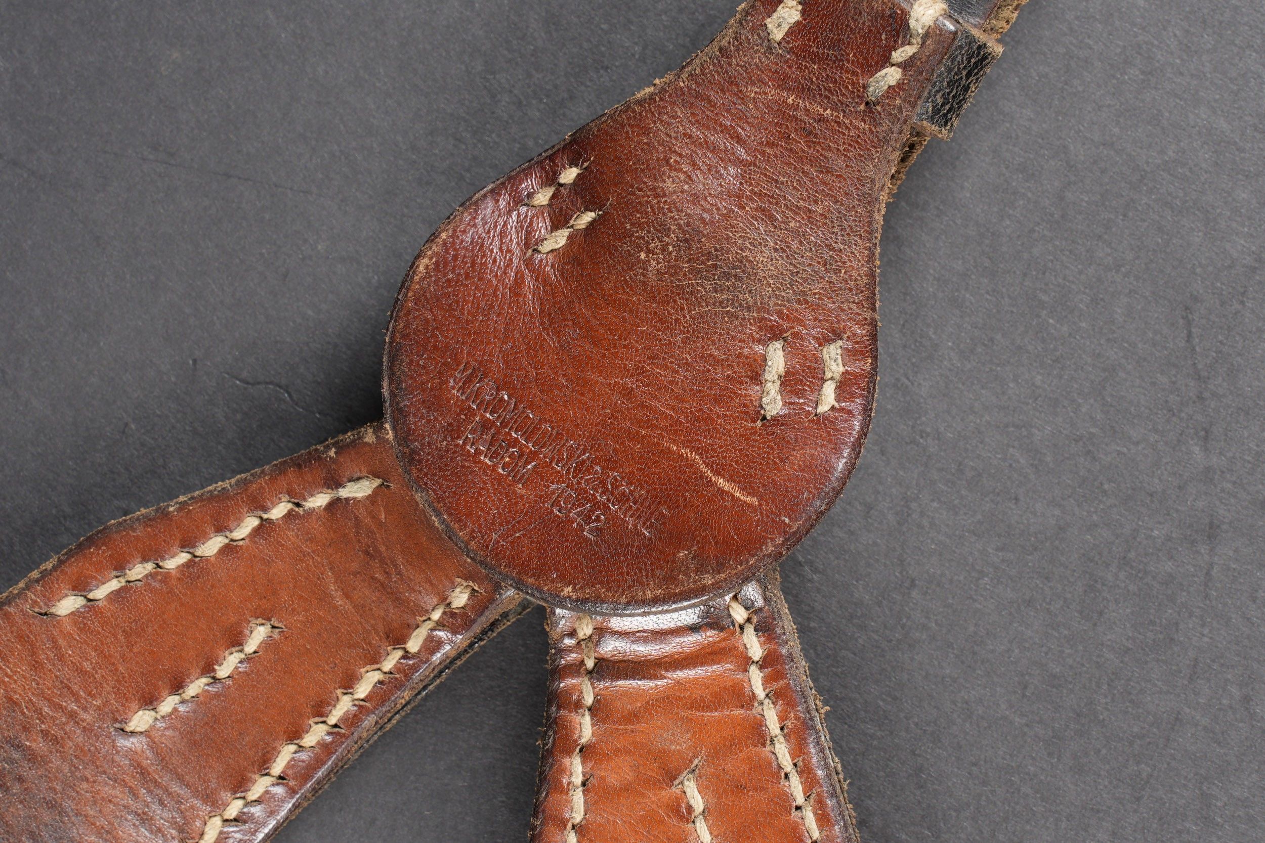 German heavy brelage. Black leather, relatively supple. All metal parts are present and mostly in original colour. Made by M Kromolowski & Söhne Radom 1942. Some wear and patina. Condition II+. Heavy German harness. Black leather, relatively supple. All metal fittings present, mostly in original colour. Maker M. Kromolowski & Söhne Radom 1942. Some wear and patina. Condition II+