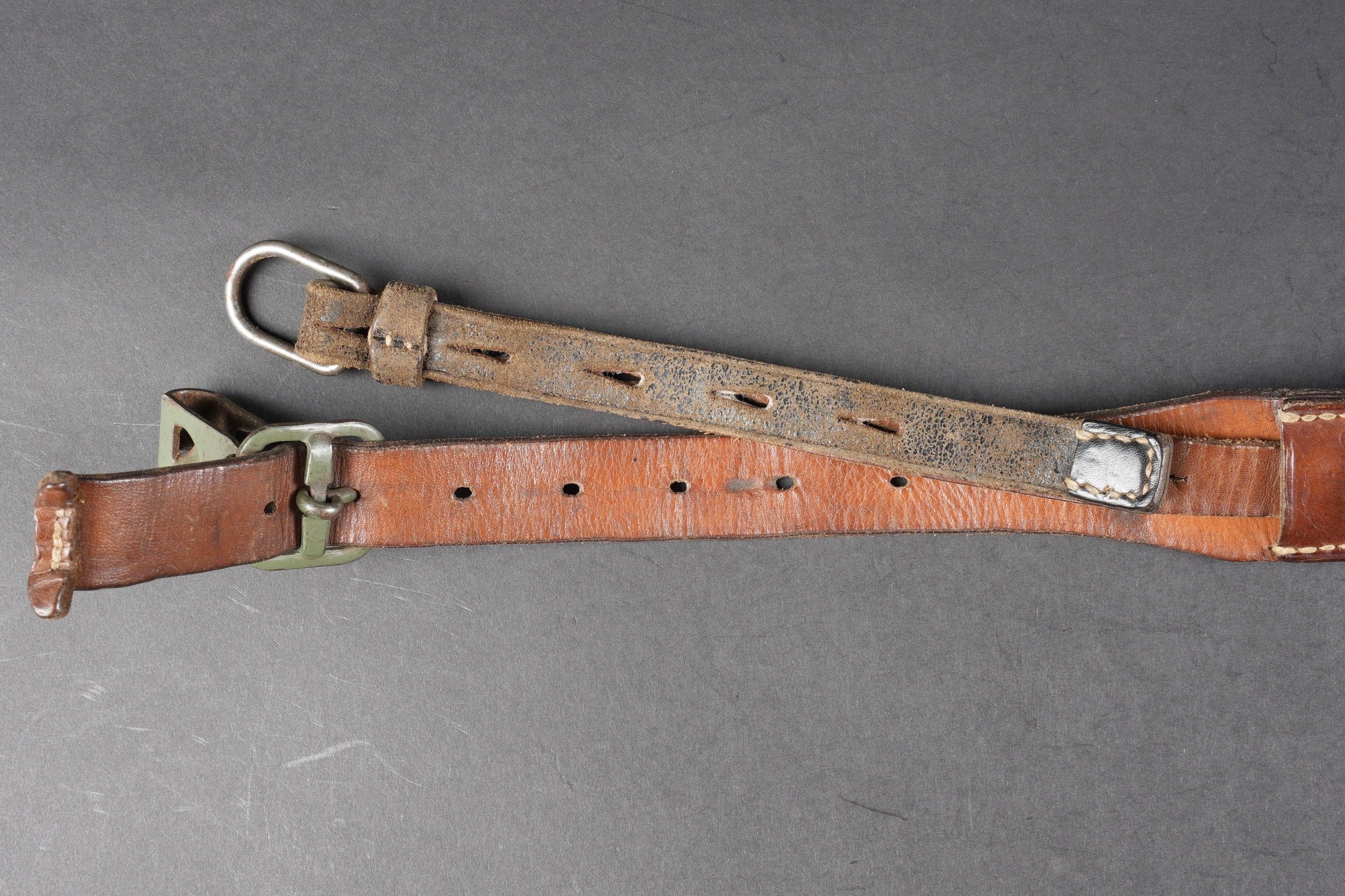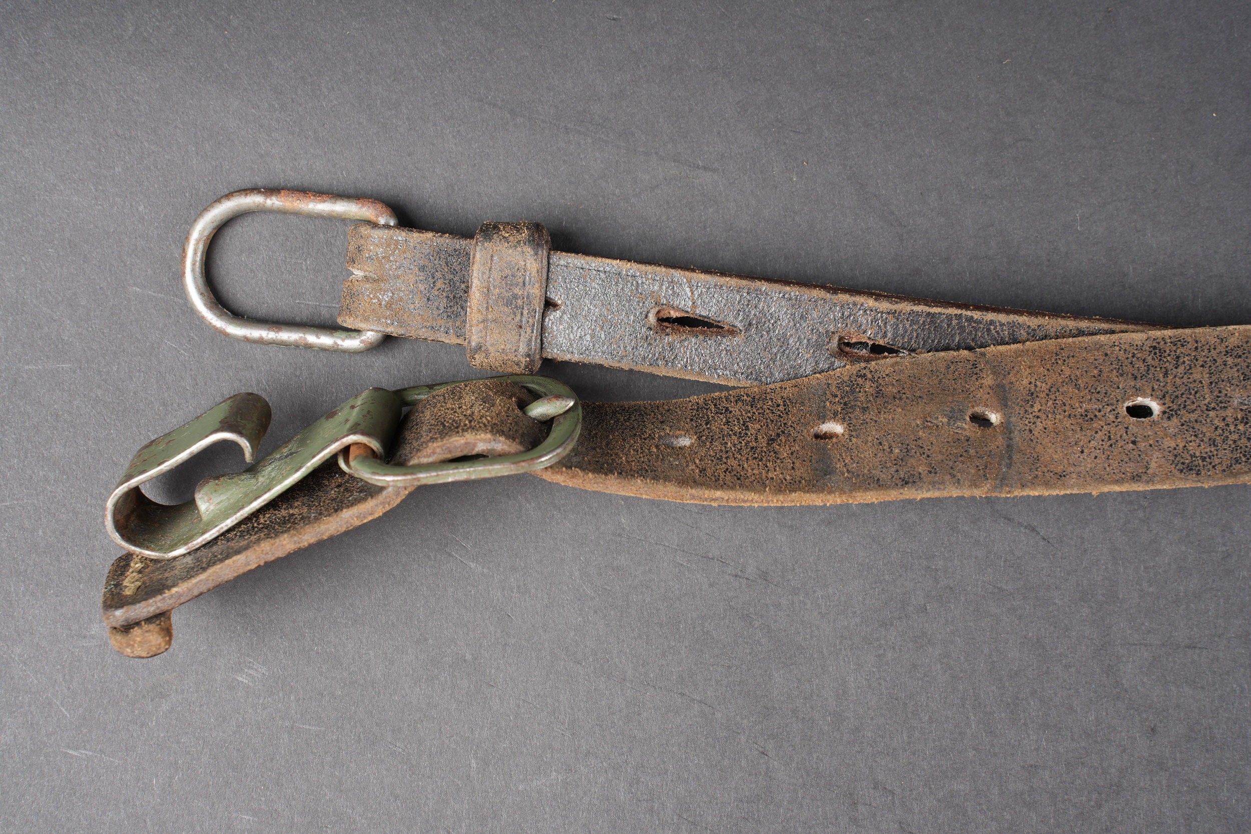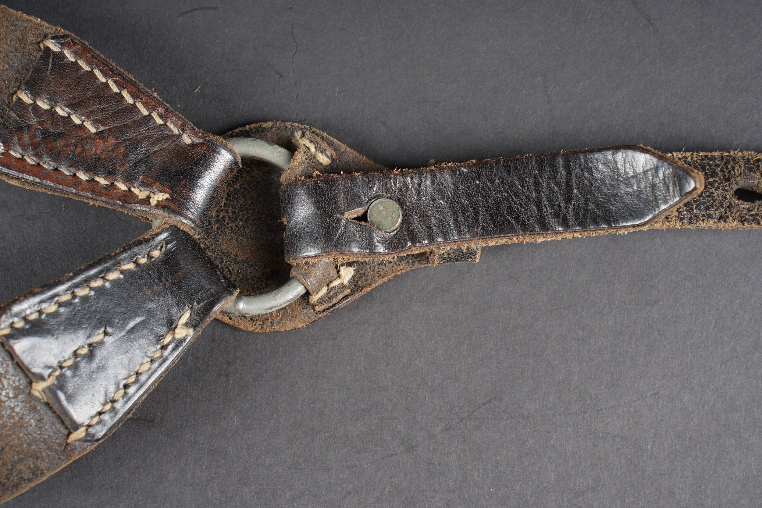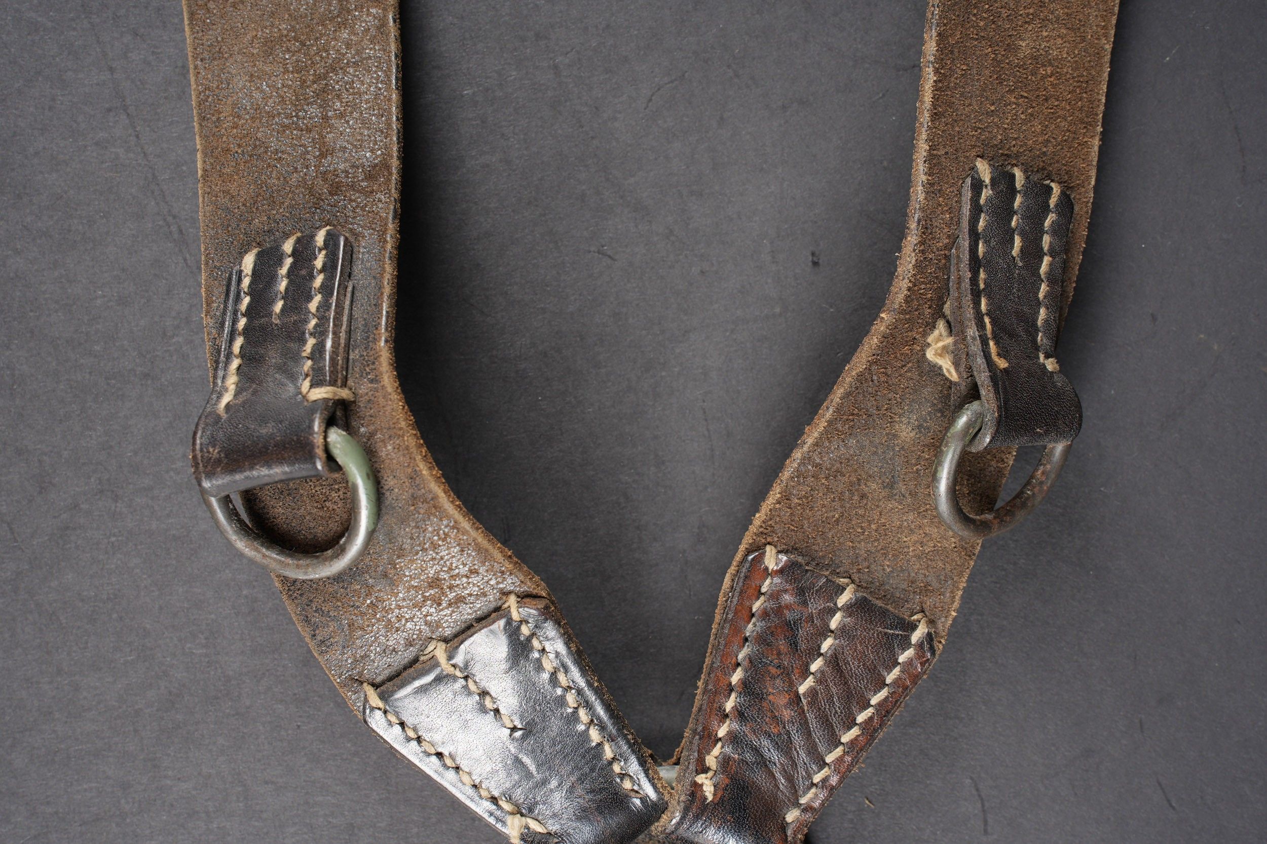 German heavy brelage. Black leather, relatively supple. All metal parts are present and mostly in original colour. Made by M Kromolowski & Söhne Radom 1942. Some wear and patina. Condition II+. Heavy German harness. Black leather, relatively supple. All metal fittings present, mostly in original colour. Maker M. Kromolowski & Söhne Radom 1942. Some wear and patina. Condition II+