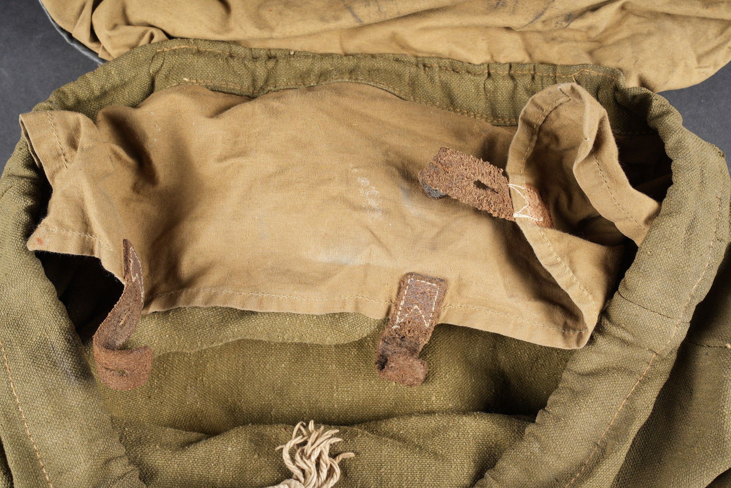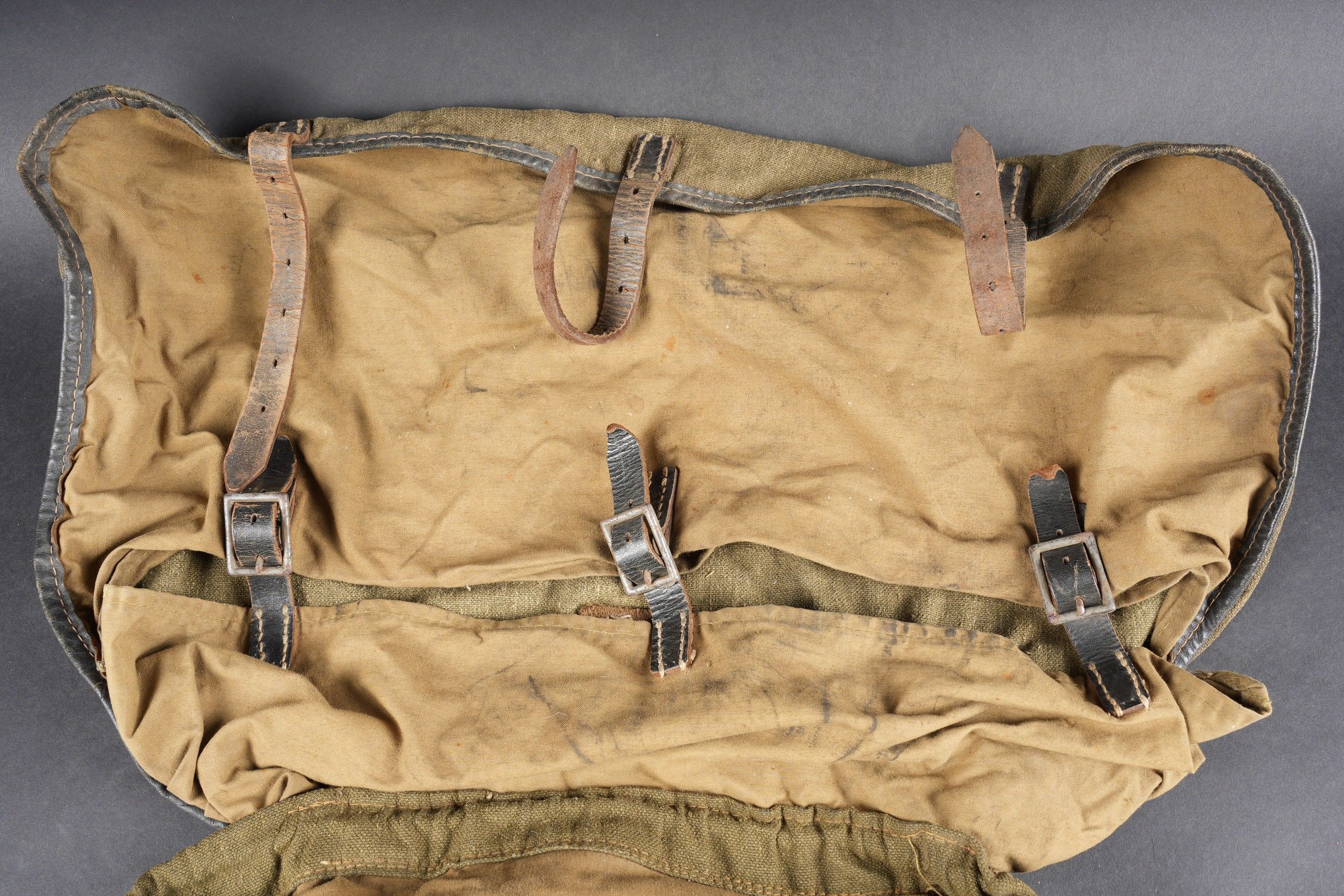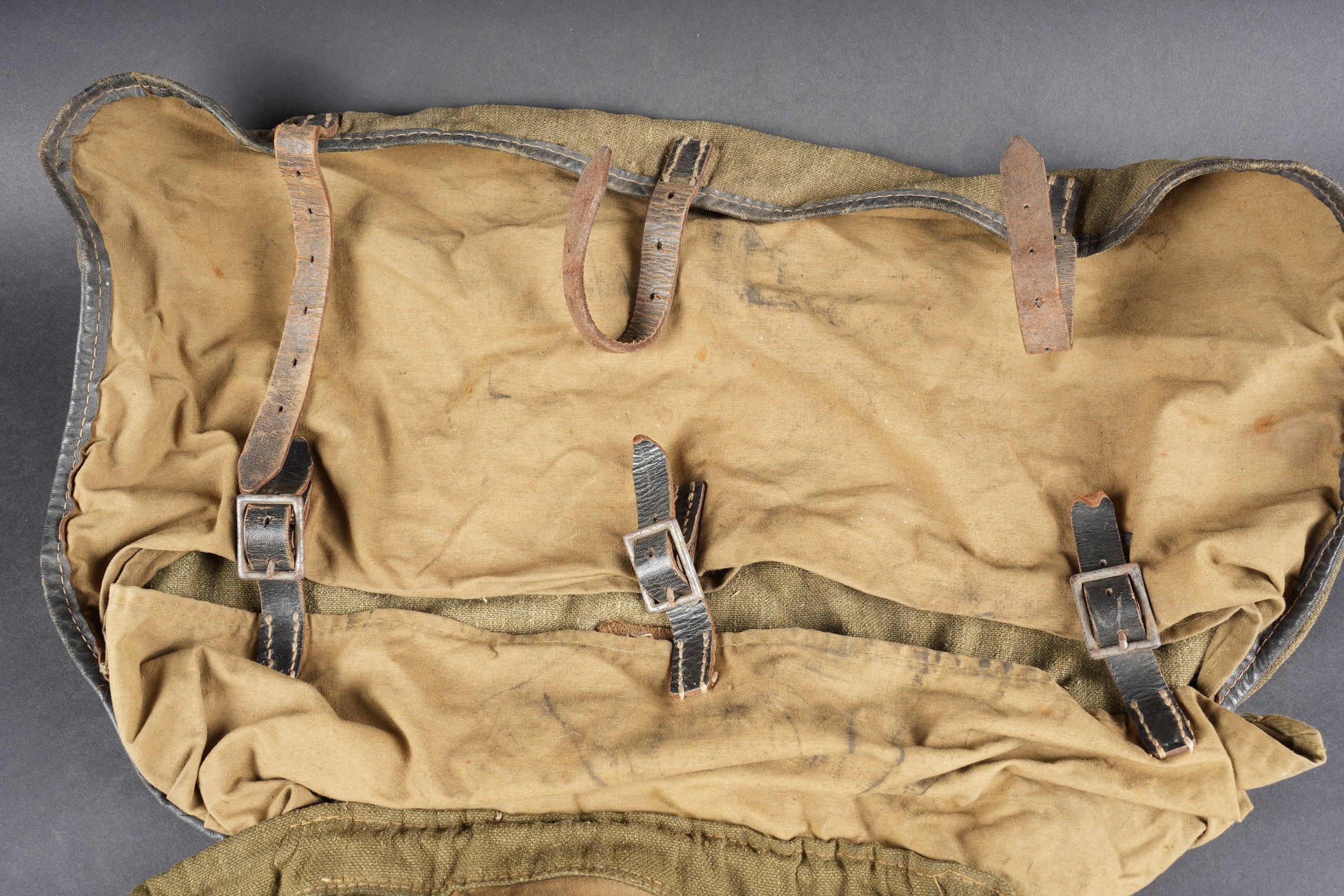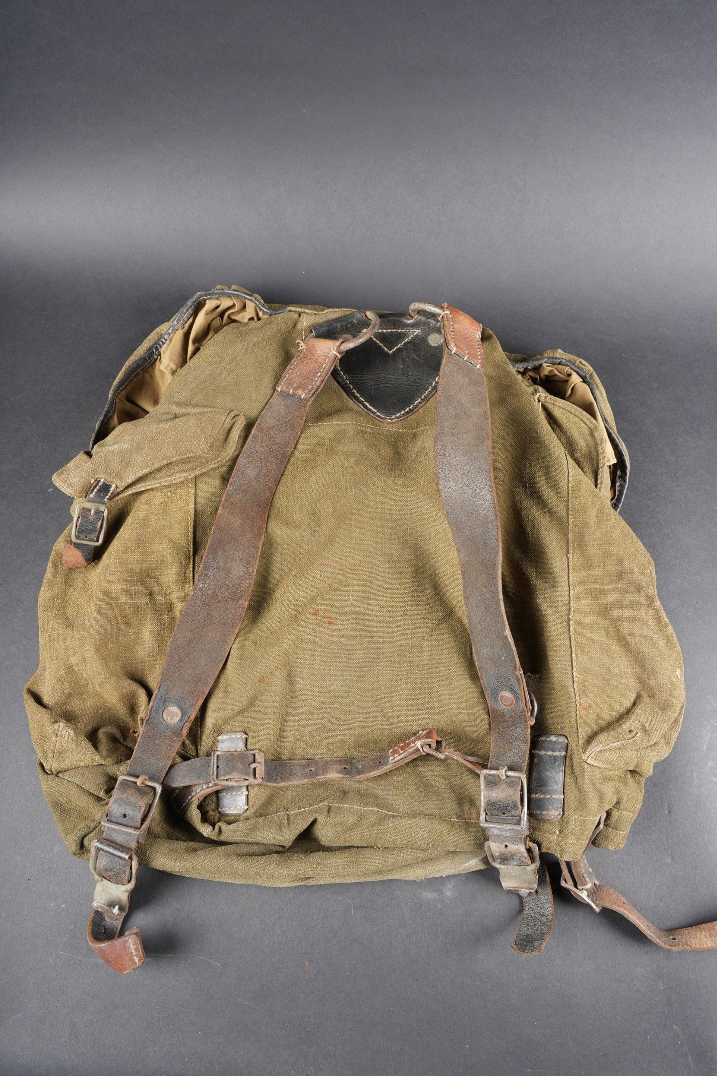 Gebirgsjäger rucksack. In heavy Feldgrau canvas and leather. Most of the straps are present. The drawstring is present. Leather shoulder straps are complete. All metal fittings are complete. No visible markings. Some wear and patina, as well as a few stains. Condition II+. Gebirgsjäger backpack. Made of heavy Feldgrau canvas and leather. Most straps and fittings intact. Drawstring present. Leather shoulder straps complete. All metal fittings complete. No visible markings. Some wear and patina with light staining. Condition II+
