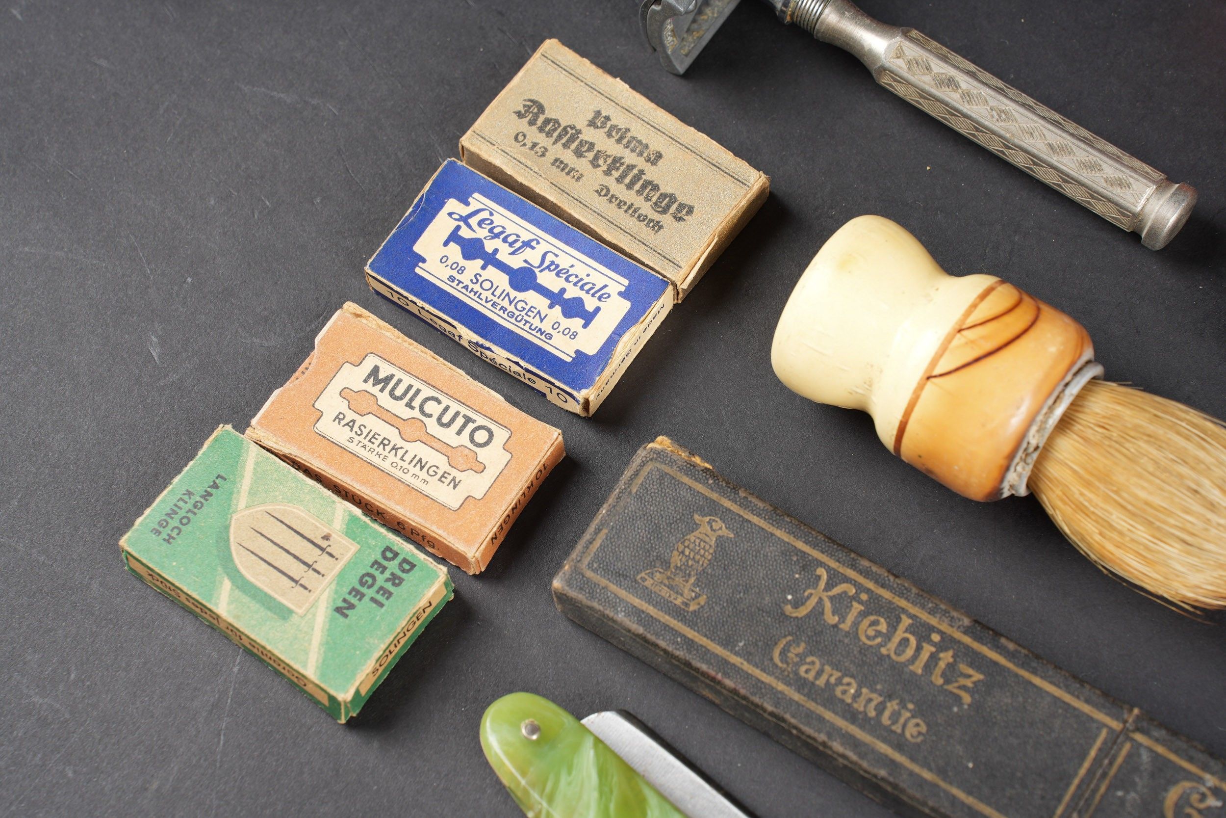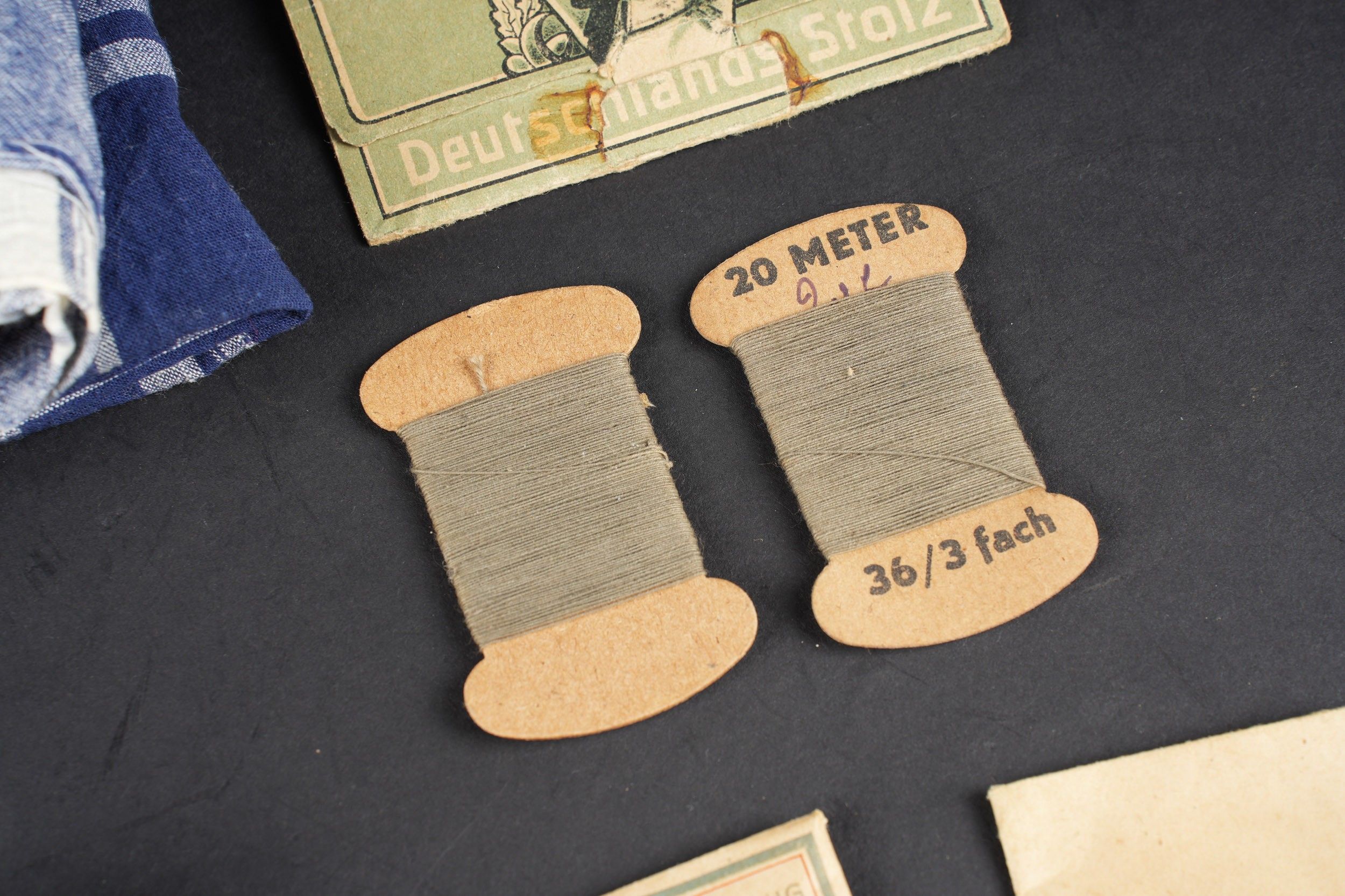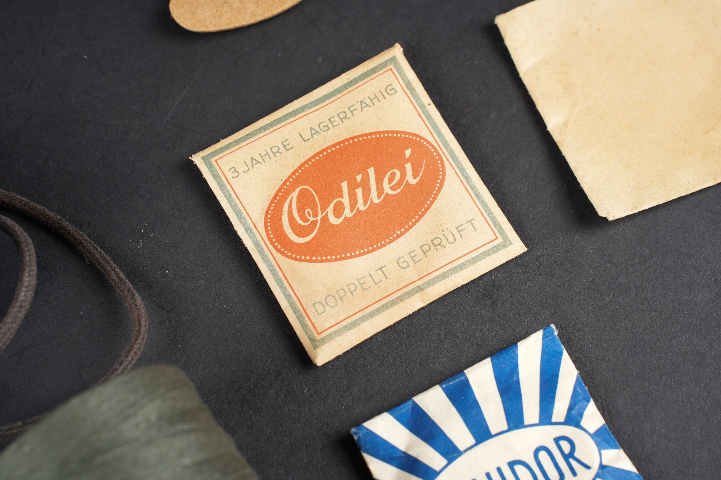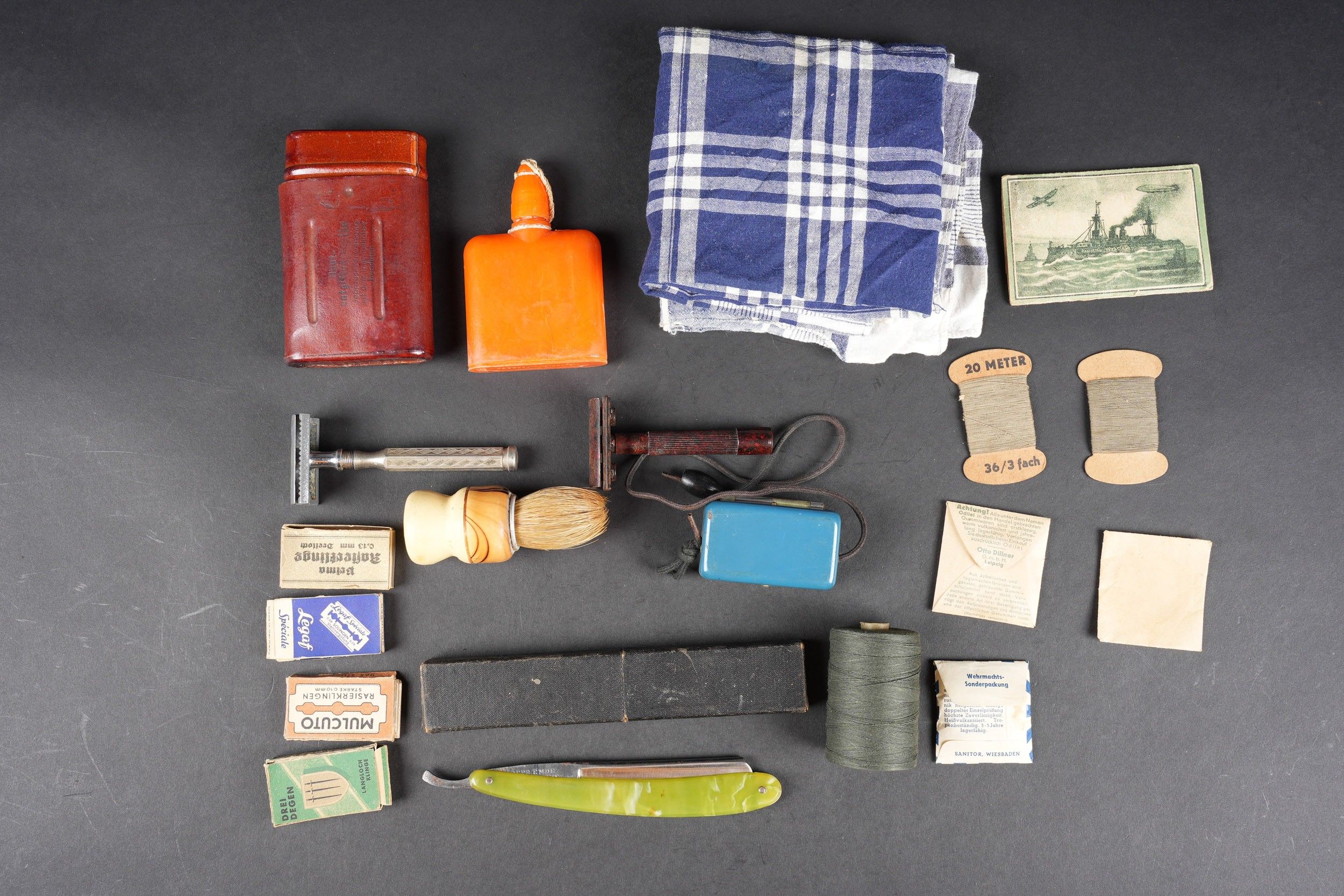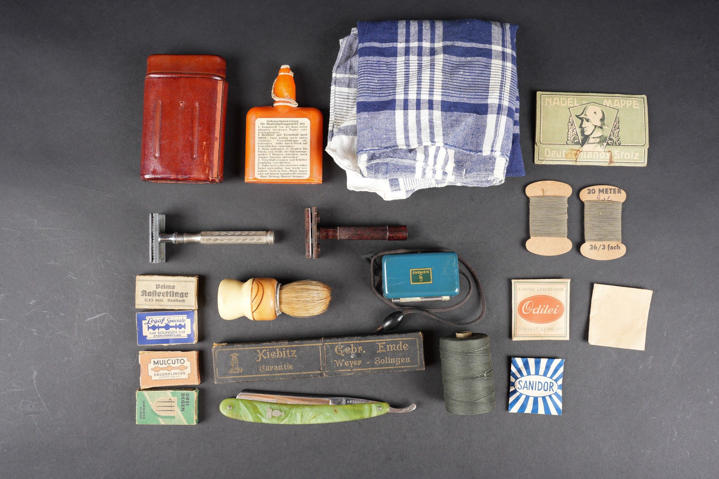 German toilet accessories. Comprising an empty condom wrapper. A condom in its original packaging, manufactured by Sanidor. One condom in original packaging, manufactured by Odilei. An incomplete box of Legaf razor blades. A complete box of Mulcoto razor blades. An incomplete sewing kit, made by NaDel Mappe Deutschlands Stolz. A complete box of Drei Degen razor blades. A spool of Feldgrau sewing thread. A shaving brush, no visible markings. Two sewing thread plates, marked 20 meter 363 fach. One brown bakelite Perfect Razor. A Ben Hur DRM razor in metal. An incomplete box of Prima Rasierklinge razor blades. A Siemens instrument for sharpening razor blades. A Kiebitz Weyer Solingen razor in its original box, the blade is damaged. A white and blue checked handkerchief. A bottle of anti-gas product in its brown bakelite box. Some wear and patina. Condition II+. German toiletry accessories. Includes an empty condom wrapper, one condom in original Sanidor packaging, one in Odilei packaging, an incomplete pack of Legaf razor blades, a complete pack of Mulcoto razor blades, an incomplete sewing kit marked NaDel Mappe Deutschlands Stolz, a full pack of Drei Degen razor blades, a spool of Feldgrau sewing thread, a shaving brush, unmarked, two thread cards marked 20 Meter 363 Fach, a brown bakelite Perfect Razor, a metal Ben Hur DRM razor, an incomplete pack of Prima Rasierklinge blades, a Siemens blade sharpener, a straight razor in original box by Kiebitz Weyer Solingen, blade chipped, a blue and white checked handkerchief, and a brown bakelite container of anti-gas product. Some wear and patina. Condition II+.