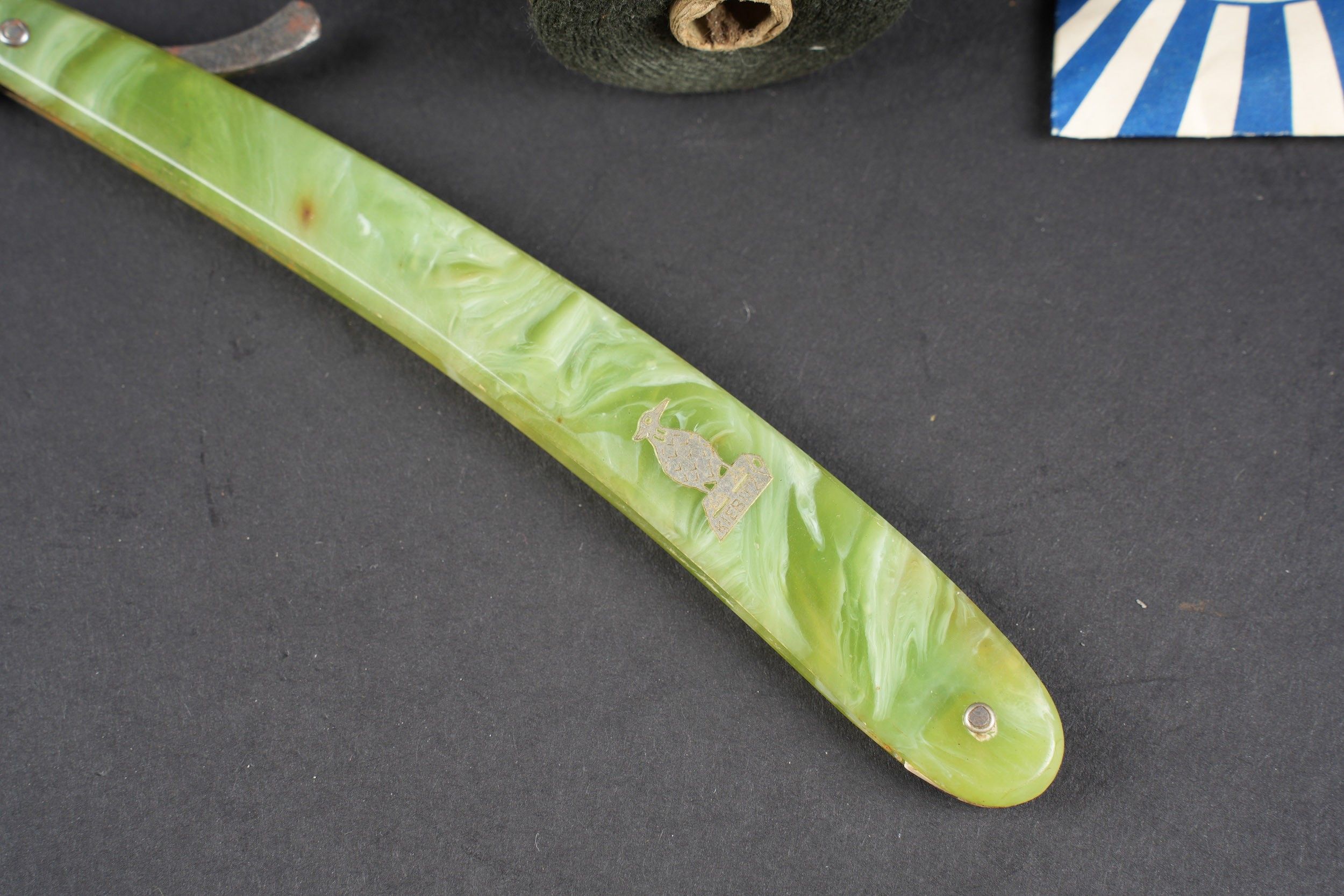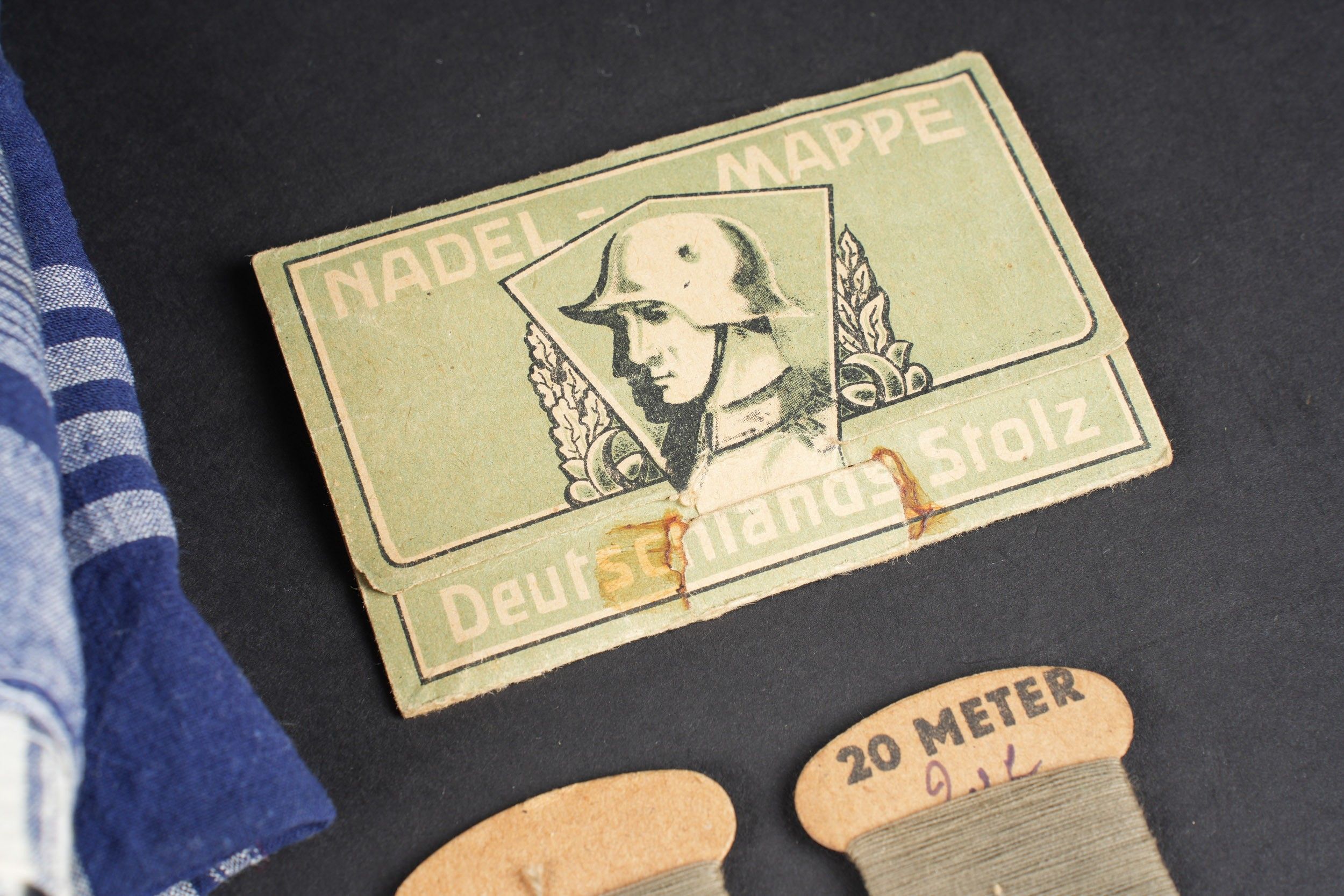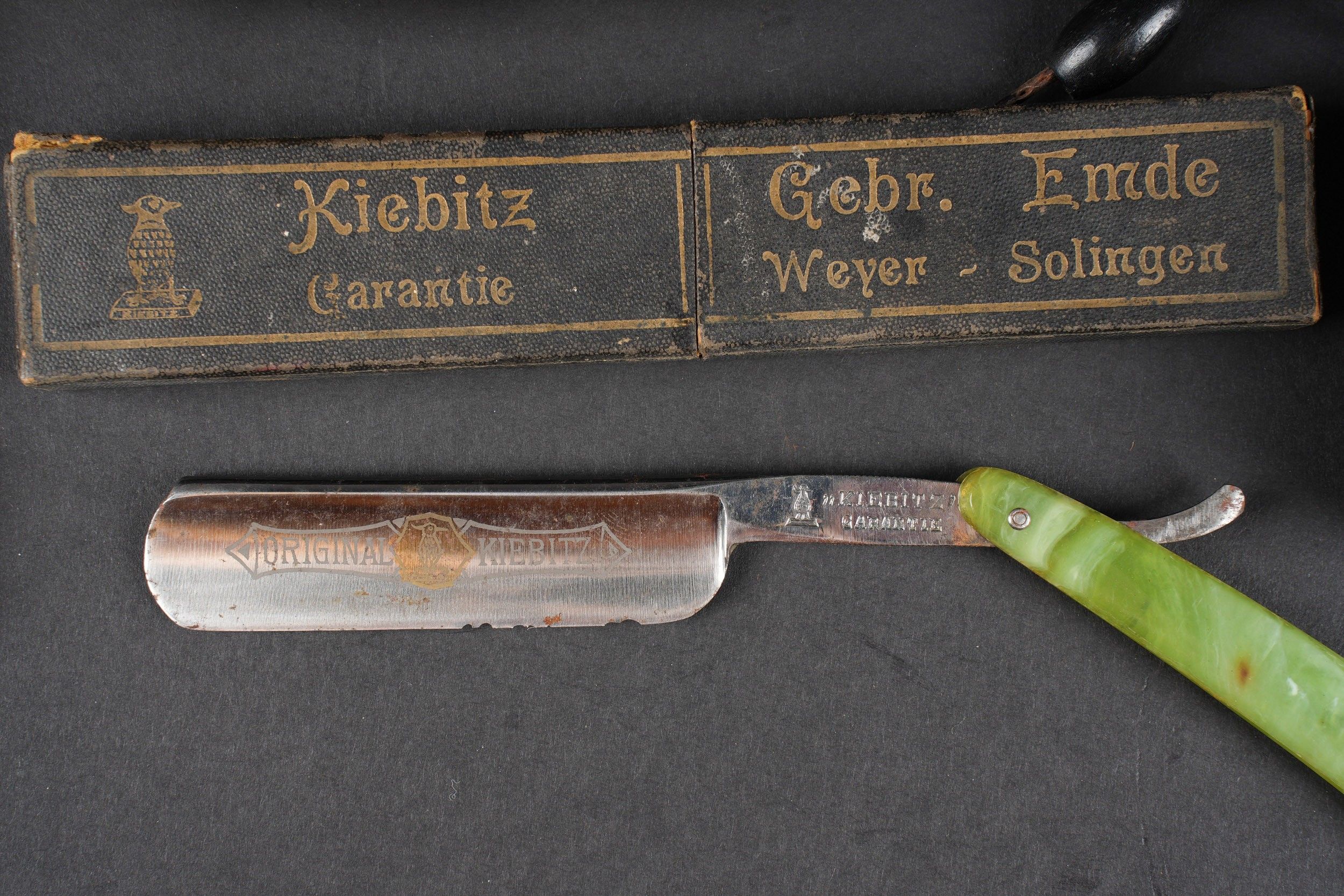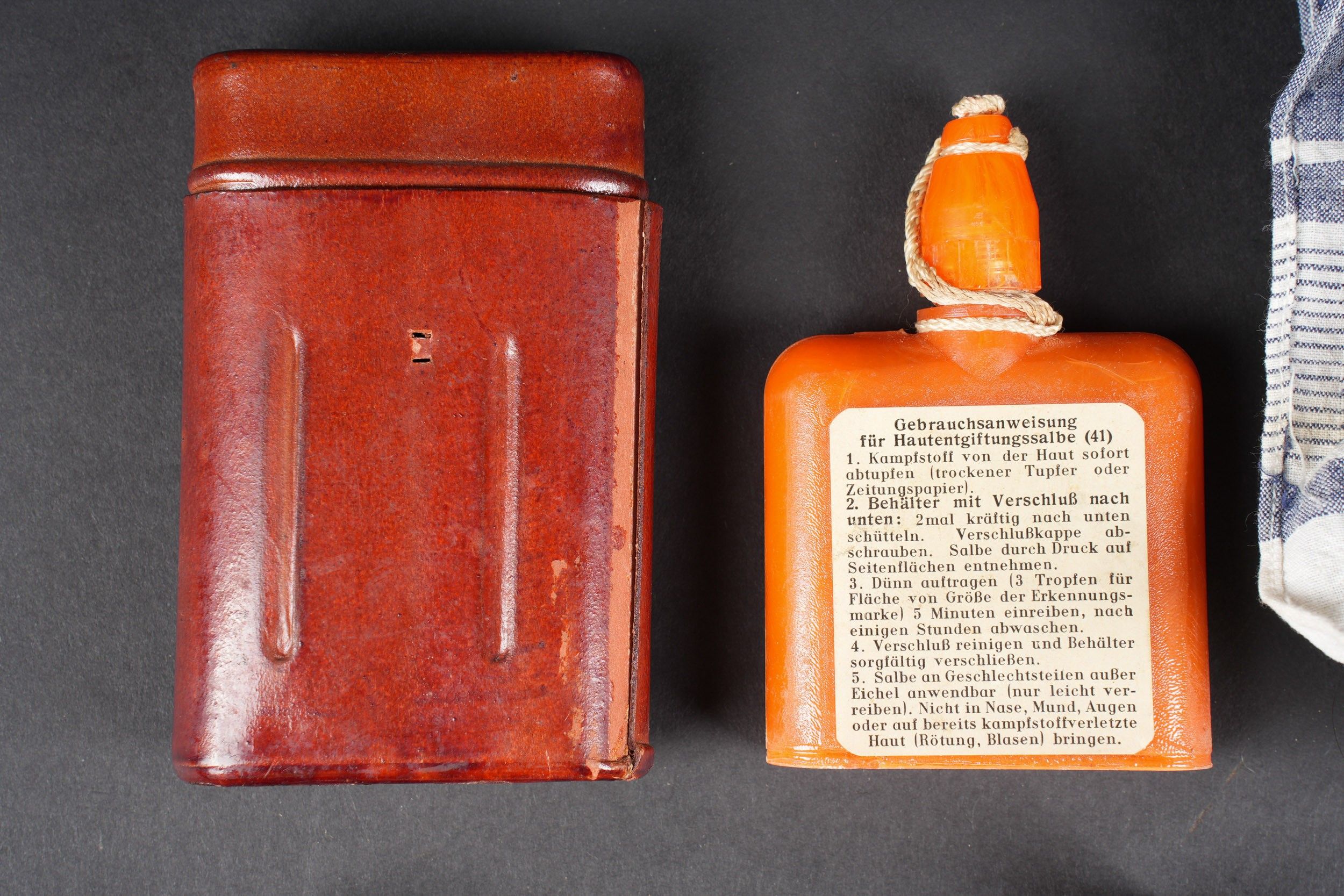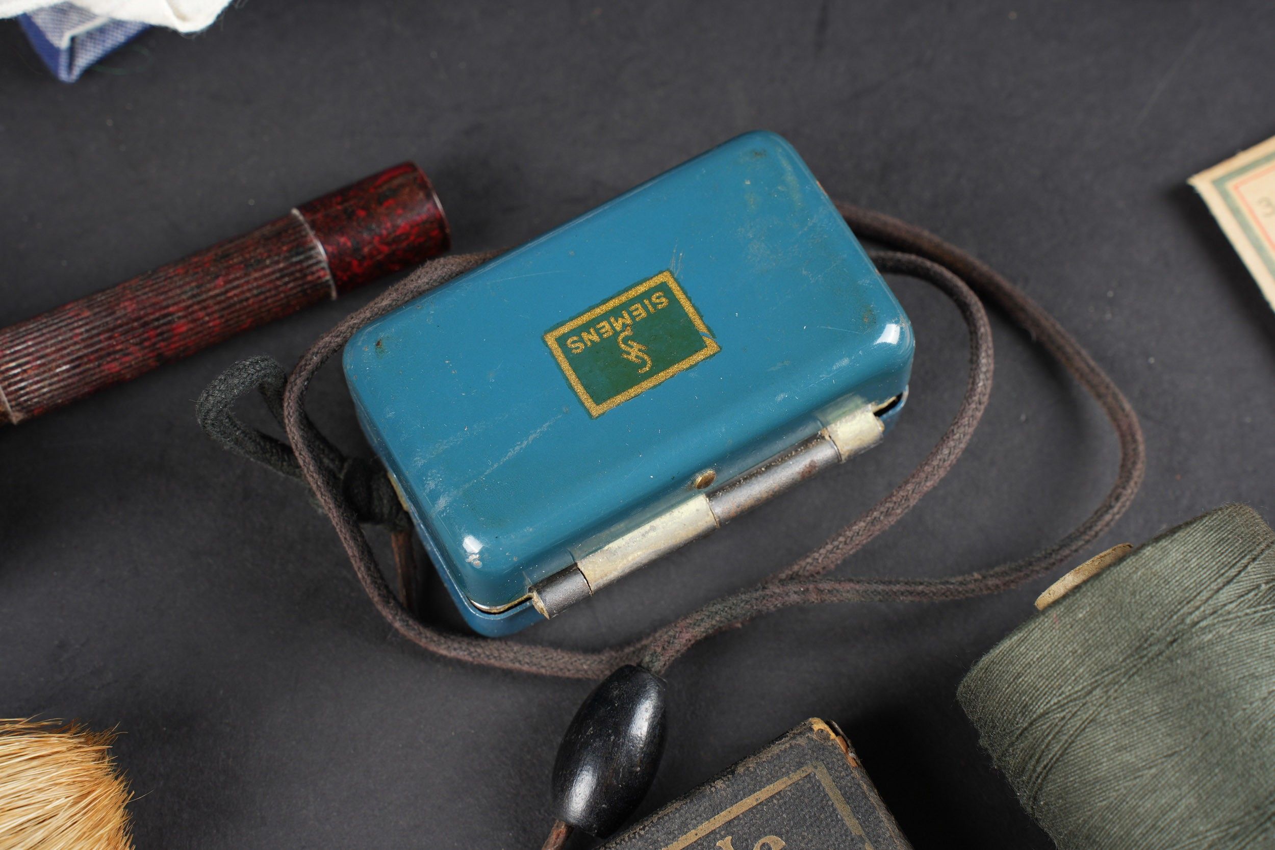 German toilet accessories. Comprising an empty condom wrapper. A condom in its original packaging, manufactured by Sanidor. One condom in original packaging, manufactured by Odilei. An incomplete box of Legaf razor blades. A complete box of Mulcoto razor blades. An incomplete sewing kit, made by NaDel Mappe Deutschlands Stolz. A complete box of Drei Degen razor blades. A spool of Feldgrau sewing thread. A shaving brush, no visible markings. Two sewing thread plates, marked 20 meter 363 fach. One brown bakelite Perfect Razor. A Ben Hur DRM razor in metal. An incomplete box of Prima Rasierklinge razor blades. A Siemens instrument for sharpening razor blades. A Kiebitz Weyer Solingen razor in its original box, the blade is damaged. A white and blue checked handkerchief. A bottle of anti-gas product in its brown bakelite box. Some wear and patina. Condition II+. German toiletry accessories. Includes an empty condom wrapper, one condom in original Sanidor packaging, one in Odilei packaging, an incomplete pack of Legaf razor blades, a complete pack of Mulcoto razor blades, an incomplete sewing kit marked NaDel Mappe Deutschlands Stolz, a full pack of Drei Degen razor blades, a spool of Feldgrau sewing thread, a shaving brush, unmarked, two thread cards marked 20 Meter 363 Fach, a brown bakelite Perfect Razor, a metal Ben Hur DRM razor, an incomplete pack of Prima Rasierklinge blades, a Siemens blade sharpener, a straight razor in original box by Kiebitz Weyer Solingen, blade chipped, a blue and white checked handkerchief, and a brown bakelite container of anti-gas product. Some wear and patina. Condition II+.