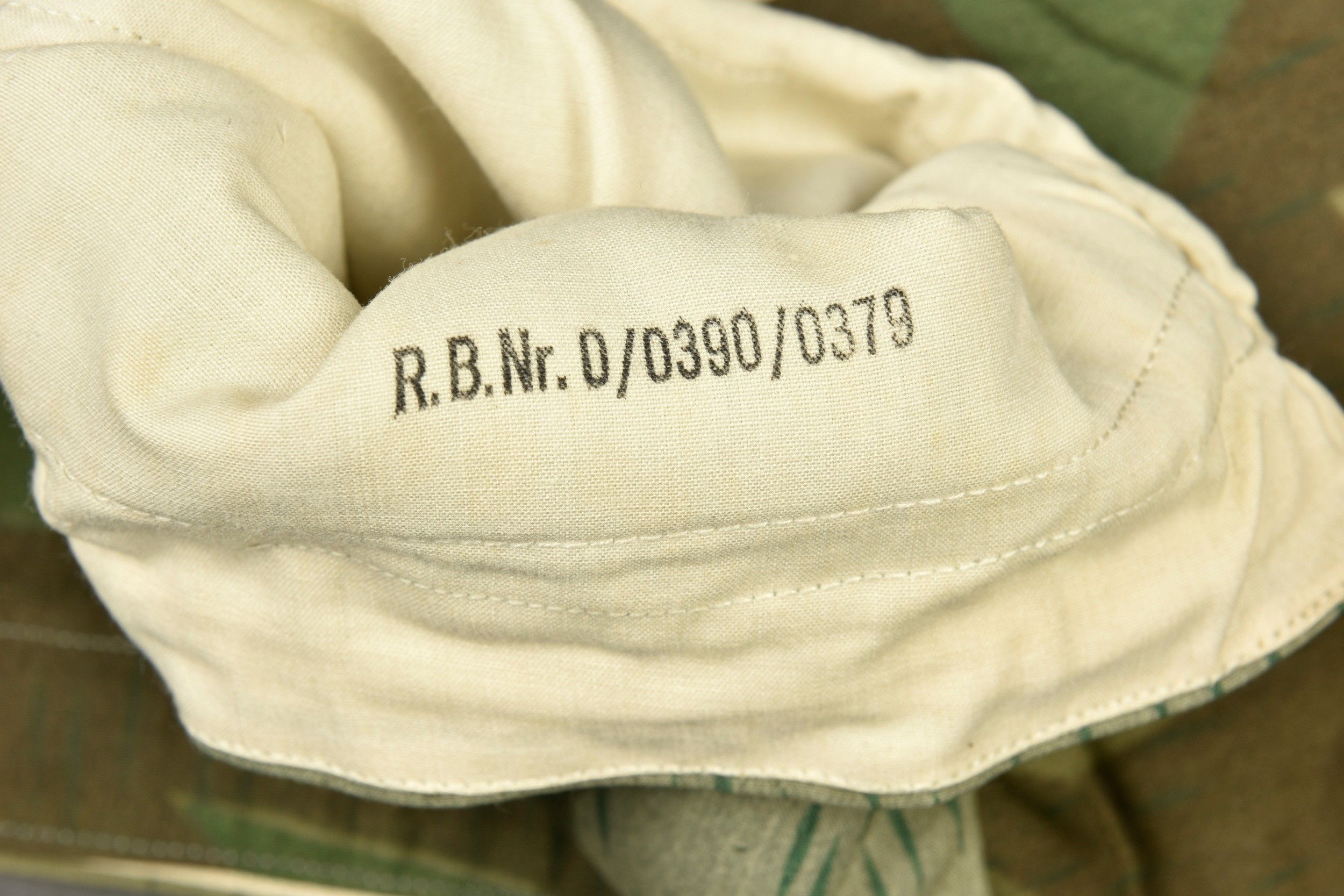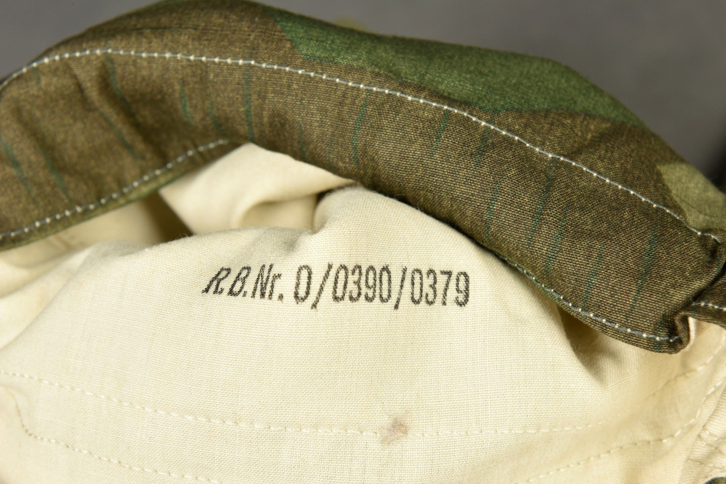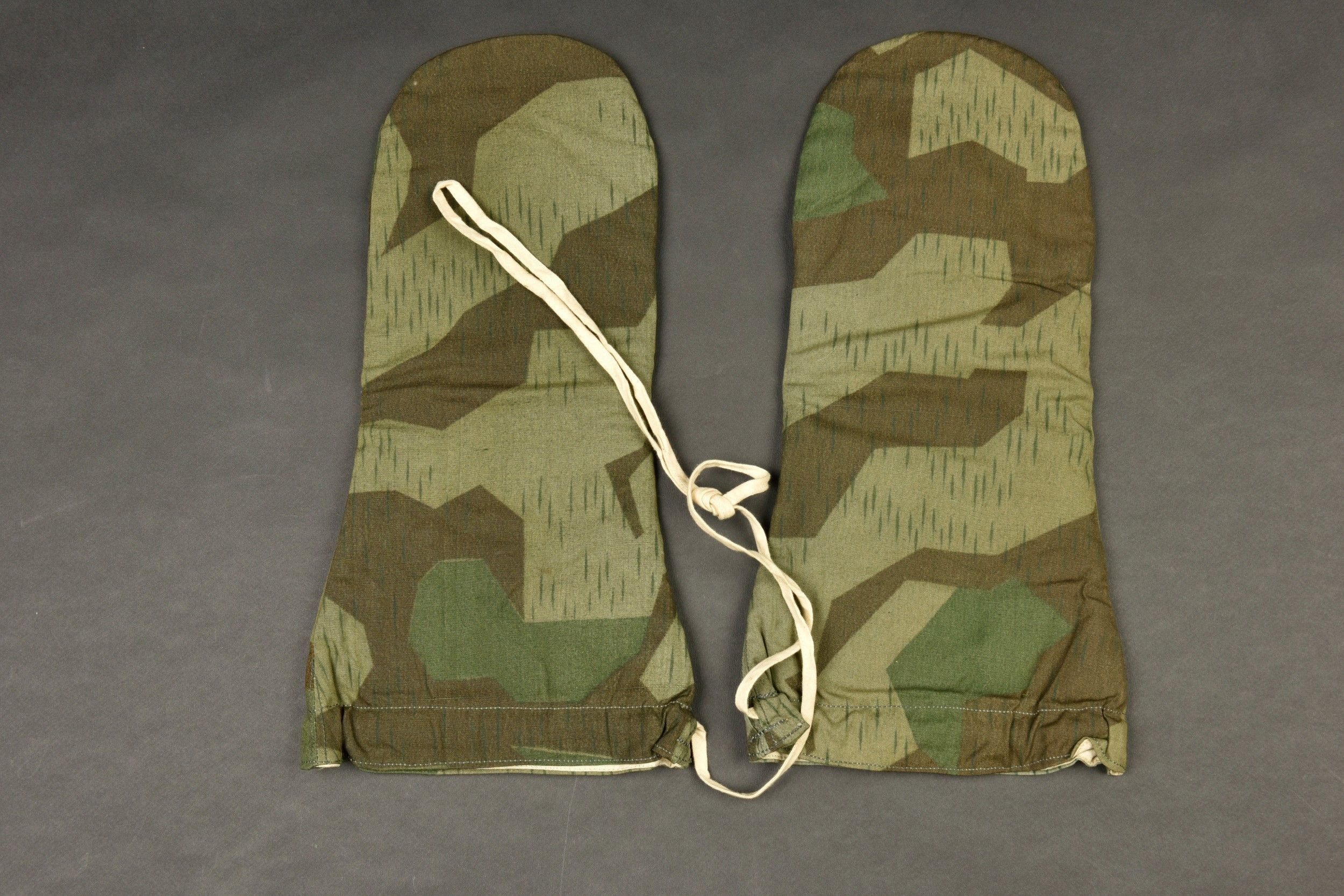 Camouflage gloves. Pair of reversible gloves. Made of camouflaged white and sparkle fabric. On the camouflaged side we can distinguish several pieces of bright fabric in different colours. Homogenous pair. The cords are complete. RBNR markings 003900379. Slight wear and patina. Condition I+. Camouflage gloves. Reversible pair, splinter pattern on one side and white on the other. Constructed from several fabric panels of differing tones. Matching pair. Complete drawstrings. Marked RBNR 003900379. Light wear and patina. Condition I+