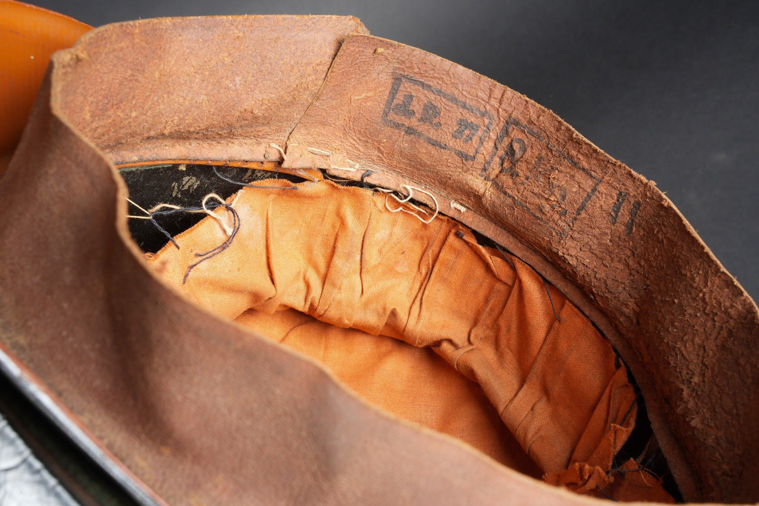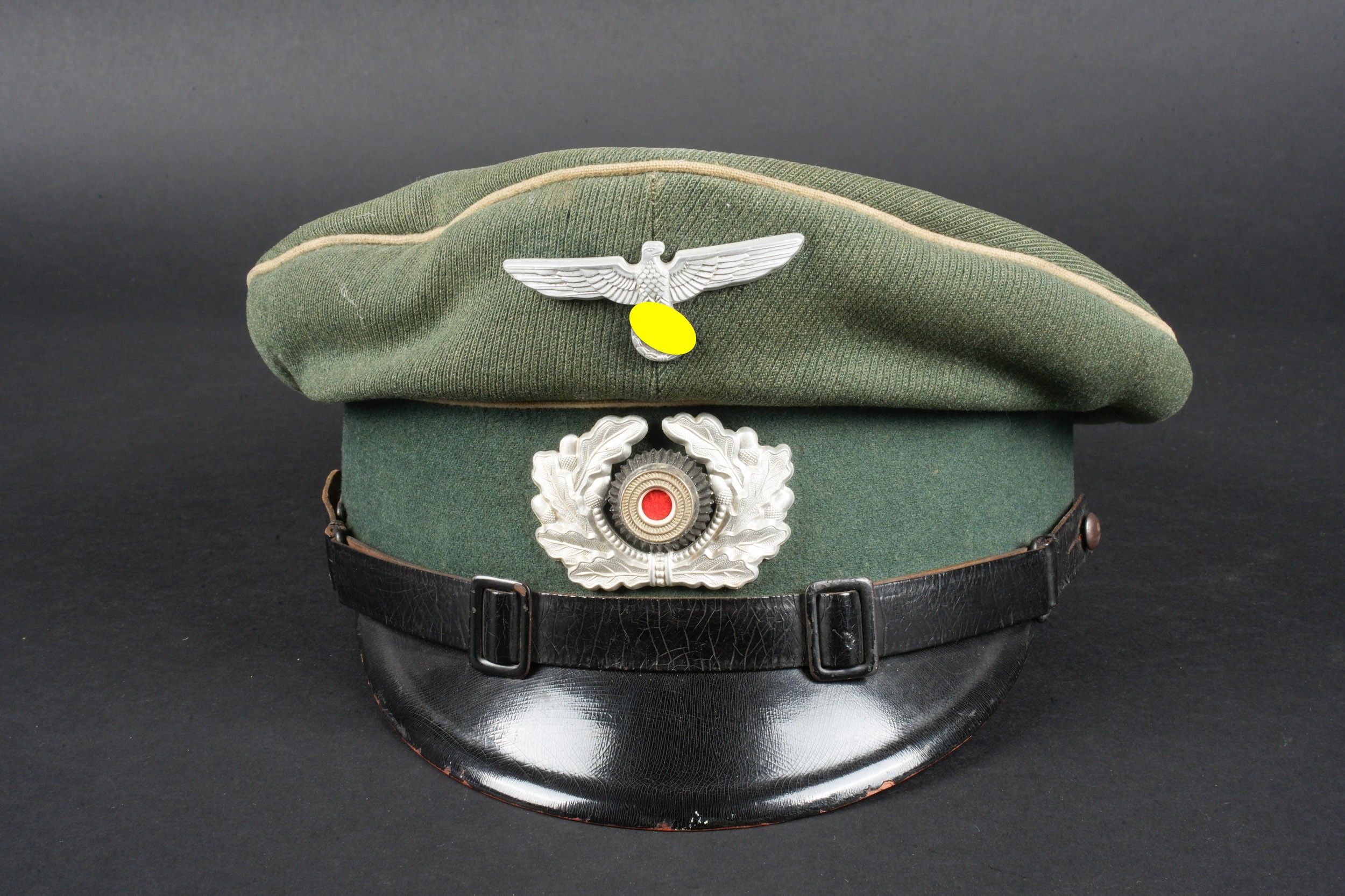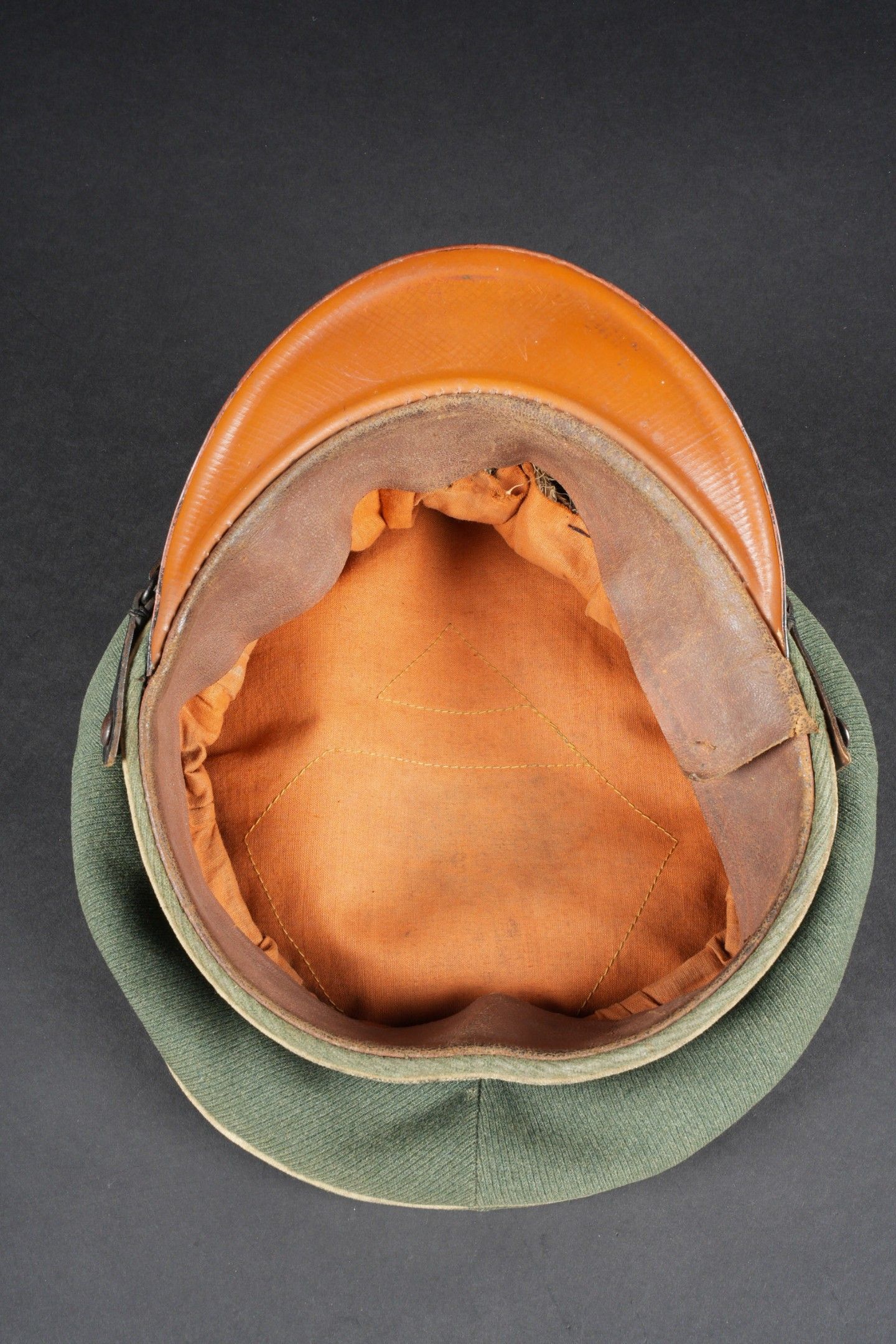 Infantry non-commissioned officer's cap. Feldgrau gabardine, triple white infantry piping. Dark green cloth headband. Black leather chinstrap. Metal insignia. The badges have not been disassembled in order to check the fastenings. Nice broken shape. Interior lined in partially untucked red cloth. Mica missing. Brown leather sweatband. Markings under the sweatband JR 77 8Kp II. Some wear and patina to be noted, as well as a few stains on the top. Condition II+. Infantry NCO visor cap. Feldgrau gabardine with triple white piping for Infantry. Dark green wool band. Black leather chinstrap. Metal insignia not removed. Classic saddle shape. Red cloth lining, partly detached. No mica. Brown leather sweatband stamped JR 77 8Kp II. Some wear, patina, and stains on the crown. Condition II+.