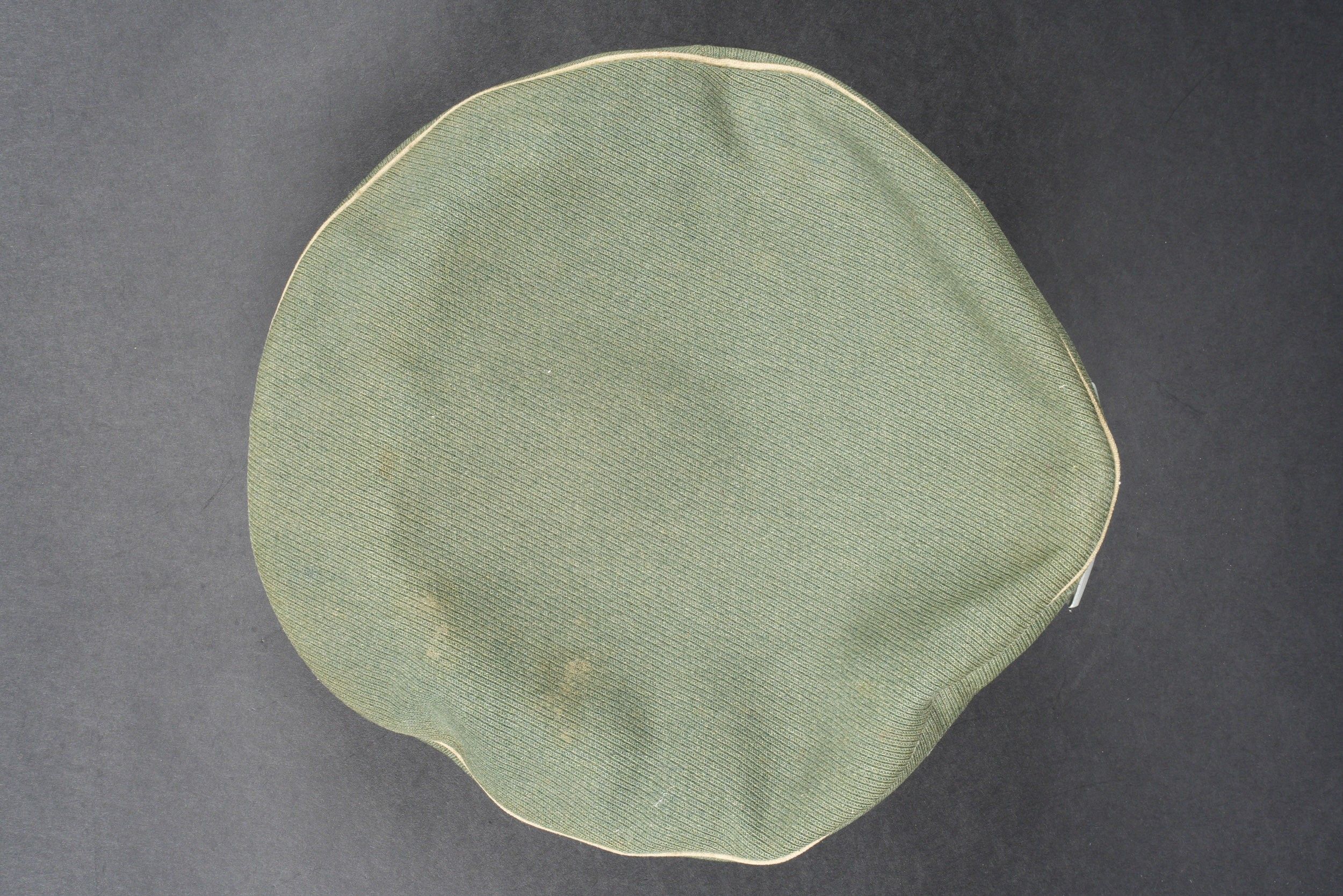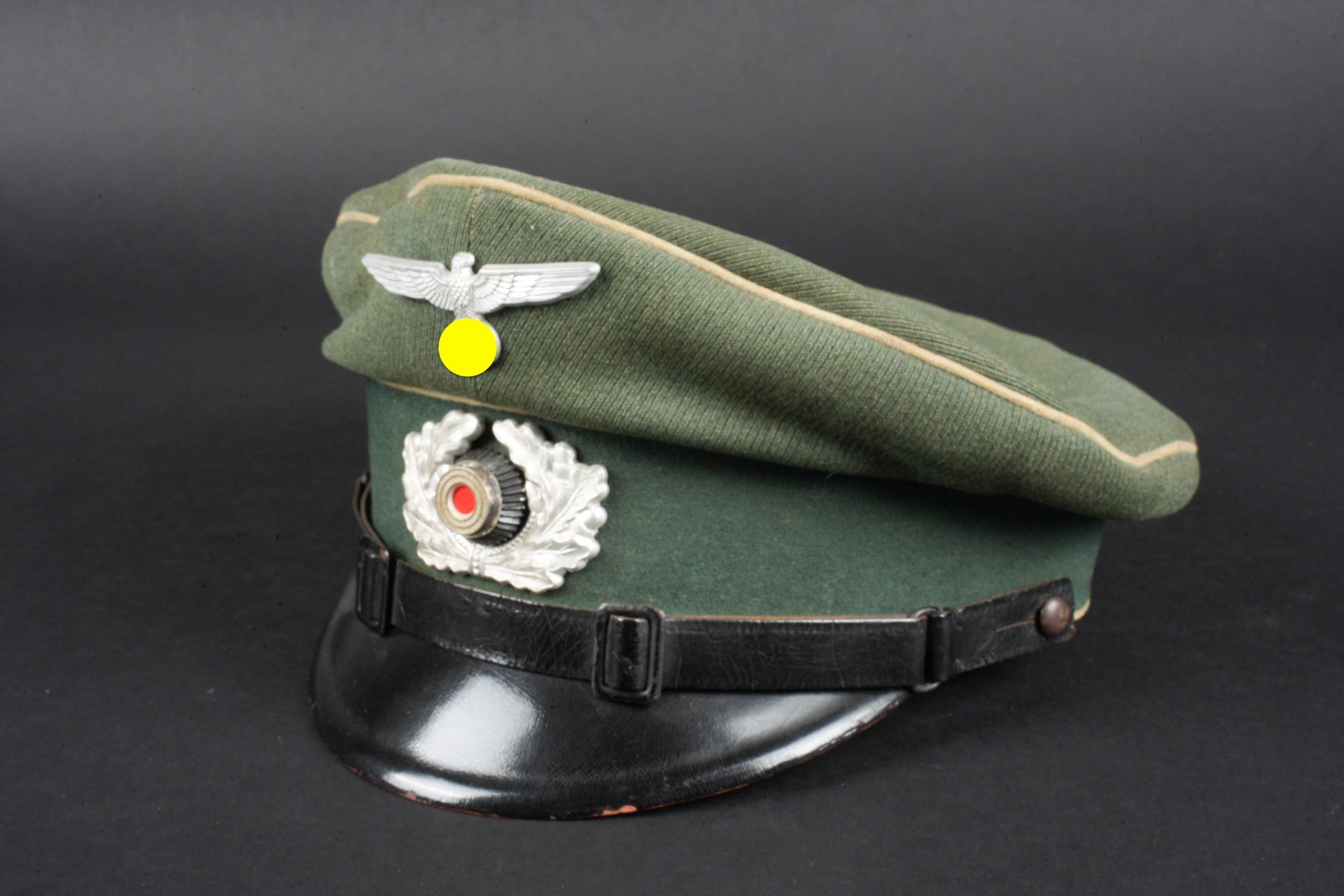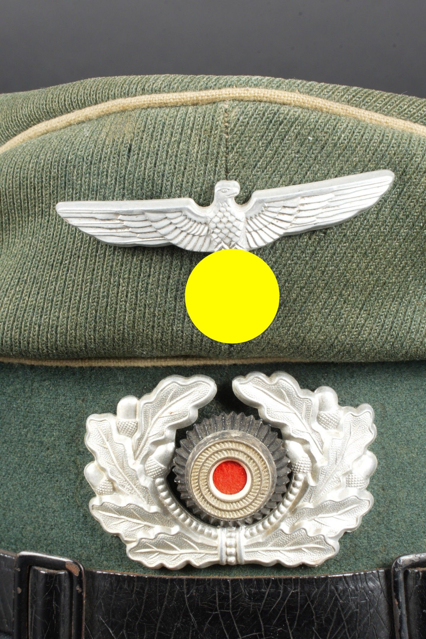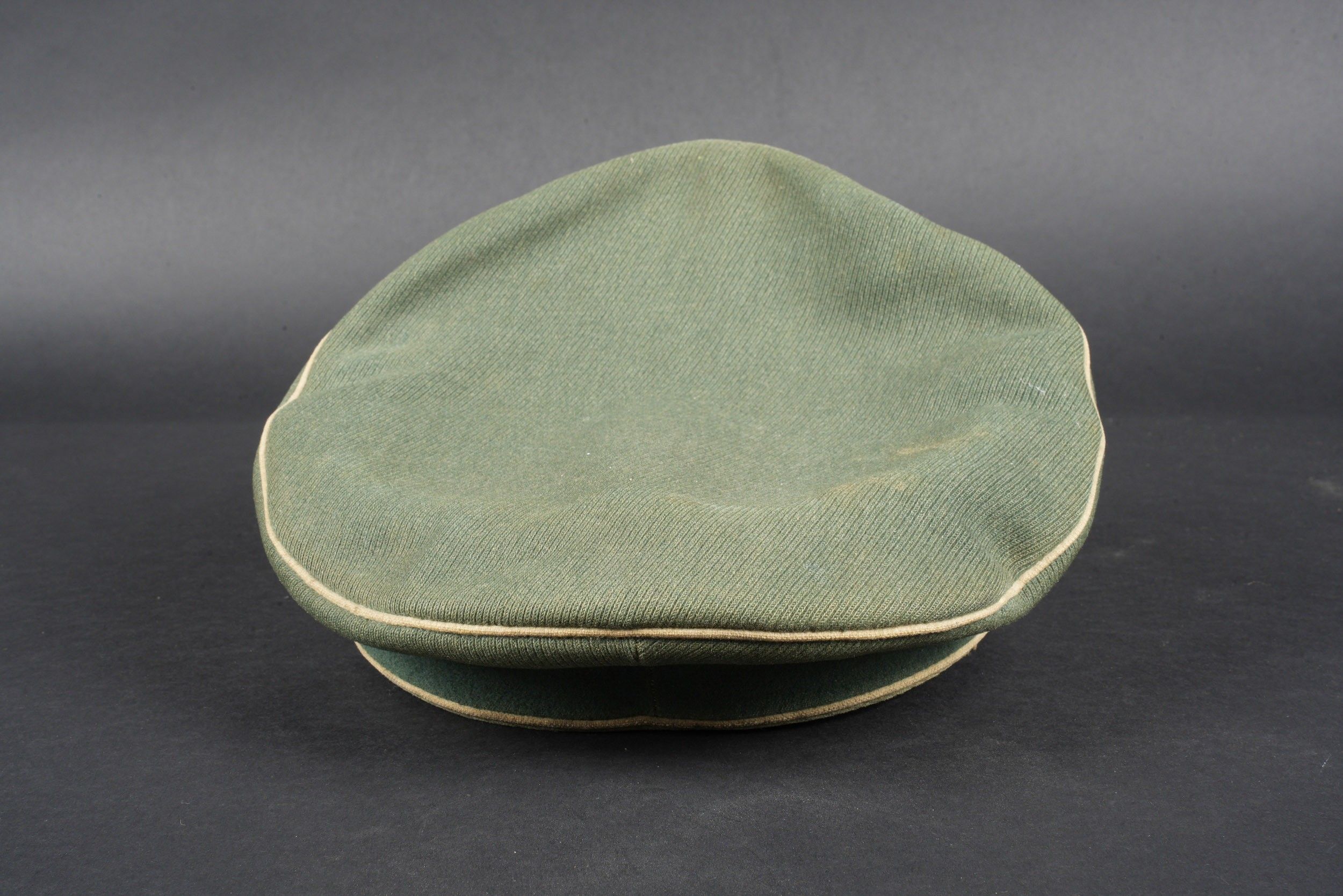 Infantry non-commissioned officer's cap. Feldgrau gabardine, triple white infantry piping. Dark green cloth headband. Black leather chinstrap. Metal insignia. The badges have not been disassembled in order to check the fastenings. Nice broken shape. Interior lined in partially untucked red cloth. Mica missing. Brown leather sweatband. Markings under the sweatband JR 77 8Kp II. Some wear and patina to be noted, as well as a few stains on the top. Condition II+. Infantry NCO visor cap. Feldgrau gabardine with triple white piping for Infantry. Dark green wool band. Black leather chinstrap. Metal insignia not removed. Classic saddle shape. Red cloth lining, partly detached. No mica. Brown leather sweatband stamped JR 77 8Kp II. Some wear, patina, and stains on the crown. Condition II+.