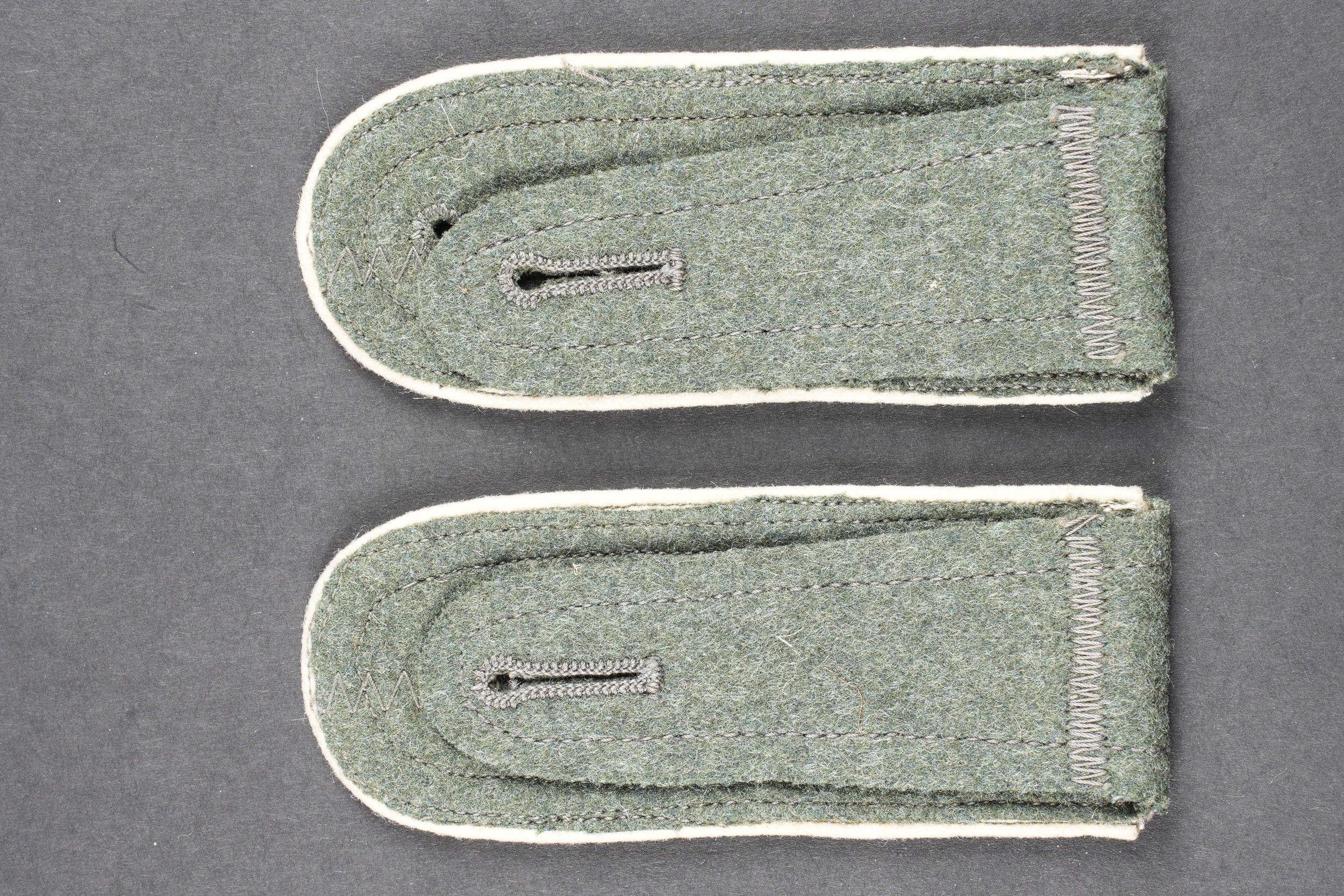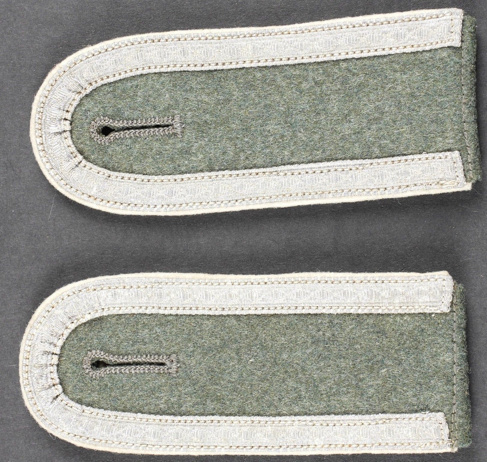 Infantry shoulder straps. Homogeneous pair in Feldgrau cloth with white infantry piping. Galon partially around the pieces. Rank of Unteroffizier. Some wear and patina to be noted. Condition II+. Infantry shoulder boards. Matching pair, Feldgrau wool with white infantry piping and silver Tresse partially encircling the edges. Rank of Unteroffizier. Some wear and patina. Condition II+.