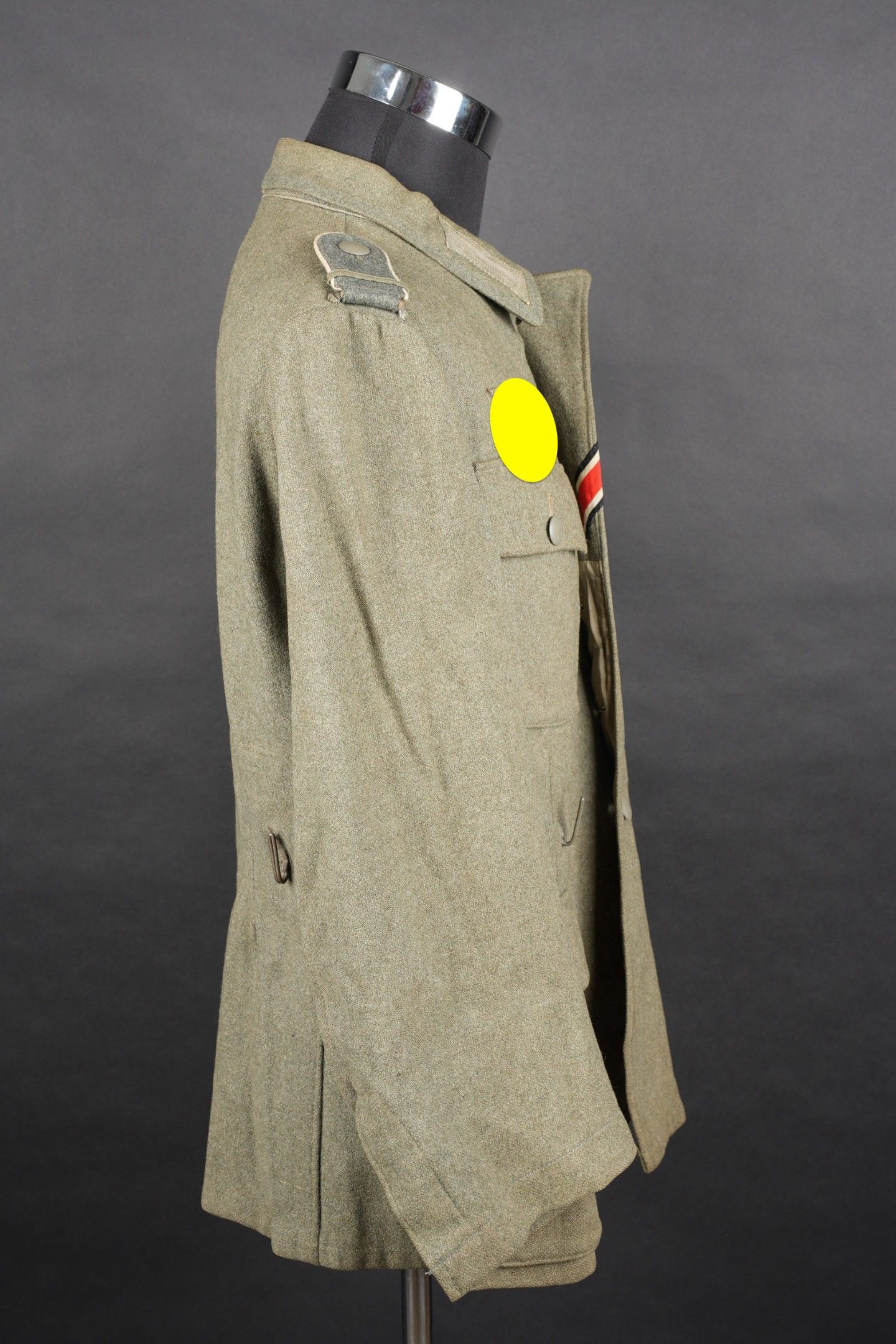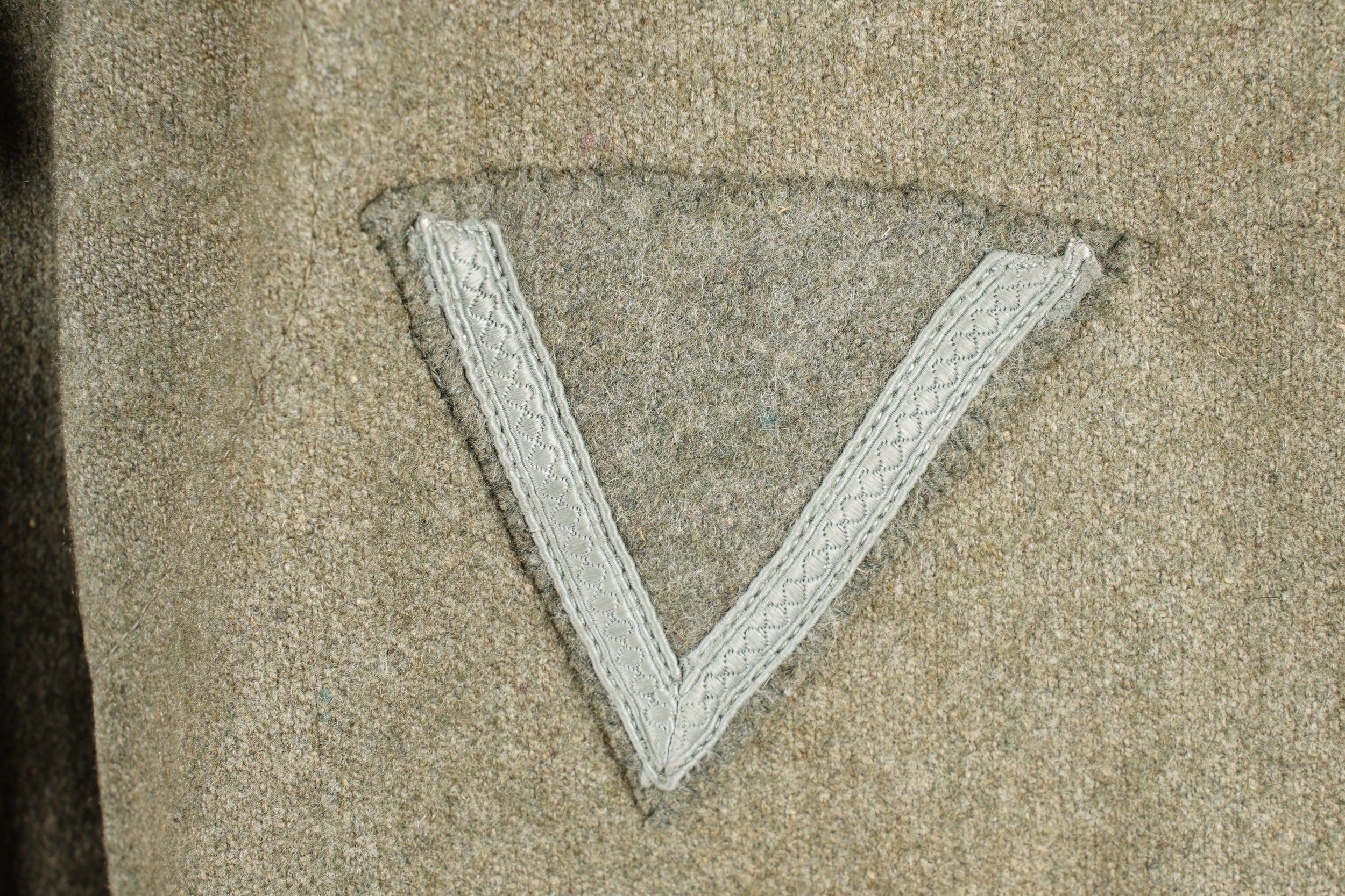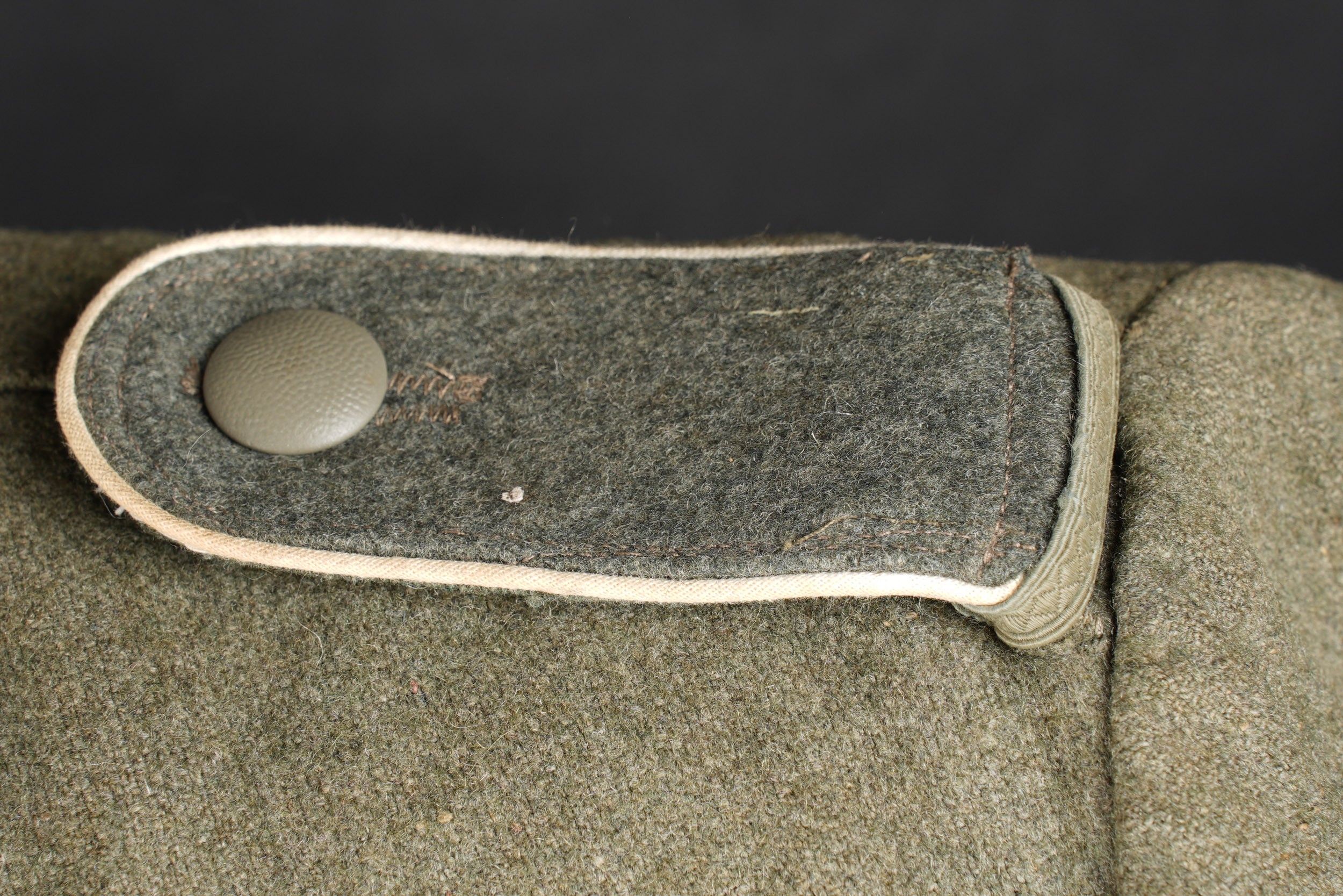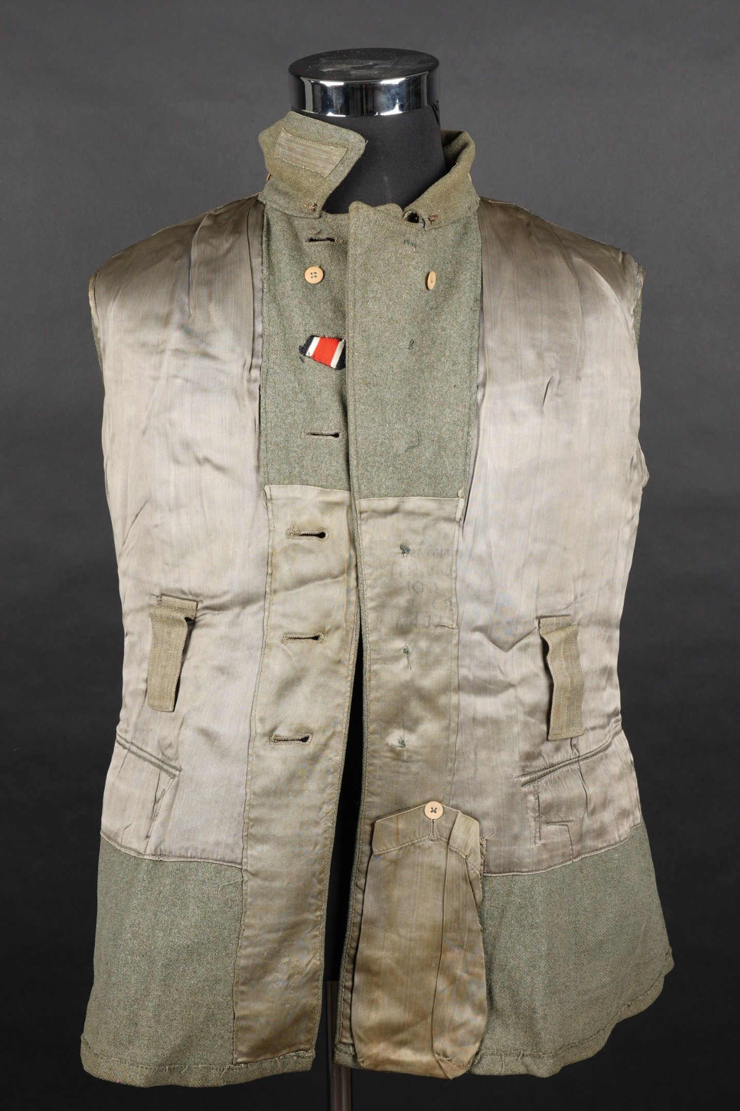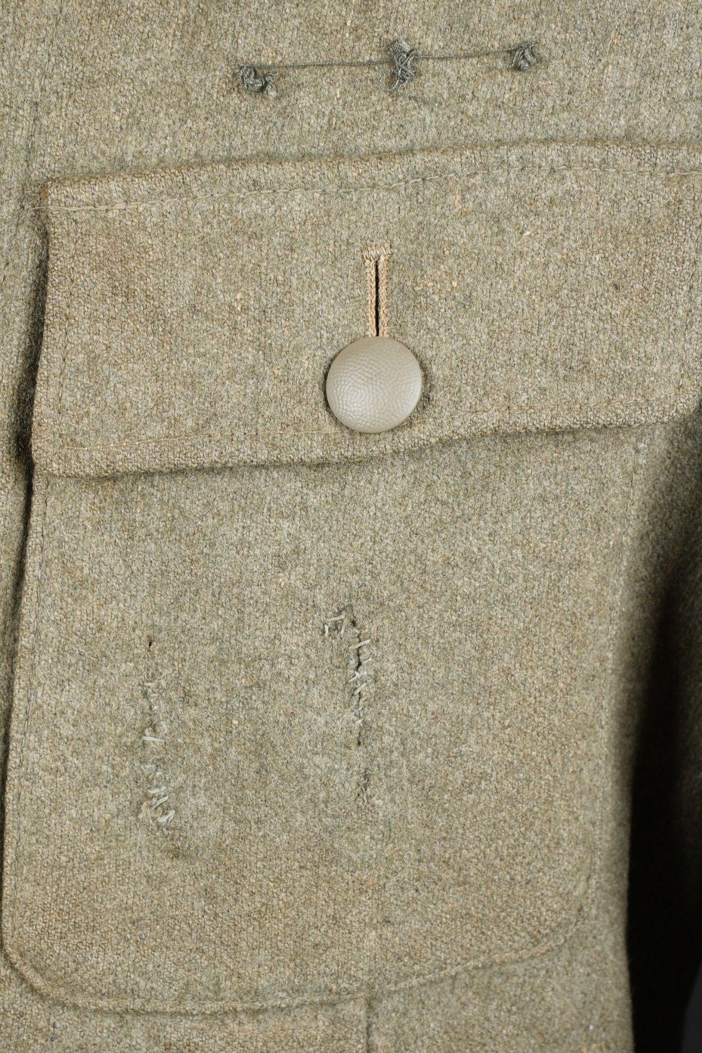 German infantry jacket. In Feldgrau cloth. All buttons are present and mostly in original colour. Machine-stitched chest eagle. Hand-sewn Iron Cross Second Class ribbon at buttonhole. Troop shoulder tabs, white infantry piping. Hand-sewn Gefreiter sleeve rank on the left sleeve. The belt hooks are present. Two repairs to the left breast pocket. Decorative flange above the same pocket, possibly a fastening for the Nahkampfspange. Grey sateen lining. The RBNr markings are illegible. Size markings 172 140 100 143 69 M43. Some wear and patina, as well as a few moth holes. Condition II+. German infantry tunic. Feldgrau wool. All buttons present, mostly original colour. Machine-sewn Bevo breast eagle. Hand-sewn Iron Cross 2nd Class ribbon in buttonhole. Infantry shoulder straps with white piping, Gefreiter sleeve rank chevron on left arm. Belt hook supports intact. Two repairs to the left breast pocket. Ribbon loop above this pocket suggests prior wear of the Close Combat Clasp. Gray satinette lining. RBNr illegible. Size stamps 172 140 100 143 69 M43. Some wear, patina, and moth damage. Condition II+.