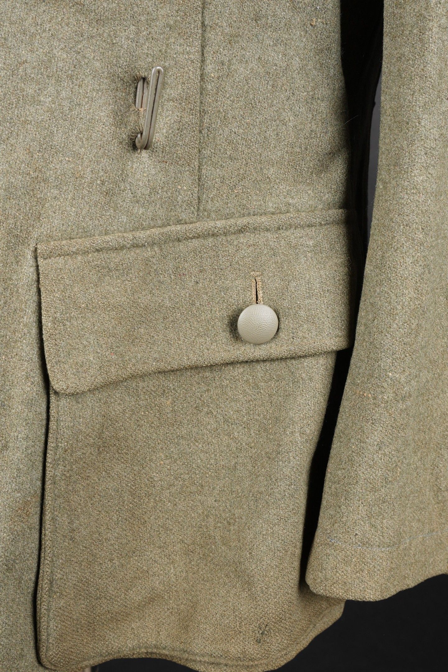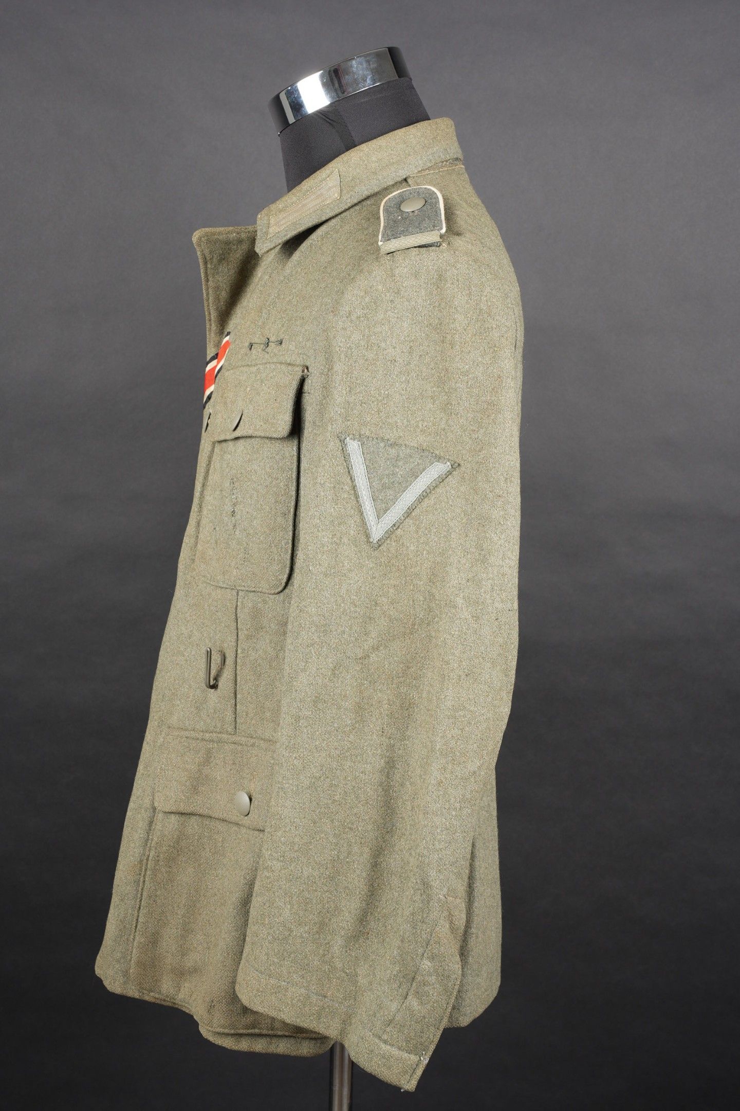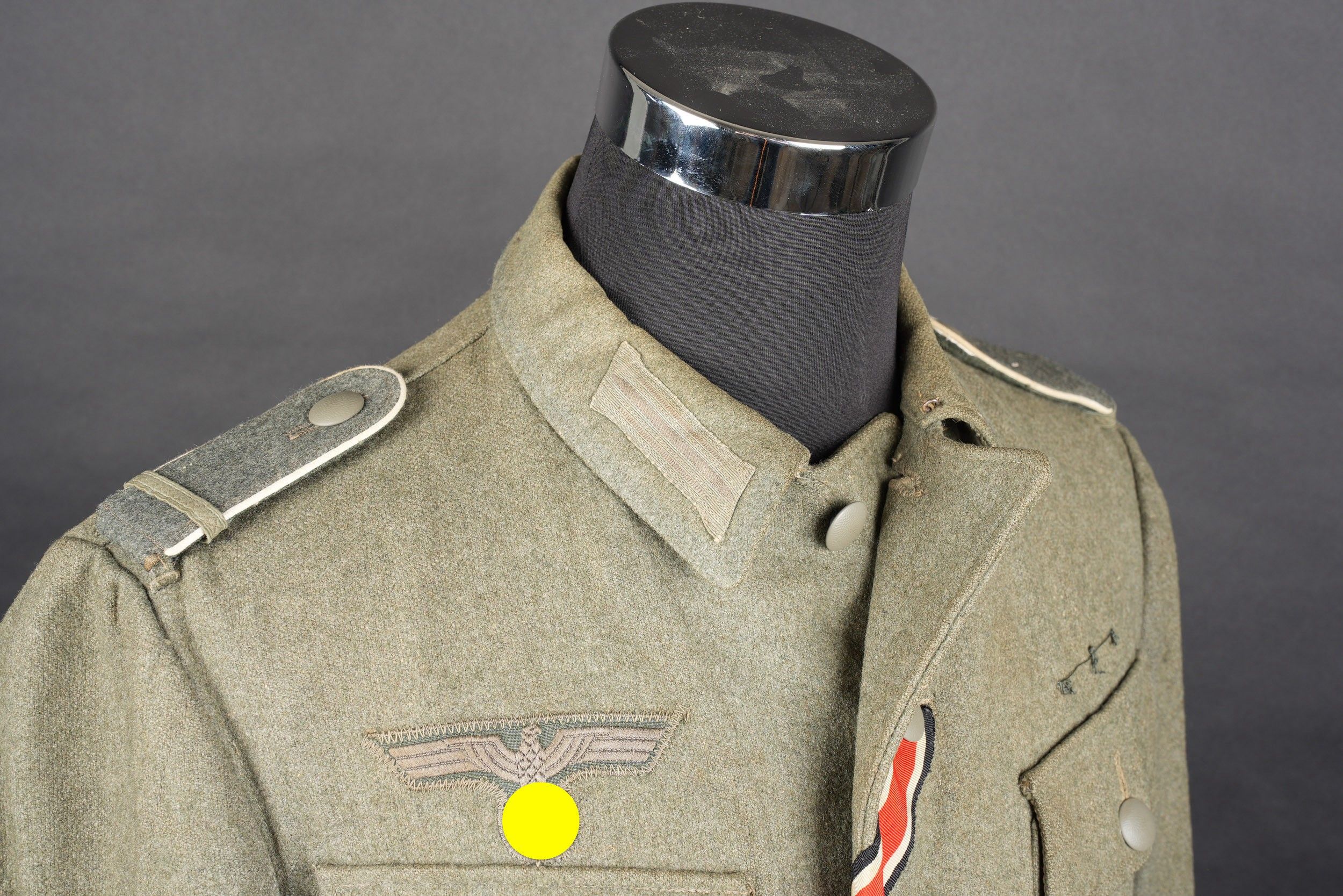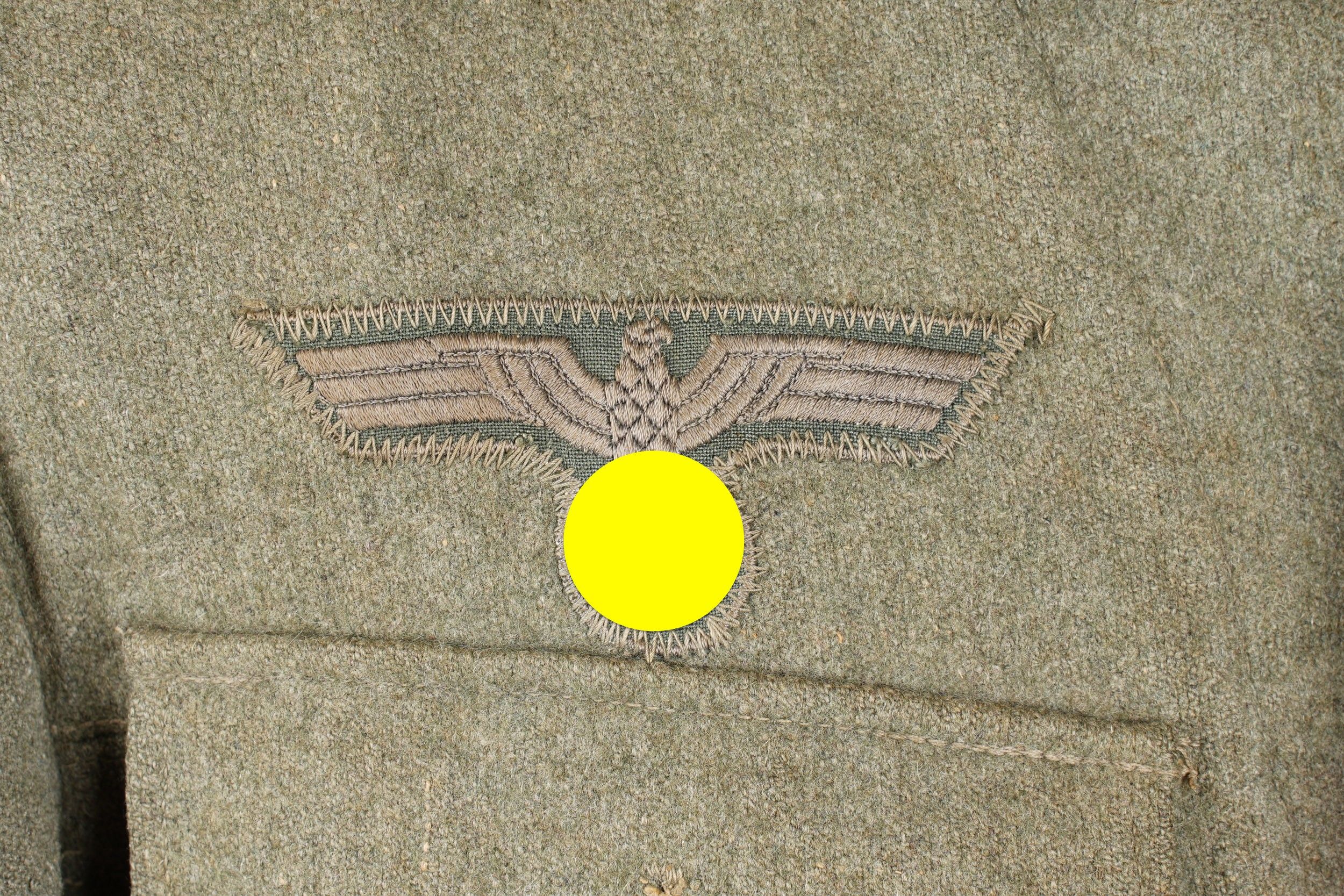 German infantry jacket. In Feldgrau cloth. All buttons are present and mostly in original colour. Machine-stitched chest eagle. Hand-sewn Iron Cross Second Class ribbon at buttonhole. Troop shoulder tabs, white infantry piping. Hand-sewn Gefreiter sleeve rank on the left sleeve. The belt hooks are present. Two repairs to the left breast pocket. Decorative flange above the same pocket, possibly a fastening for the Nahkampfspange. Grey sateen lining. The RBNr markings are illegible. Size markings 172 140 100 143 69 M43. Some wear and patina, as well as a few moth holes. Condition II+. German infantry tunic. Feldgrau wool. All buttons present, mostly original colour. Machine-sewn Bevo breast eagle. Hand-sewn Iron Cross 2nd Class ribbon in buttonhole. Infantry shoulder straps with white piping, Gefreiter sleeve rank chevron on left arm. Belt hook supports intact. Two repairs to the left breast pocket. Ribbon loop above this pocket suggests prior wear of the Close Combat Clasp. Gray satinette lining. RBNr illegible. Size stamps 172 140 100 143 69 M43. Some wear, patina, and moth damage. Condition II+.
