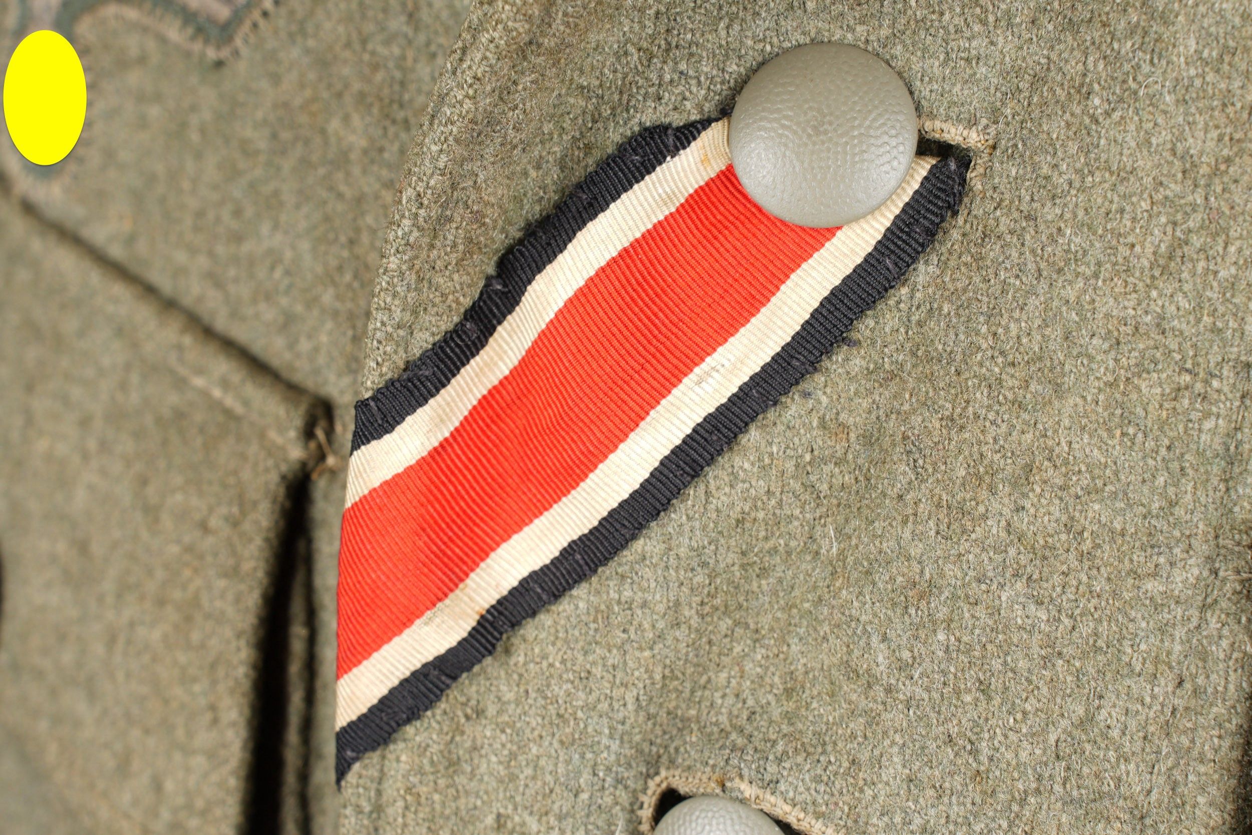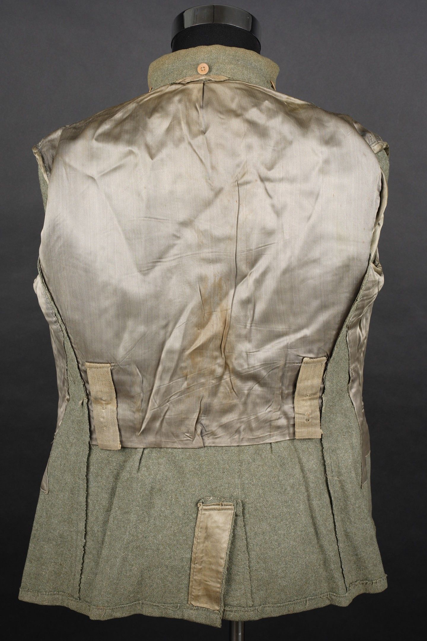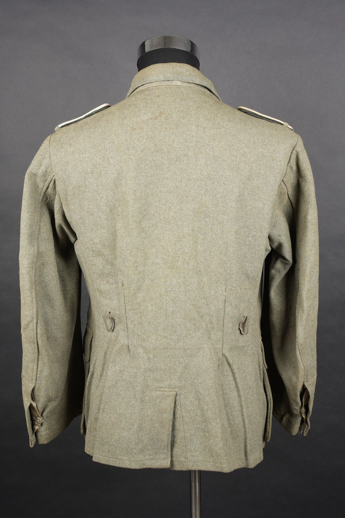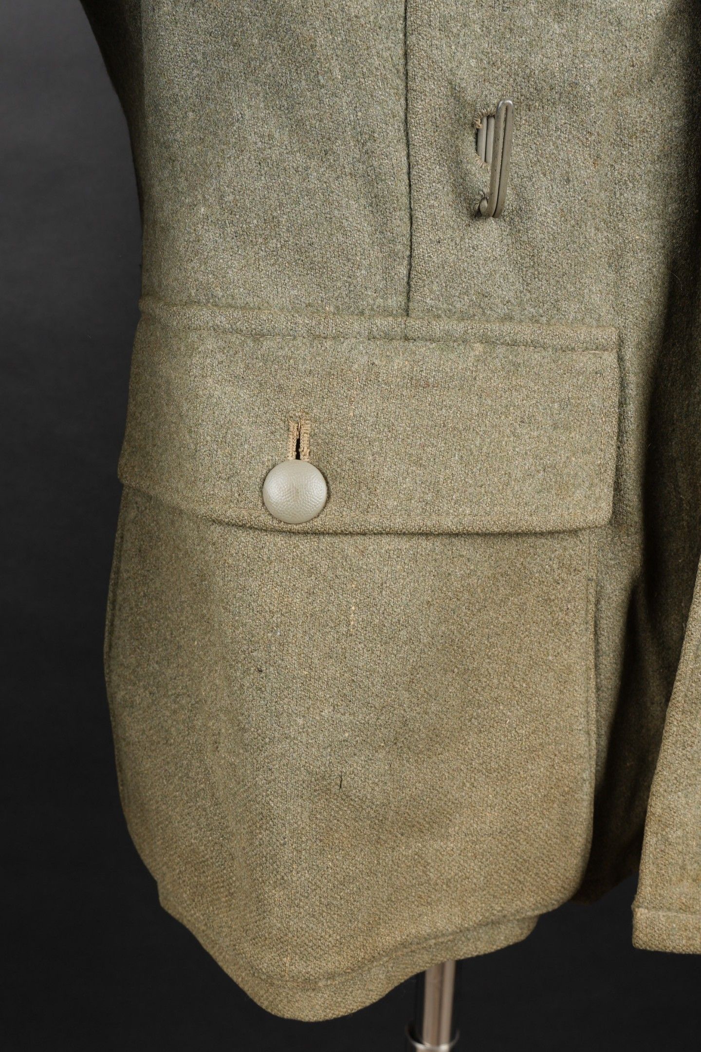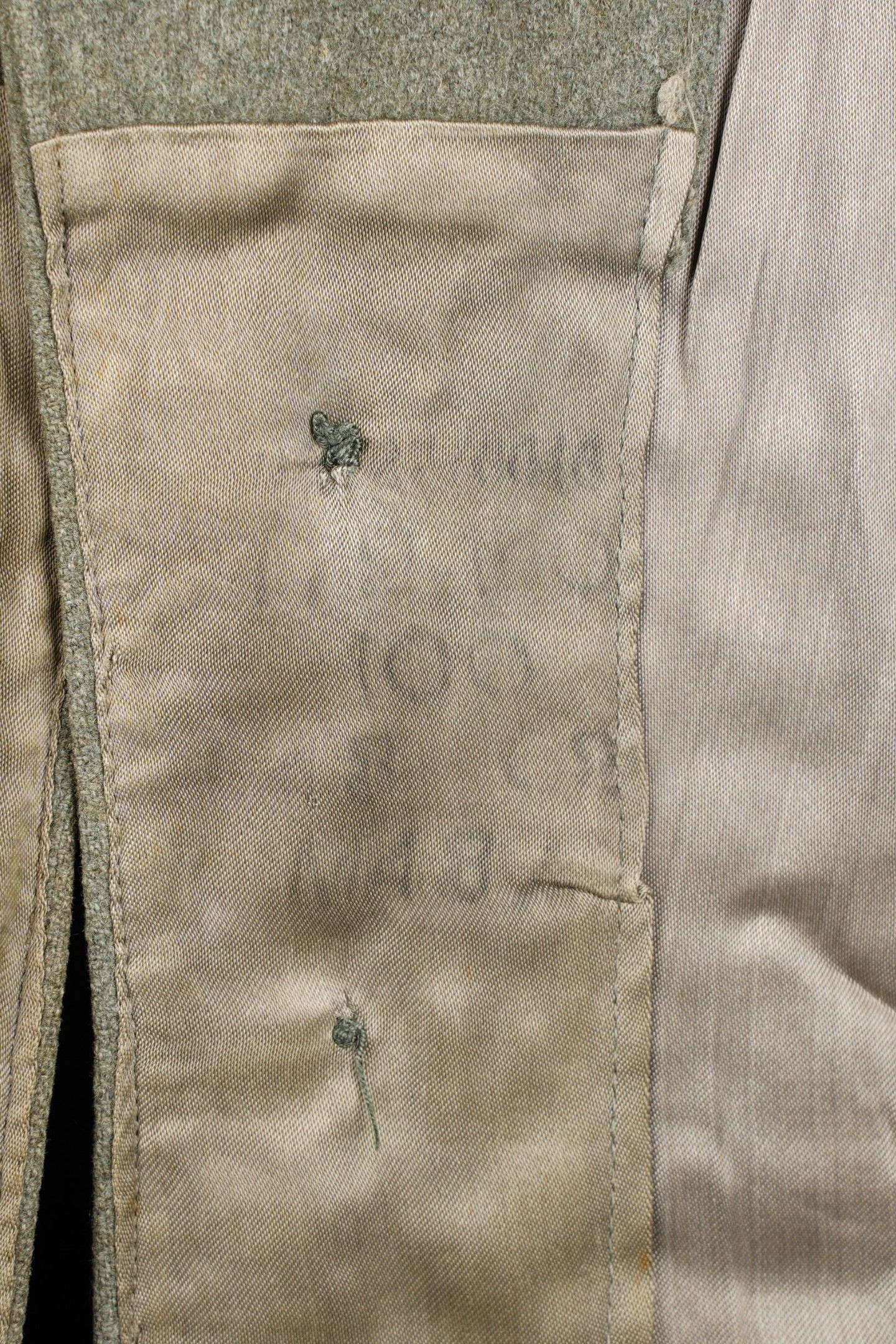 German infantry jacket. In Feldgrau cloth. All buttons are present and mostly in original colour. Machine-stitched chest eagle. Hand-sewn Iron Cross Second Class ribbon at buttonhole. Troop shoulder tabs, white infantry piping. Hand-sewn Gefreiter sleeve rank on the left sleeve. The belt hooks are present. Two repairs to the left breast pocket. Decorative flange above the same pocket, possibly a fastening for the Nahkampfspange. Grey sateen lining. The RBNr markings are illegible. Size markings 172 140 100 143 69 M43. Some wear and patina, as well as a few moth holes. Condition II+. German infantry tunic. Feldgrau wool. All buttons present, mostly original colour. Machine-sewn Bevo breast eagle. Hand-sewn Iron Cross 2nd Class ribbon in buttonhole. Infantry shoulder straps with white piping, Gefreiter sleeve rank chevron on left arm. Belt hook supports intact. Two repairs to the left breast pocket. Ribbon loop above this pocket suggests prior wear of the Close Combat Clasp. Gray satinette lining. RBNr illegible. Size stamps 172 140 100 143 69 M43. Some wear, patina, and moth damage. Condition II+.
