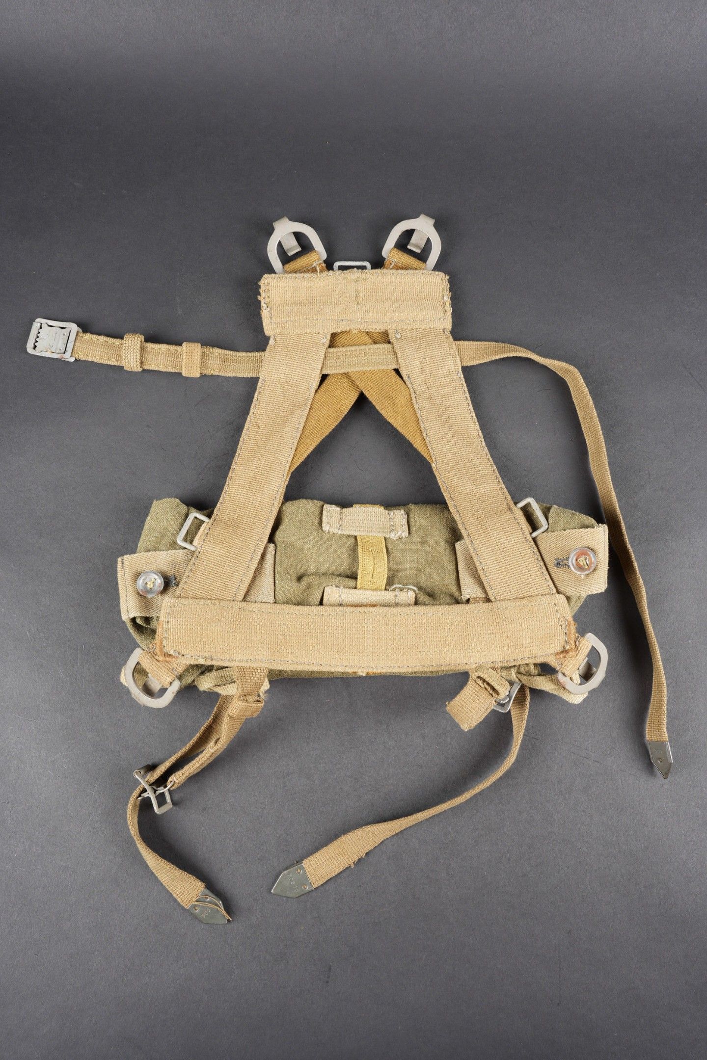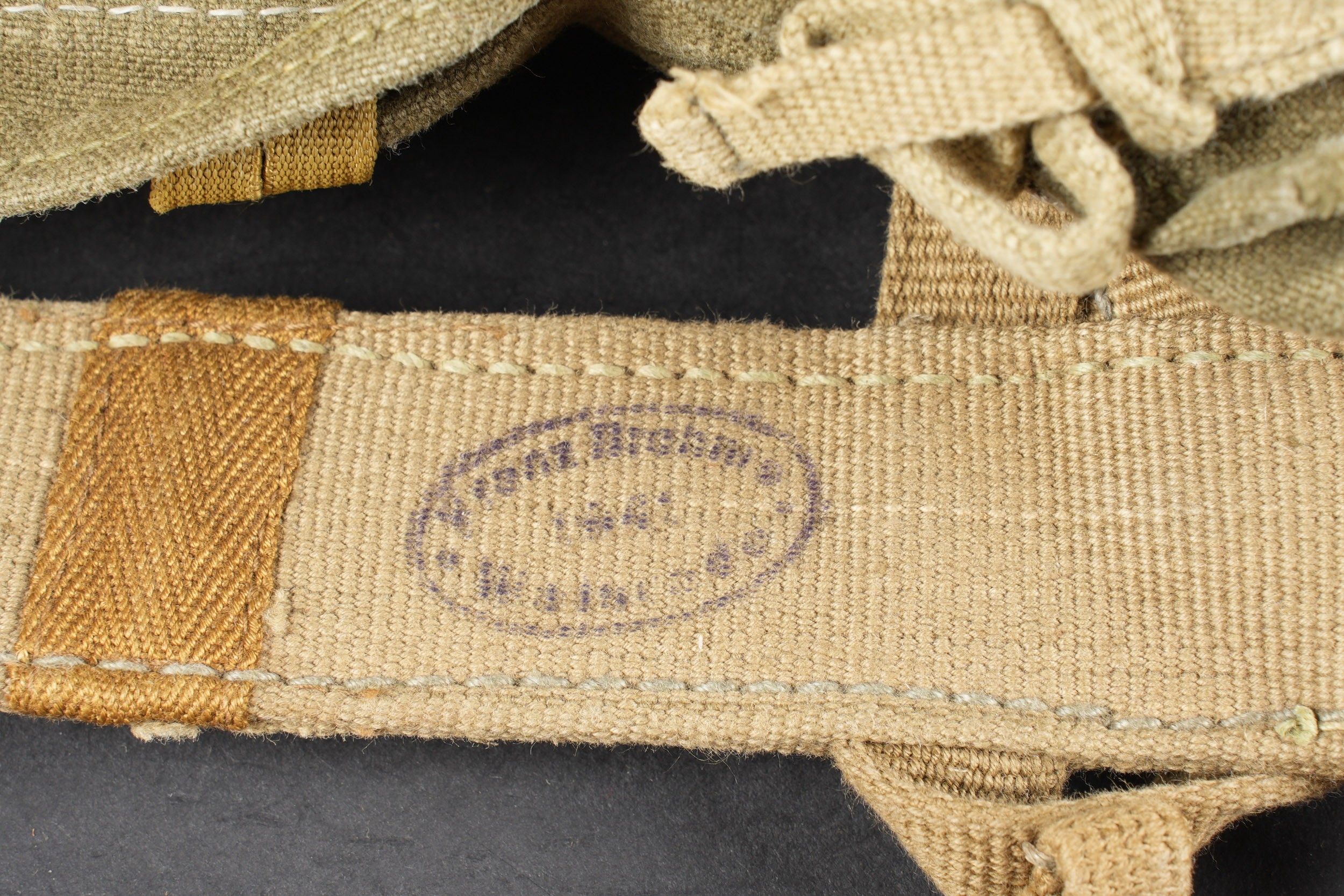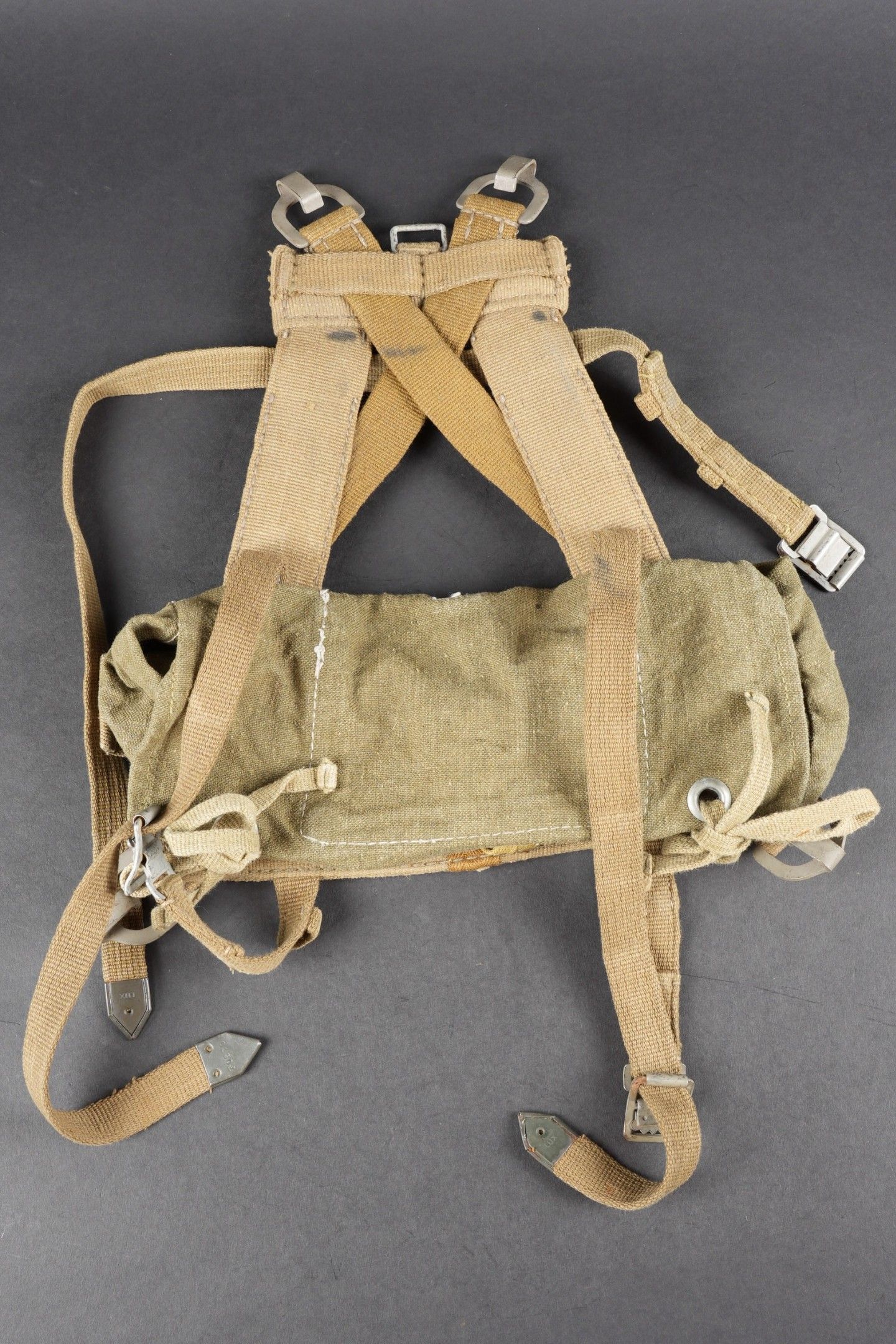 Sturmgepack. Made of strong sandy yellow canvas. All straps are present. Metal parts are complete and 90% original colour. Manufacturer's stamp illegible, dated 1941. All metal strap reinforcements are marked LUX. Attached is a sturmgepack in heavy Feldgrau canvas, all straps present. No visible manufacturer's markings. Slight wear and patina. Condition I-. Sturmgepäck. Heavy sand-colored canvas. All straps complete. Metal fittings 90% original finish. Maker stamp faint, dated 1941. All strap reinforcements marked LUX. Includes one Feldgrau canvas assault pack pouch, complete with straps, no visible maker marks. Light wear and patina. Condition I-.