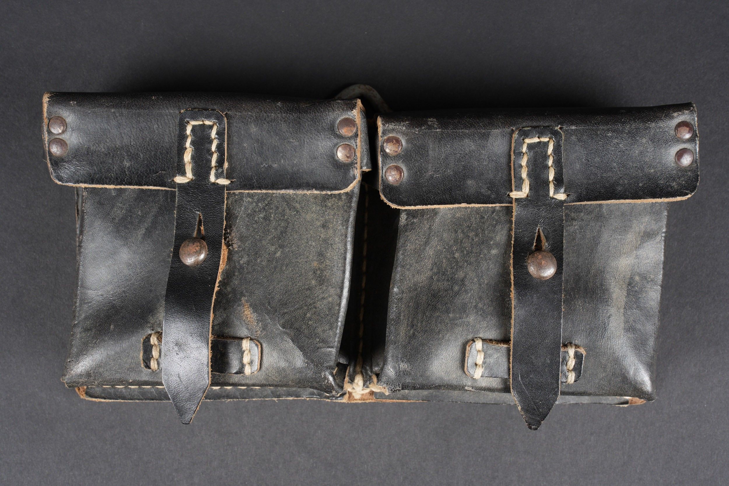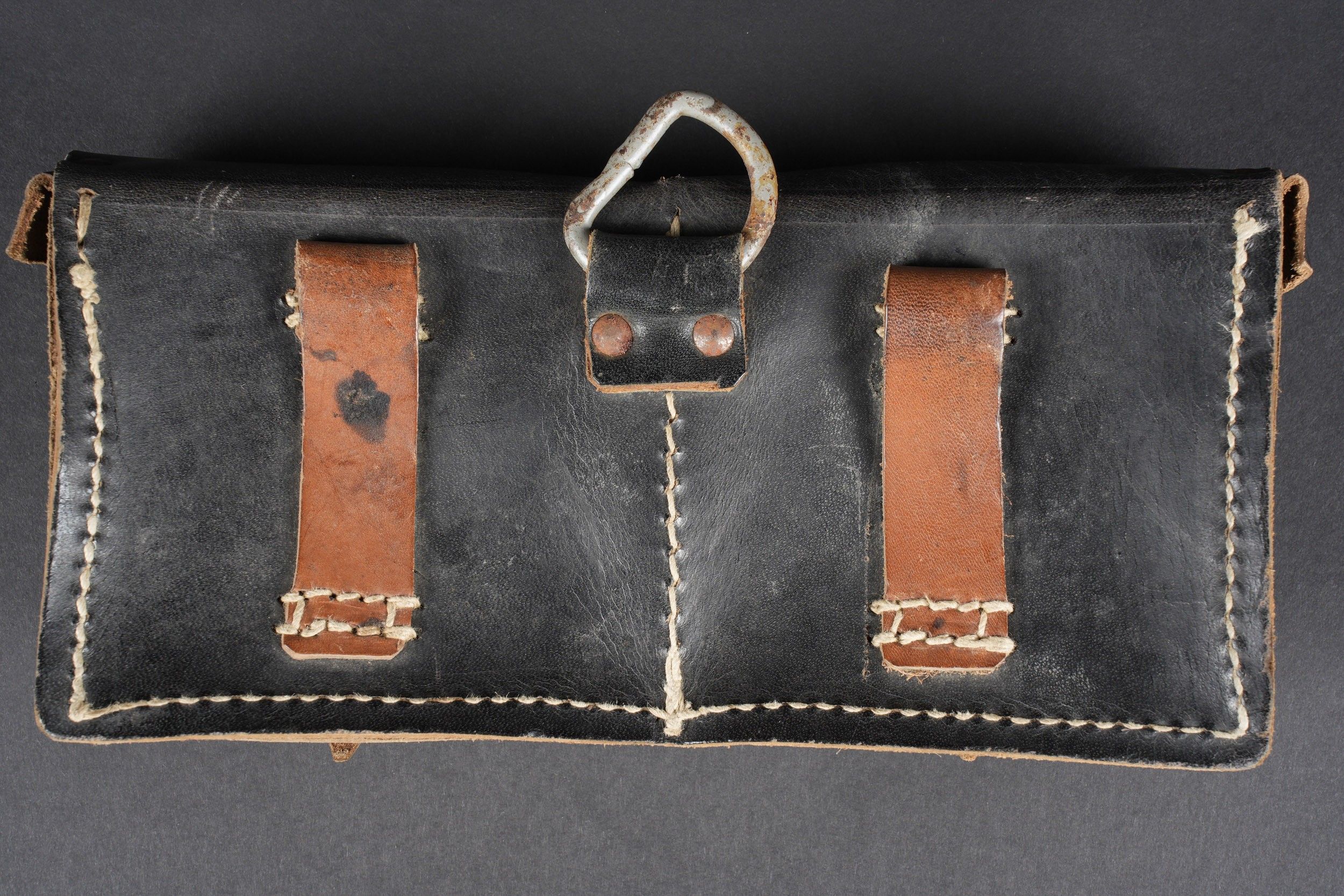 G43 magazine holder. Black leather pouch, all fastening straps complete. Rear loops in brown leather. Metal ring in 80% original colour. No visible markings. Some wear and patina. Condition II+. G43 magazine pouch. Black leather with all closing straps intact. Rear belt loops in brown leather. Metal ring retains 80% of original finish. No visible markings. Some wear and patina. Condition II+.