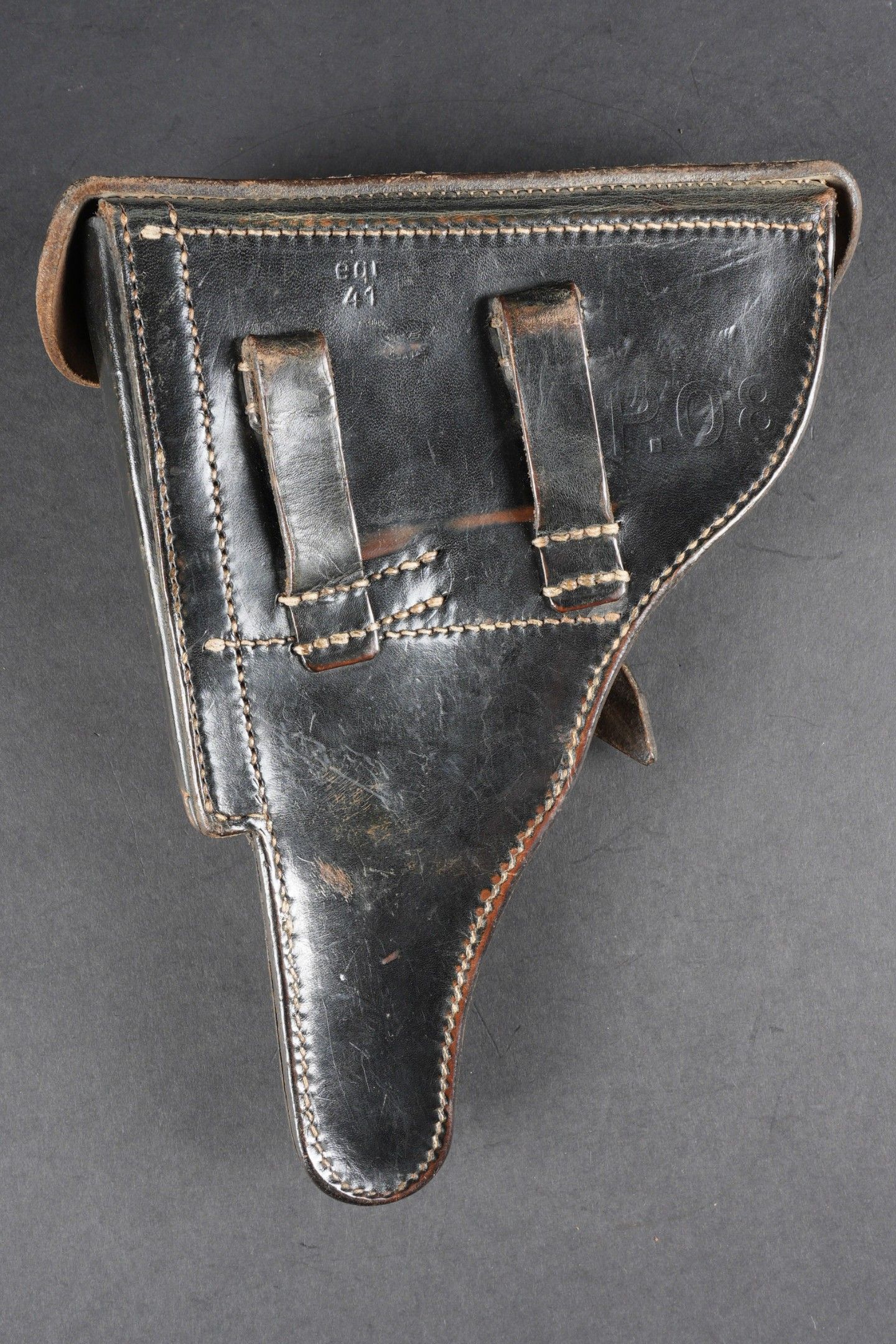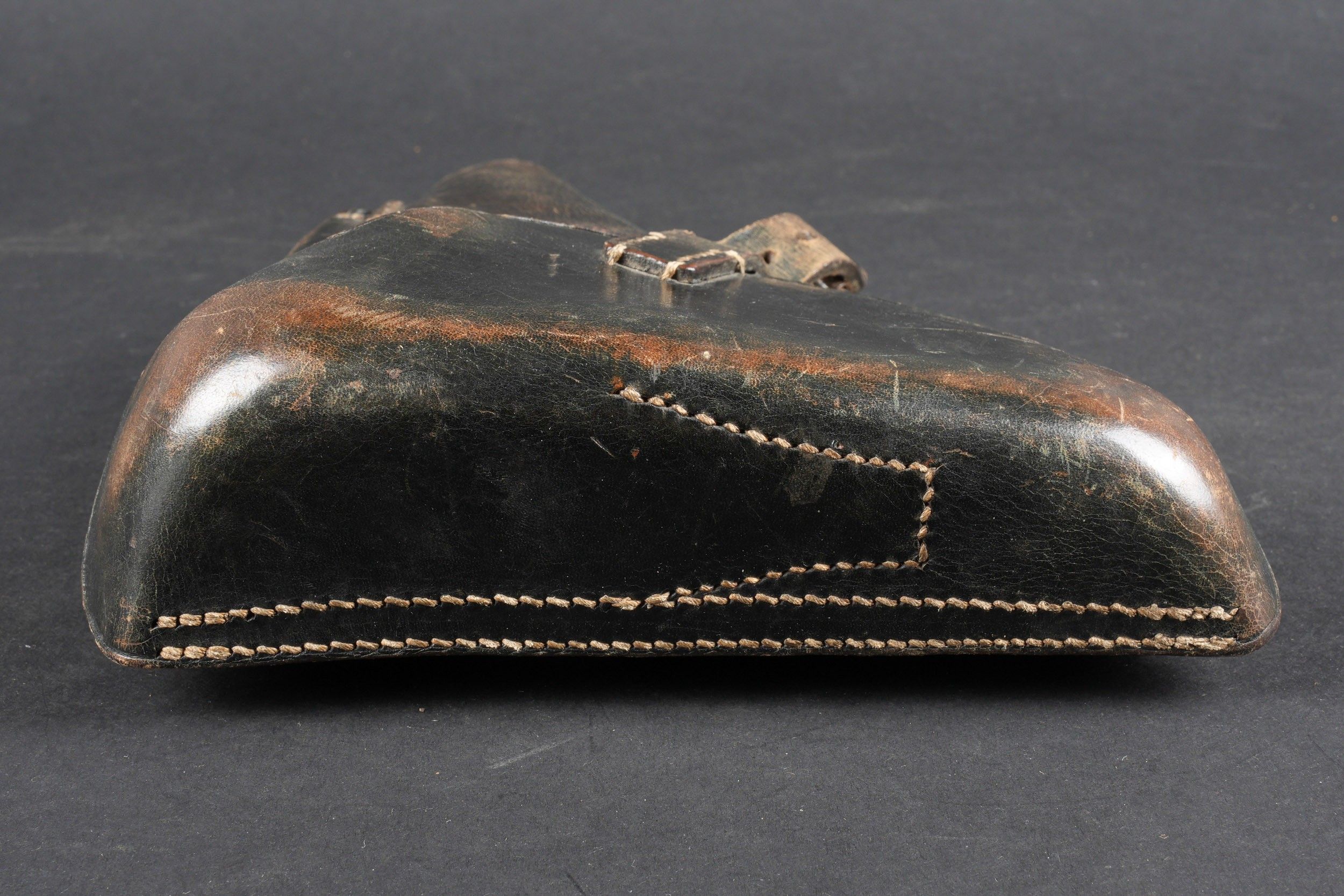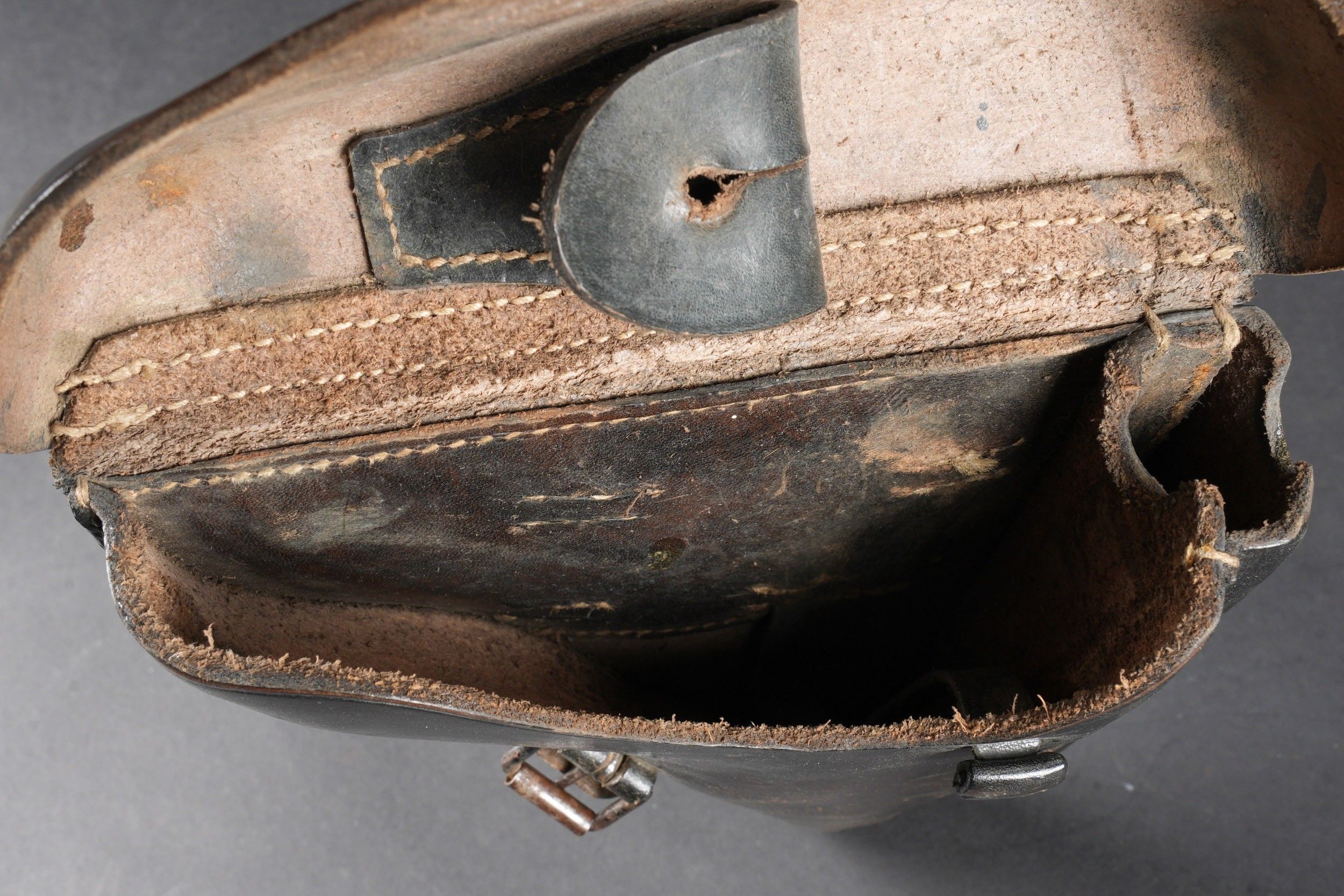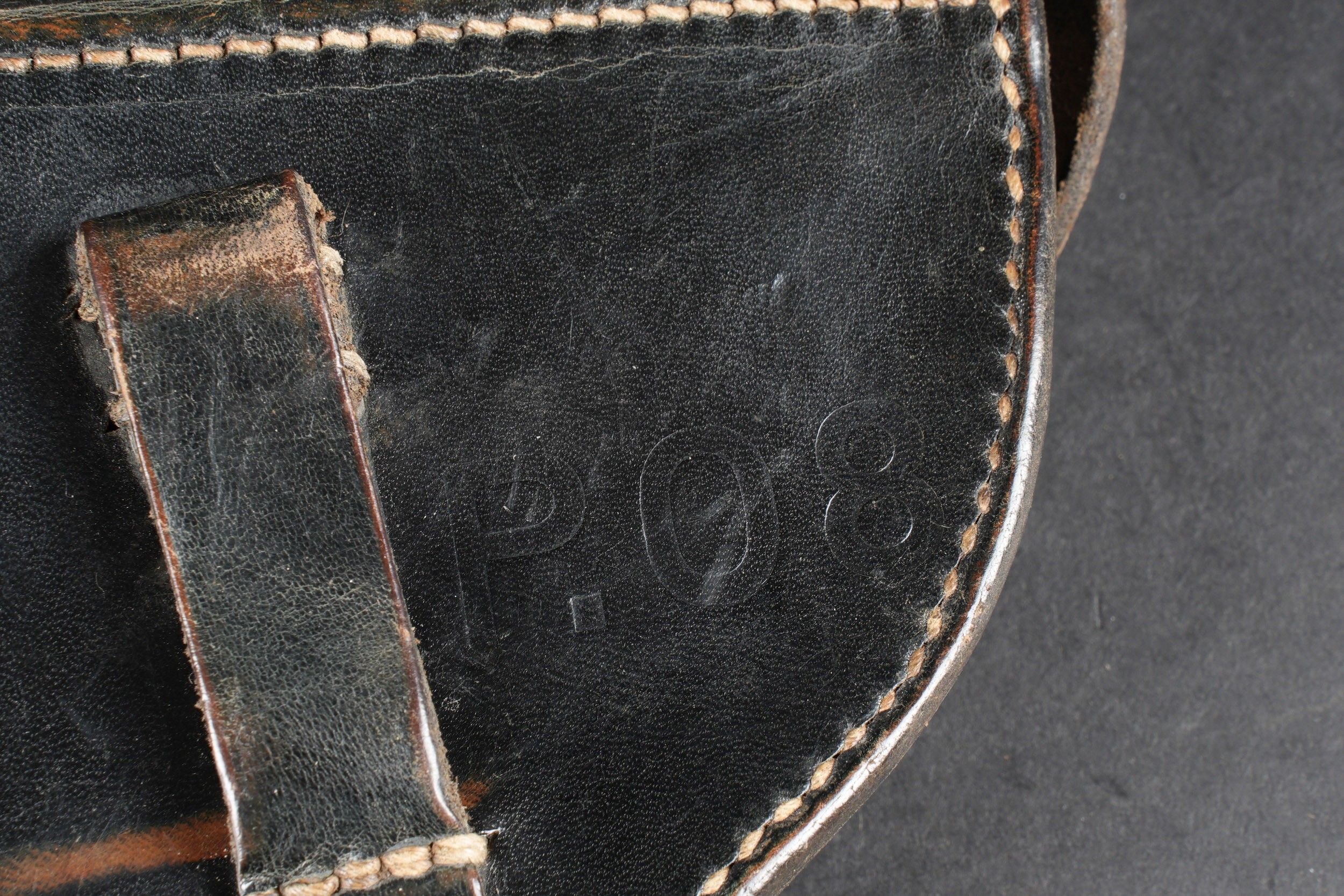 P08 pistol holster. In thick black leather. Functional closure strap. The loops on the back are complete. Made by EQR 41. Remains of P08 marking. The key is missing. Some wear and patina. Condition II+. P08 pistol holster. Thick black leather. Closure strap functional, rear belt loops complete. Maker-marked EQR 41, partial P08 stamp visible. Disassembly tool missing. Some wear and patina. Condition II+.