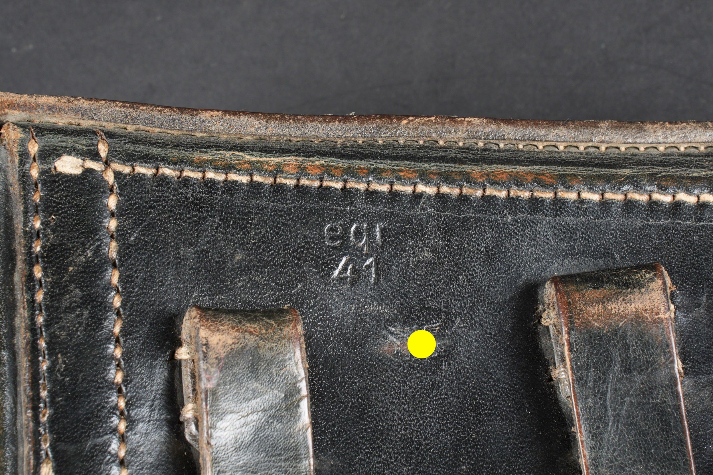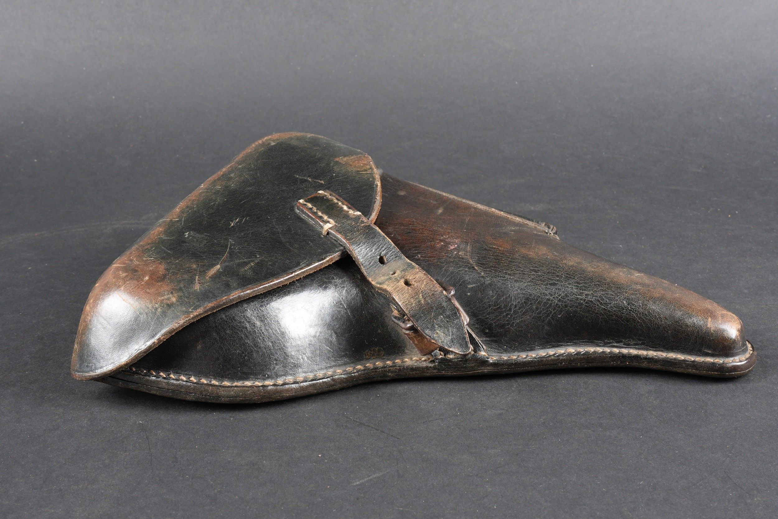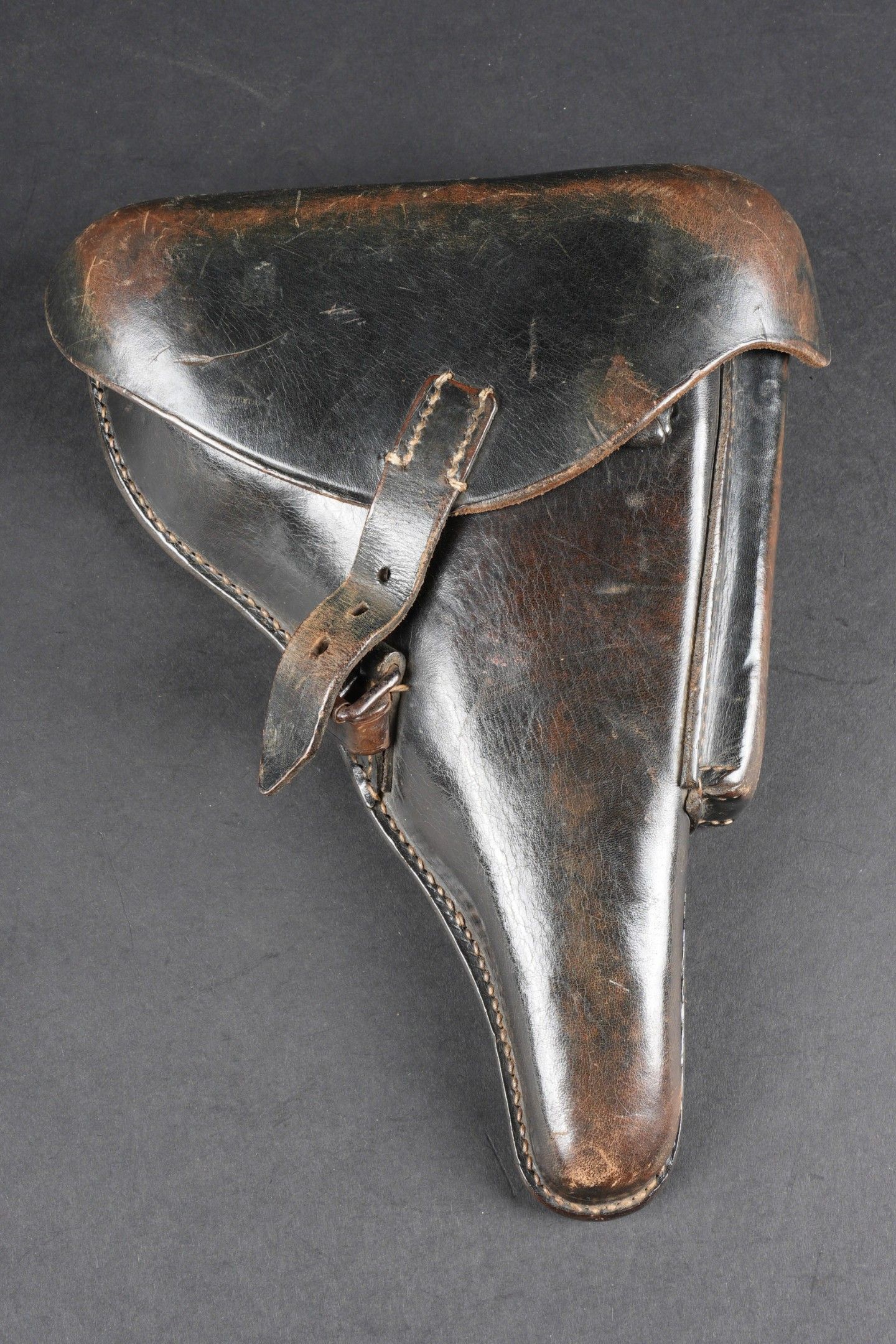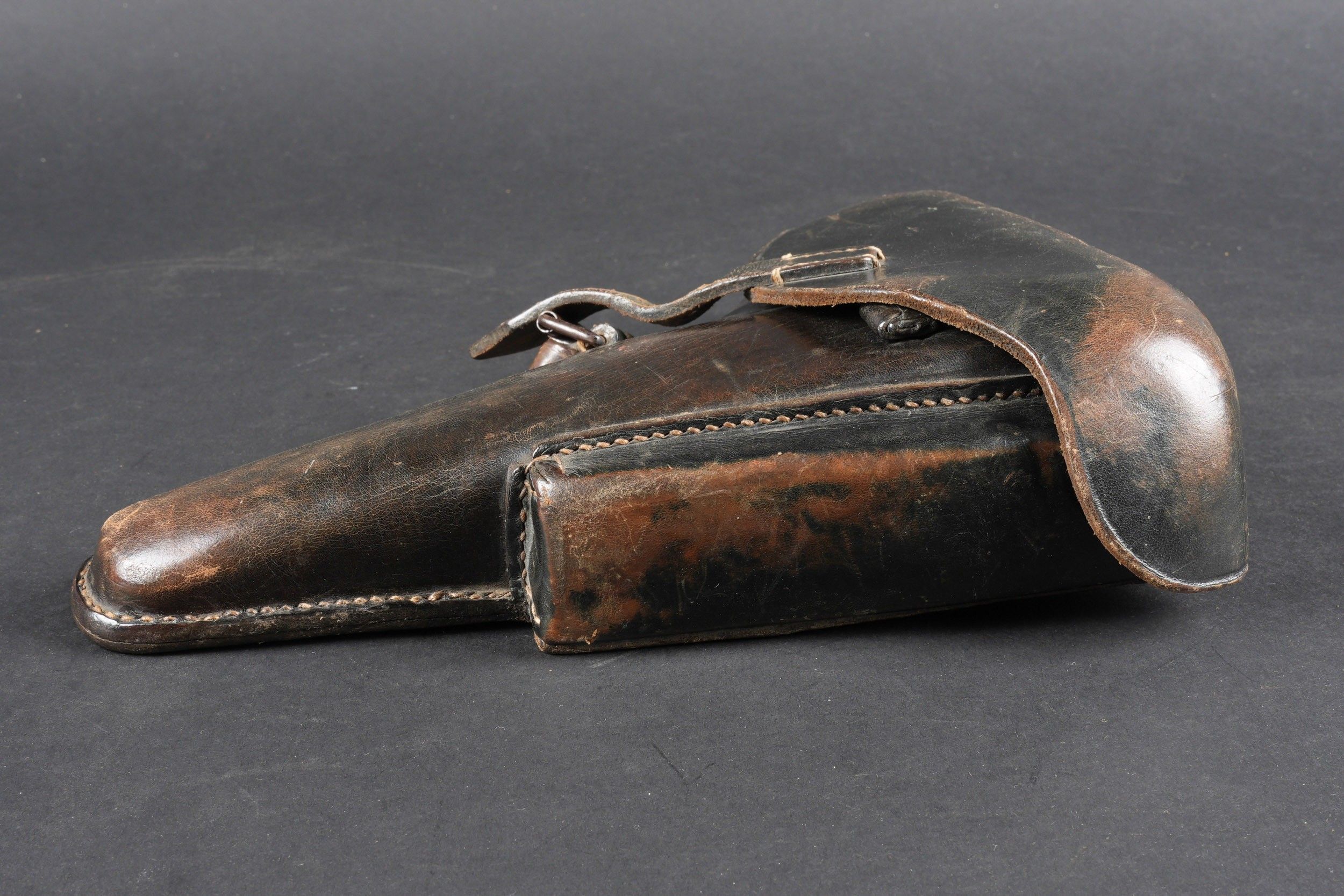 P08 pistol holster. In thick black leather. Functional closure strap. The loops on the back are complete. Made by EQR 41. Remains of P08 marking. The key is missing. Some wear and patina. Condition II+. P08 pistol holster. Thick black leather. Closure strap functional, rear belt loops complete. Maker-marked EQR 41, partial P08 stamp visible. Disassembly tool missing. Some wear and patina. Condition II+.