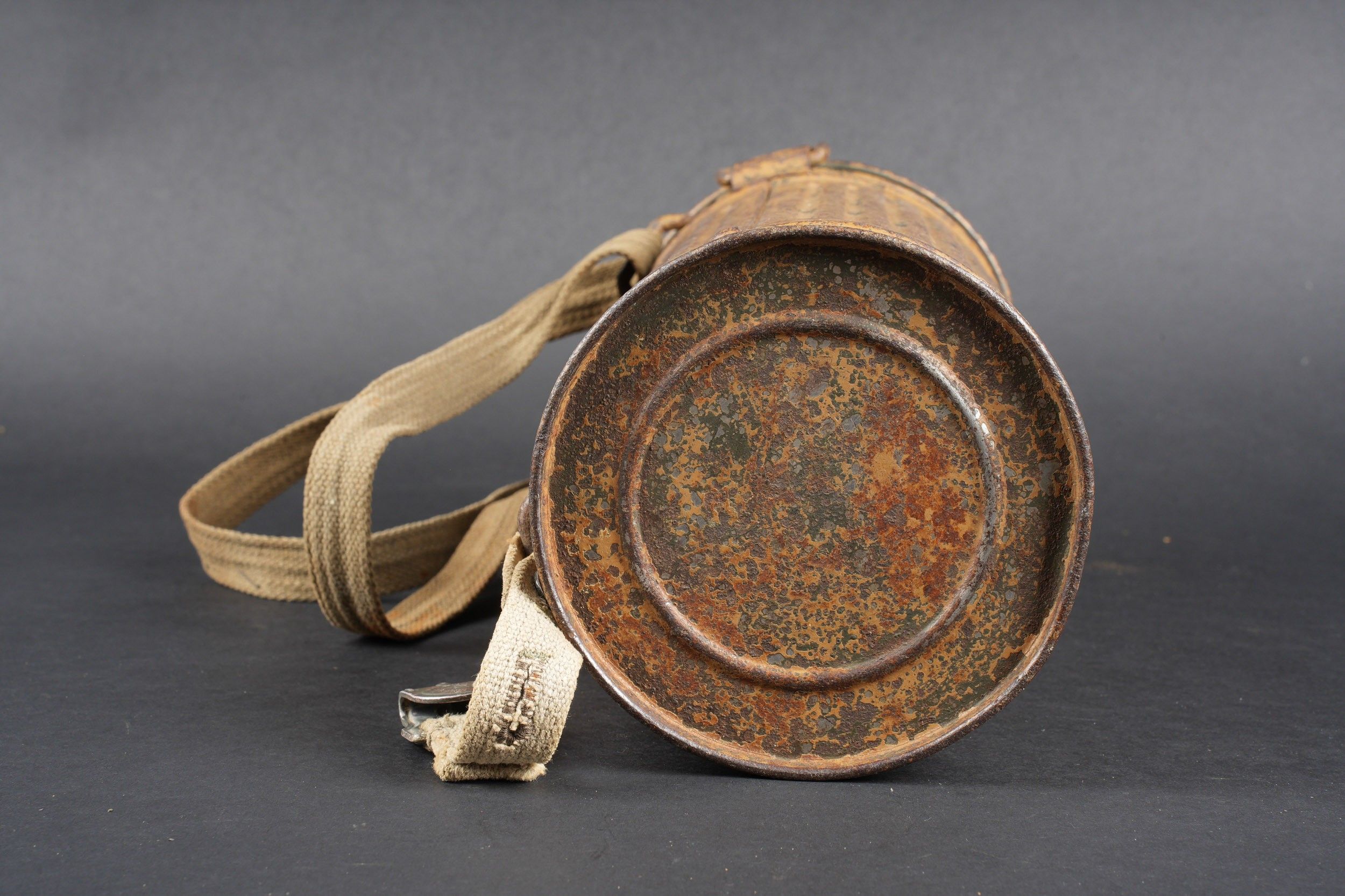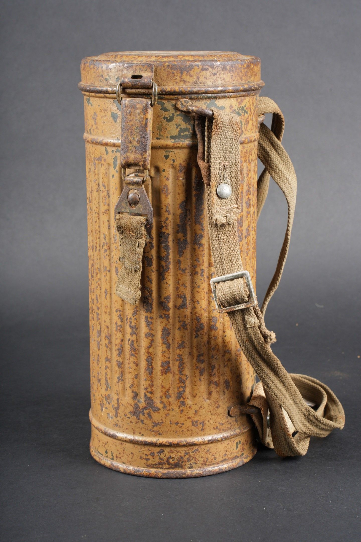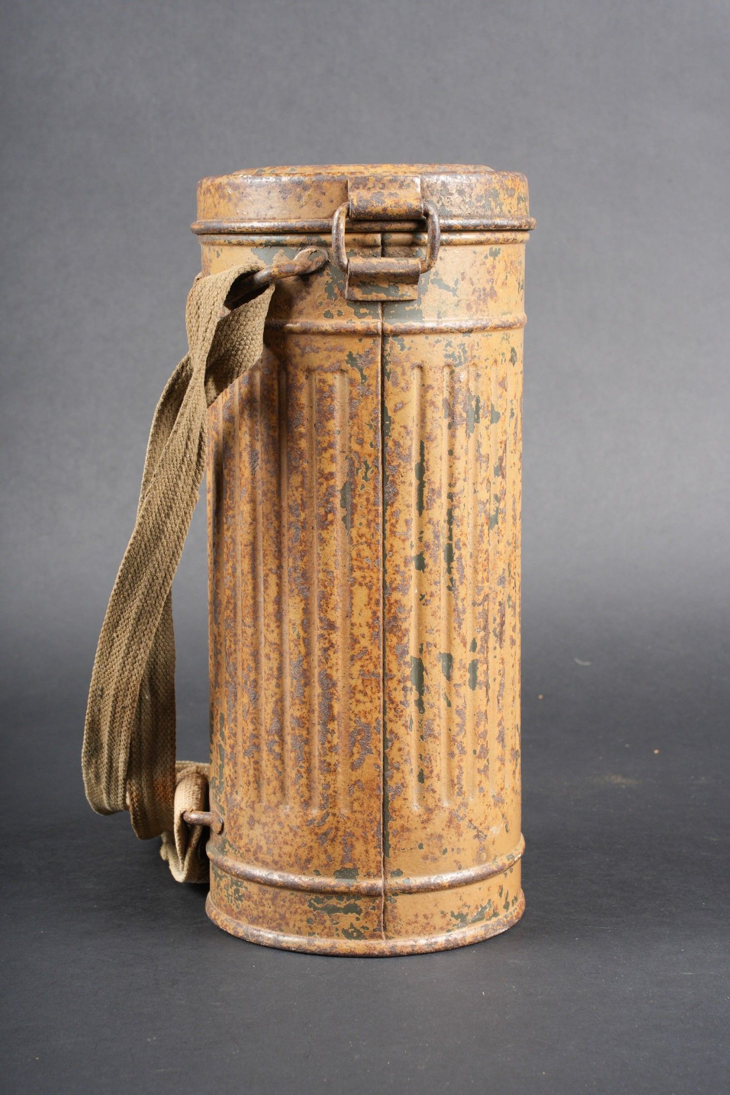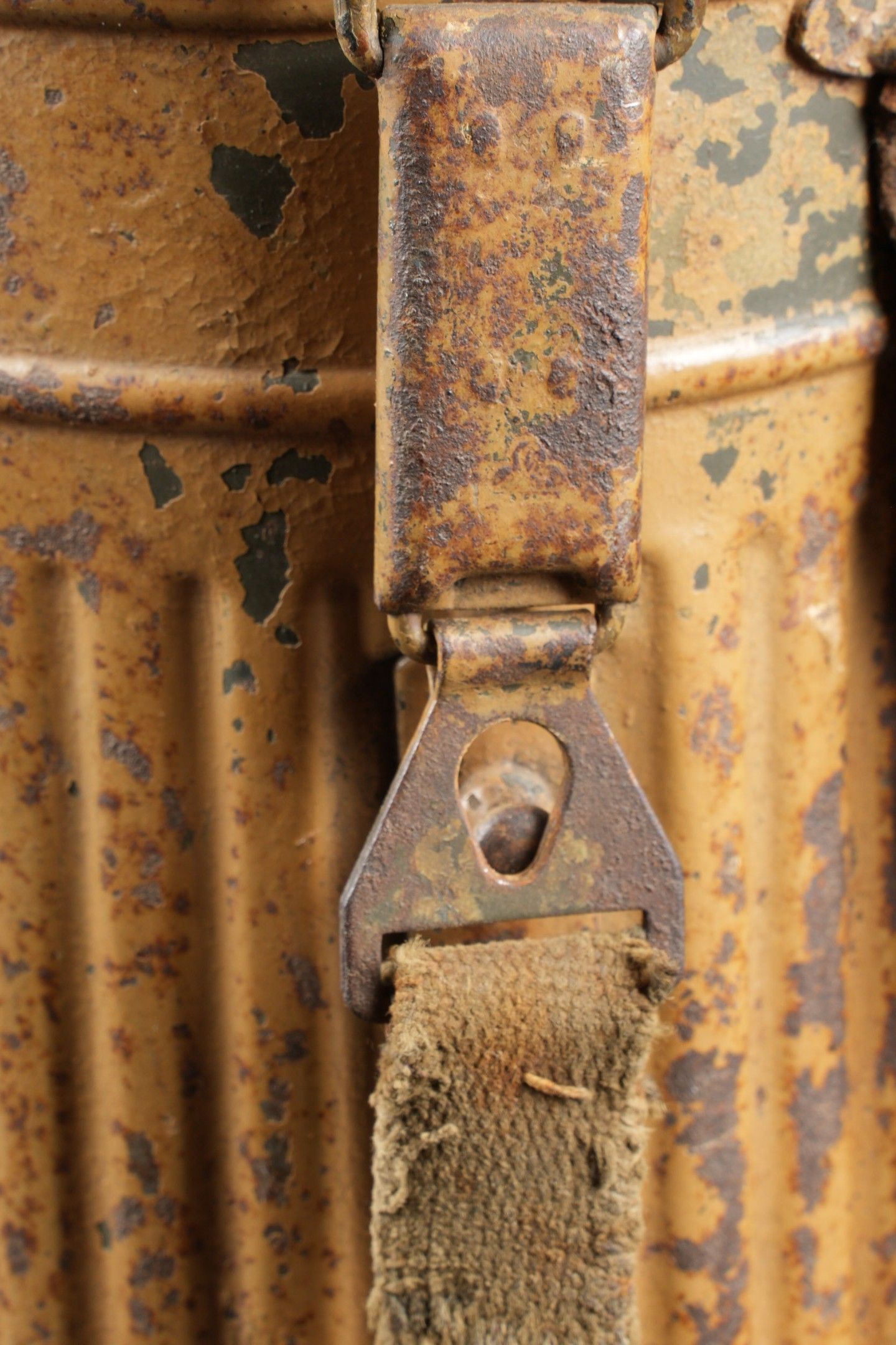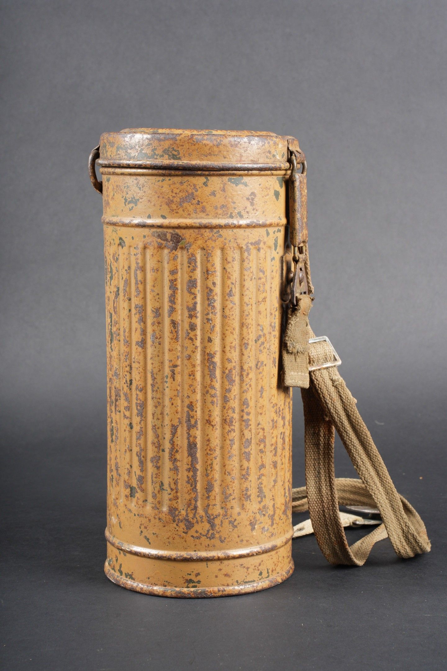 Camouflaged anti-gas mask. Long metal case. 70% camouflaged light green or sand paint. All straps are present, but different models. A few spots of blue paint are visible throughout. The spare lens case is missing. Rag and spider present. Canvas mask, size 2, number 227, painted black at the base of the mask. All straps are present. Filter complete, but with traces of oxidation and perforations, dated 1942. Some wear and patina. The zip is loose. Condition II+. Camouflaged German gas mask. Long metal canister with light greensand camouflage paint at 70%. All straps present but mismatched types. Blue paint spots scattered overall. Spare-lens compartment missing. Cloth and spider web present. Canvas mask, size 2, marked 227 in black paint at base. All straps intact. Filter complete but showing rust, oxidation, and perforations, dated 1942. Pull strap detached. Some wear and patina. Condition II+.