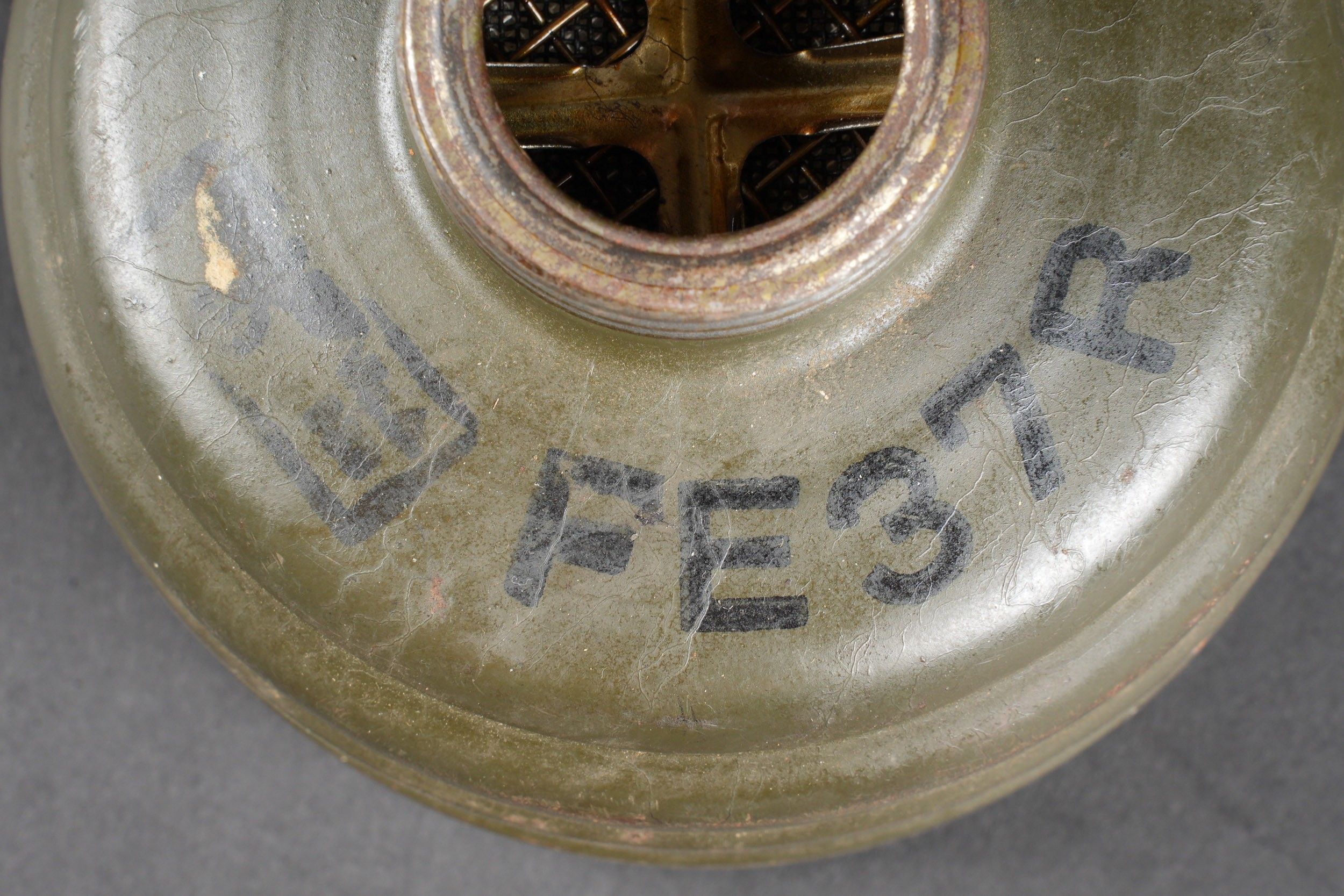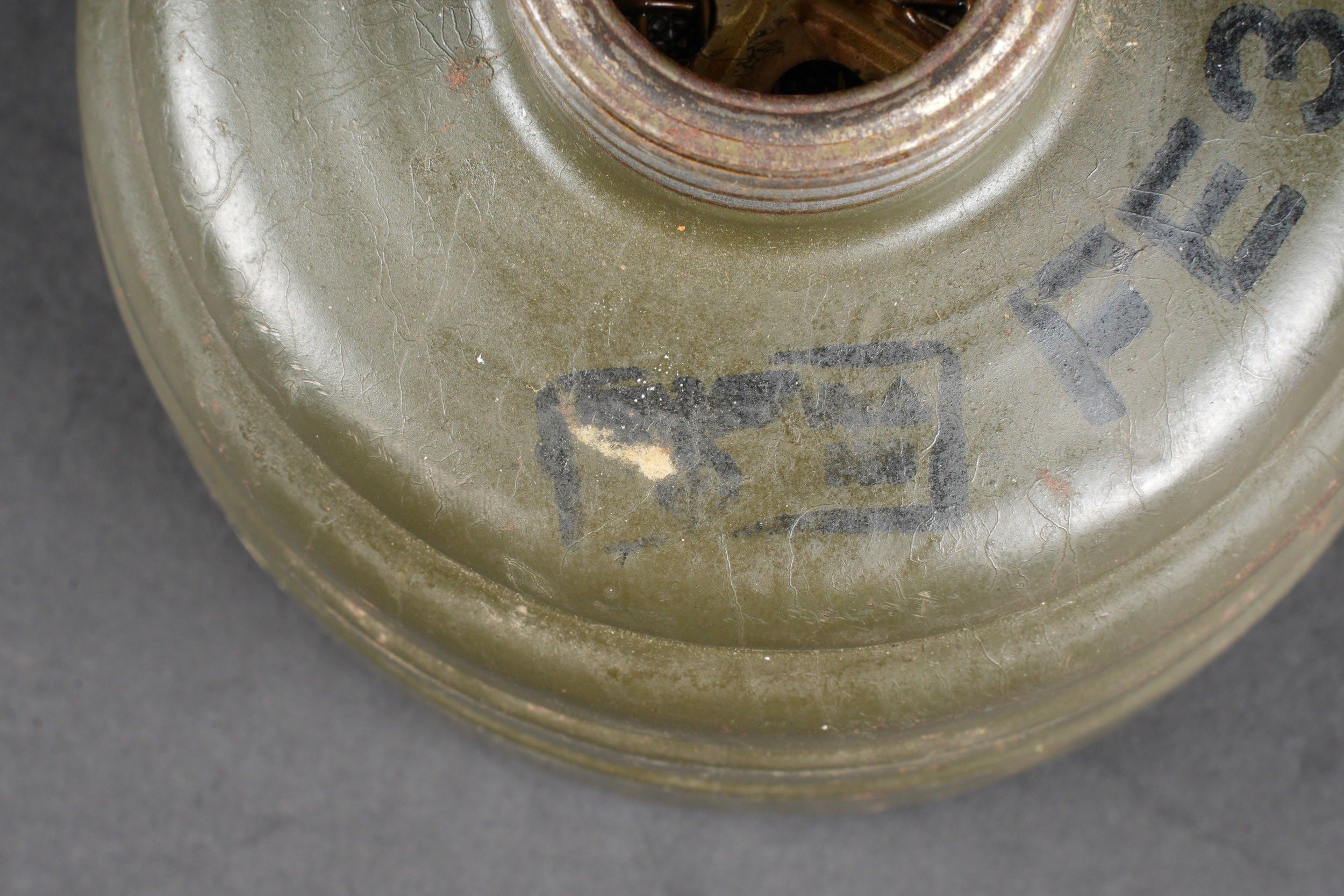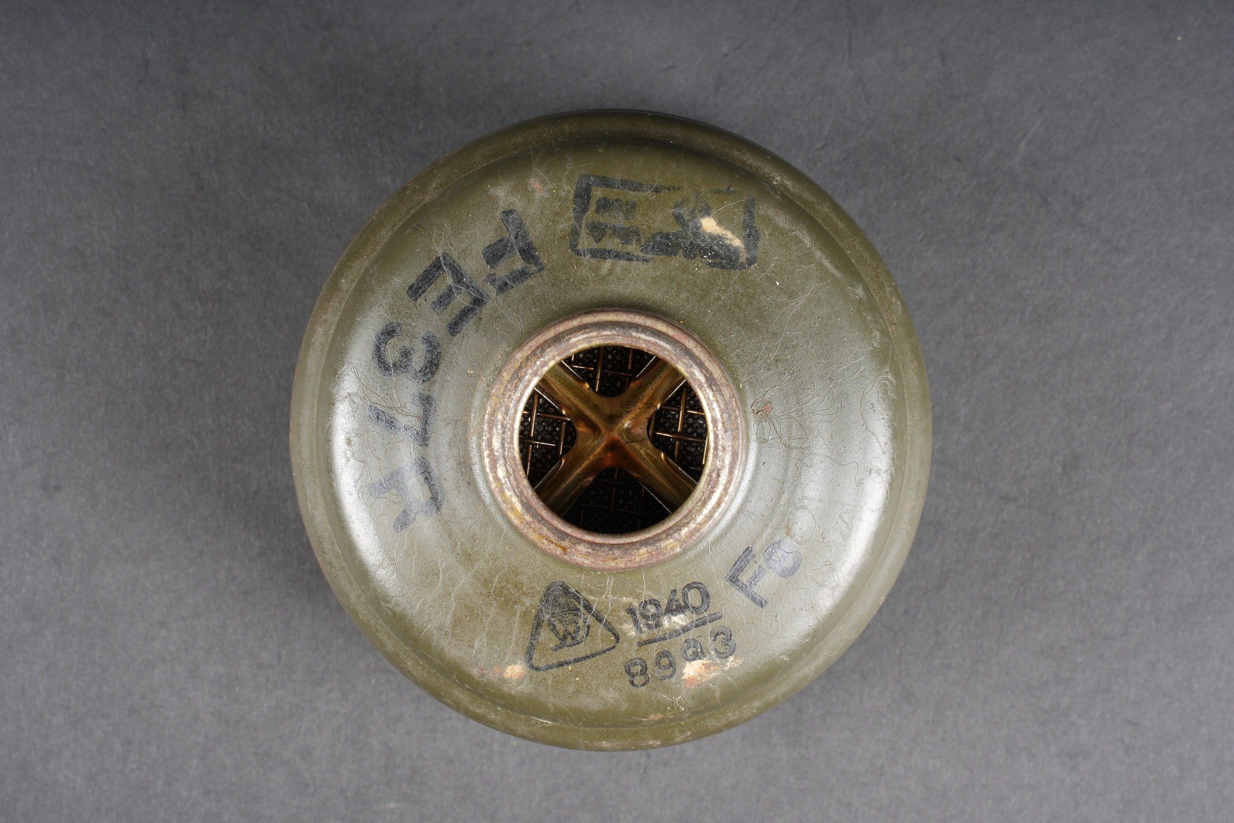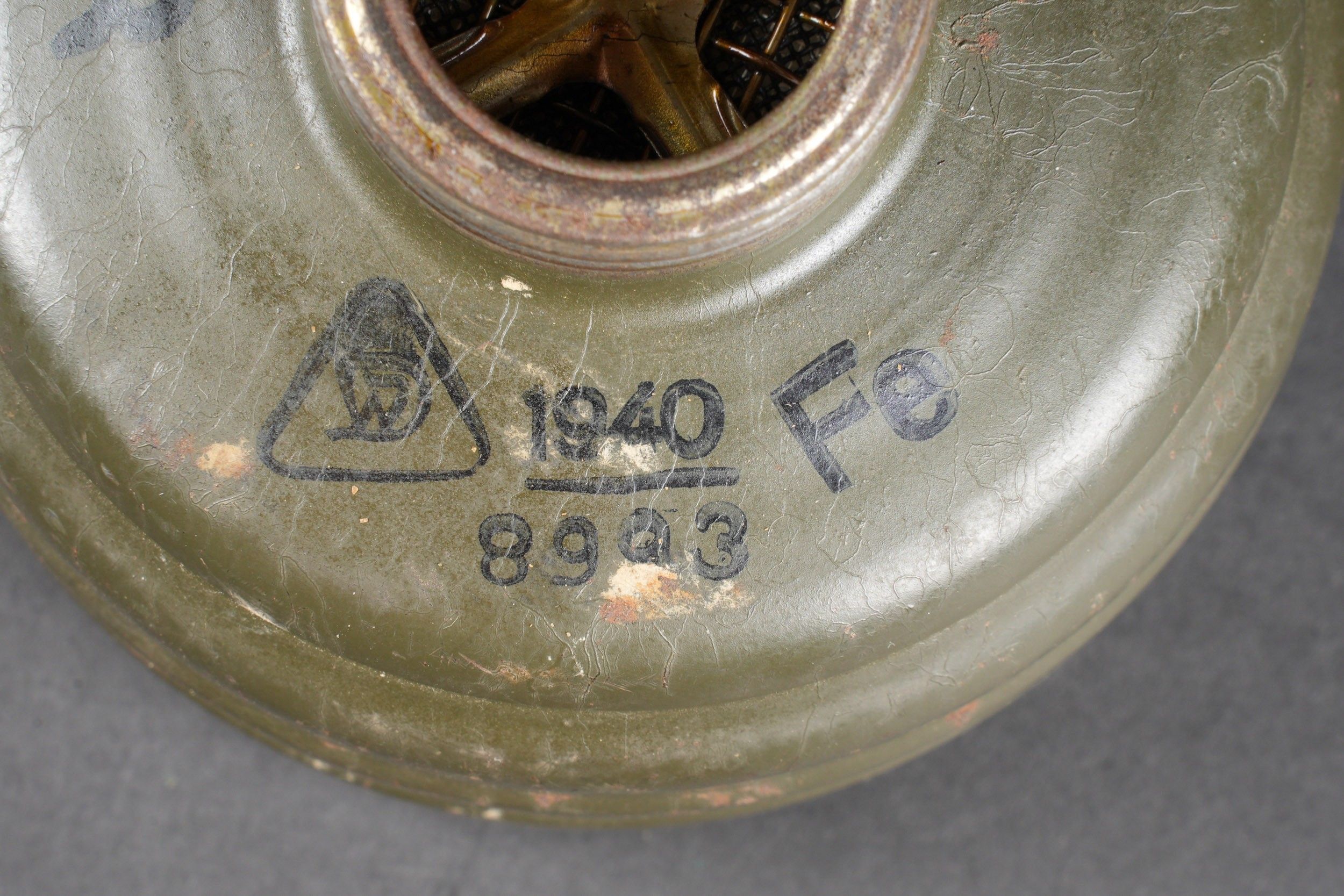 Camouflaged anti-gas mask. Long metal case. 70% camouflaged light green or sand paint. All straps are present, but different models. A few spots of blue paint are visible throughout. The spare lens case is missing. Rag and spider present. Canvas mask, size 2, number 227, painted black at the base of the mask. All straps are present. Filter complete, but with traces of oxidation and perforations, dated 1942. Some wear and patina. The zip is loose. Condition II+. Camouflaged German gas mask. Long metal canister with light greensand camouflage paint at 70%. All straps present but mismatched types. Blue paint spots scattered overall. Spare-lens compartment missing. Cloth and spider web present. Canvas mask, size 2, marked 227 in black paint at base. All straps intact. Filter complete but showing rust, oxidation, and perforations, dated 1942. Pull strap detached. Some wear and patina. Condition II+.
