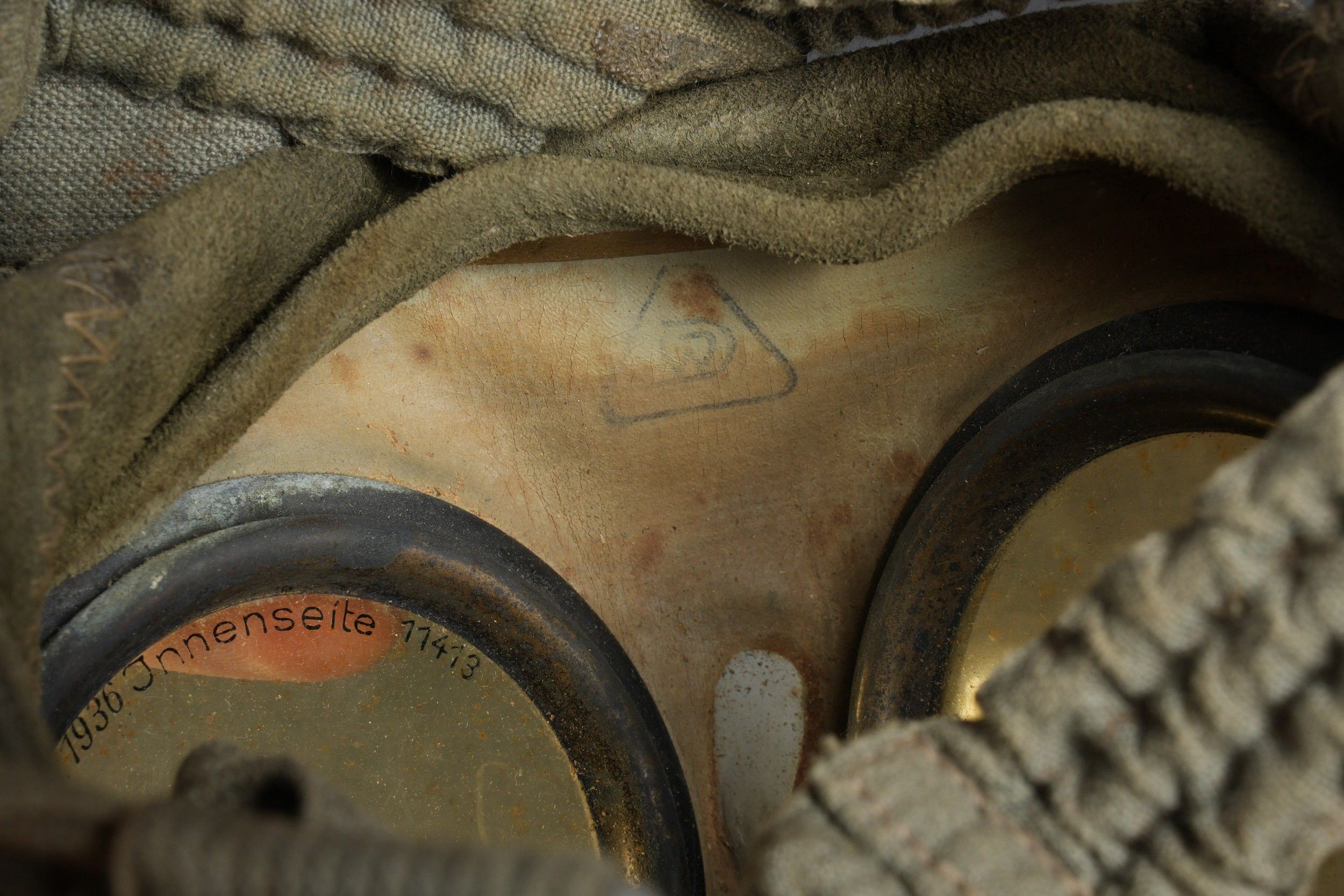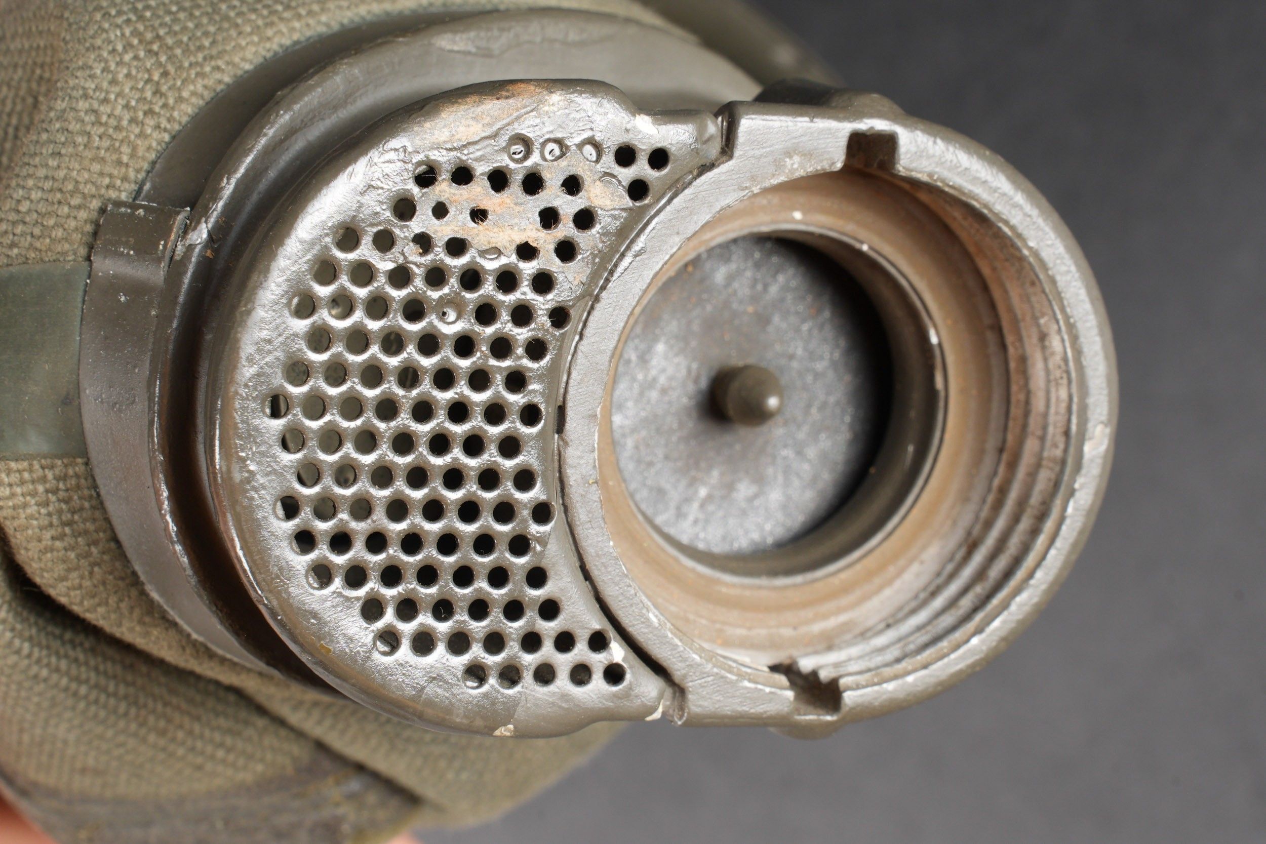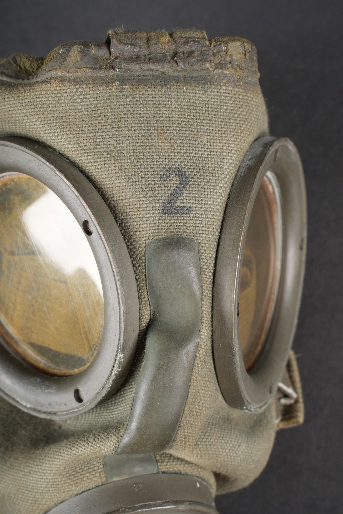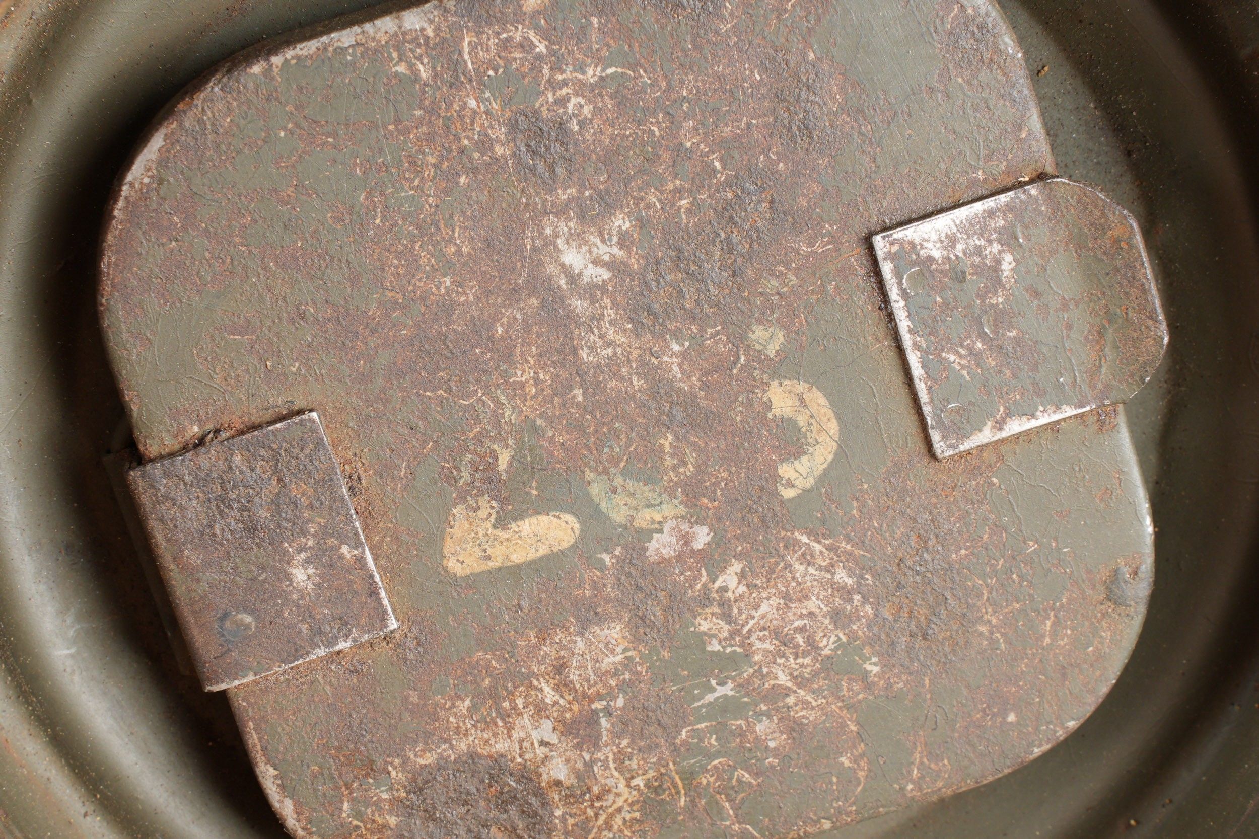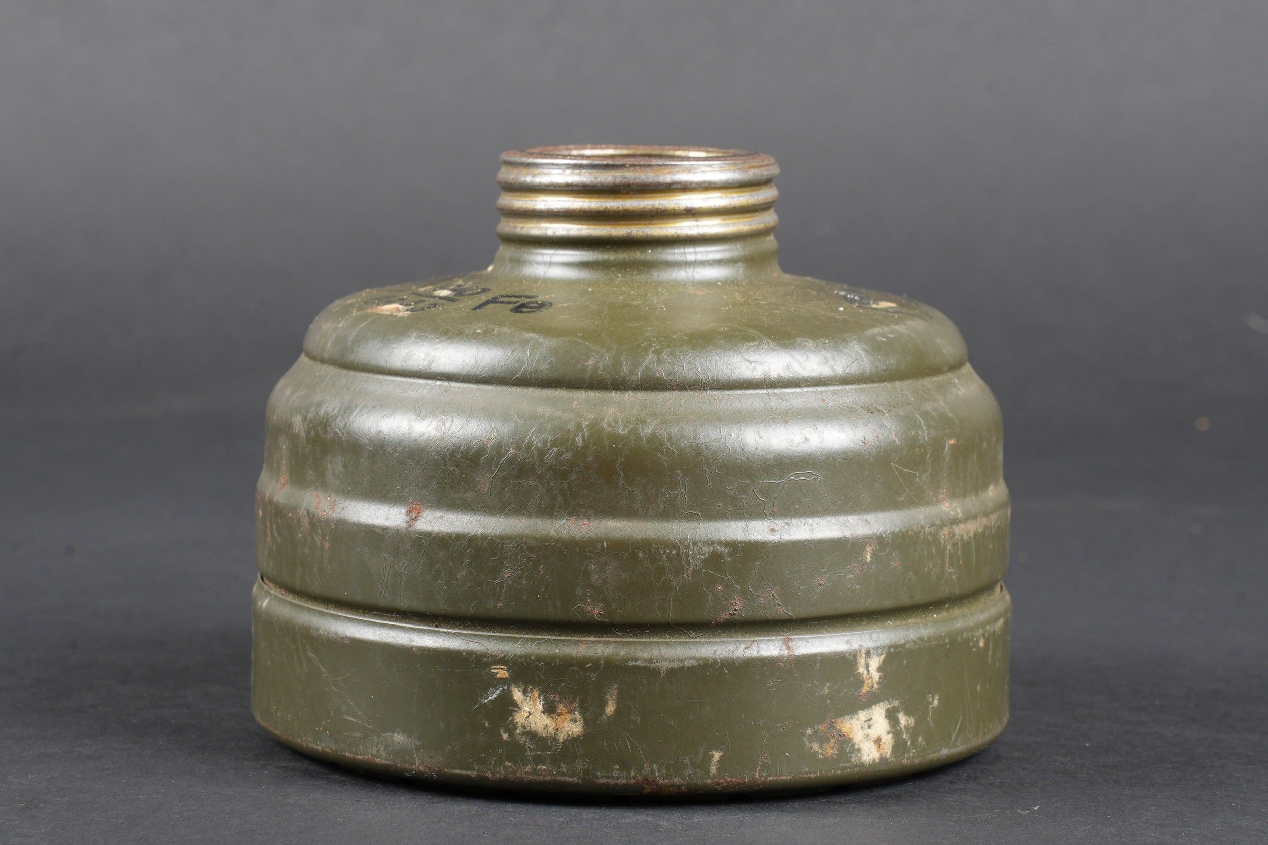 Camouflaged anti-gas mask. Long metal case. 70% camouflaged light green or sand paint. All straps are present, but different models. A few spots of blue paint are visible throughout. The spare lens case is missing. Rag and spider present. Canvas mask, size 2, number 227, painted black at the base of the mask. All straps are present. Filter complete, but with traces of oxidation and perforations, dated 1942. Some wear and patina. The zip is loose. Condition II+. Camouflaged German gas mask. Long metal canister with light greensand camouflage paint at 70%. All straps present but mismatched types. Blue paint spots scattered overall. Spare-lens compartment missing. Cloth and spider web present. Canvas mask, size 2, marked 227 in black paint at base. All straps intact. Filter complete but showing rust, oxidation, and perforations, dated 1942. Pull strap detached. Some wear and patina. Condition II+.
