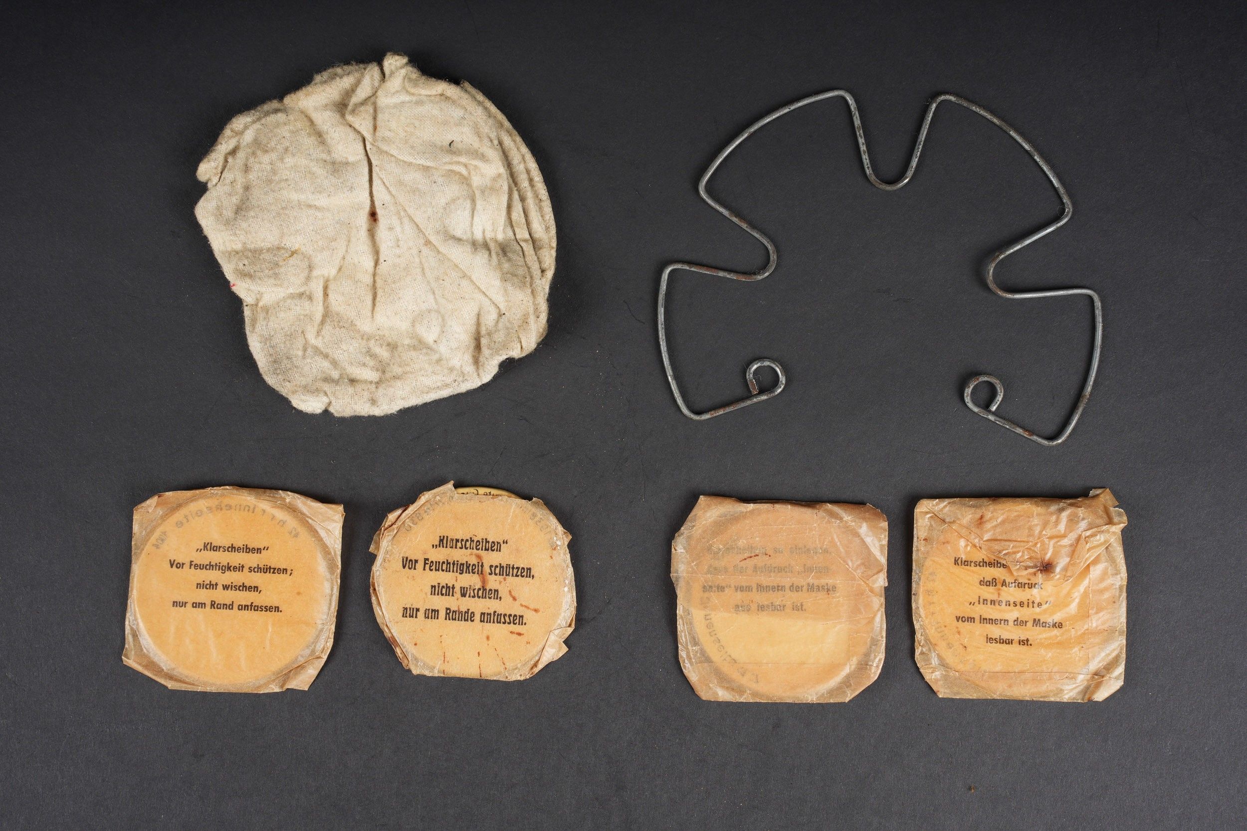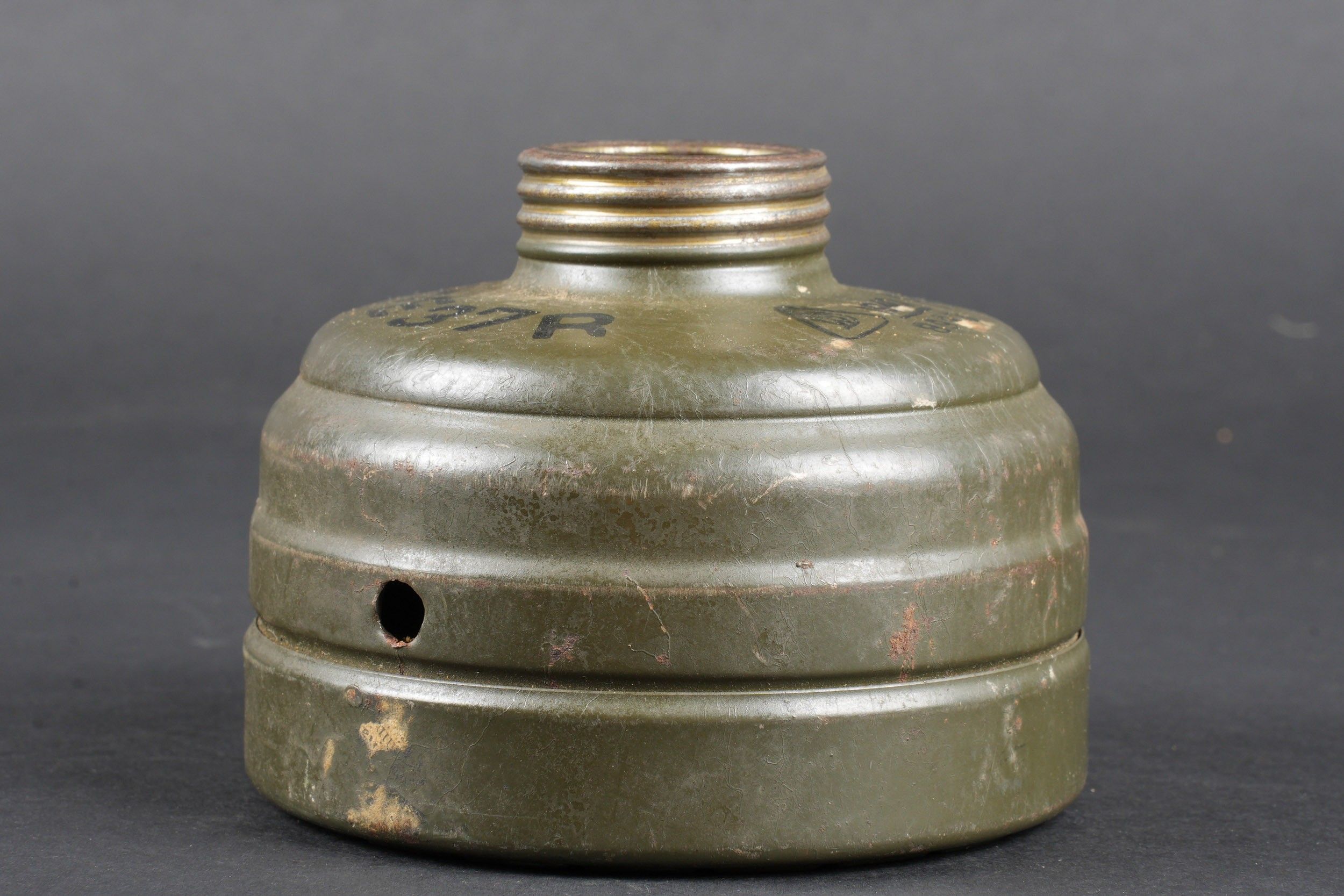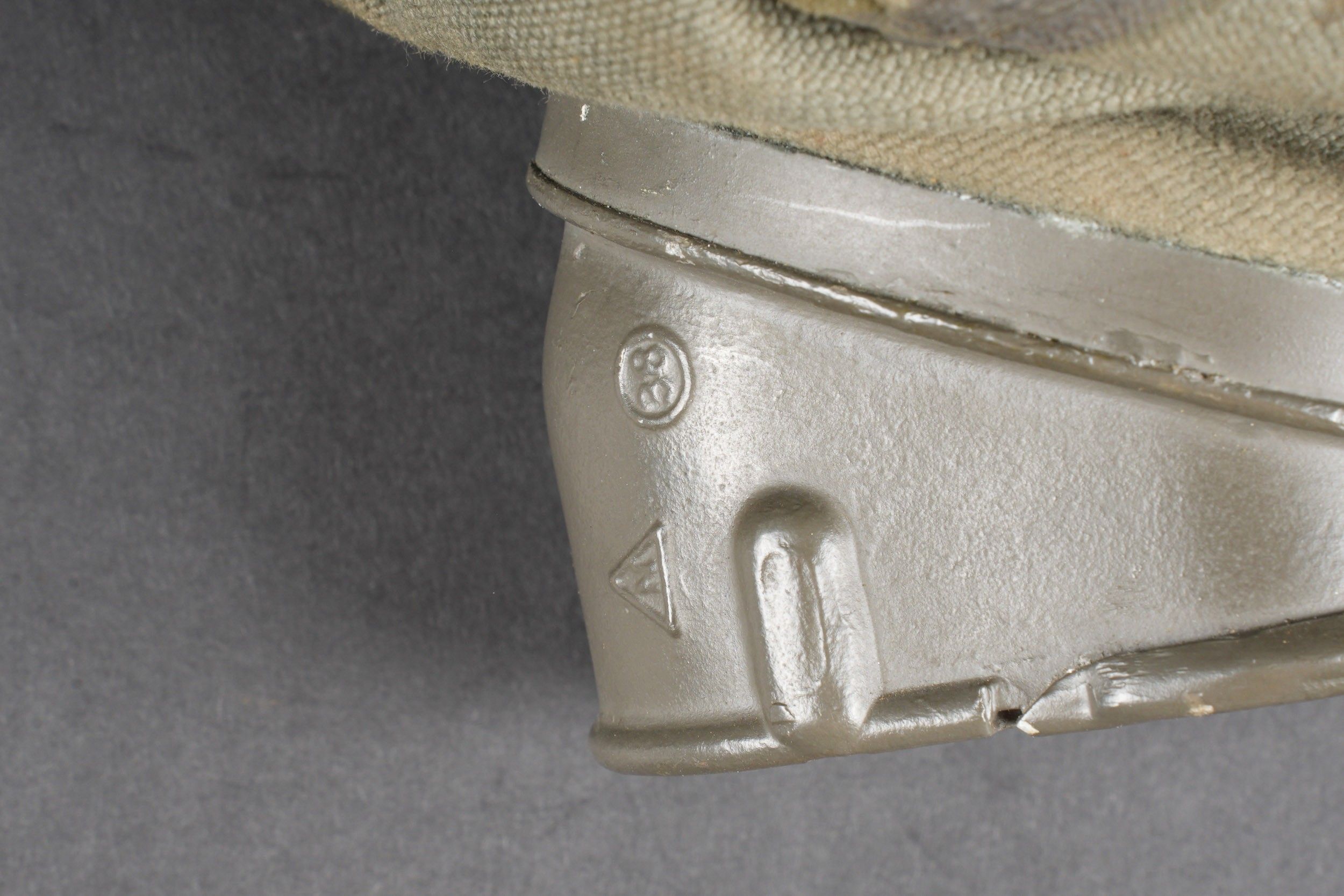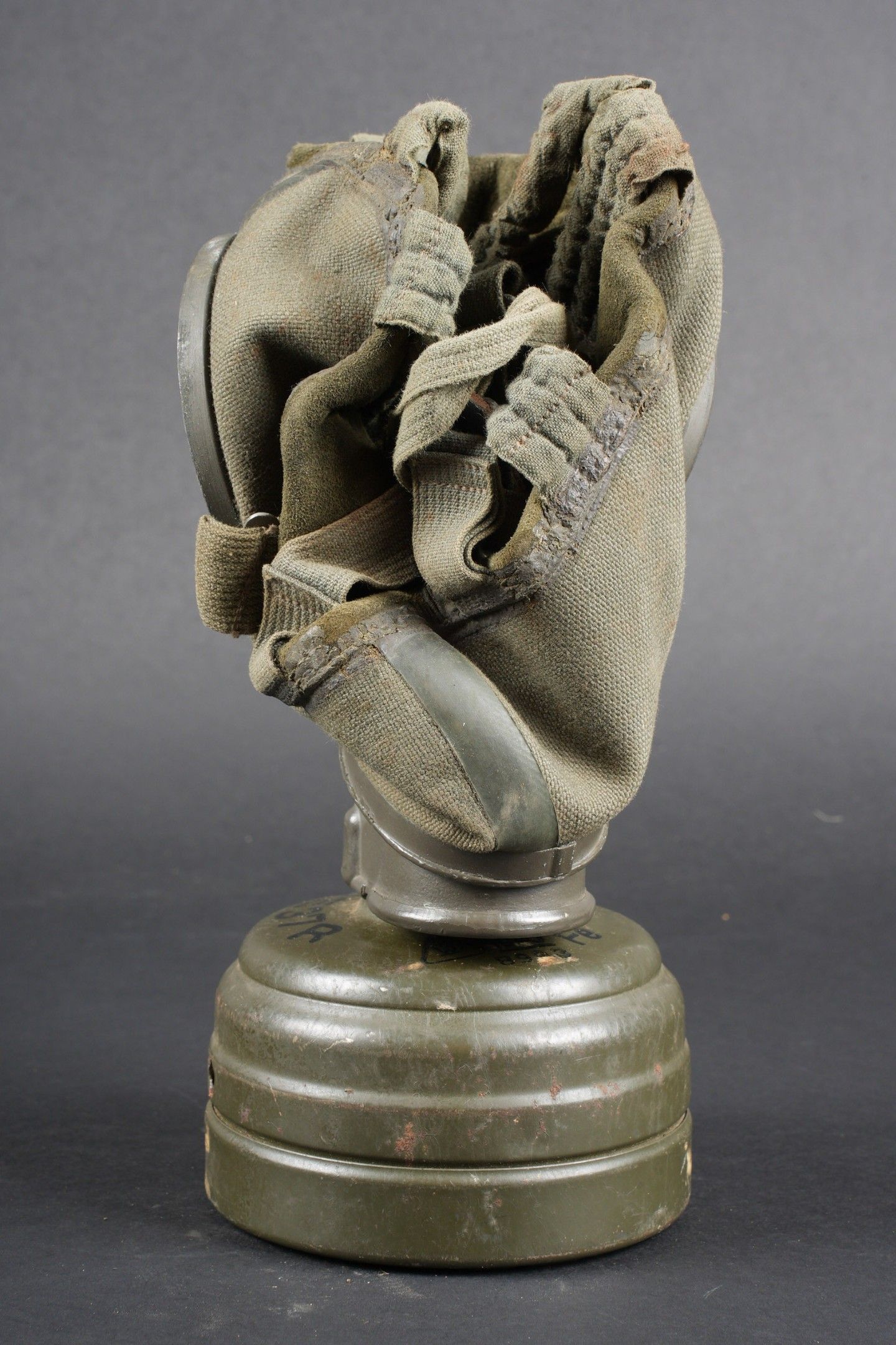 Camouflaged anti-gas mask. Long metal case. 70% camouflaged light green or sand paint. All straps are present, but different models. A few spots of blue paint are visible throughout. The spare lens case is missing. Rag and spider present. Canvas mask, size 2, number 227, painted black at the base of the mask. All straps are present. Filter complete, but with traces of oxidation and perforations, dated 1942. Some wear and patina. The zip is loose. Condition II+. Camouflaged German gas mask. Long metal canister with light greensand camouflage paint at 70%. All straps present but mismatched types. Blue paint spots scattered overall. Spare-lens compartment missing. Cloth and spider web present. Canvas mask, size 2, marked 227 in black paint at base. All straps intact. Filter complete but showing rust, oxidation, and perforations, dated 1942. Pull strap detached. Some wear and patina. Condition II+.