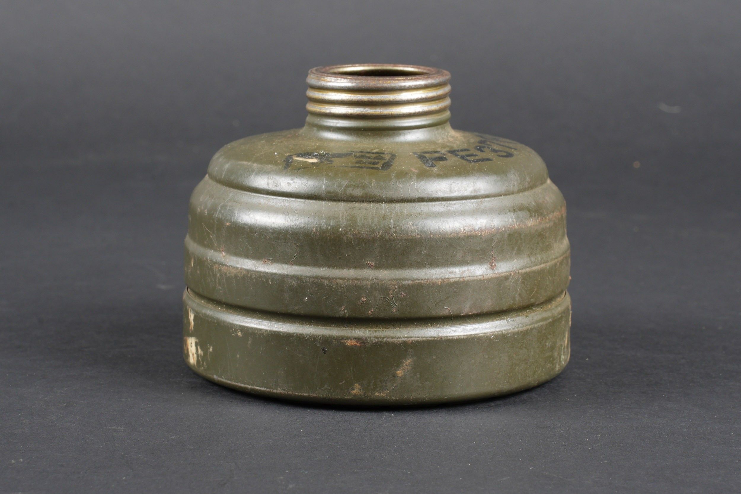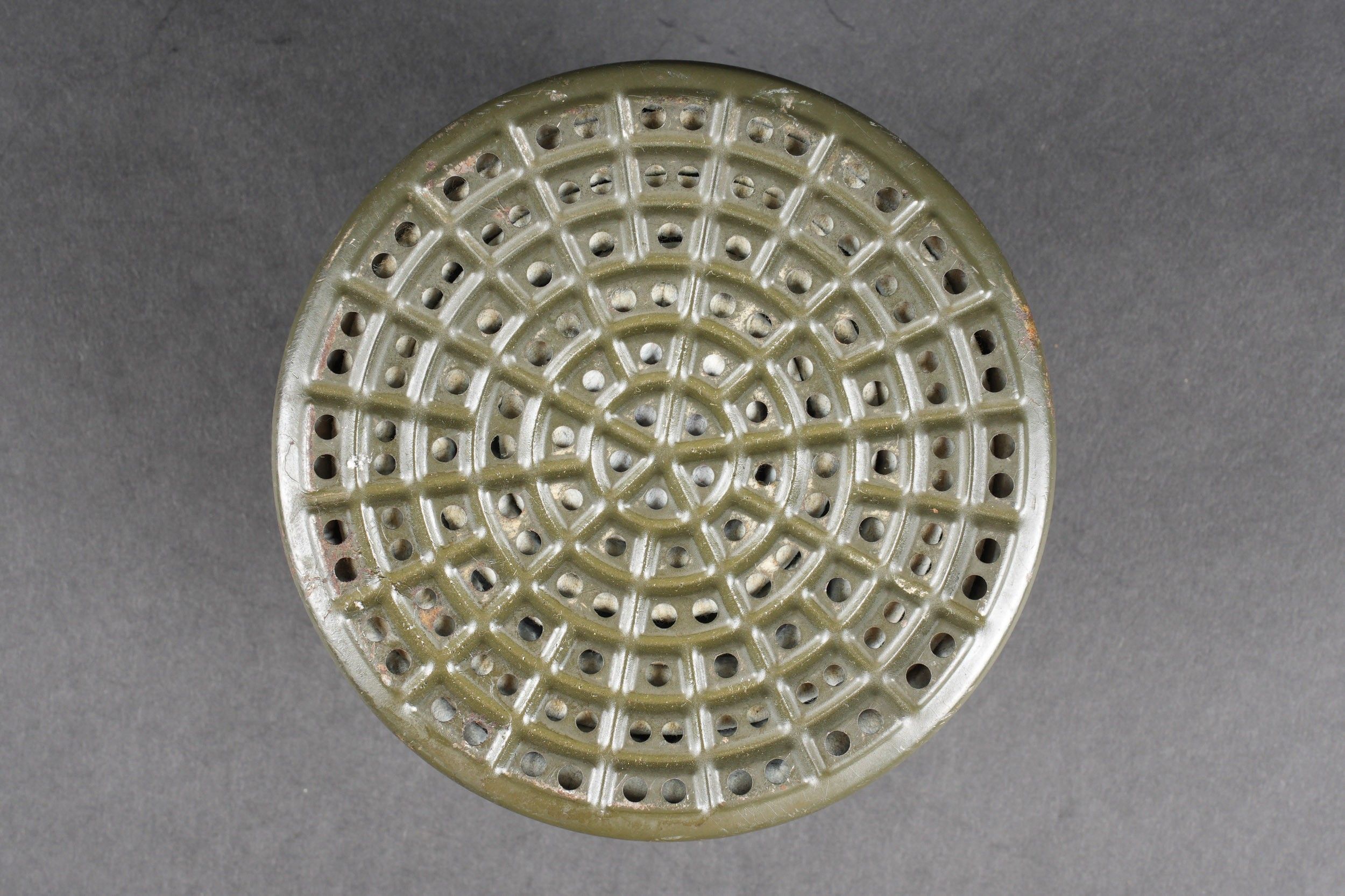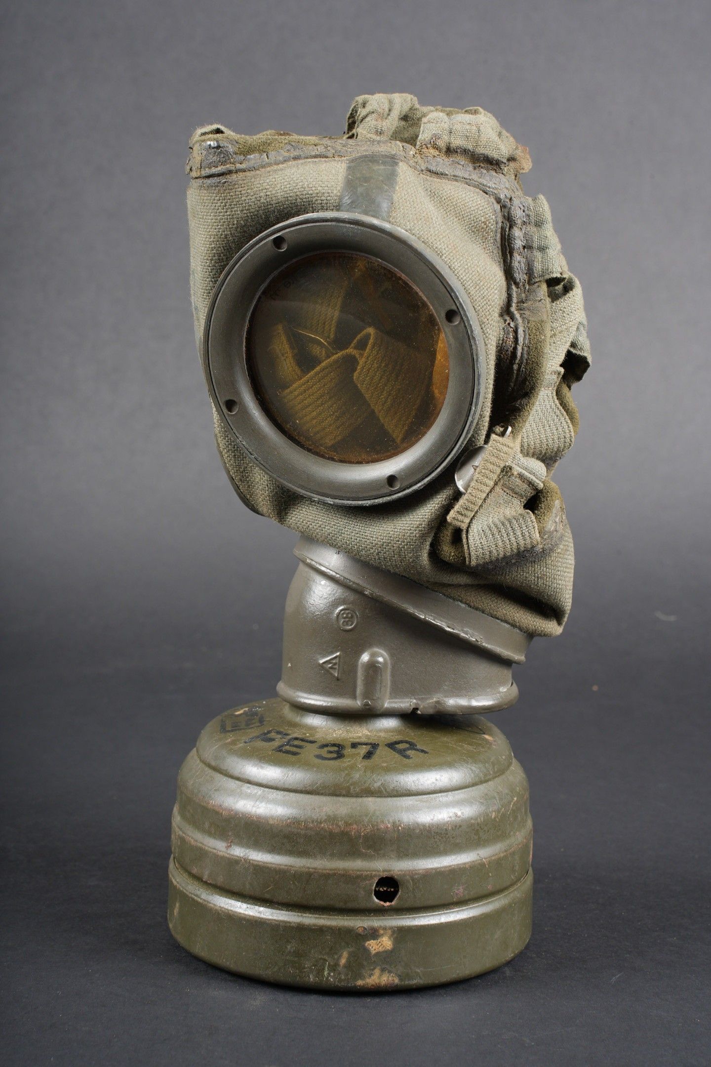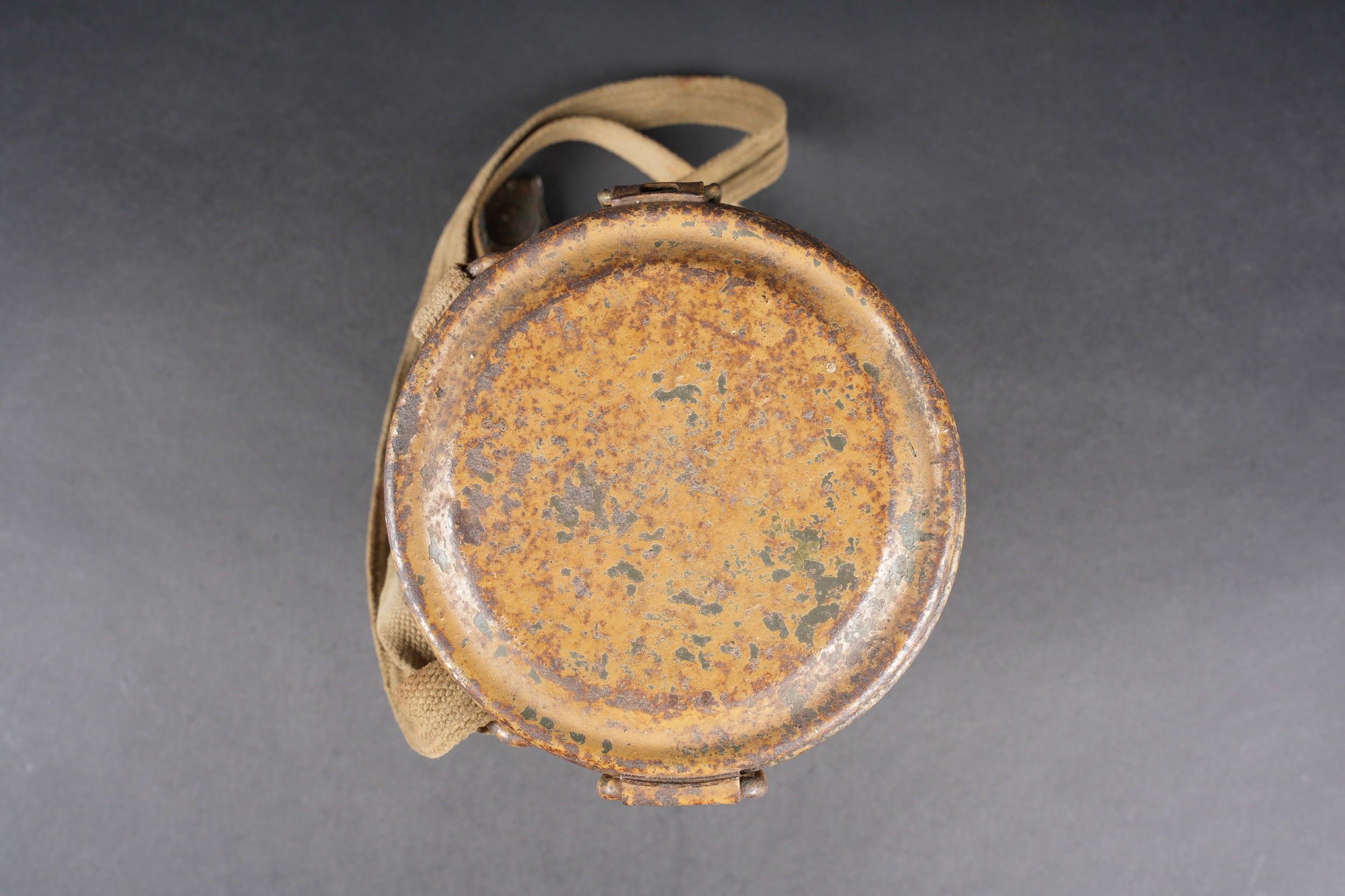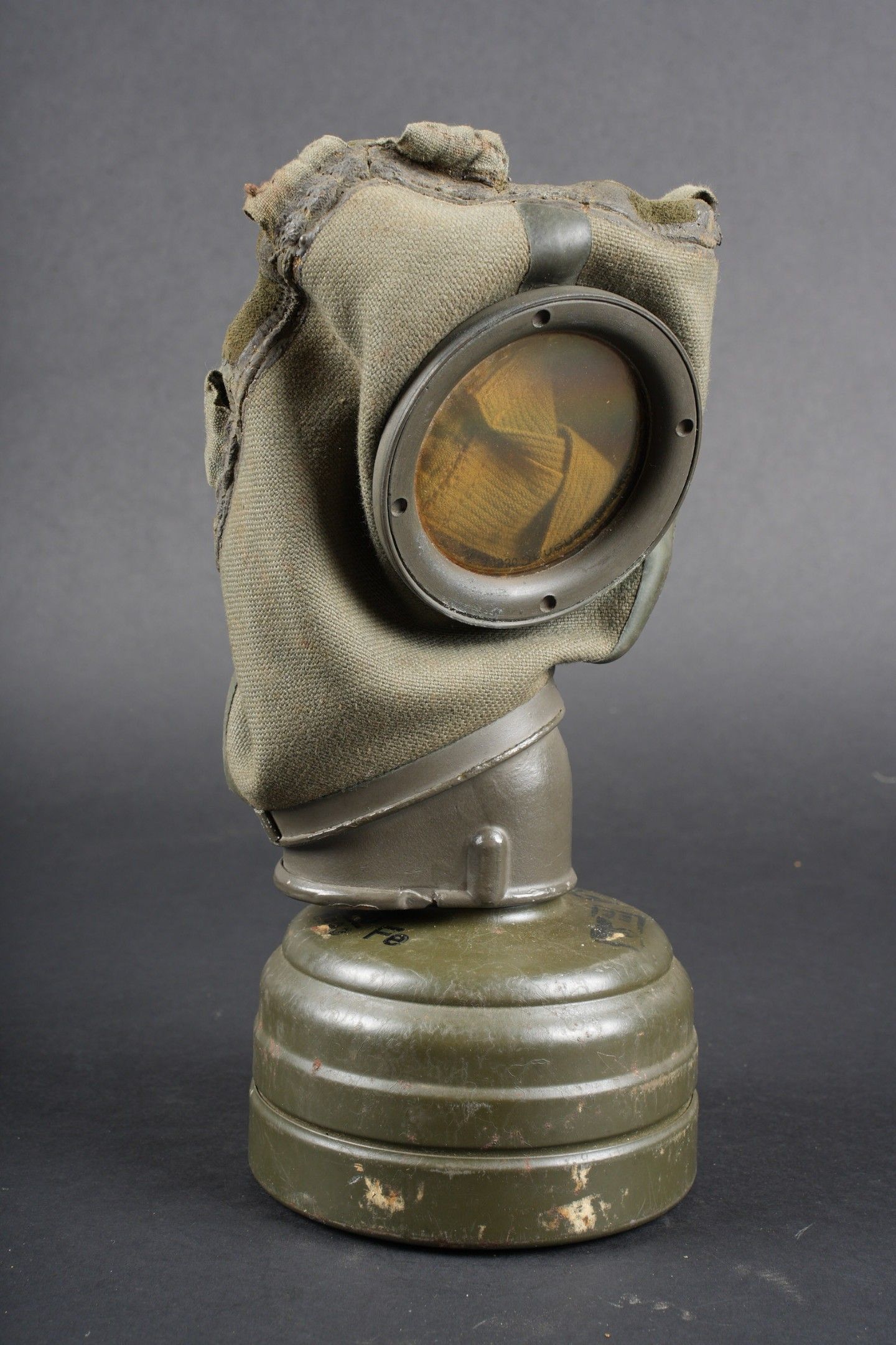 Camouflaged anti-gas mask. Long metal case. 70% camouflaged light green or sand paint. All straps are present, but different models. A few spots of blue paint are visible throughout. The spare lens case is missing. Rag and spider present. Canvas mask, size 2, number 227, painted black at the base of the mask. All straps are present. Filter complete, but with traces of oxidation and perforations, dated 1942. Some wear and patina. The zip is loose. Condition II+. Camouflaged German gas mask. Long metal canister with light greensand camouflage paint at 70%. All straps present but mismatched types. Blue paint spots scattered overall. Spare-lens compartment missing. Cloth and spider web present. Canvas mask, size 2, marked 227 in black paint at base. All straps intact. Filter complete but showing rust, oxidation, and perforations, dated 1942. Pull strap detached. Some wear and patina. Condition II+.