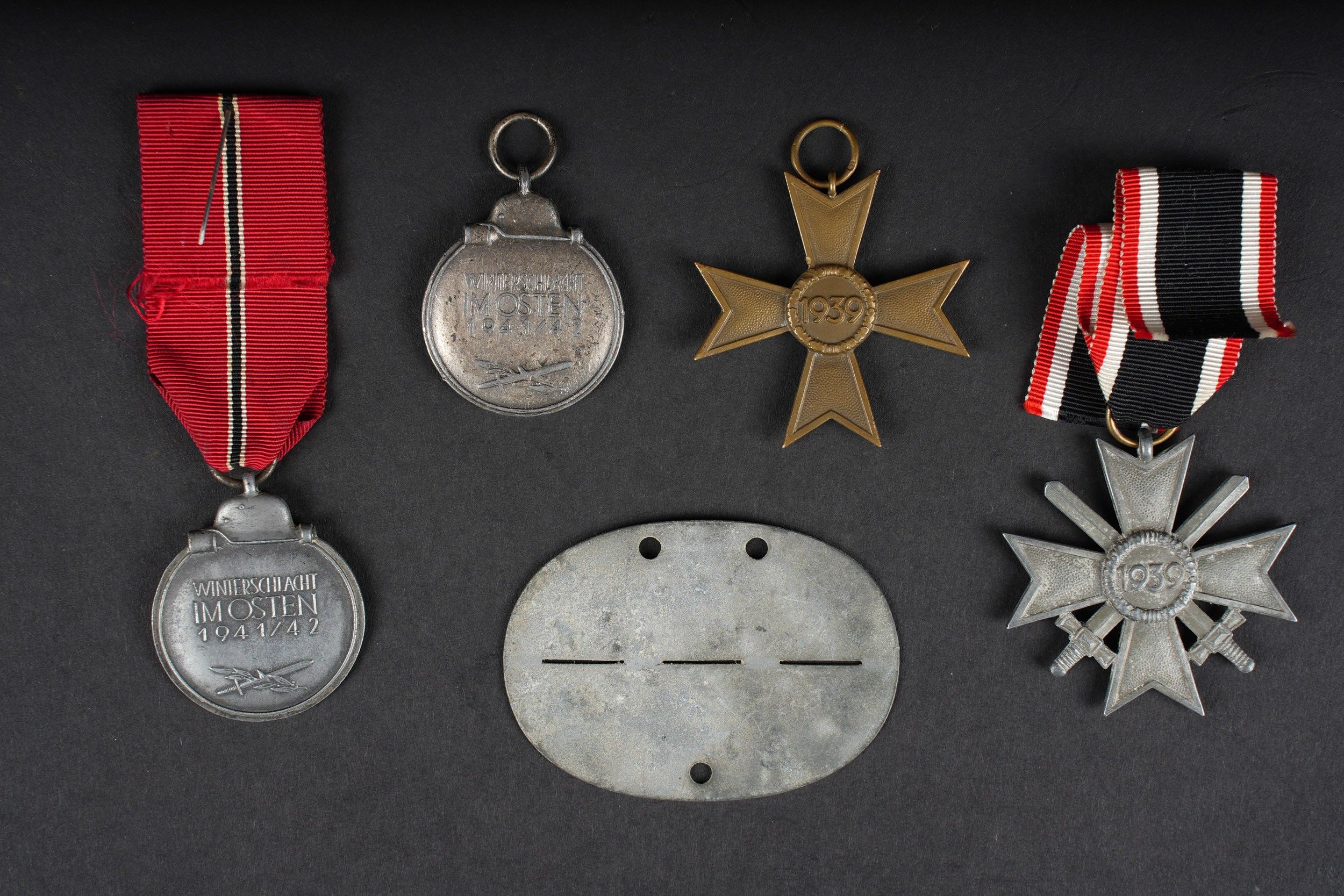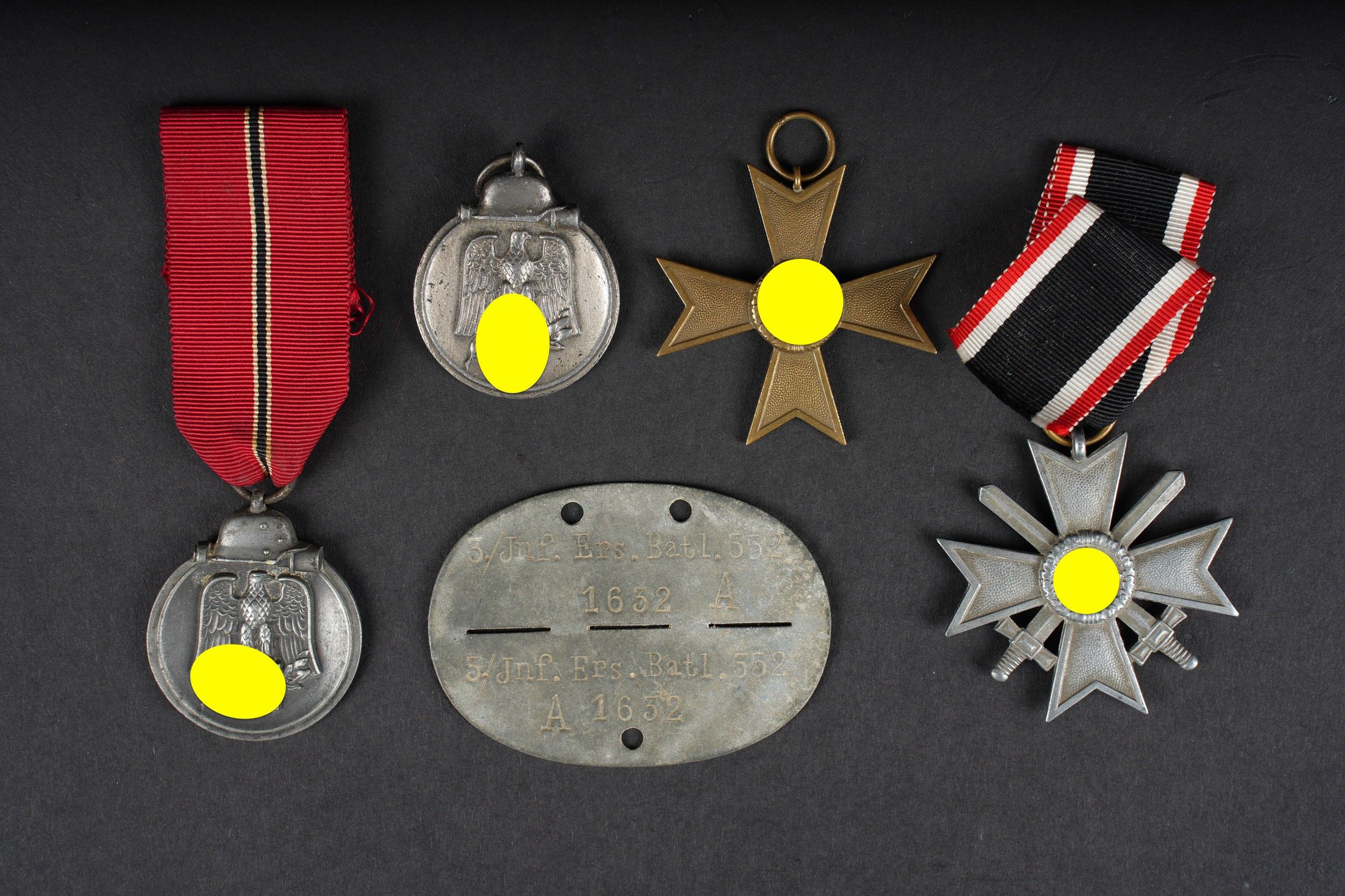 German badges. Comprising a KVK second class, without ribbon. An Eastern Front medal, without ribbon. One KVK second class with sword and ribbon. Two Eastern Front medals with ribbon. A complete identity plate, marked 3Inf Ers Batl 552, blood group A, number 1632. Some wear and patina. Condition II+. German insignia. Includes one War Merit Cross 2nd Class without ribbon, one Eastern Front Medal without ribbon, one War Merit Cross 2nd Class with swords and ribbon, and two Eastern Front Medals with ribbons. Also includes a complete identity disc marked 3Inf Ers Batl 552, blood group A, number 1632. Some wear and patina. Condition II+.