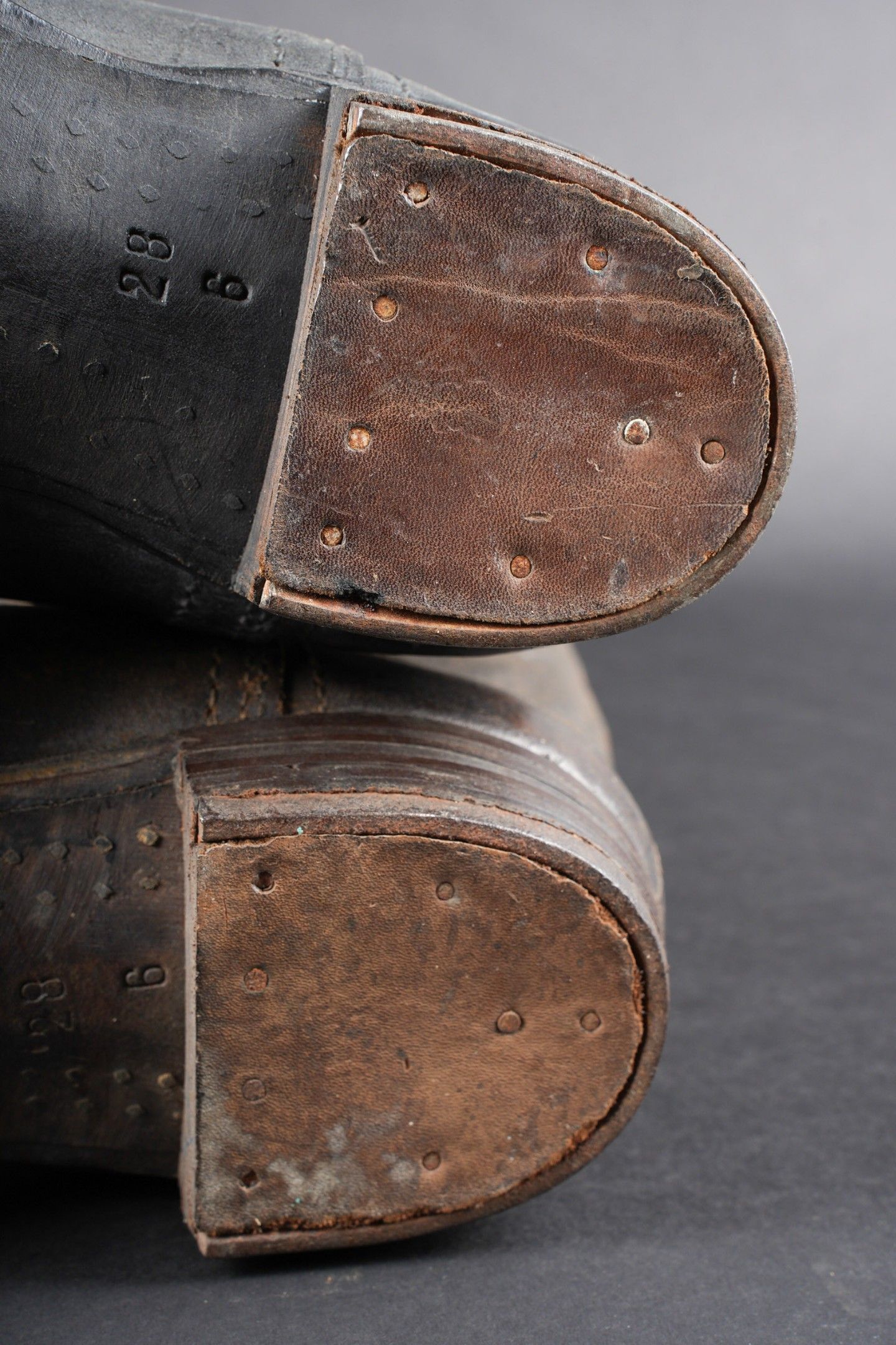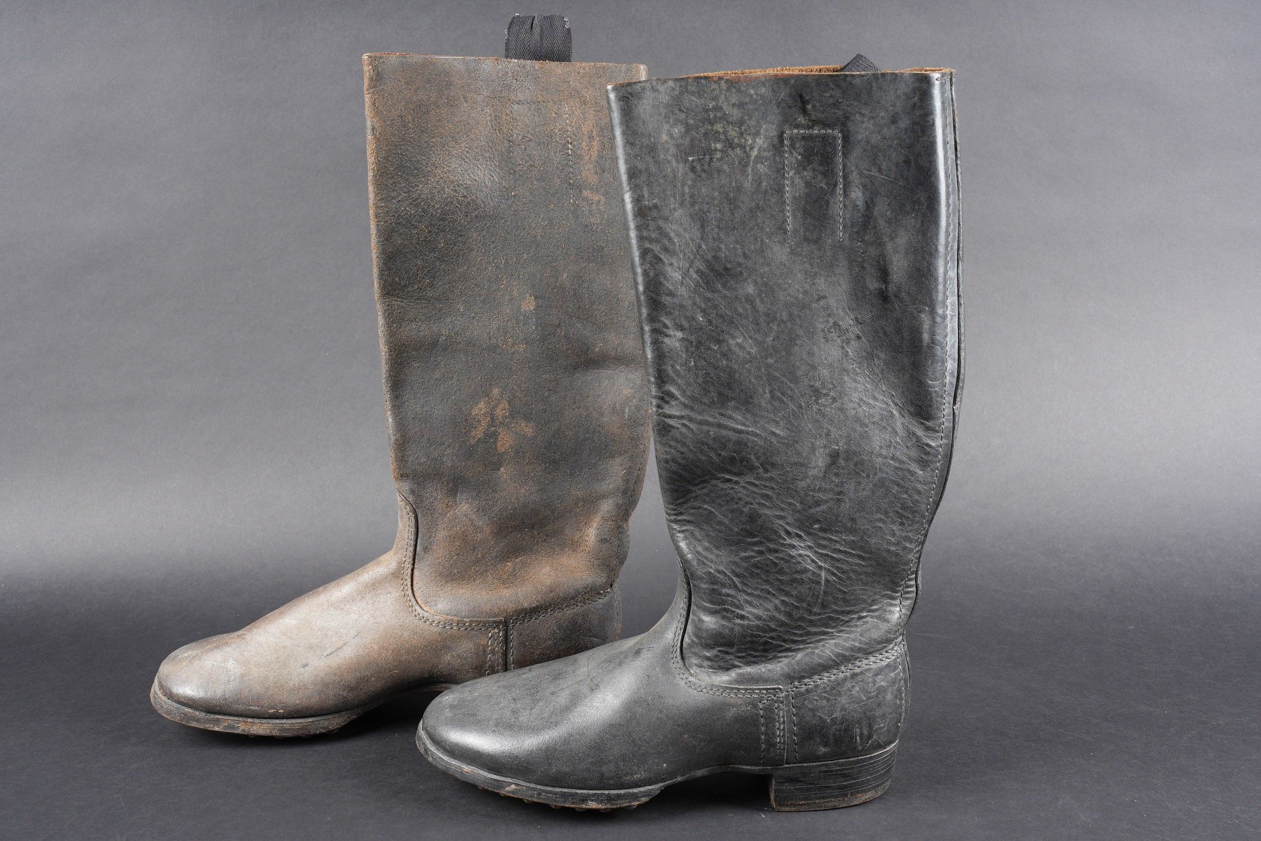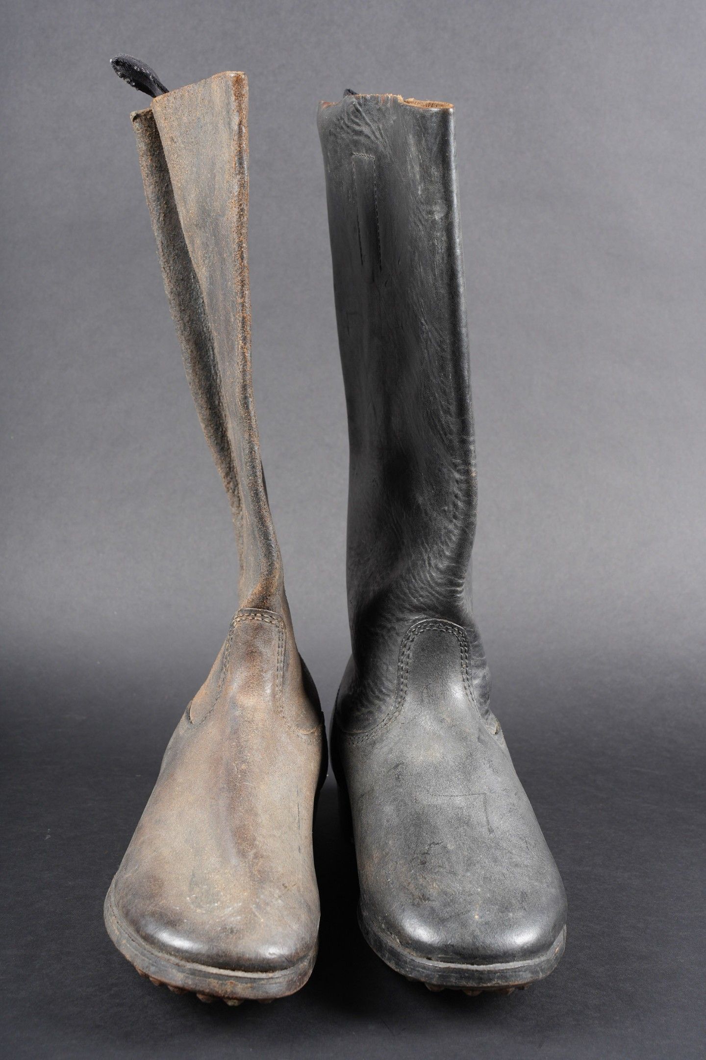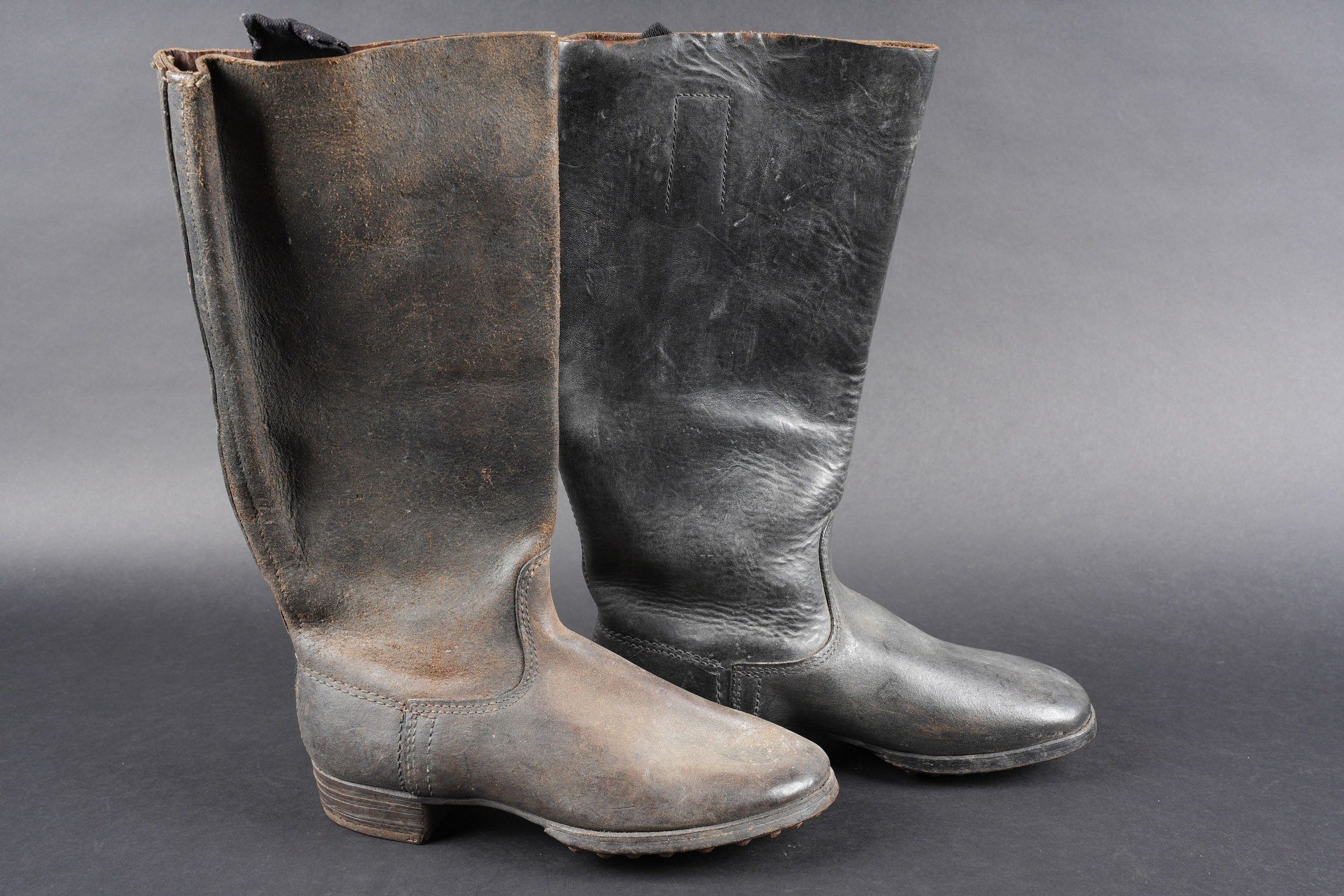 German boots. Pair not homogeneous by wear. Black and dark brown leather. Stamp marked on both boots Eigentum der RFV. Made by E Pretzsch 35913 28 5 28. Studded soles. Shoe heels. Some wear and patina. Condition II+. German boots. Mismatched pair due to wear, black and dark brown leather. Stamped inside both boots Eigentum der RFV. Maker-marked E. Pretzsch 35913 28 5 28. Hobnailed soles, steel heel plates. Some wear and patina. Condition II+.