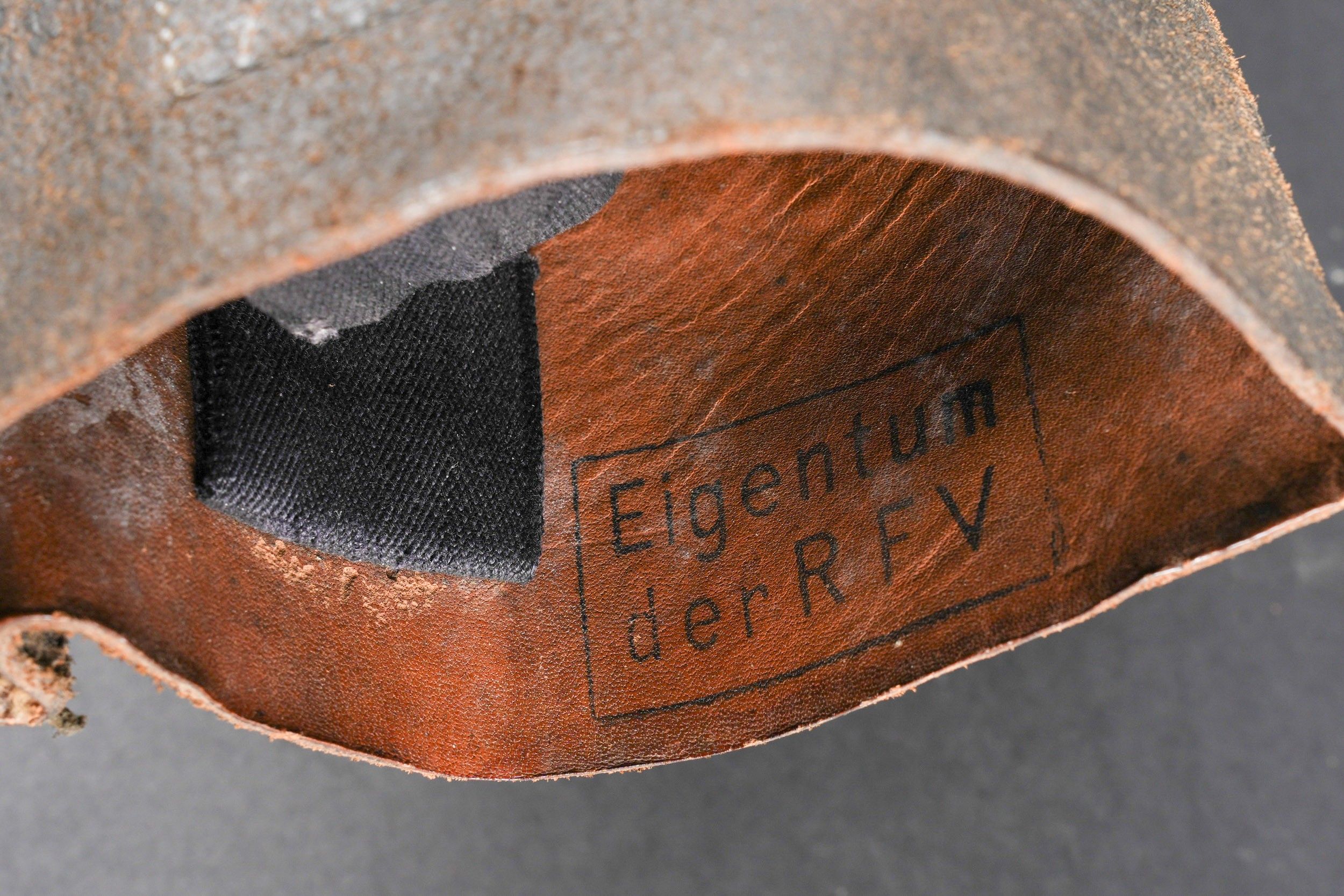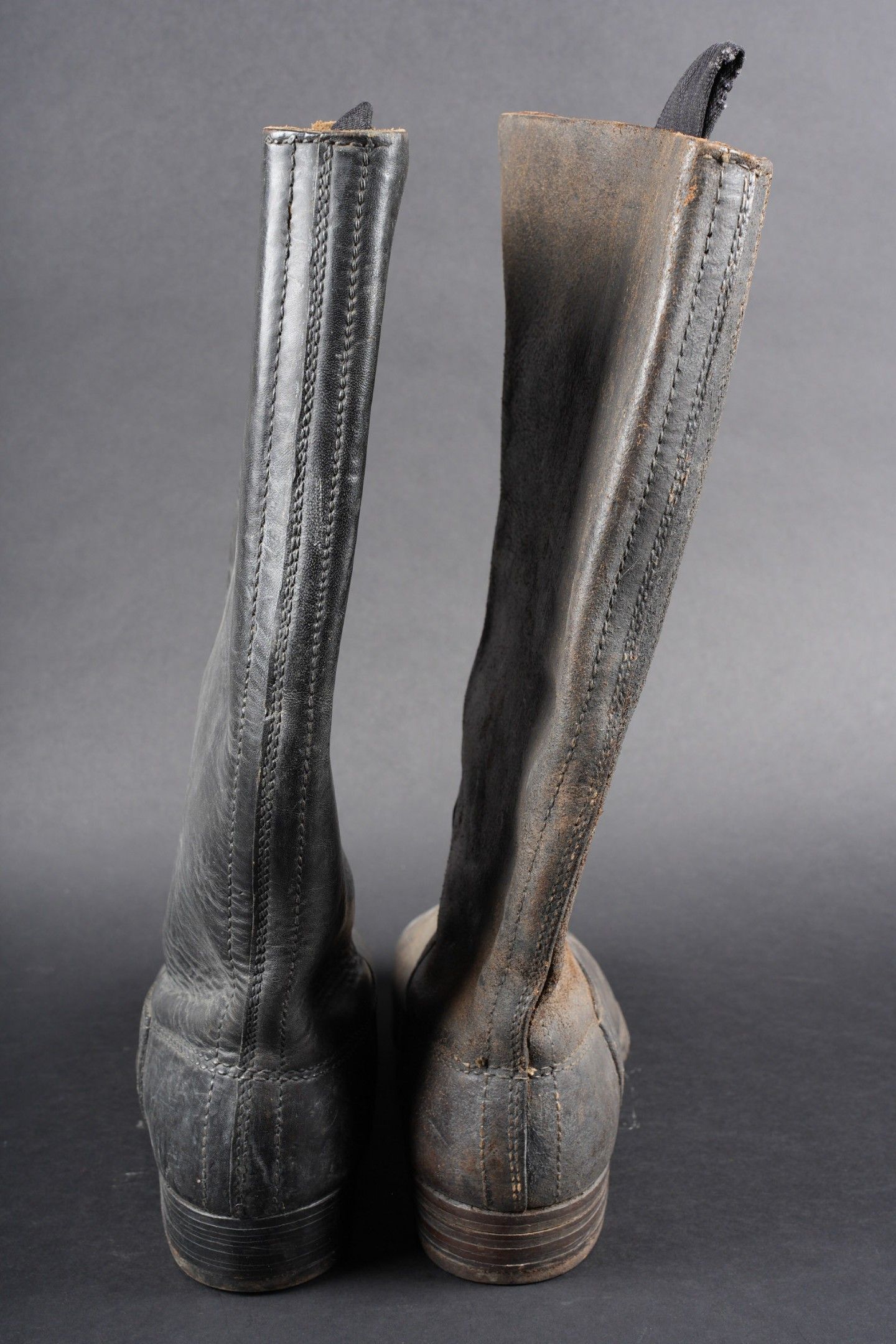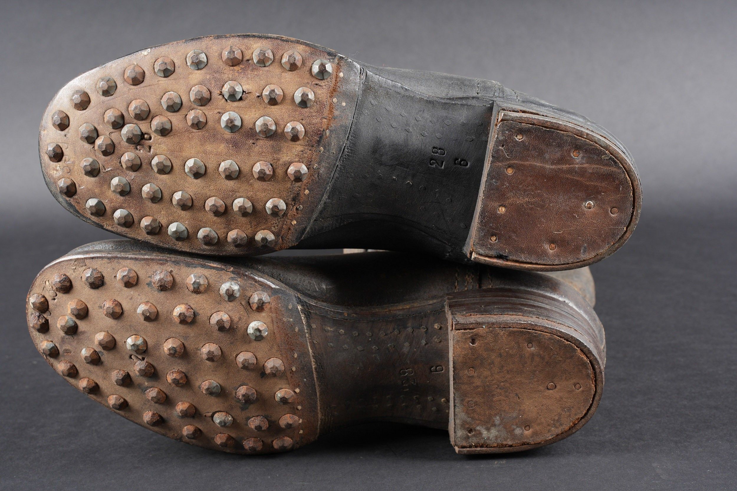 German boots. Pair not homogeneous by wear. Black and dark brown leather. Stamp marked on both boots Eigentum der RFV. Made by E Pretzsch 35913 28 5 28. Studded soles. Shoe heels. Some wear and patina. Condition II+. German boots. Mismatched pair due to wear, black and dark brown leather. Stamped inside both boots Eigentum der RFV. Maker-marked E. Pretzsch 35913 28 5 28. Hobnailed soles, steel heel plates. Some wear and patina. Condition II+.