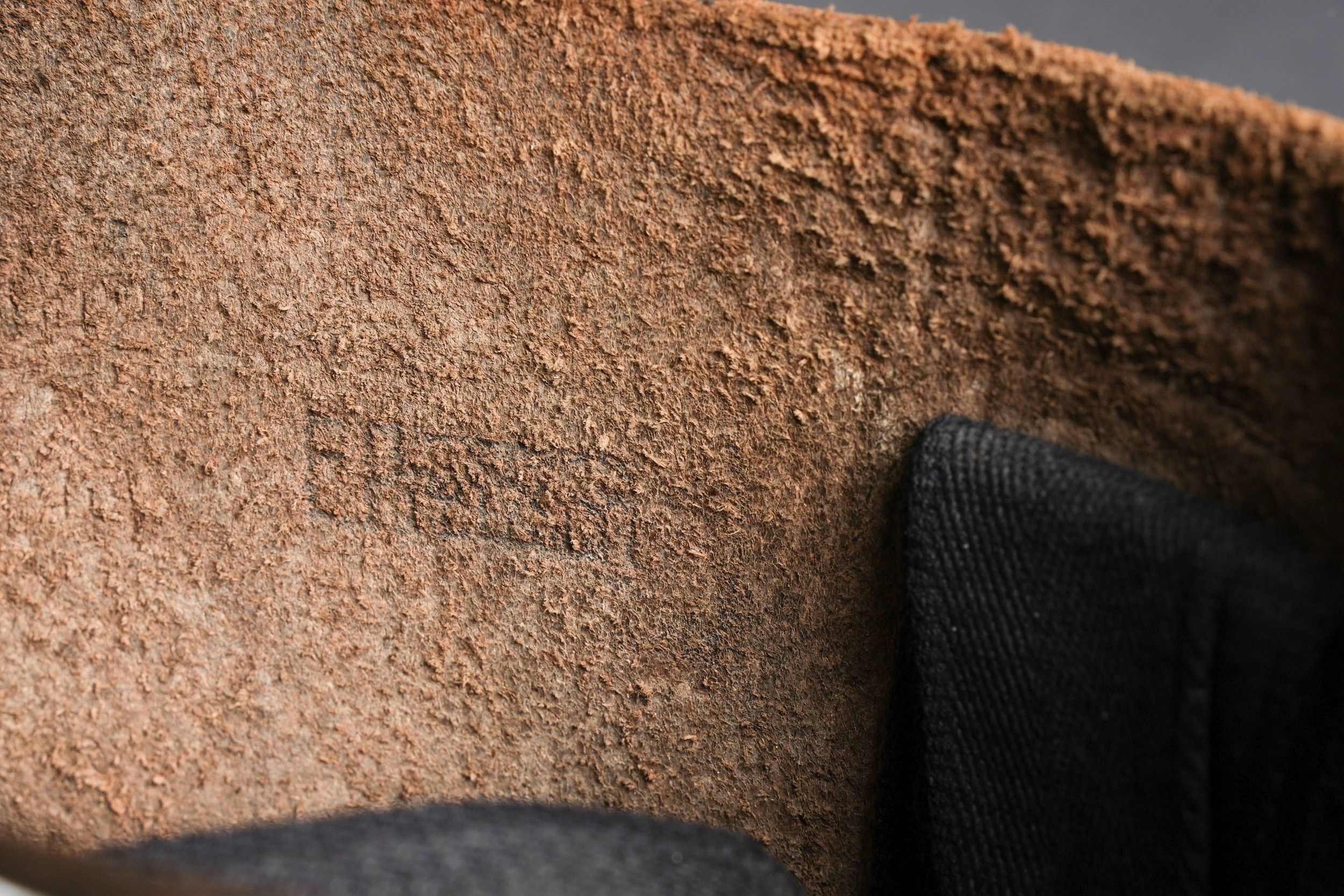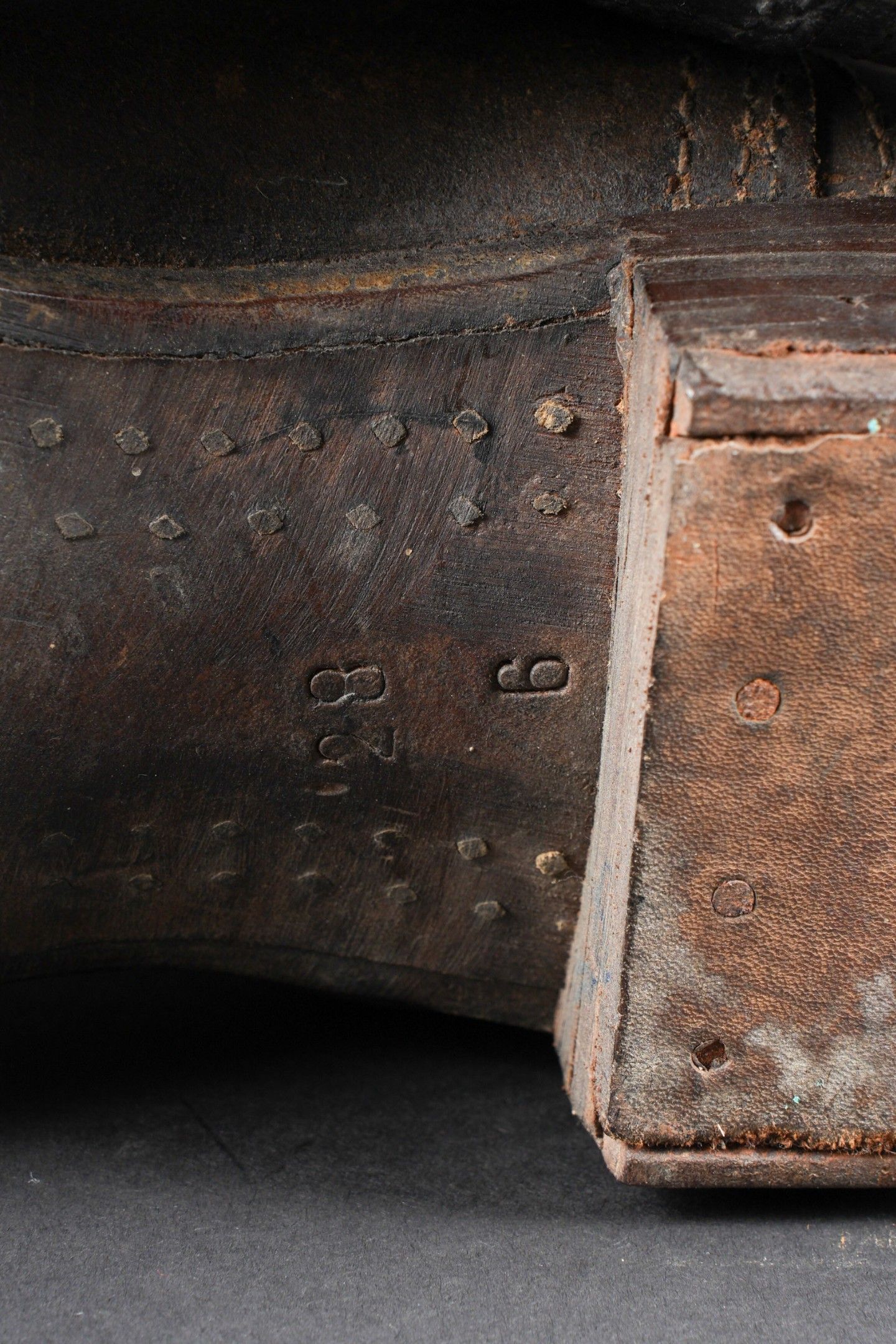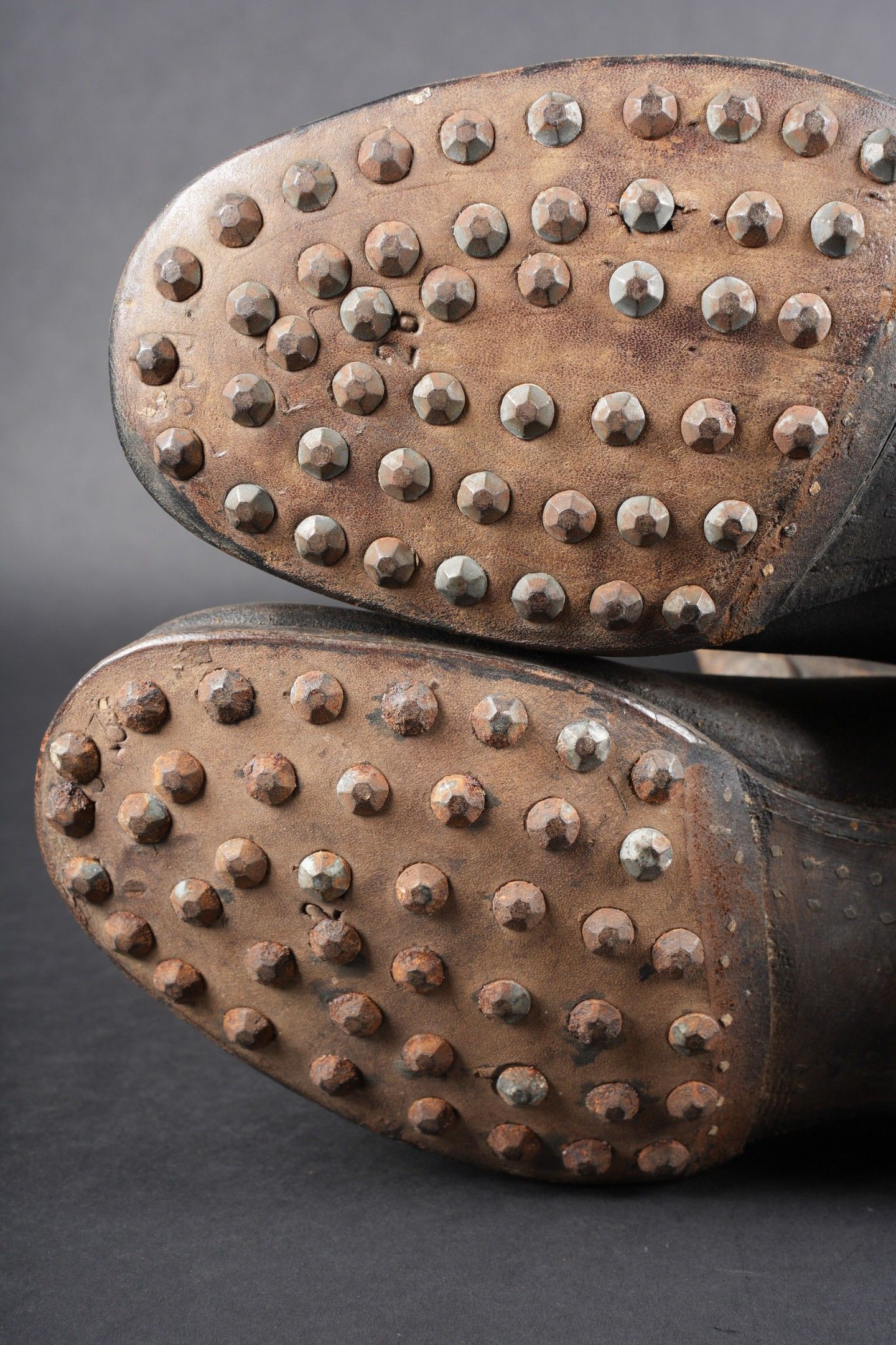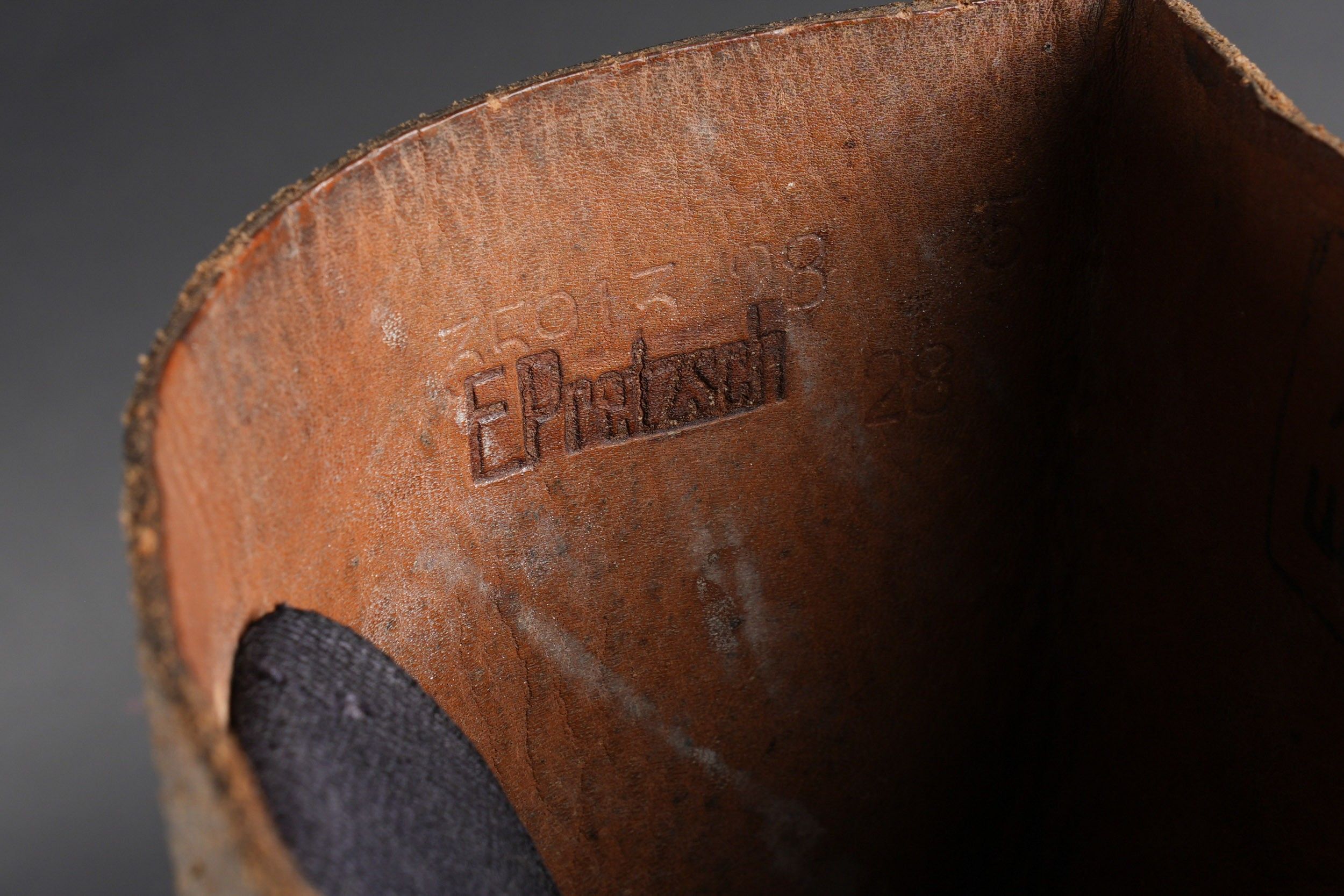 German boots. Pair not homogeneous by wear. Black and dark brown leather. Stamp marked on both boots Eigentum der RFV. Made by E Pretzsch 35913 28 5 28. Studded soles. Shoe heels. Some wear and patina. Condition II+. German boots. Mismatched pair due to wear, black and dark brown leather. Stamped inside both boots Eigentum der RFV. Maker-marked E. Pretzsch 35913 28 5 28. Hobnailed soles, steel heel plates. Some wear and patina. Condition II+.