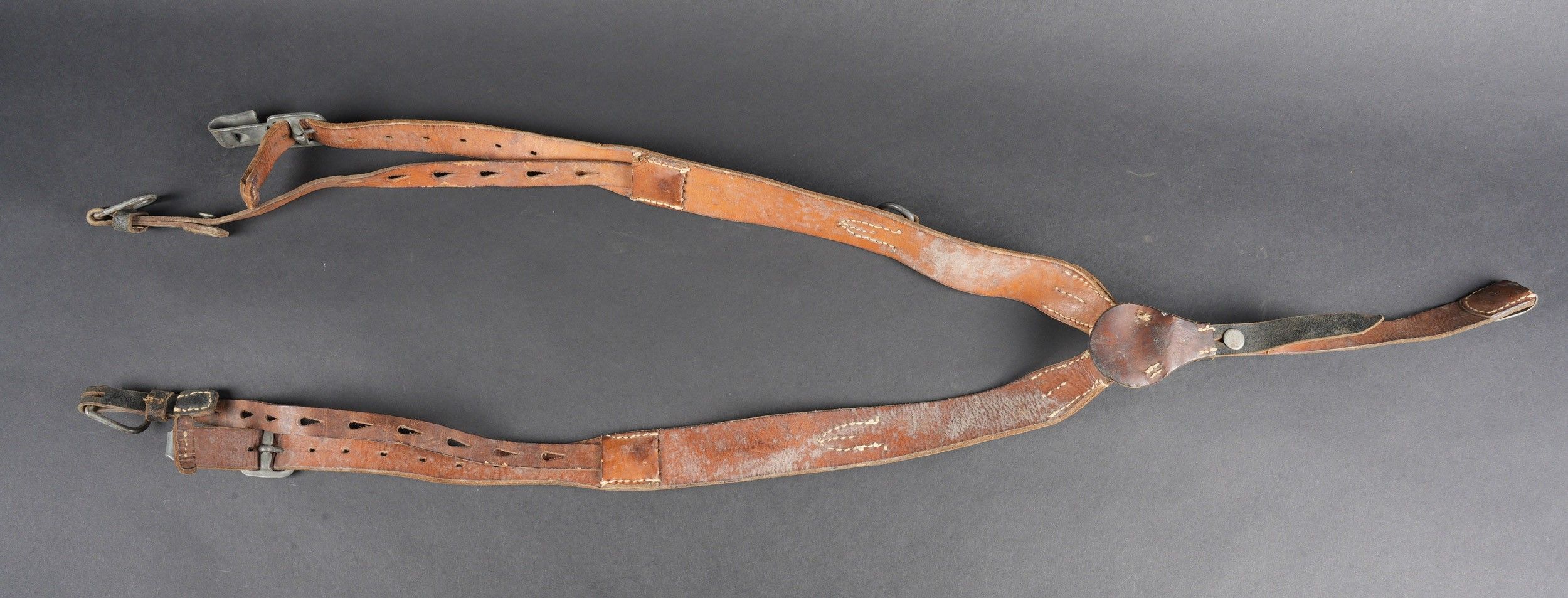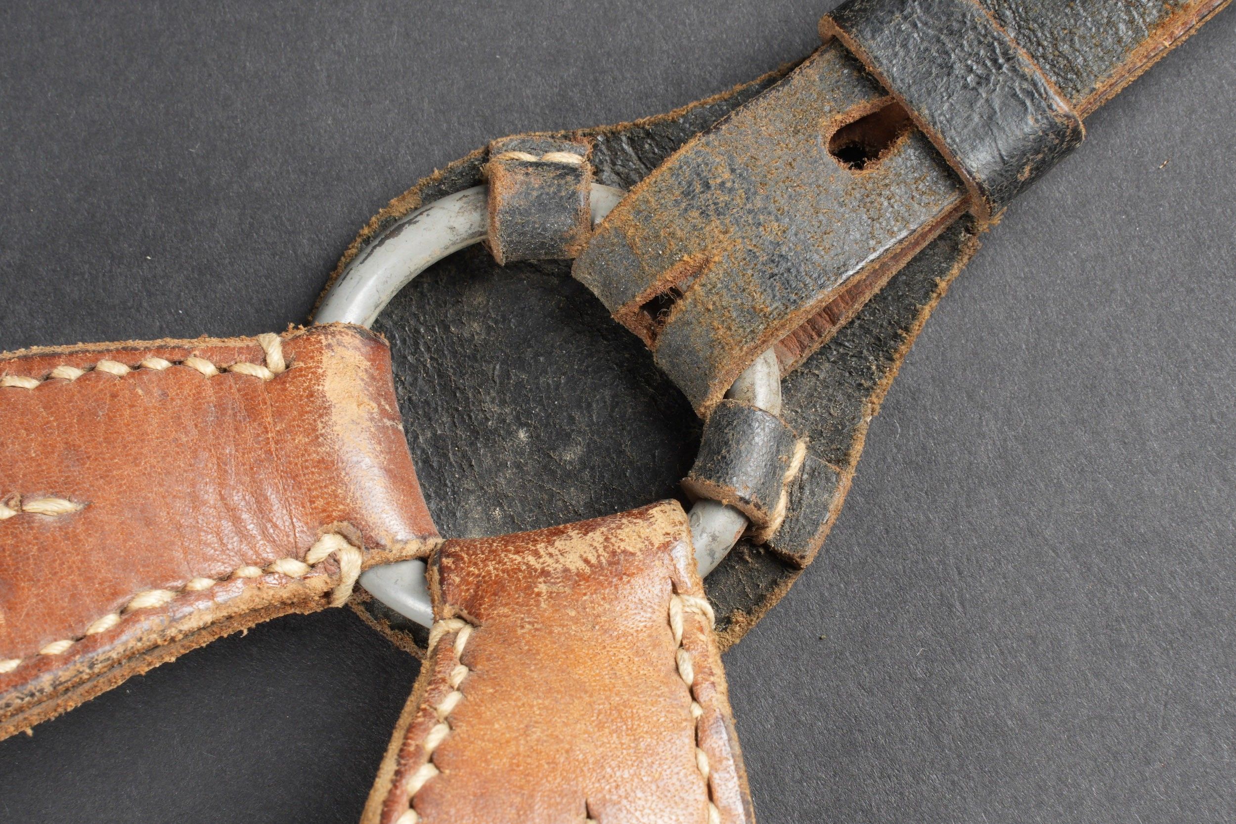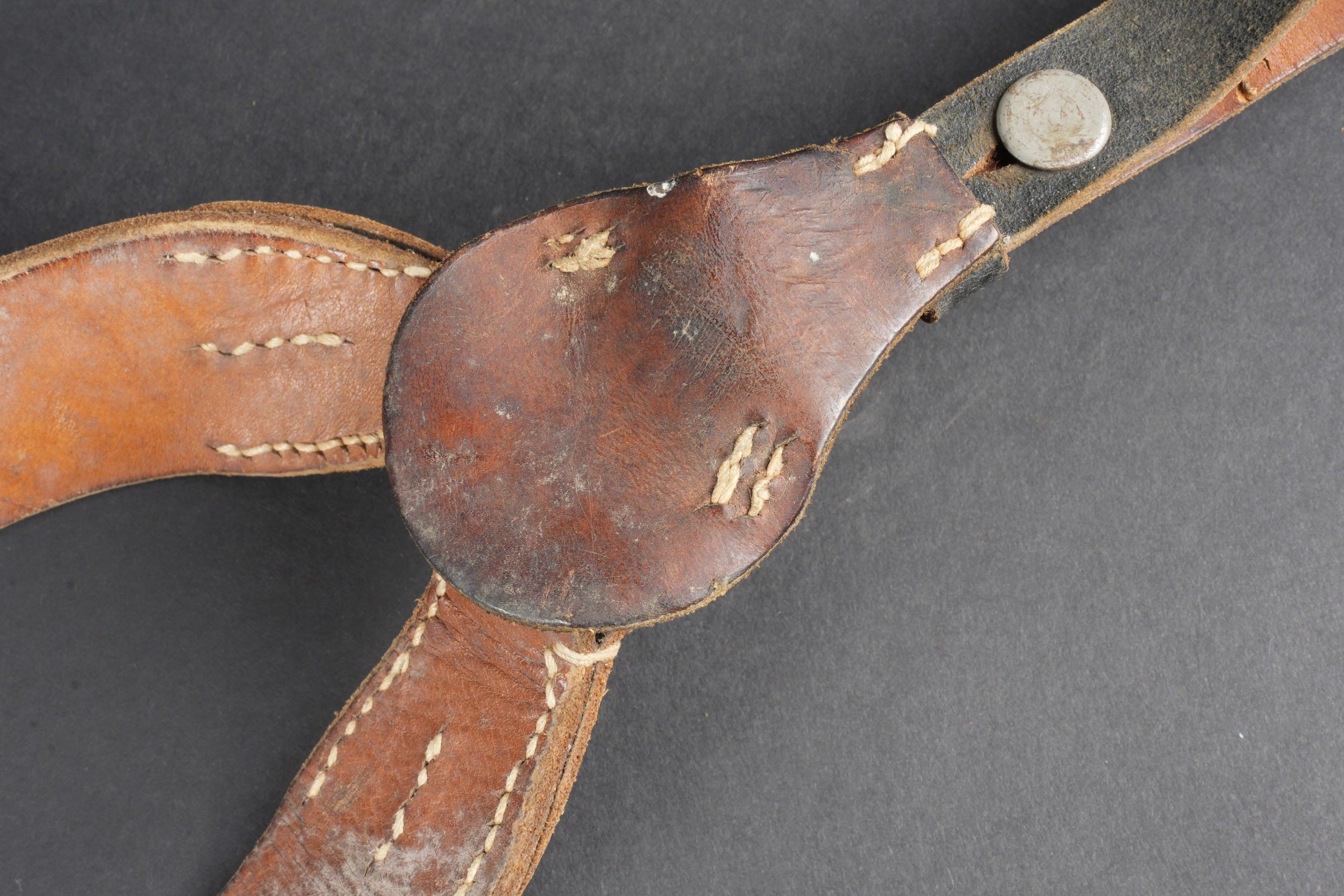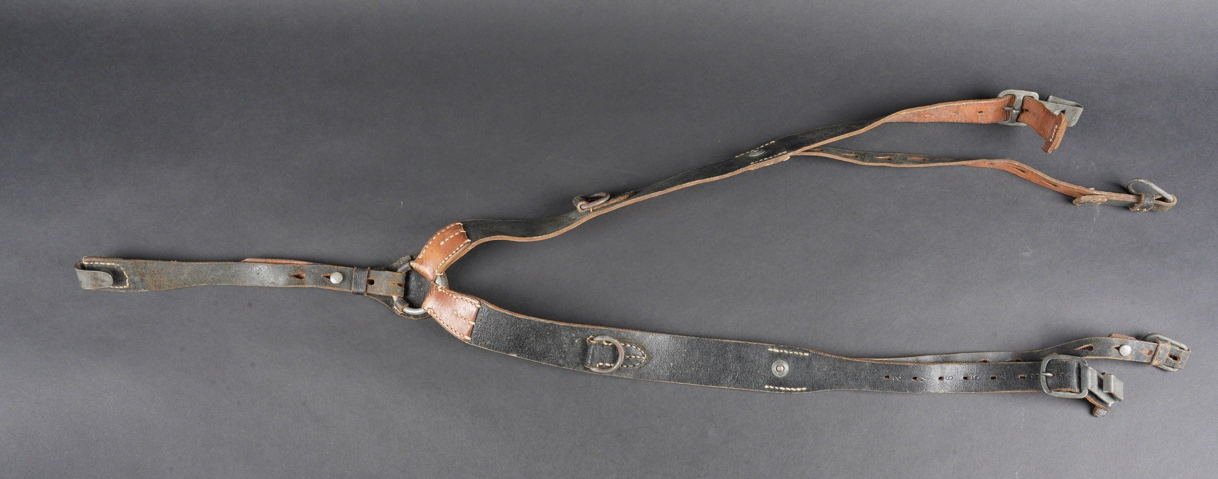 Heavy brelage. Black and brown leather. All metal parts present and 80% original colour. Soft leather. Marked RBNr 013036831. Some wear and patina. Condition II+. German combat Y-straps. Black and brown leather. All metal fittings present with 80% original finish. Supple leather. Marked RBNr 013036831. Some wear and patina. Condition II+.
