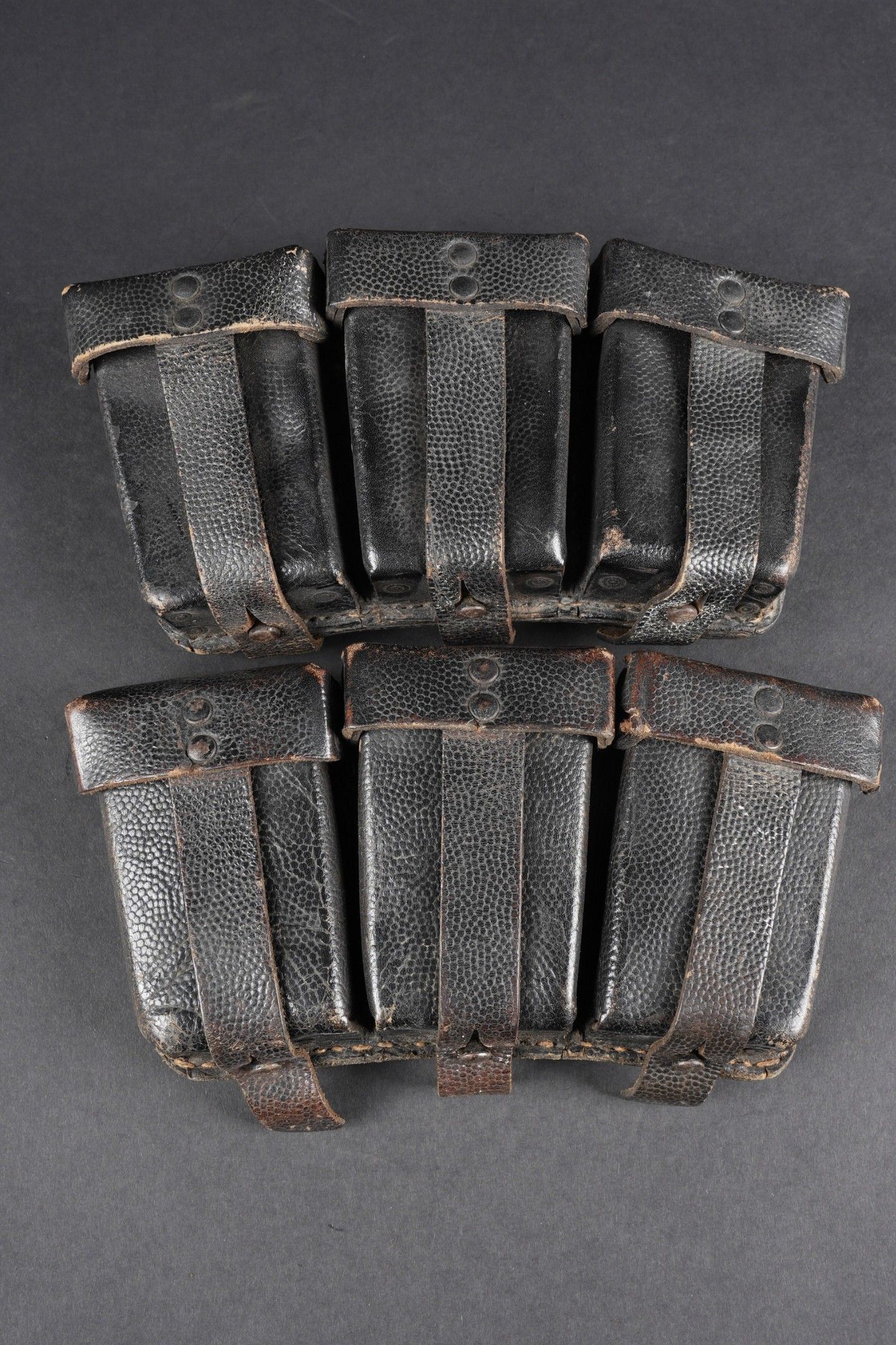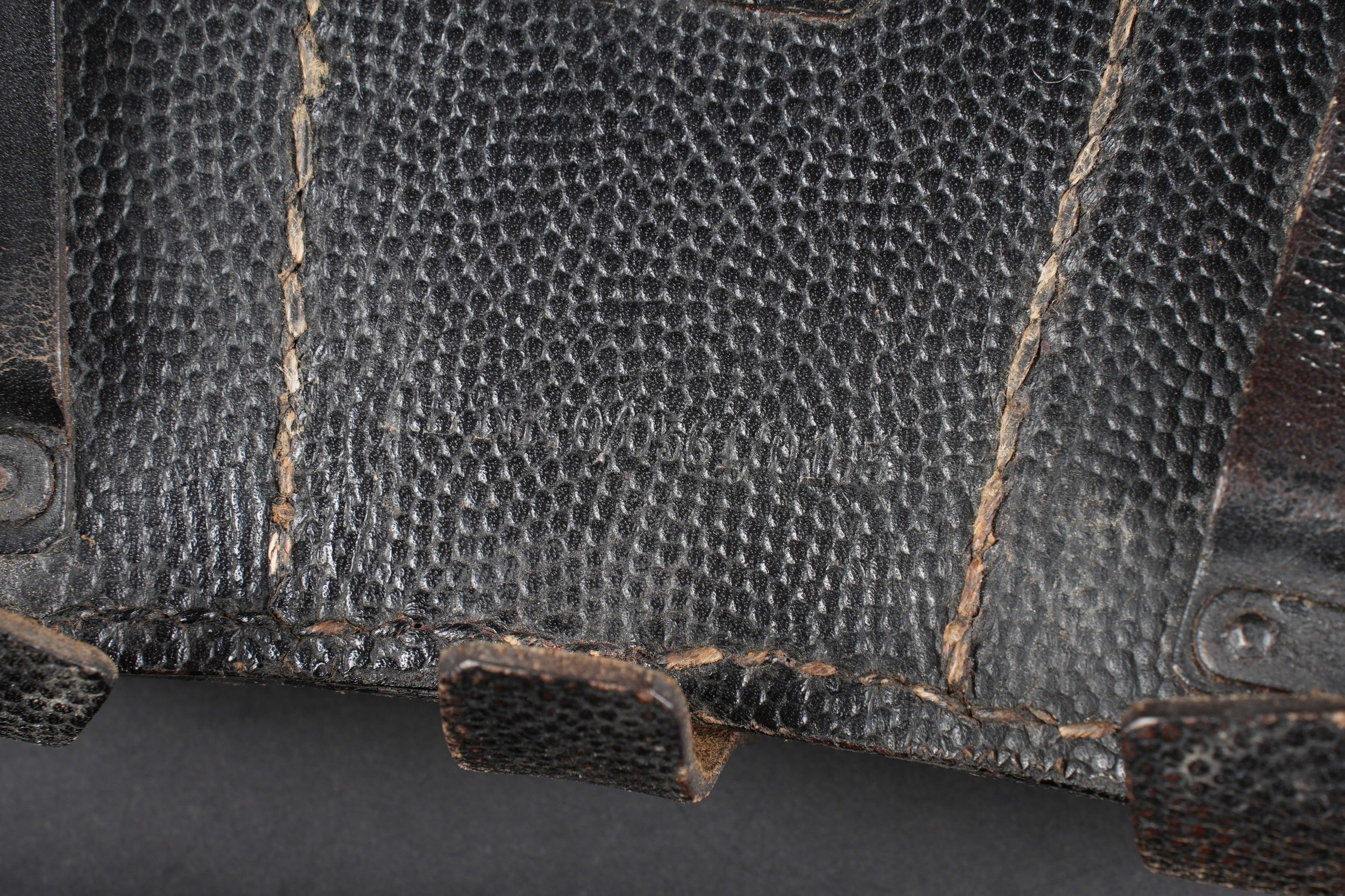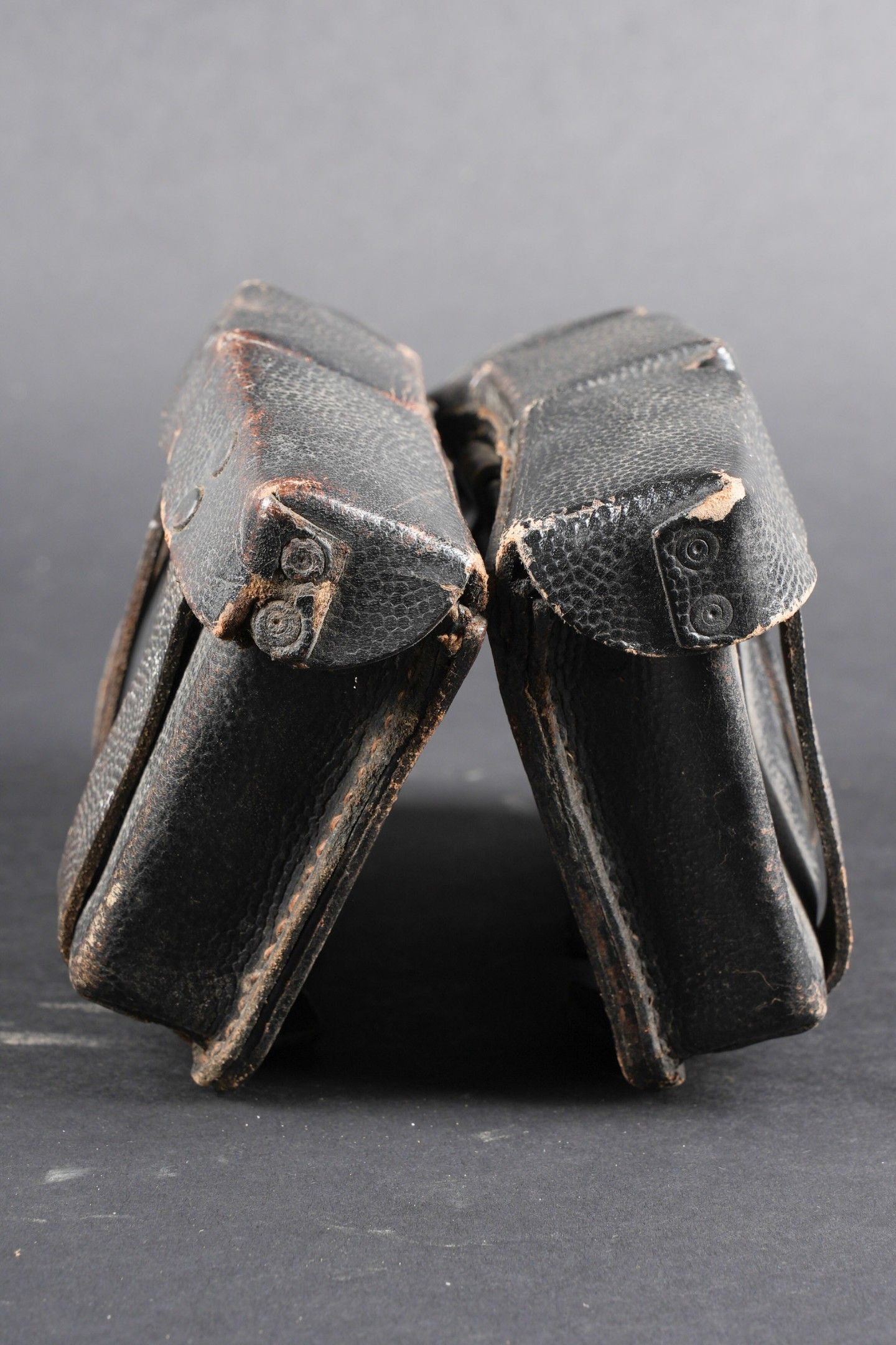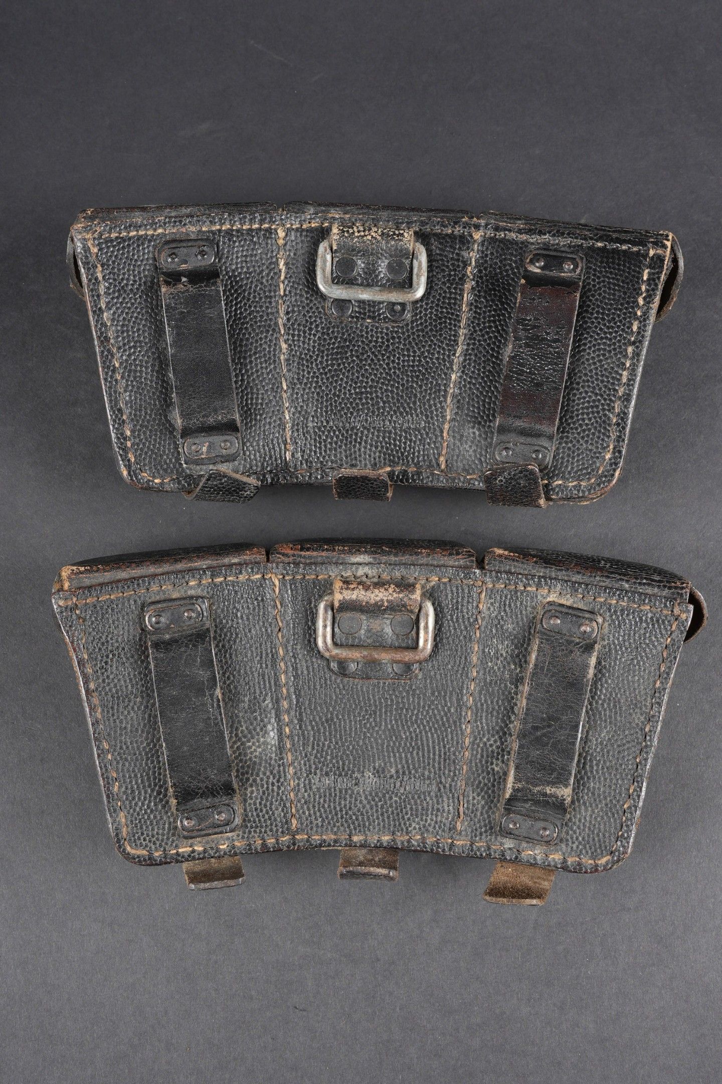 Mauser 98K cartridge belts. Homogeneous pair in black grained leather. All straps are present. Markings RBNr 005610186 and 005610163. Some wear and patina. Condition II+. Mauser 98K cartridge pouches. Matching pair, black pebbled leather. All straps intact. Marked RBNr 005610186 and 005610163. Some wear and patina. Condition II+.