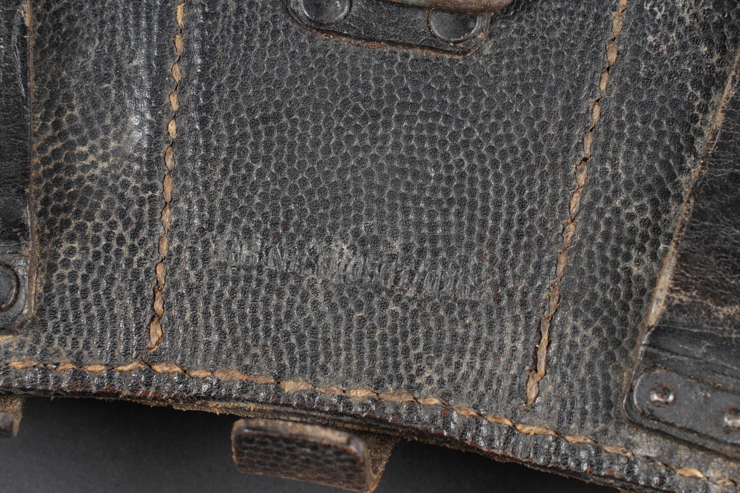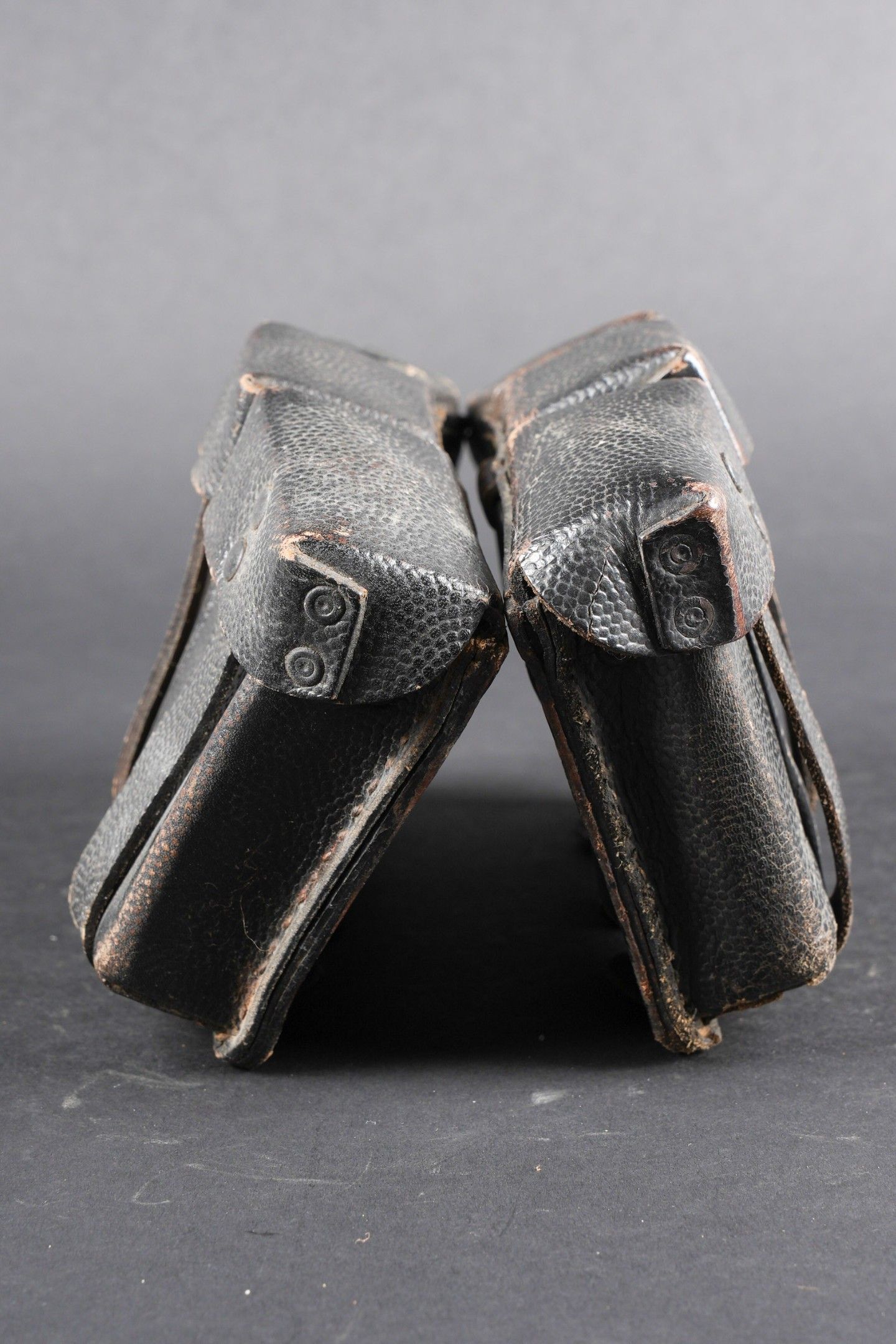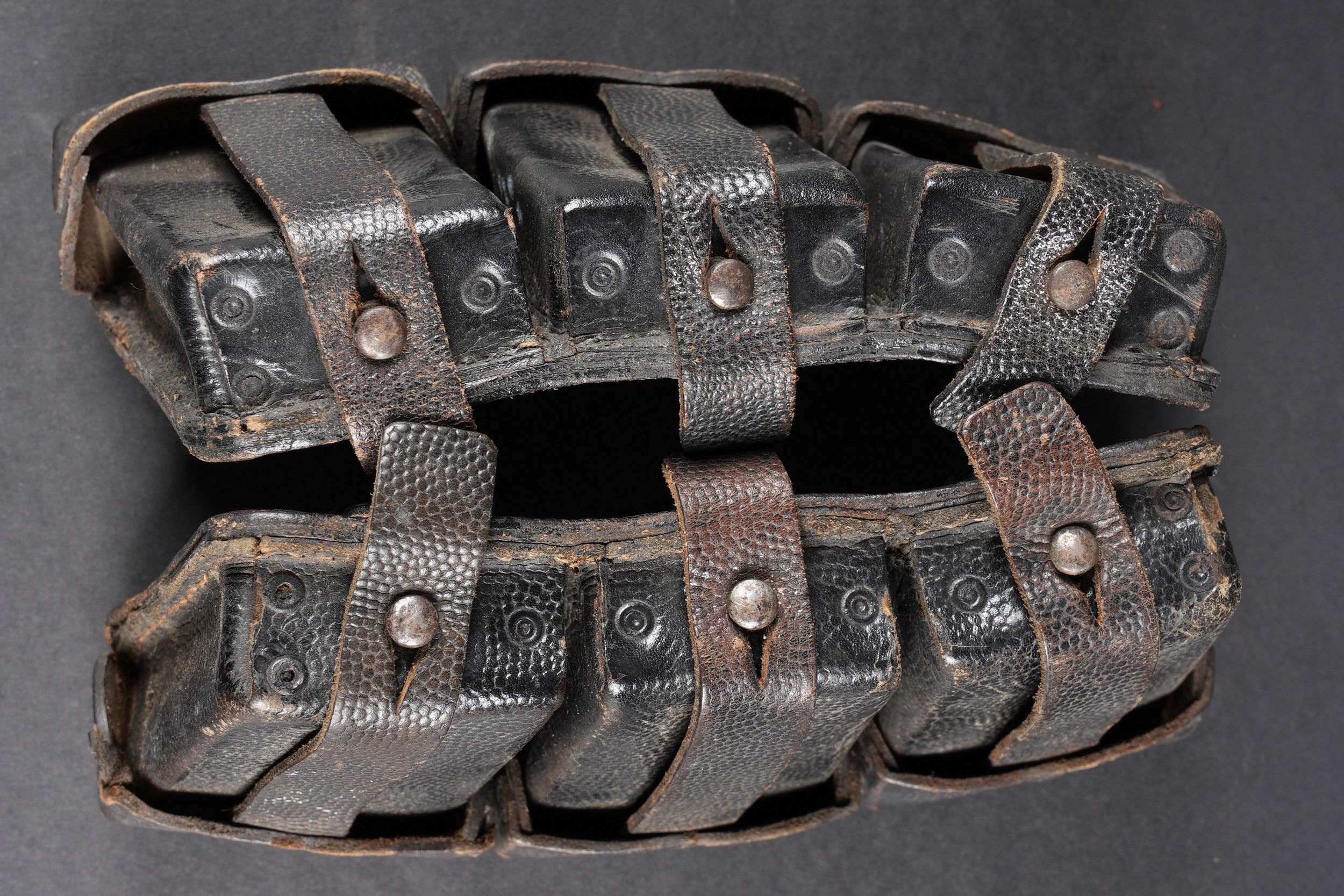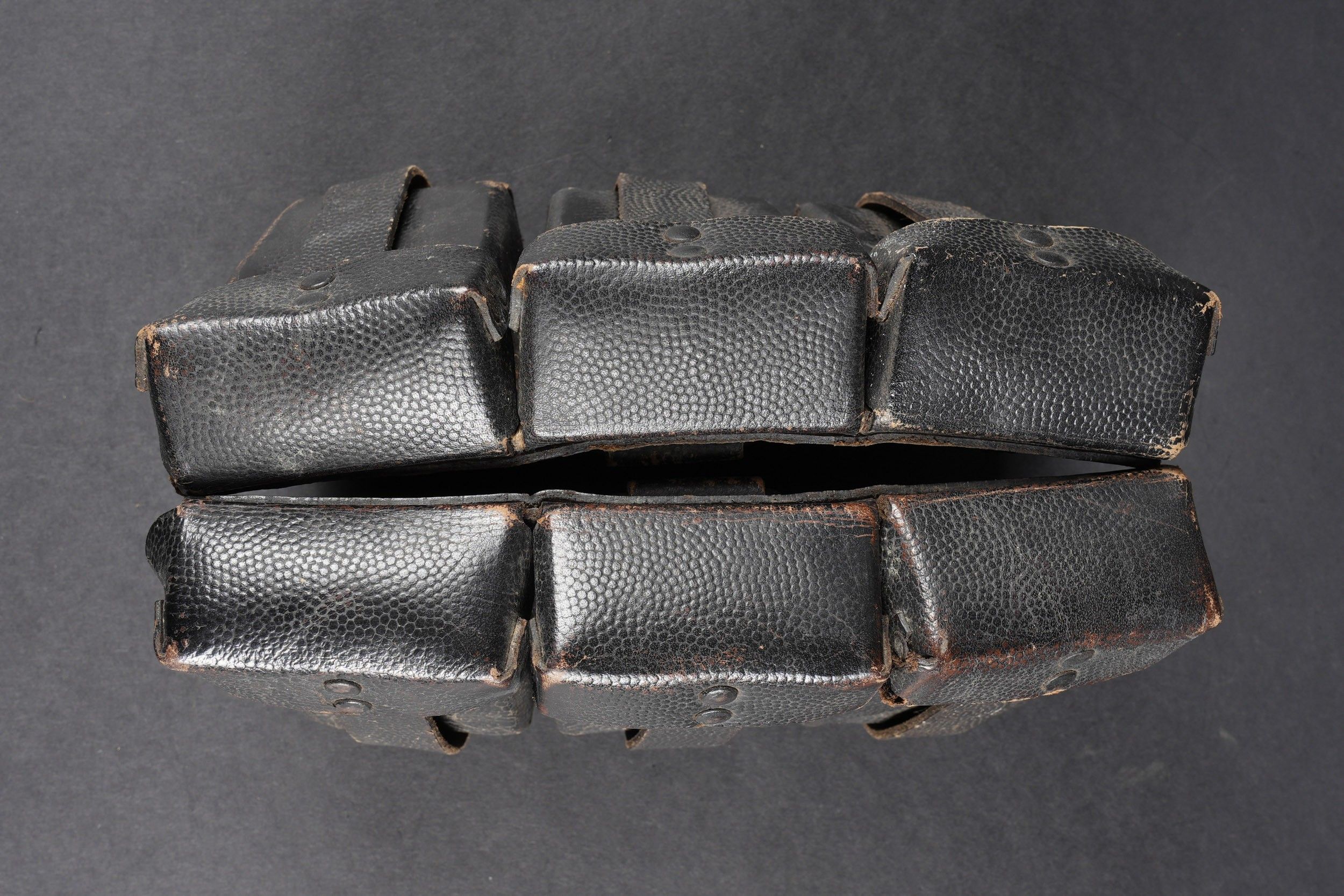 Mauser 98K cartridge belts. Homogeneous pair in black grained leather. All straps are present. Markings RBNr 005610186 and 005610163. Some wear and patina. Condition II+. Mauser 98K cartridge pouches. Matching pair, black pebbled leather. All straps intact. Marked RBNr 005610186 and 005610163. Some wear and patina. Condition II+.