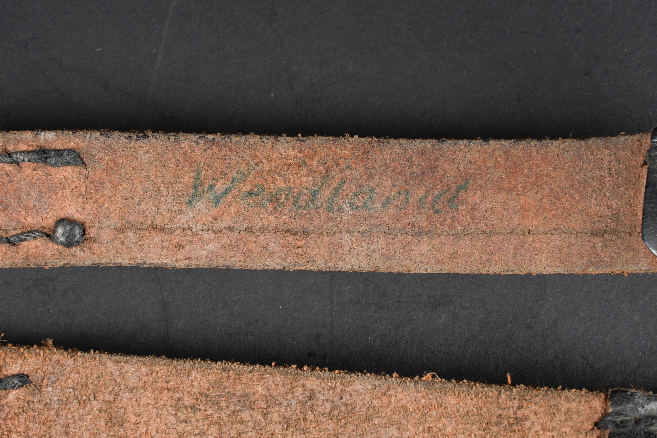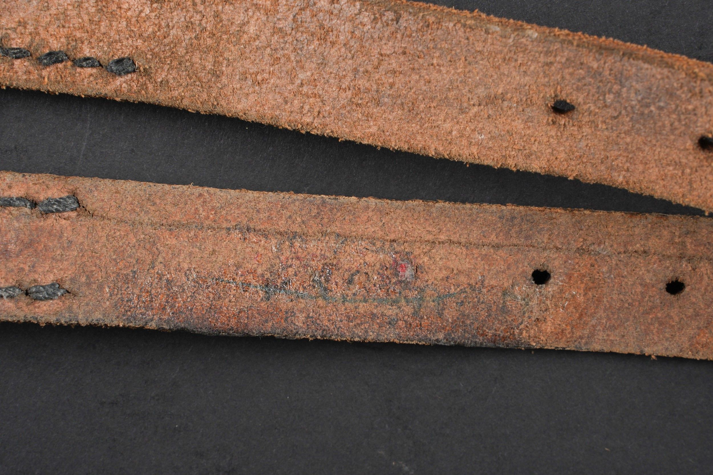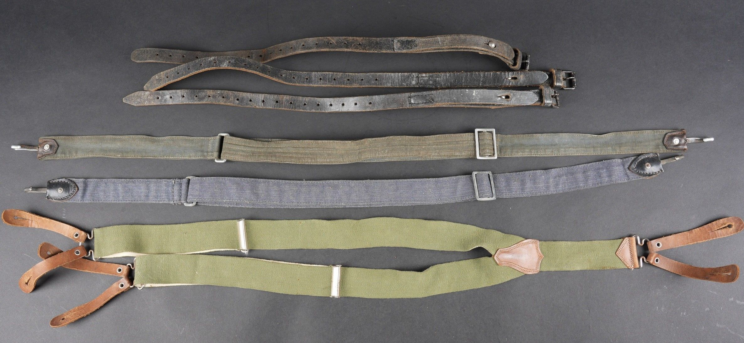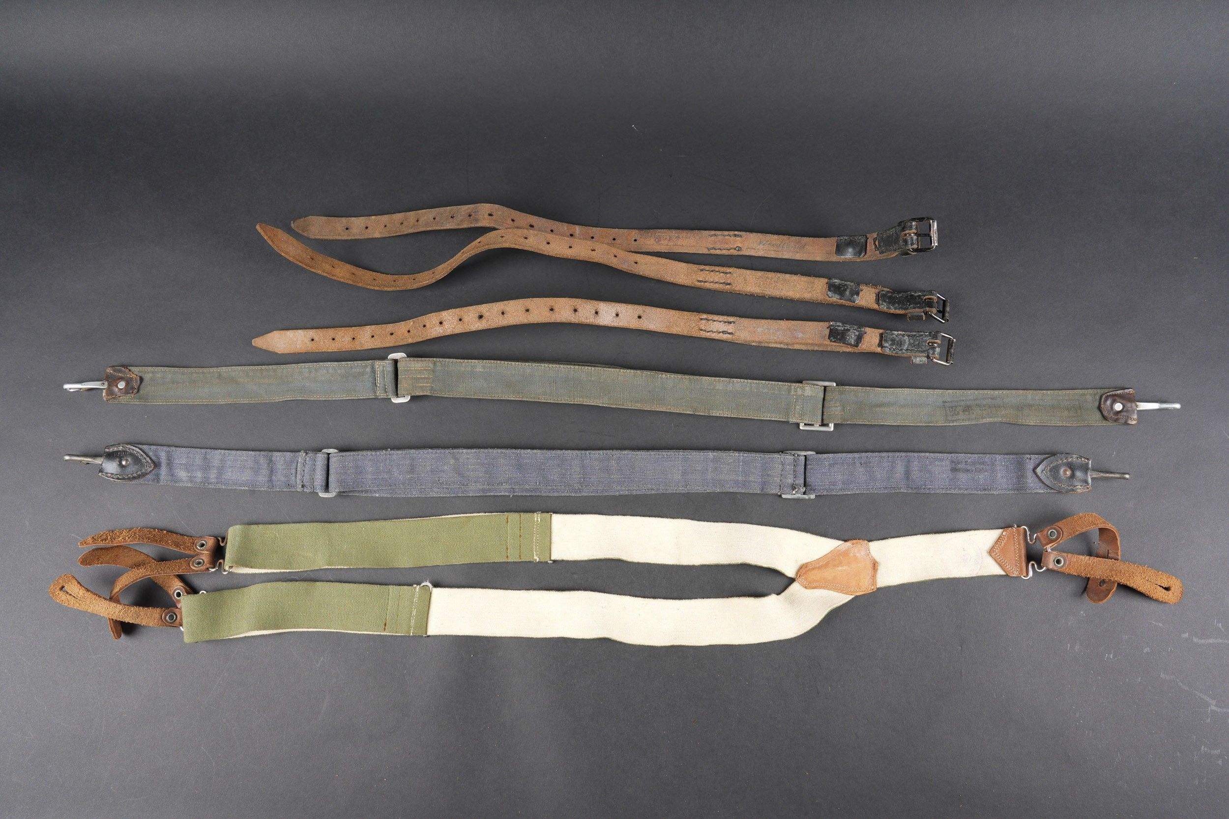 German straps. Comprising a breadbag strap in grey-blue canvas, the snap hooks are functional, the markings are illegible. A breadbag strap in heavy Feldgrau canvas, the snap hooks are functional, the markings illegible. A brown leather strap, unmarked. A pair of shoulder straps, markings illegible, the elastic parts are flexible. Two leather straps for canteens. Some wear and patina. Condition II+. German straps. Includes one blue-gray breadbag strap with functional clips, markings illegible, one Feldgrau heavy canvas breadbag strap, clips functional, markings illegible, one brown leather strap without markings, one pair of suspenders, markings illegible, elastic sections still flexible, two leather mess tin straps. Some wear and patina. Condition II+.