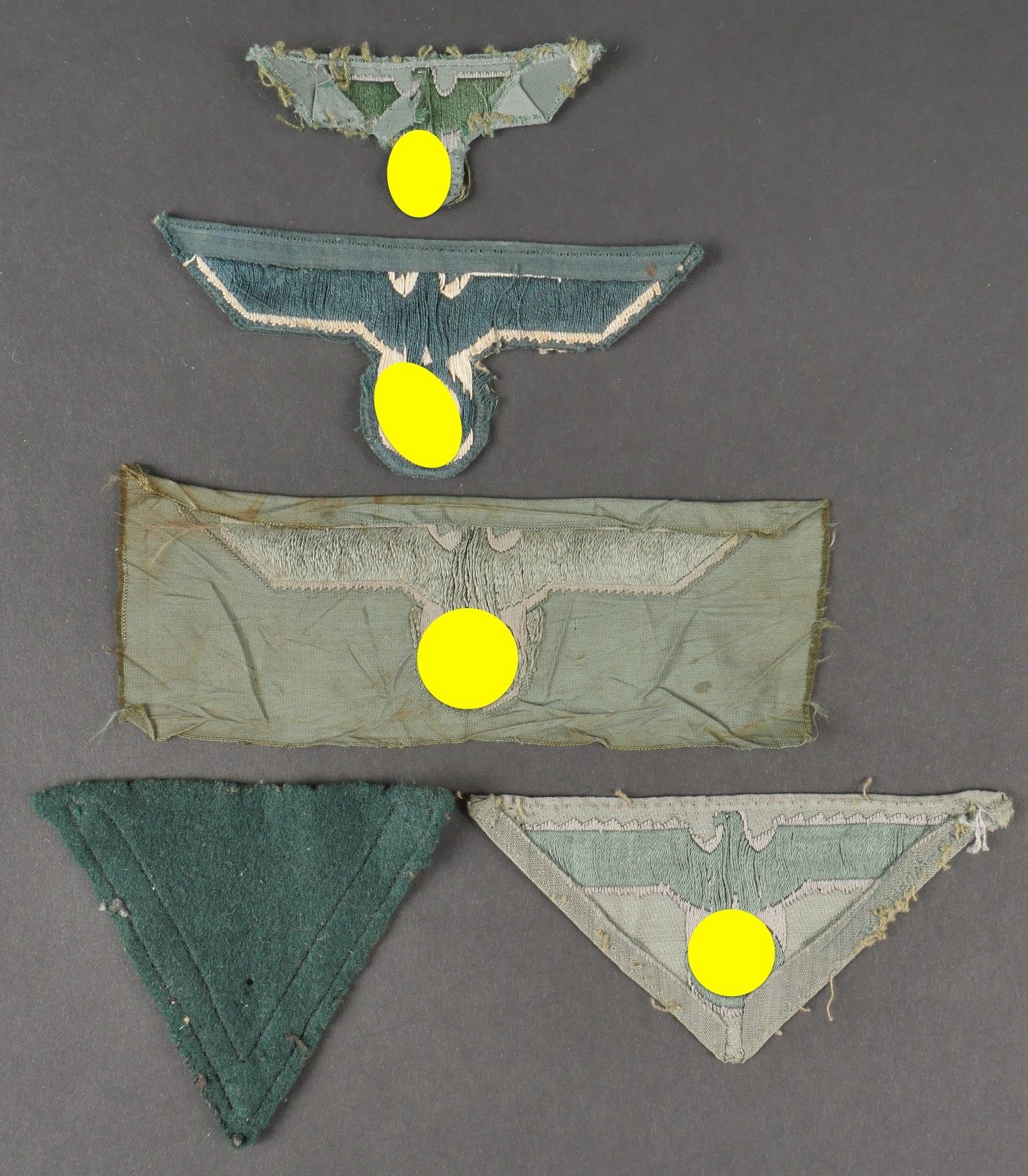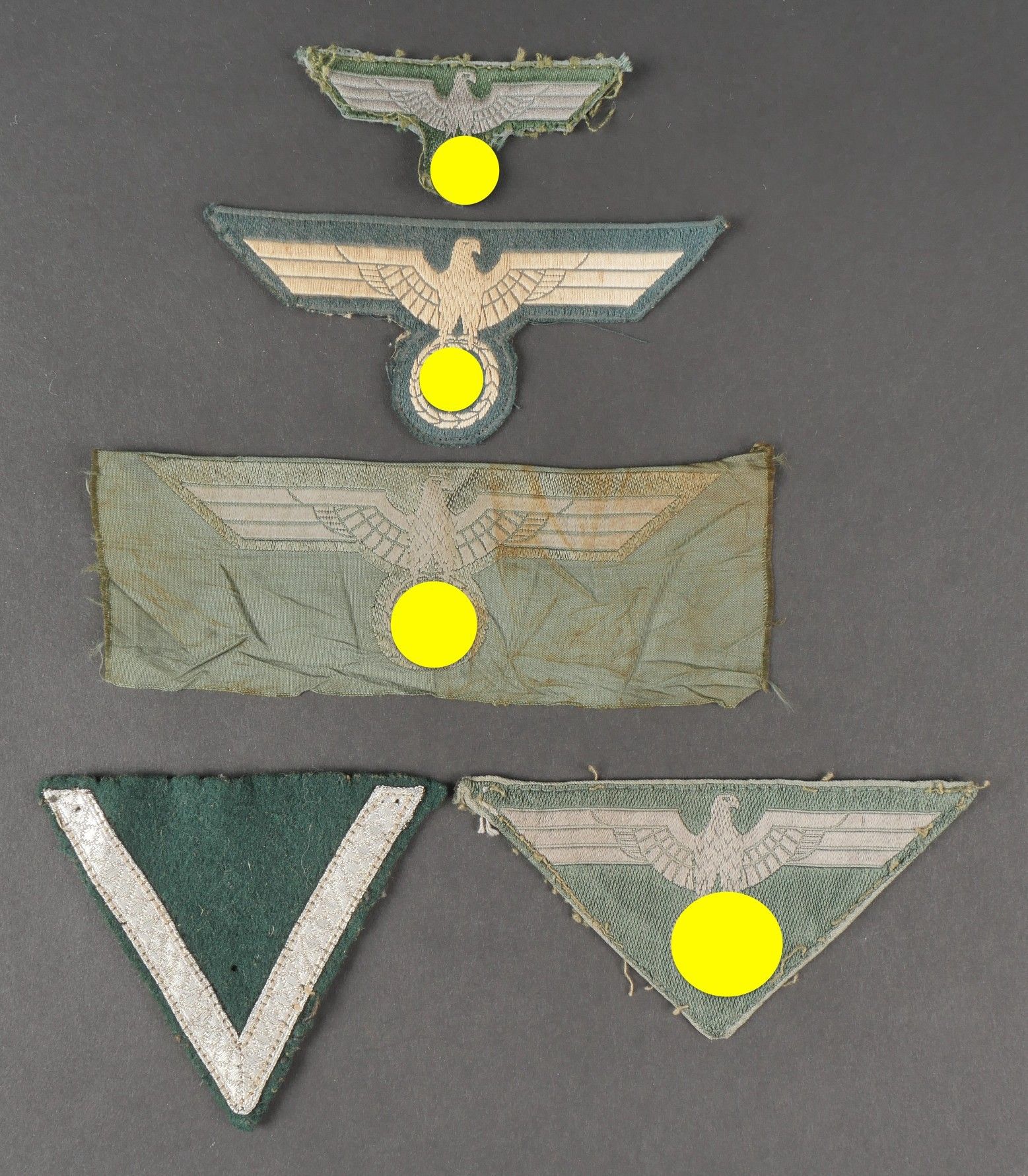Heer insignia. Comprising a Bevo chest eagle, visibly disassembled from a vareuse. A Gefreiter sleeve rank, some moth holes visible. A Bevo cap eagle, visibly disassembled from a headdress. A Bevo chest eagle, triangular in shape, also removed from a jacket. A Bevo chest eagle, never mounted. Some wear and patina to be noted. Condition II+. Heer insignia. Includes a Bevo breast eagle likely removed from a tunic, a Gefreiter rank chevron with some moth damage, a Bevo cap eagle removed from a cap, a triangular Bevo breast eagle removed from a tunic, and an unused Bevo breast eagle. Shows general wear and patina. Condition II+.