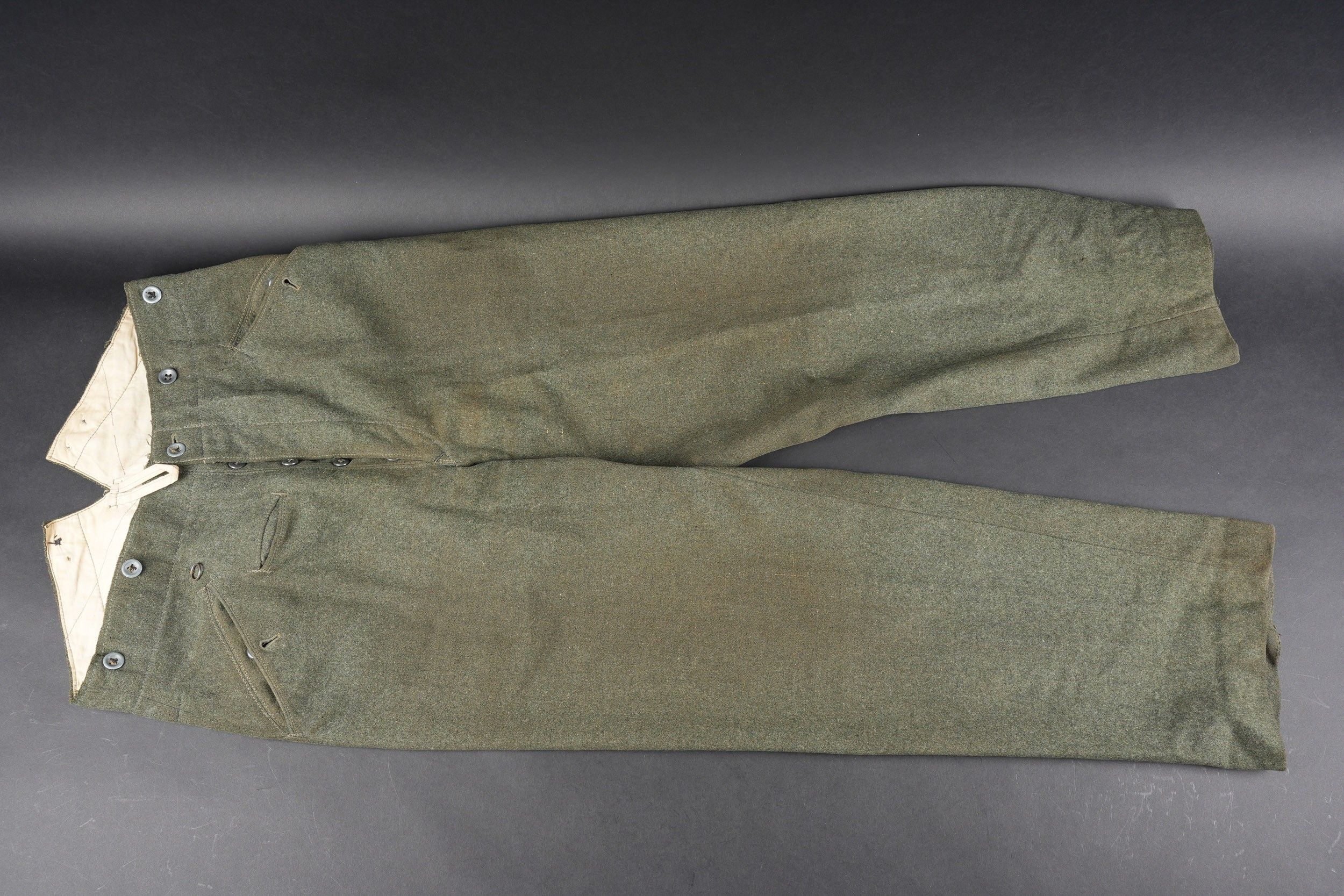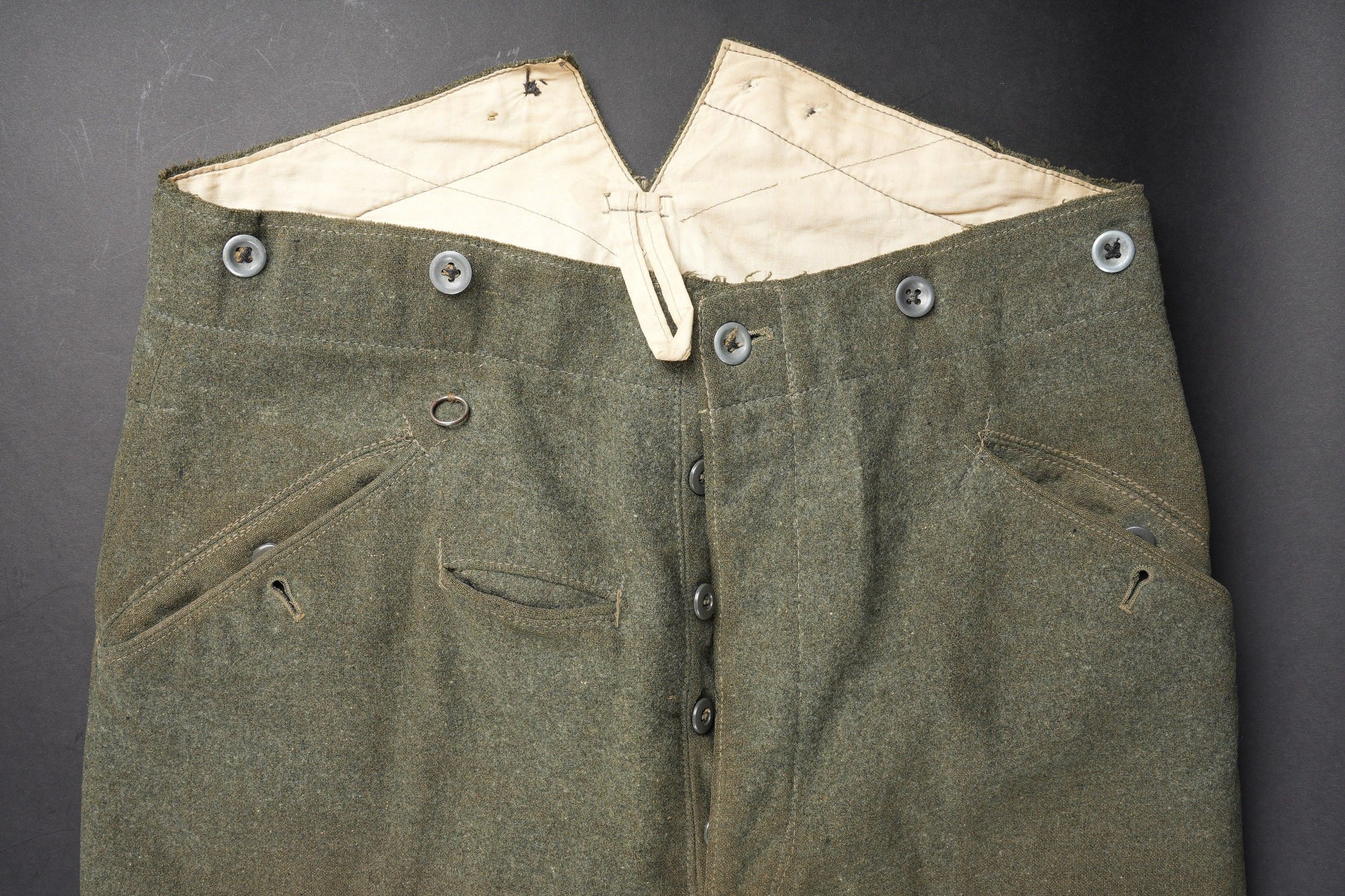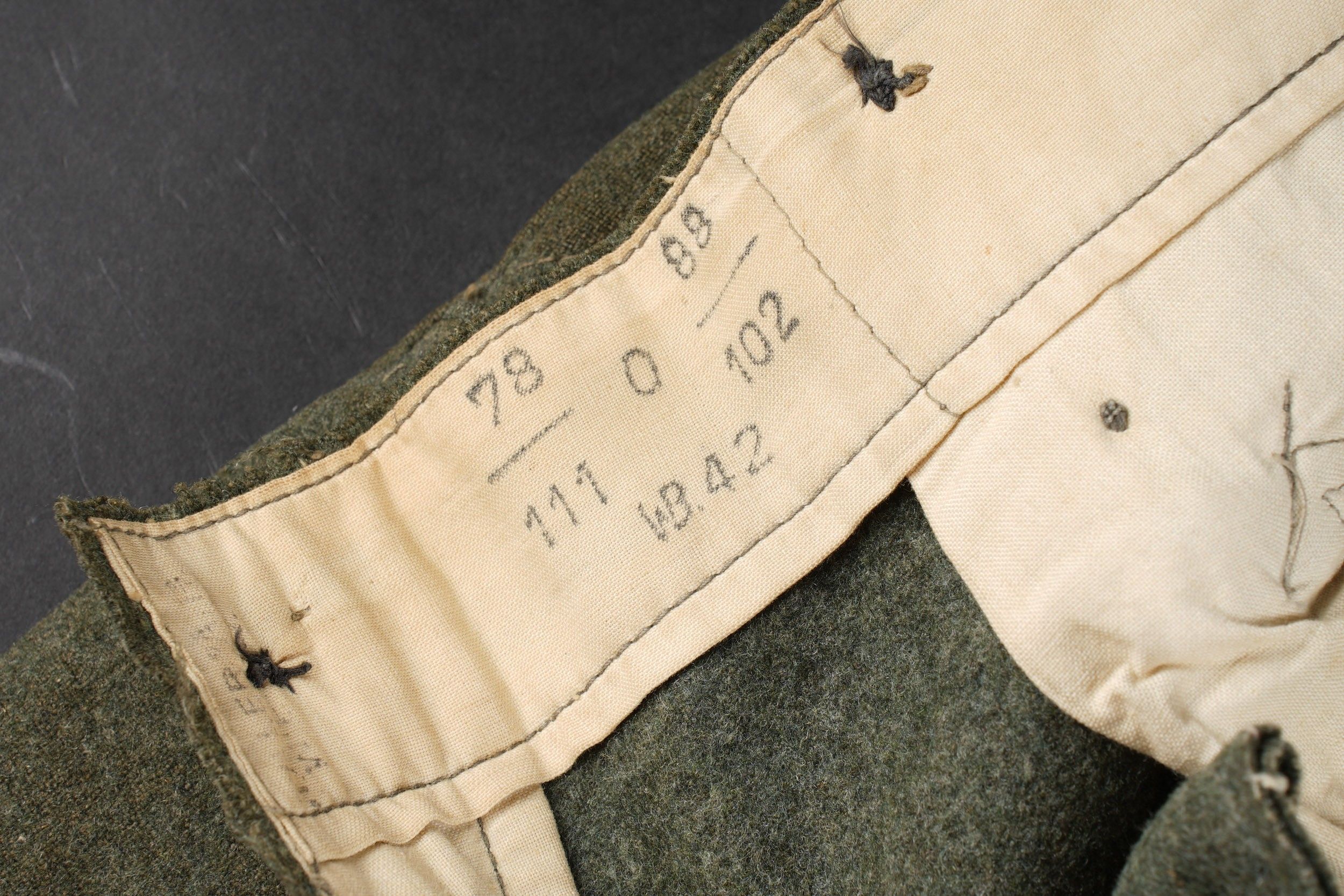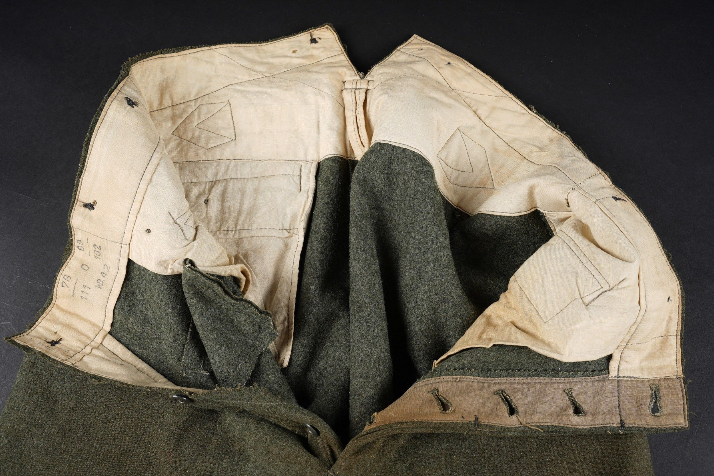 Heer M-40 trousers. Feldgrau cloth, all buttons present. Worn hem at bottom of legs. Martingale complete. Interior lined in white cotton fabric. Manufacturer's markings illegible. Size markings 78 88 0 111 102 W42. There is some wear and patina to the garment, as well as discrete moth marks. Condition II+. Heer M40 trousers. Made of Feldgrau wool, all buttons present. Hem worn at the leg bottoms. Martingale complete. White cotton lining. Maker's marks illegible. Size markings 78 88 0 111 102 W42. Some wear, patina, and minor moth traces. Condition II+.